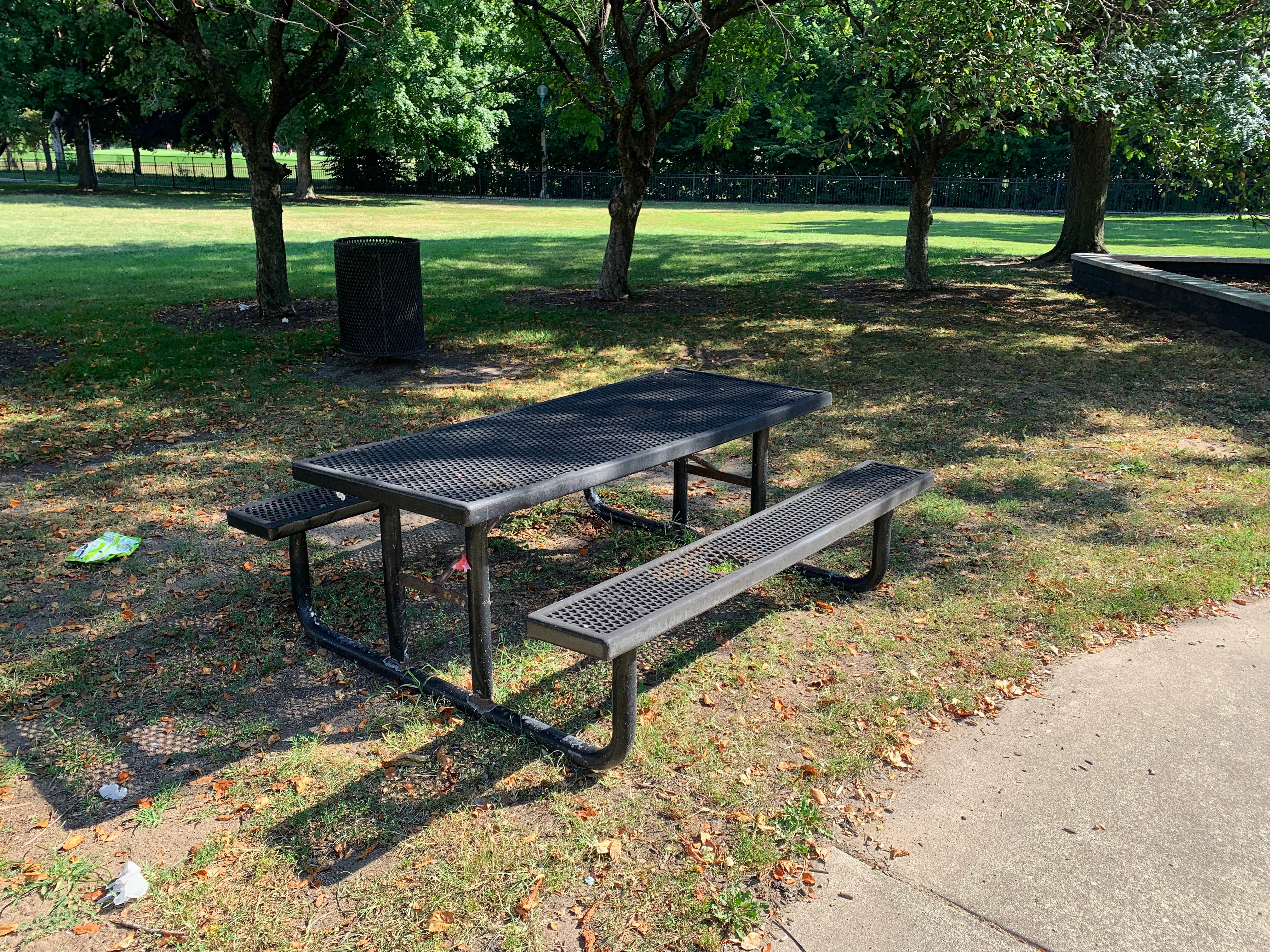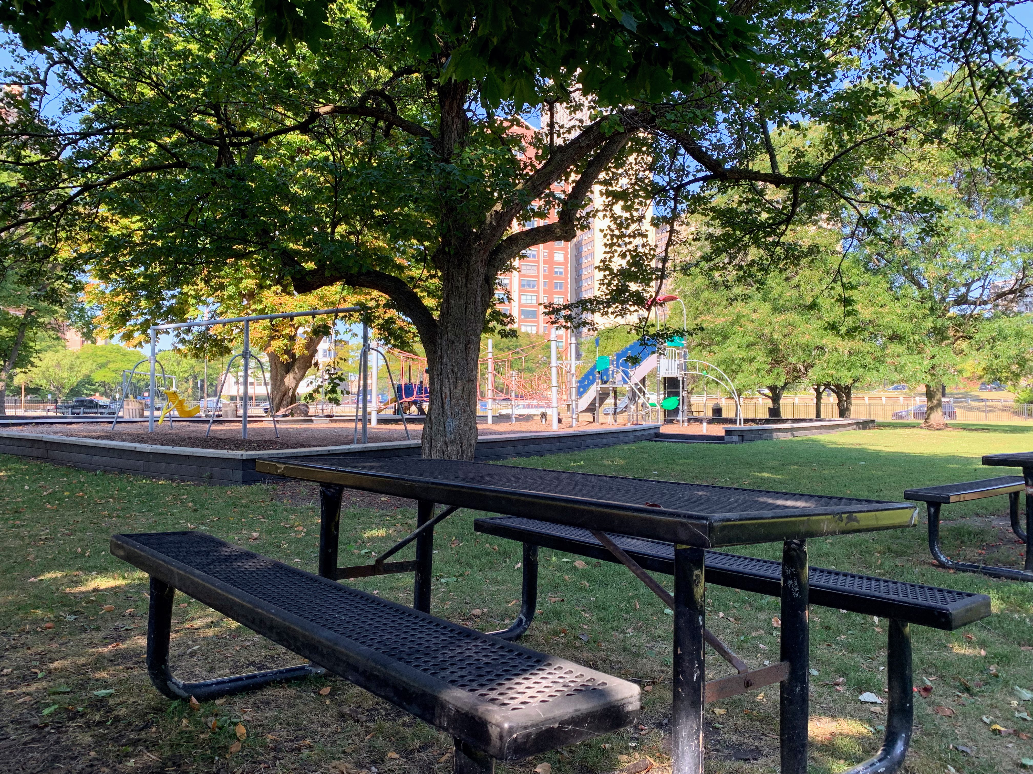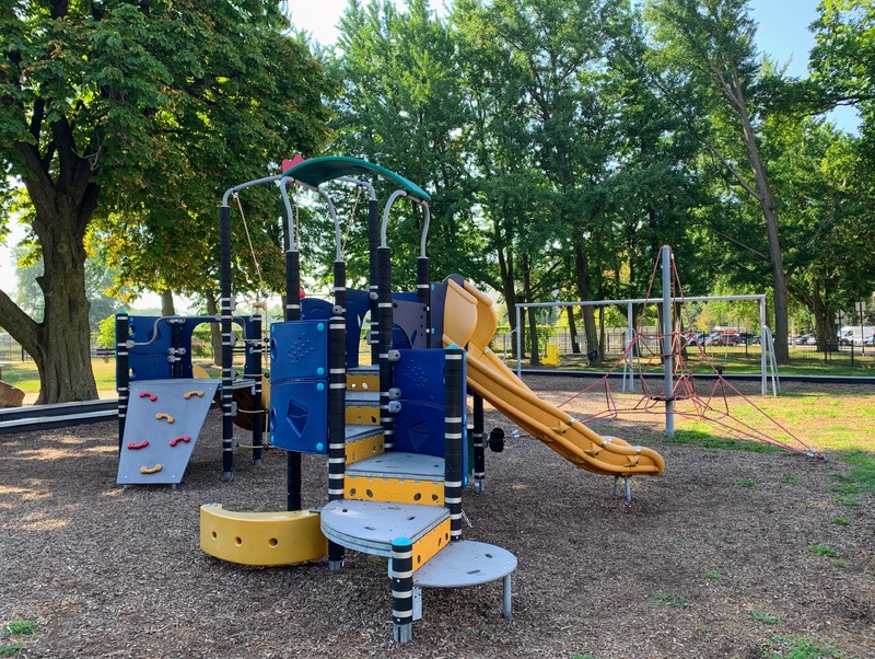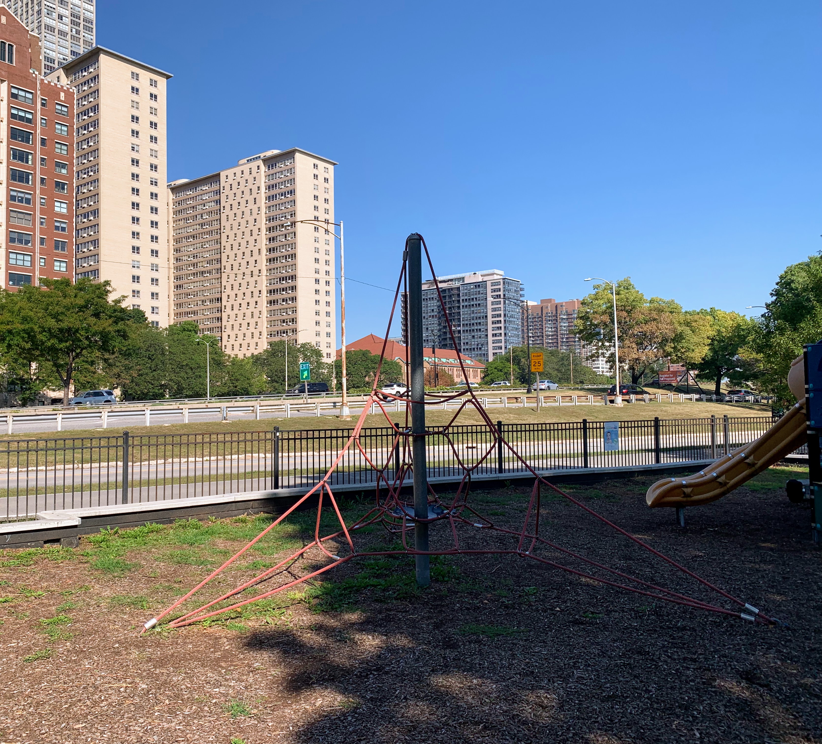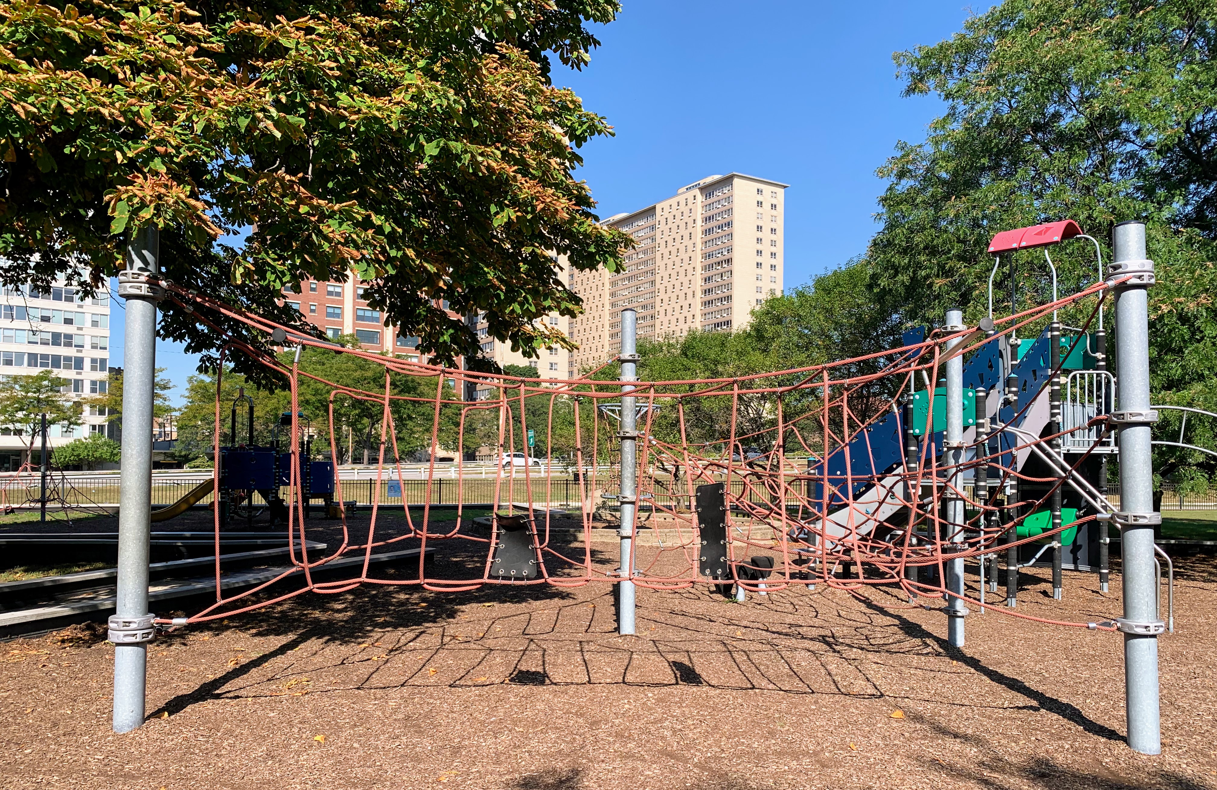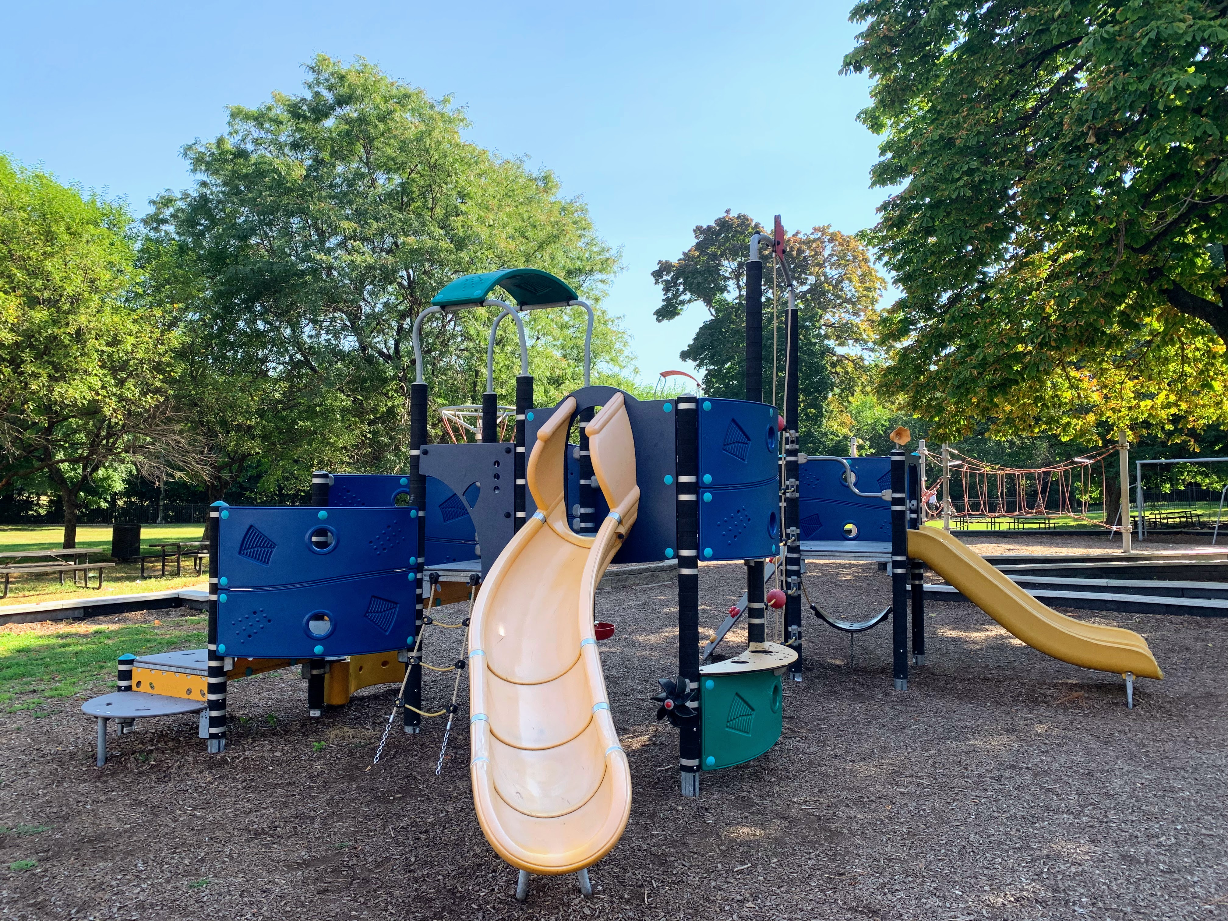 Morrie Mages Playground - one of 10 playground located in Lincoln Park! - is just to the east of DuSable Lake Shore Drive (and the accurately named 'Recreation Drive' that provides vehicular access to some lakefront amenities) and Irving Park. This playground is sandwiched between the lakefront walking and biking trail and provides a large, enclosed play space with a variety of elements.