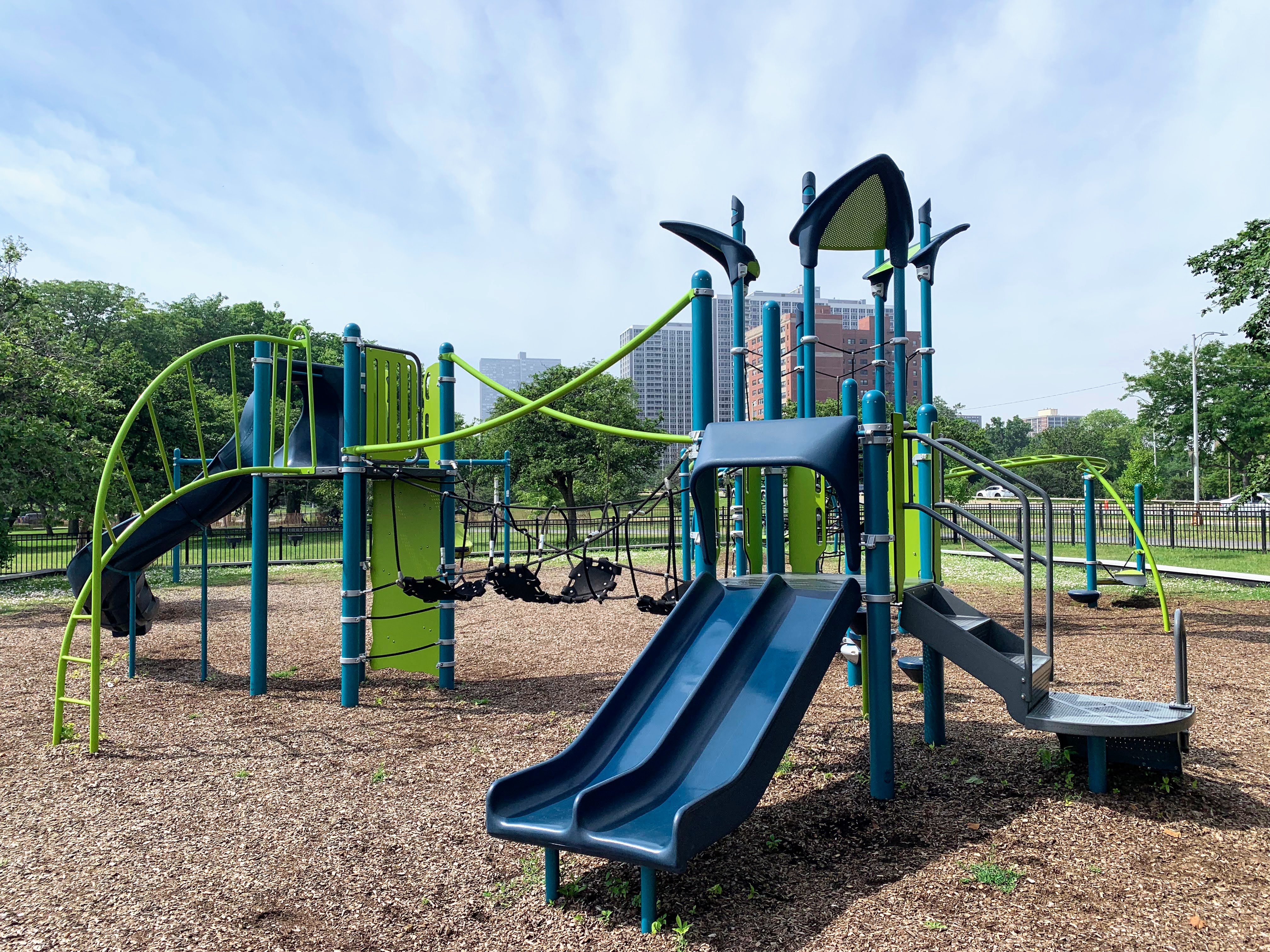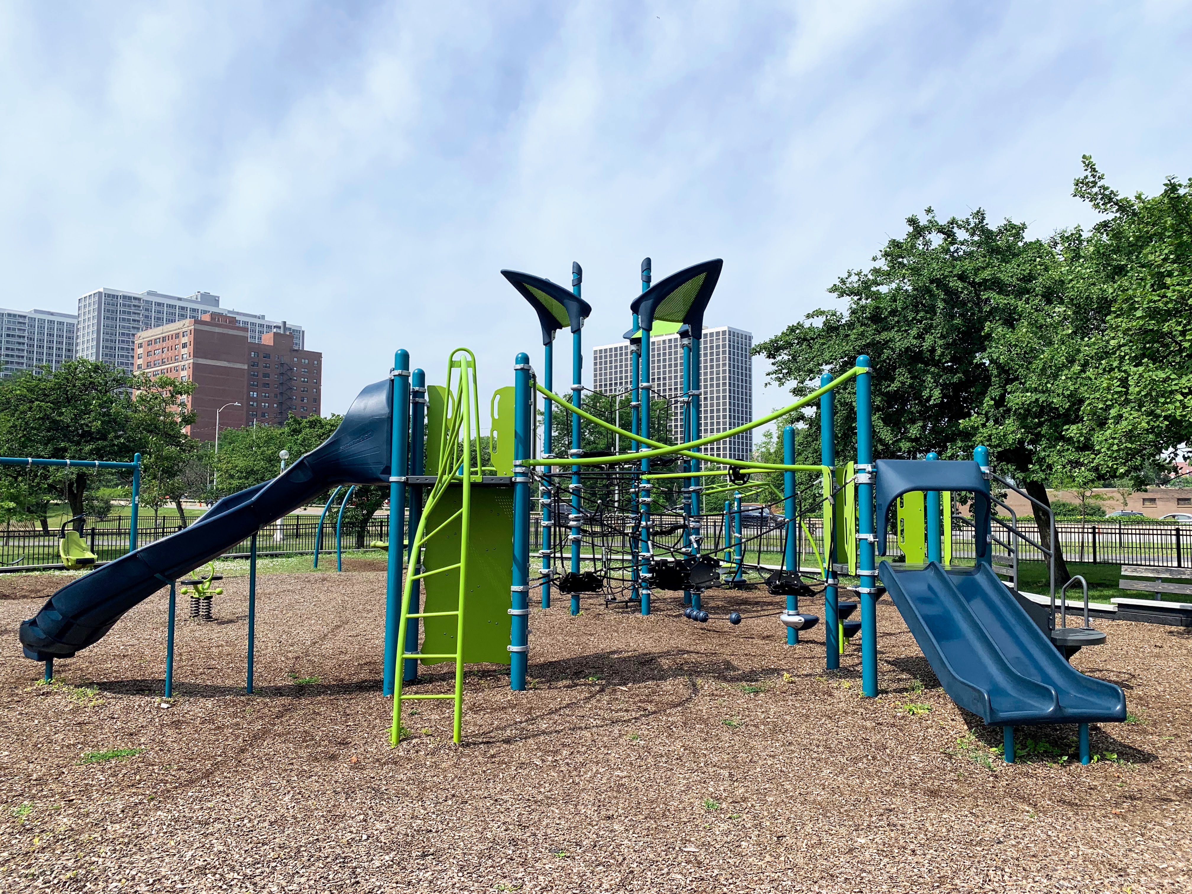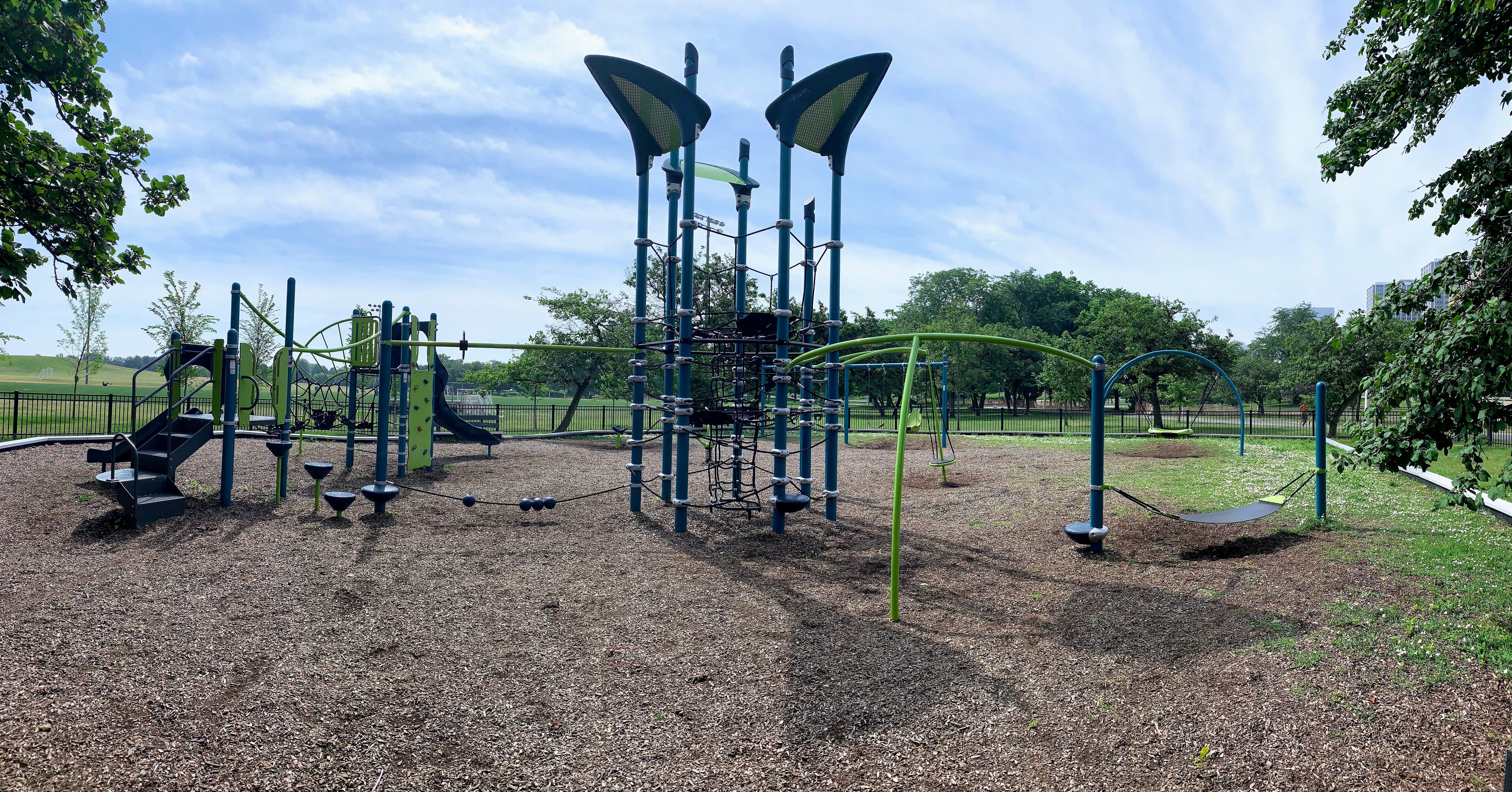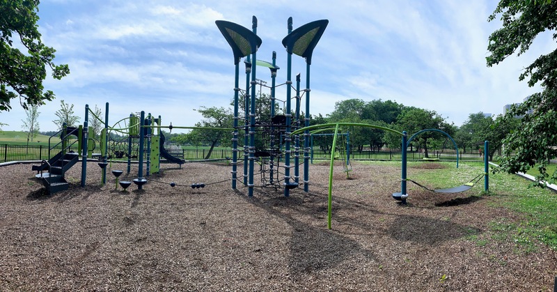 This playground - one of 10 in Lincoln Park - is located just east of DuSable Lake Shore Drive and north of Montrose. It features a sprawling set of playground equipment with a variety of slides and climbing elements (including some rope/net climbing structures). There is also a solid selection of swings - toddler, adaptive, belt seat, and saucer - and a few standalone elements.