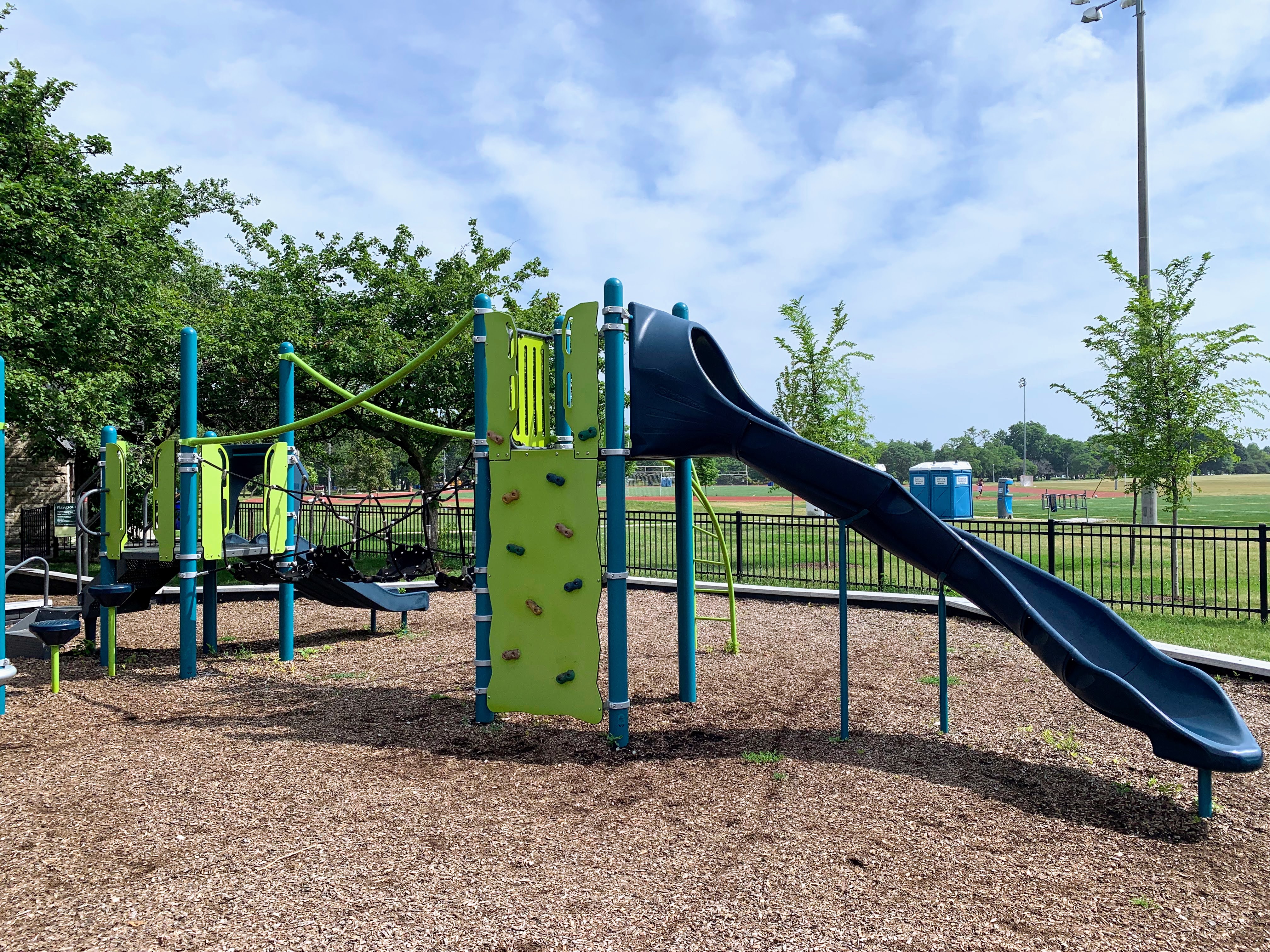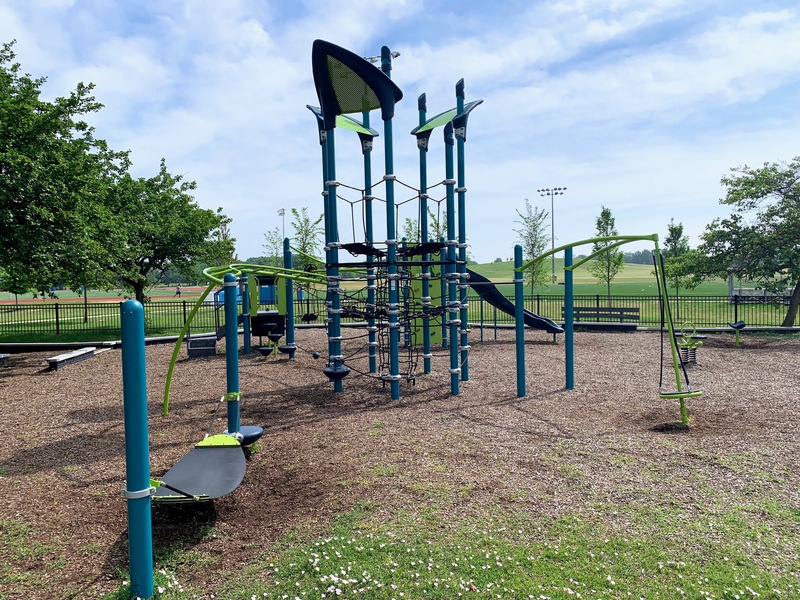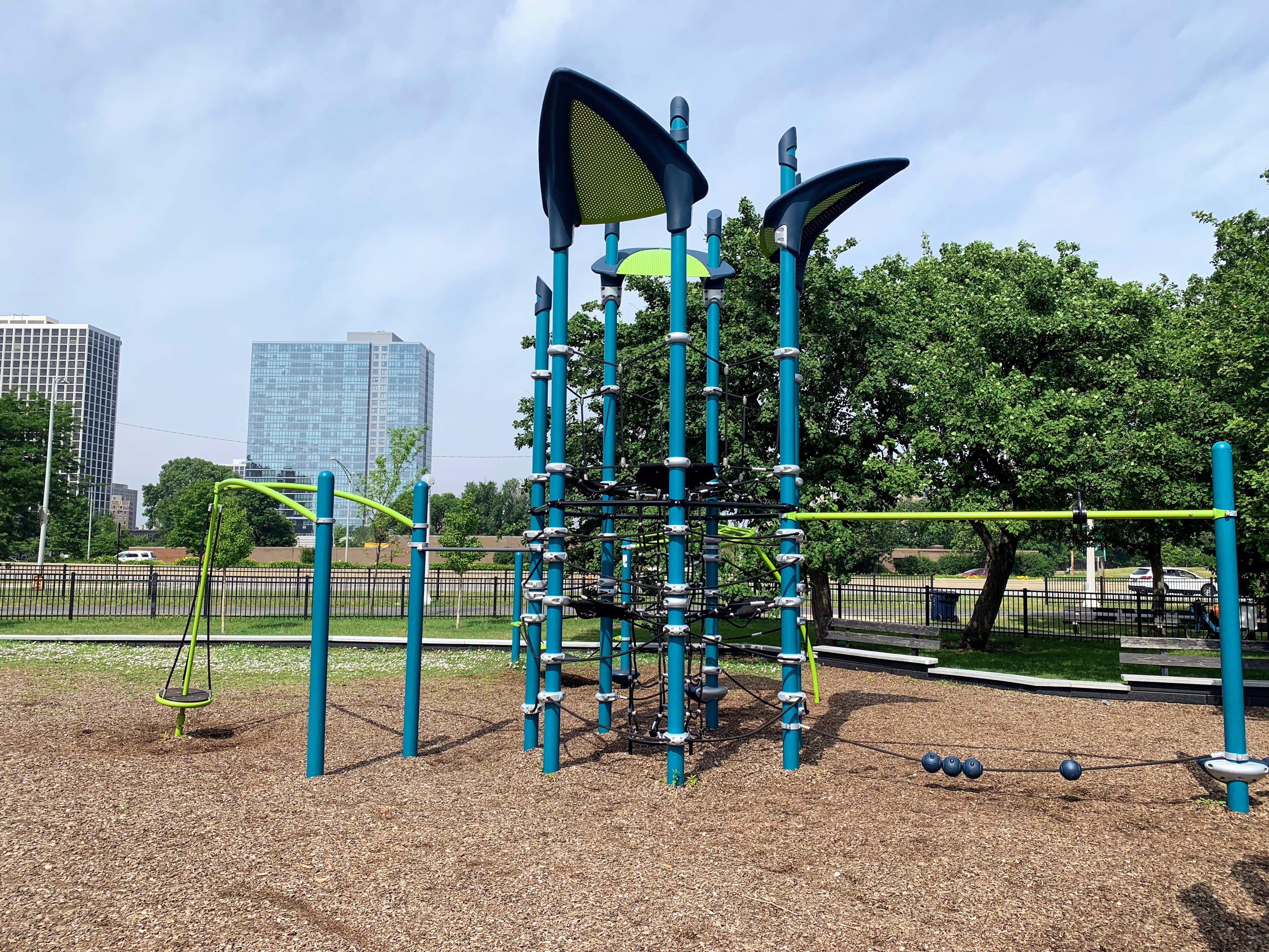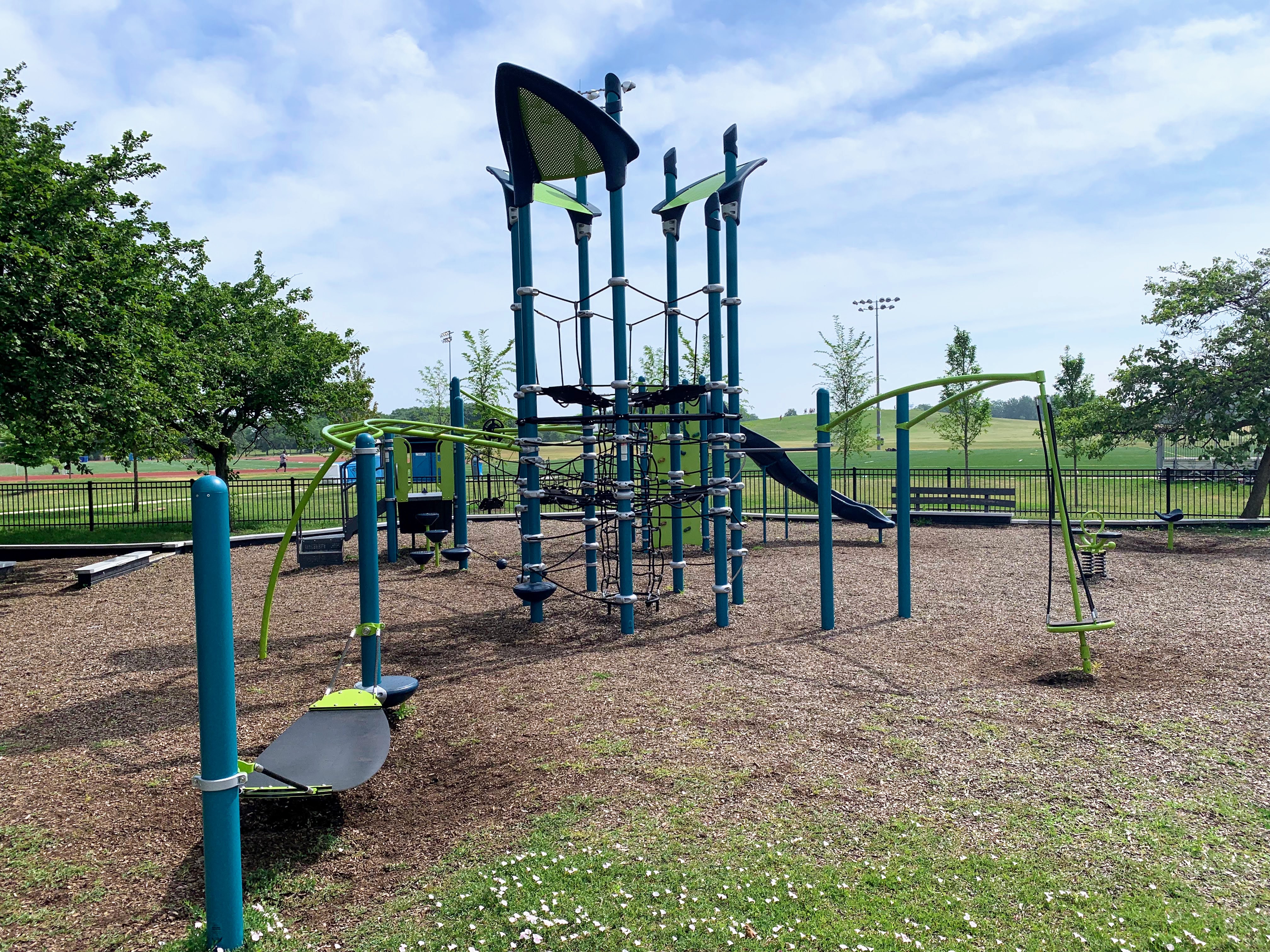This playground - one of 10 in Lincoln Park - is located just east of DuSable Lake Shore Drive and north of Montrose. It features a sprawling set of playground equipment with a variety of slides and climbing elements (including some rope/net climbing structures). There is also a solid selection of swings - toddler, adaptive, belt seat, and saucer - and a few standalone elements.