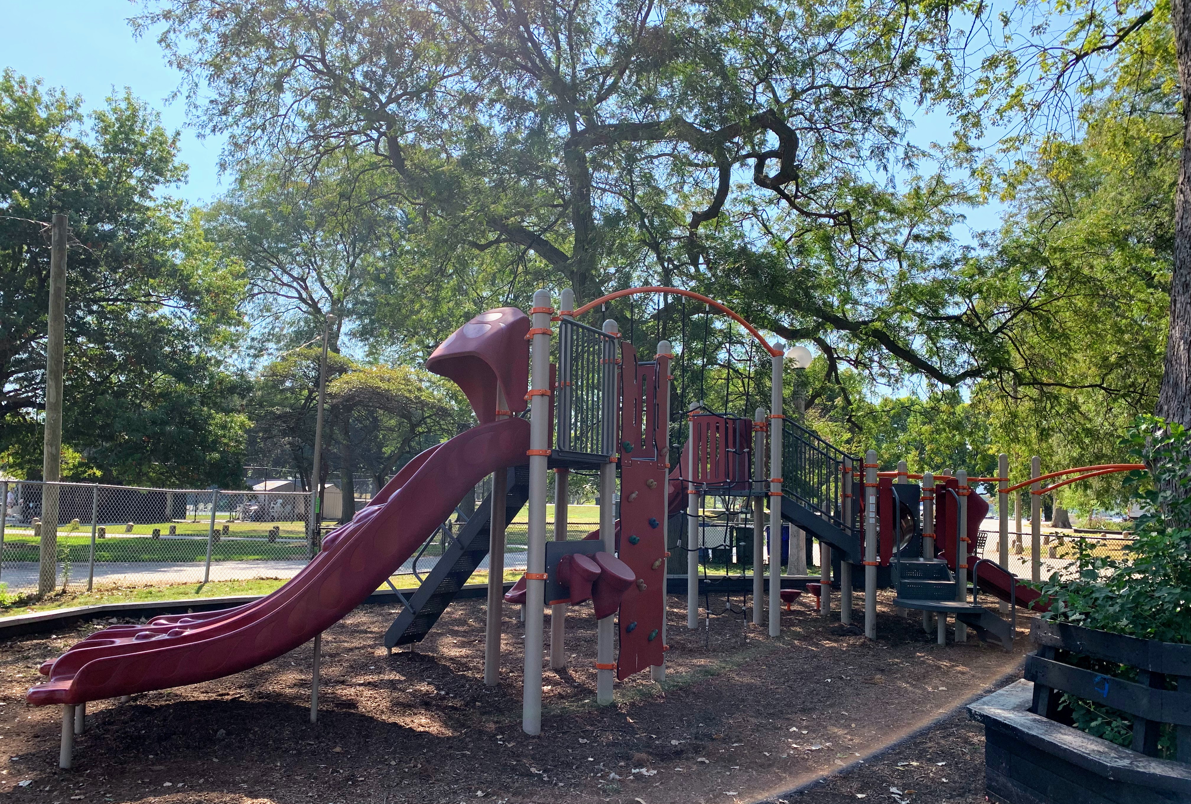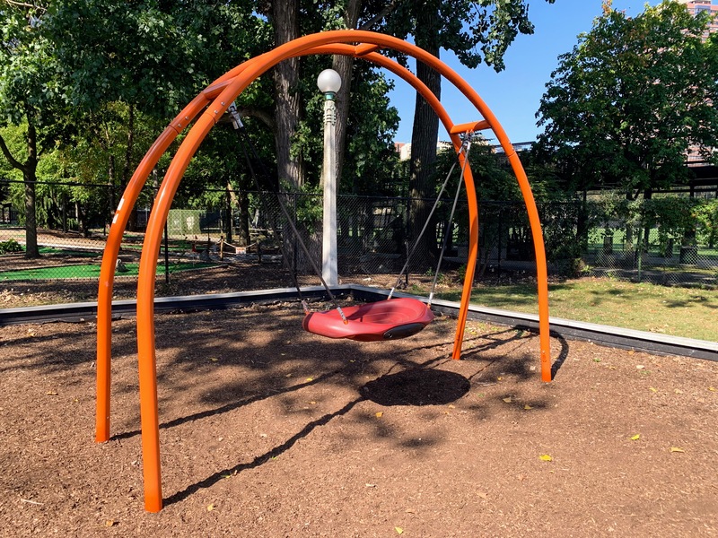 The playground itself is solid. A large play structure with a variety of slides and climbing elements as well as a unusual assortment of swings: toddler, adaptive with a harness, and a saucer swing without and traditional belt seat swings.