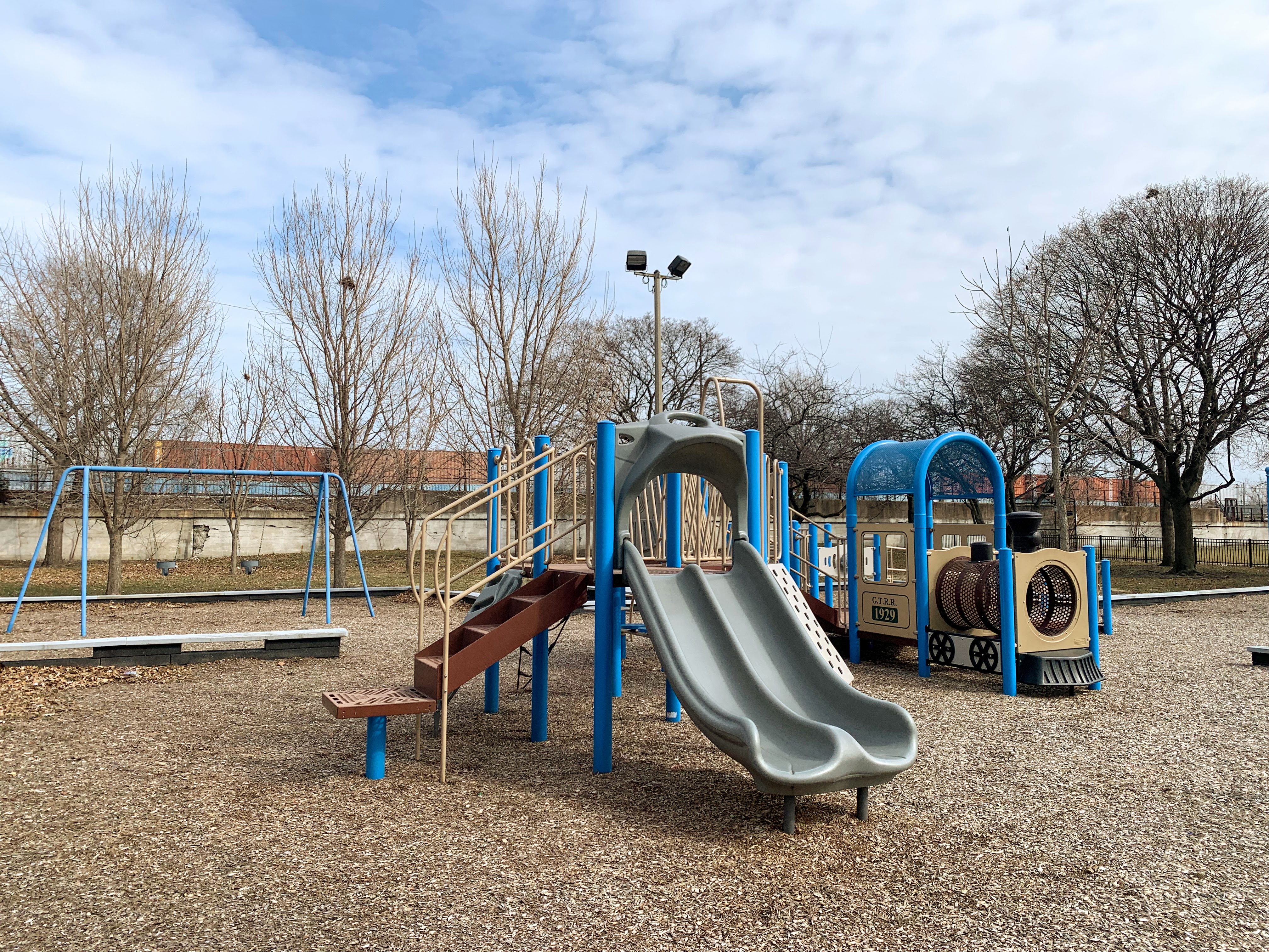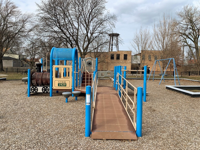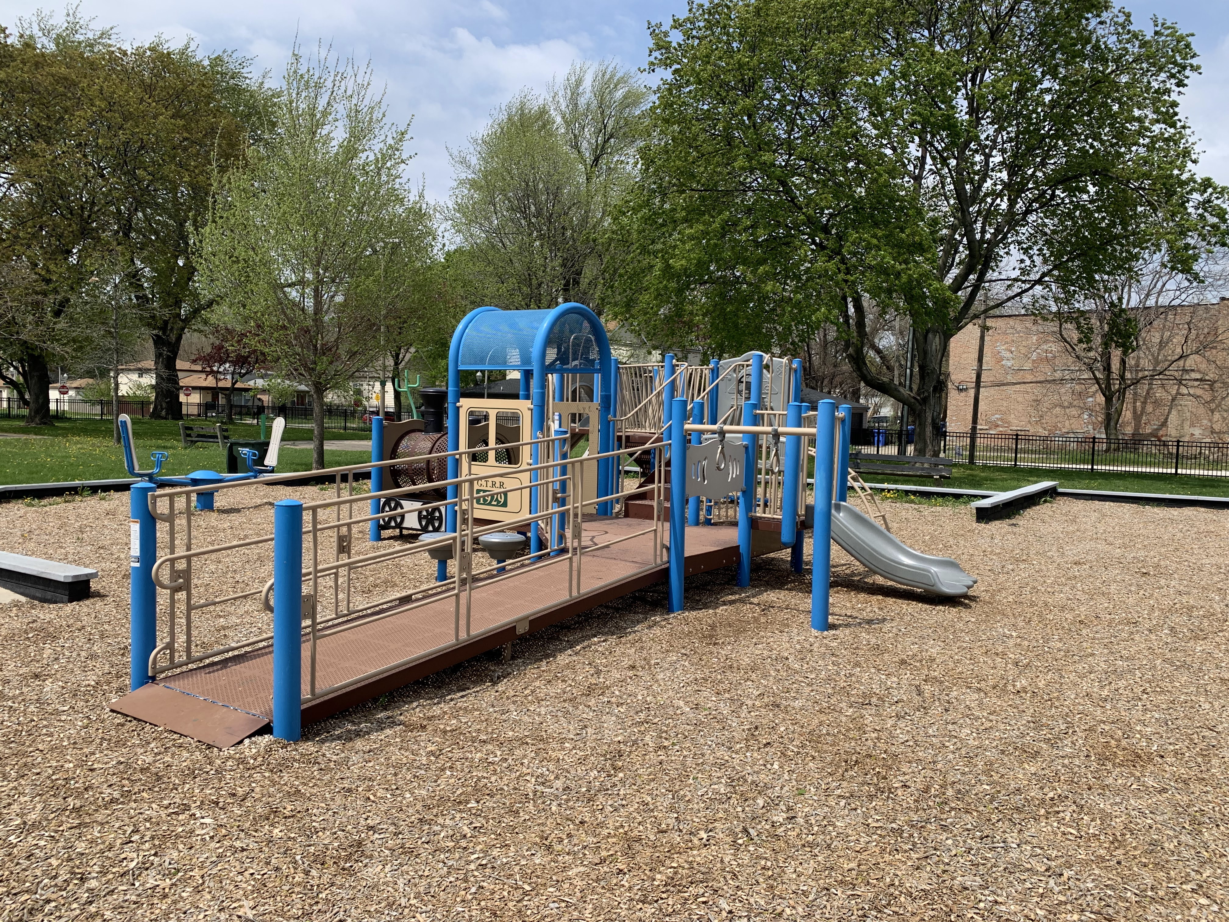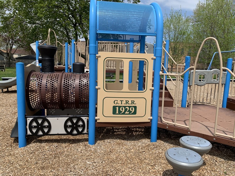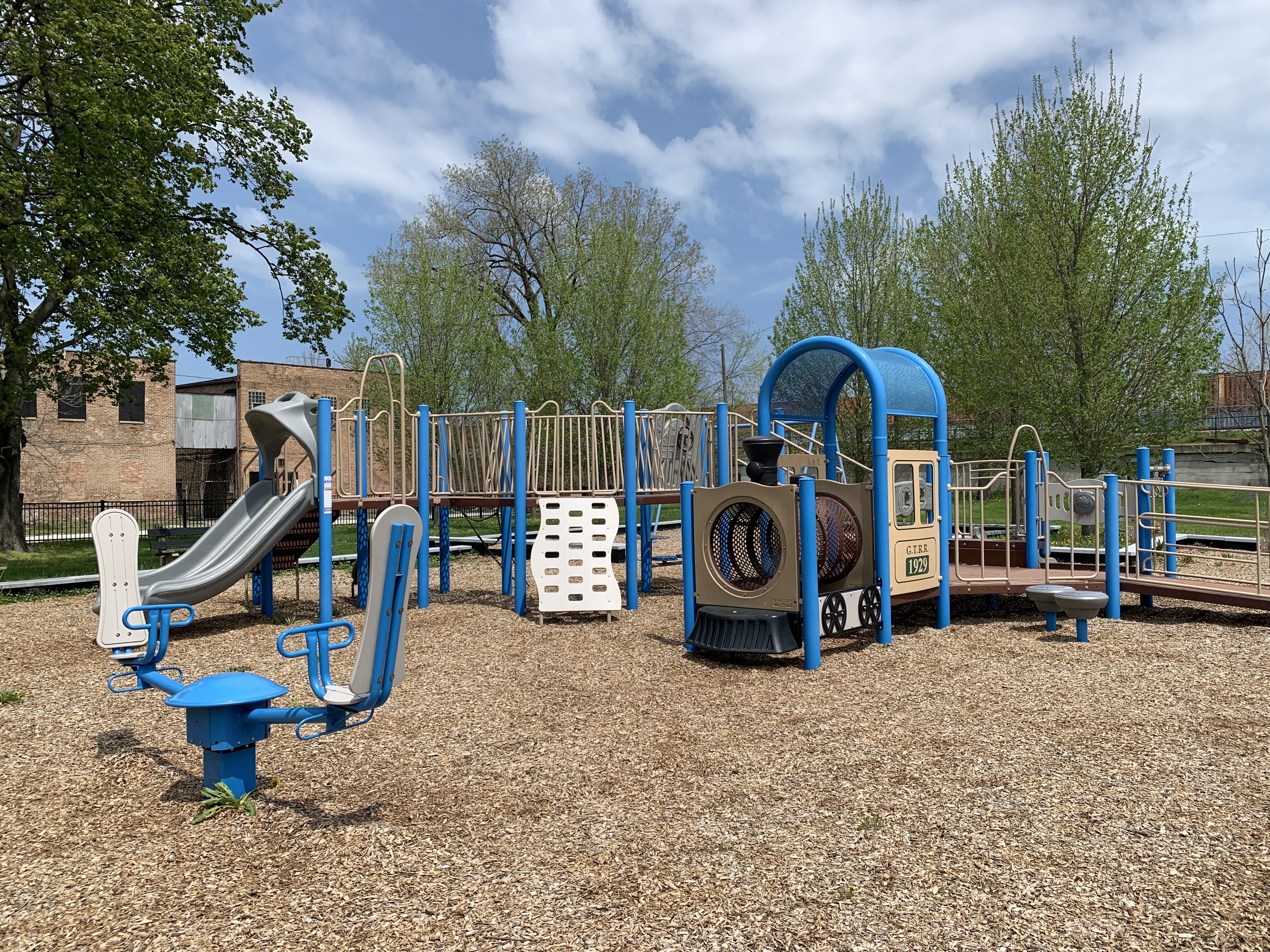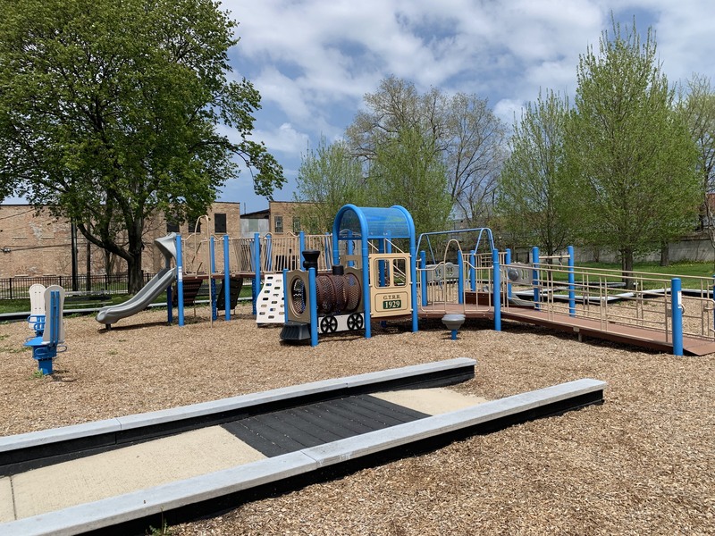 - The playground at Lowe Park was renovated in 2014 and features a train theme fitting its location near a freight train track. The playground consists of a single large structure with several levels and a few slides that would be suitable for a range of children. There are a few standalone elements and the standard set of Chicago Park swings. There is also a small water spray feature nearby with a single 'cactus sprayer' element. The play area is enclosed from the street and the play surface is wood chips. There are a few benches and the Lowe Park fieldhouse is nearby for bathroom access (if open). There are a few trees in the general area but the playground itself is bright and sunny.