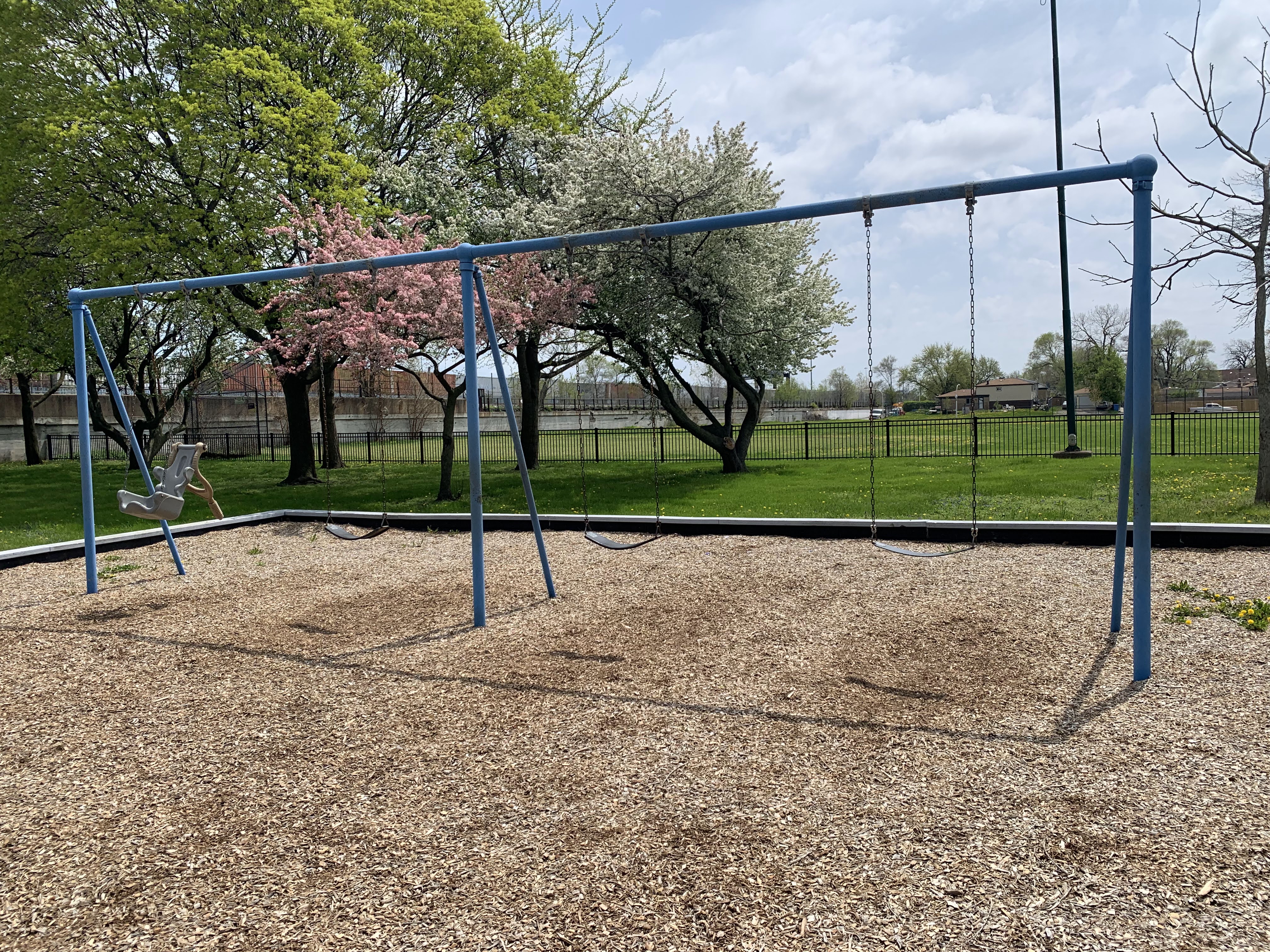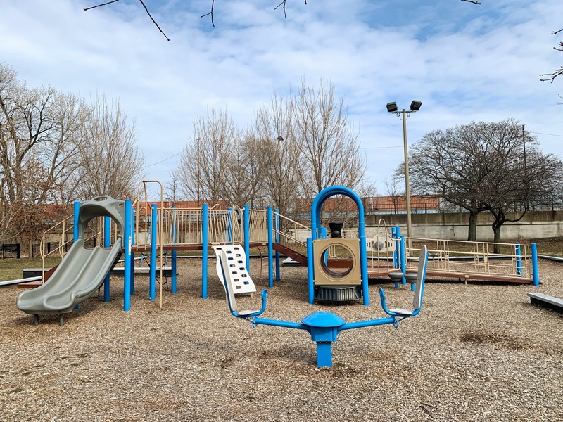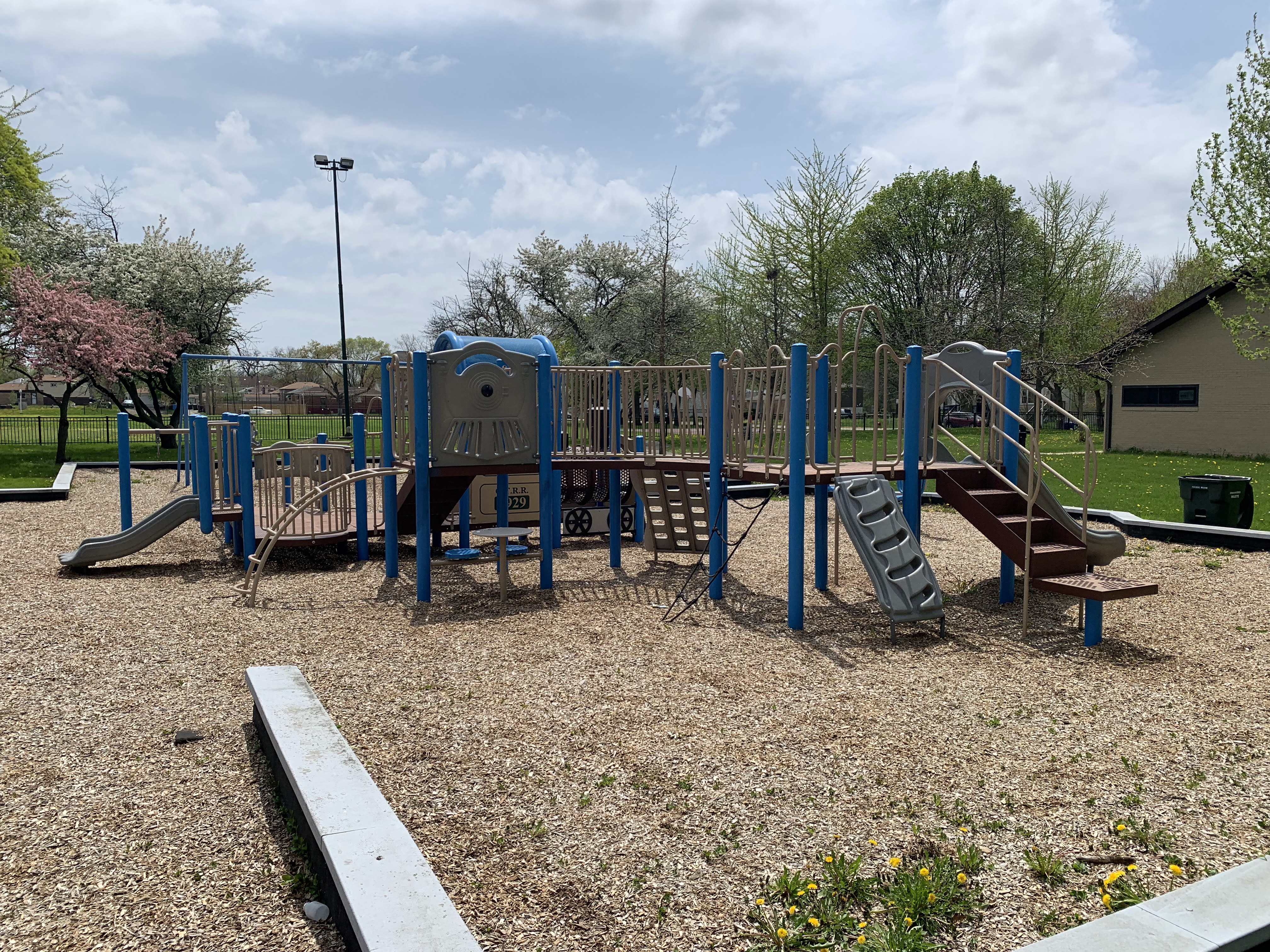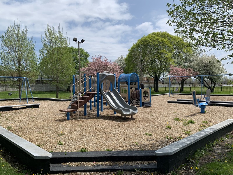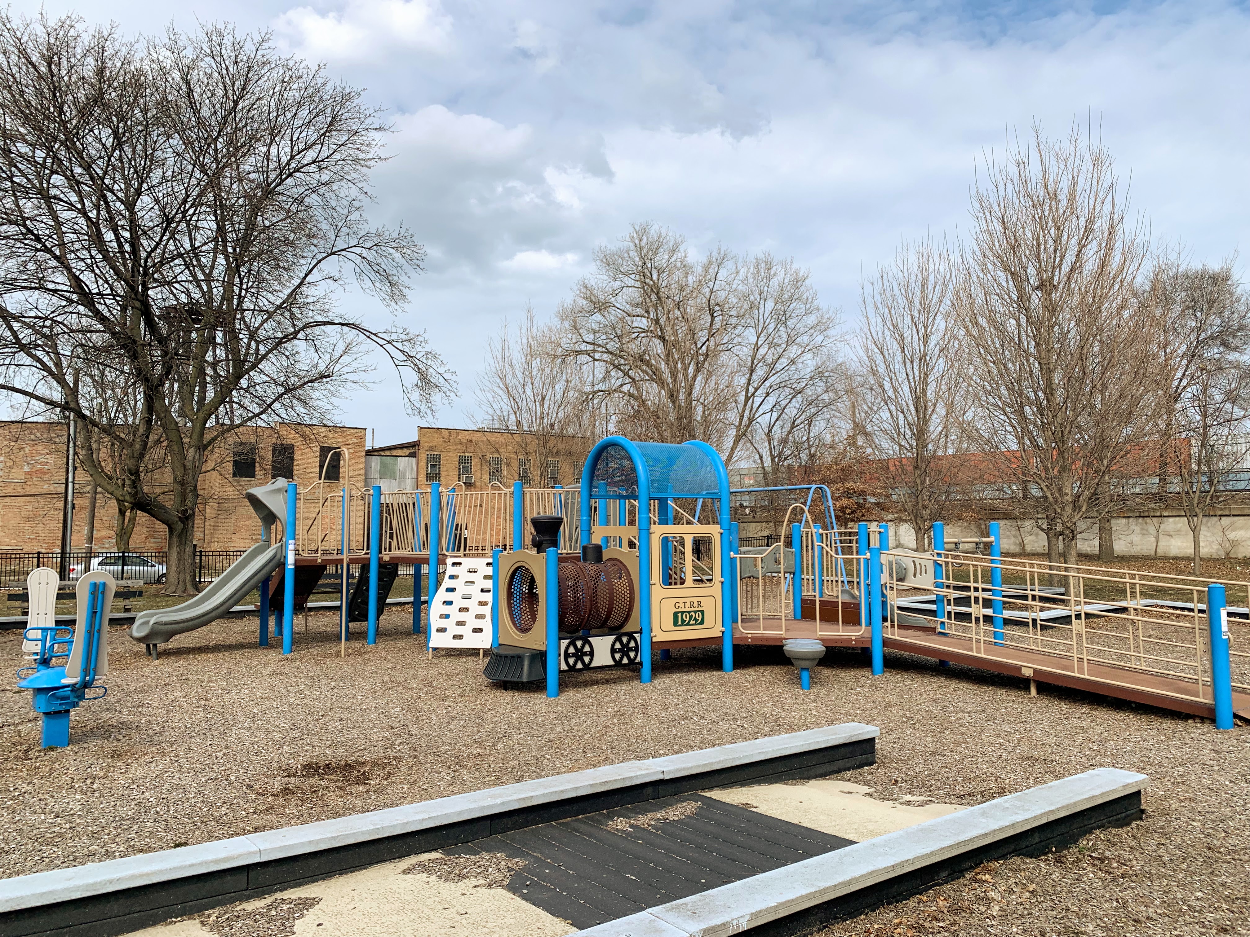 - The playground at Lowe Park was renovated in 2014 and features a train theme fitting its location near a freight train track. The playground consists of a single large structure with several levels and a few slides that would be suitable for a range of children. There are a few standalone elements and the standard set of Chicago Park swings. There is also a small water spray feature nearby with a single 'cactus sprayer' element. The play area is enclosed from the street and the play surface is wood chips. There are a few benches and the Lowe Park fieldhouse is nearby for bathroom access (if open). There are a few trees in the general area but the playground itself is bright and sunny.