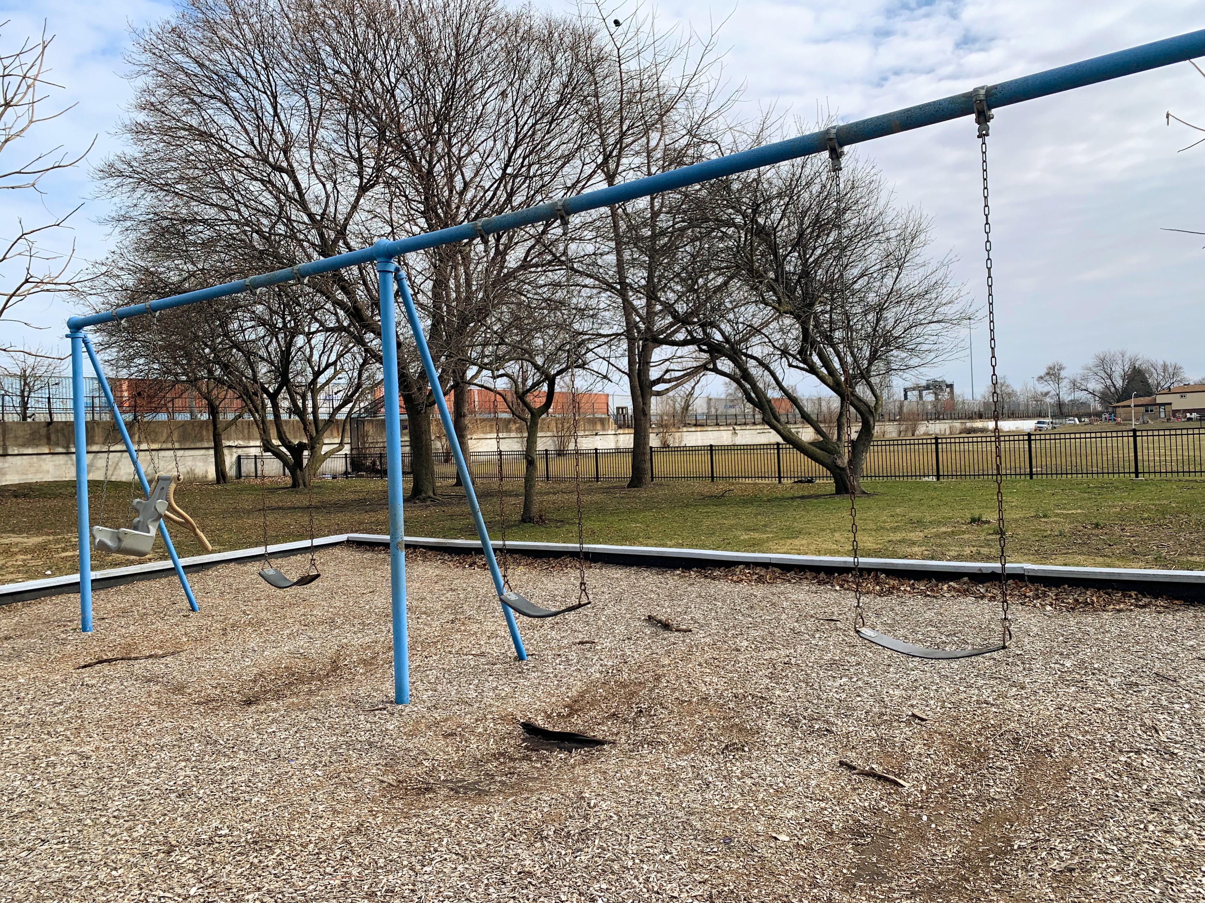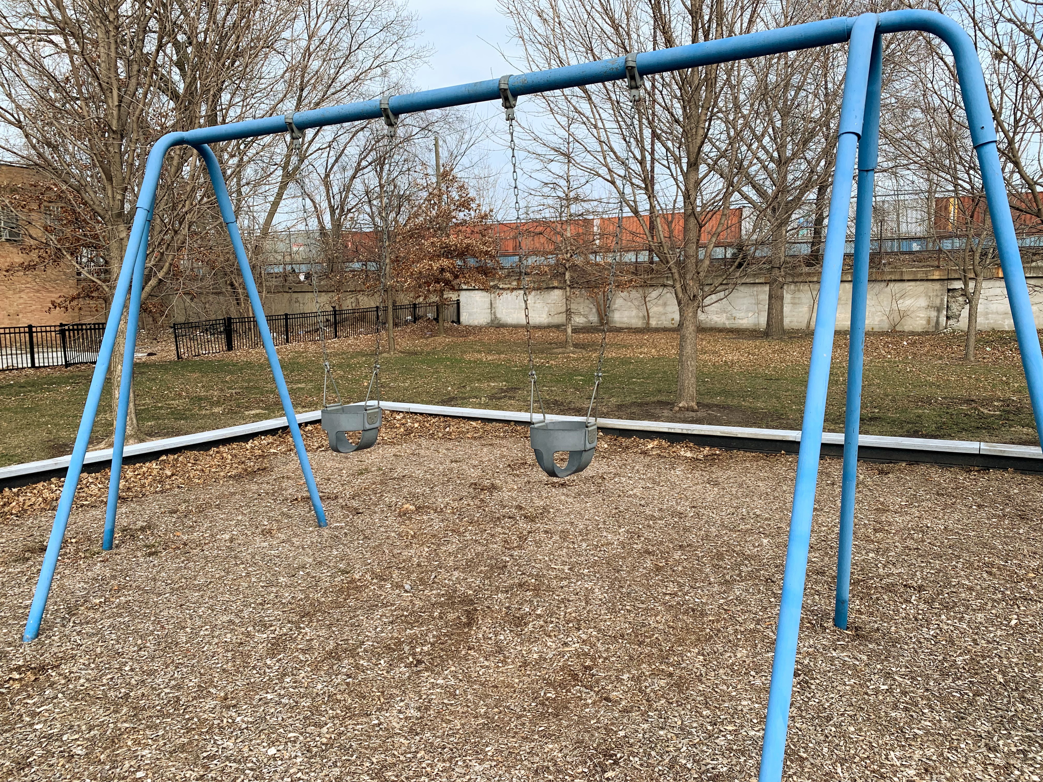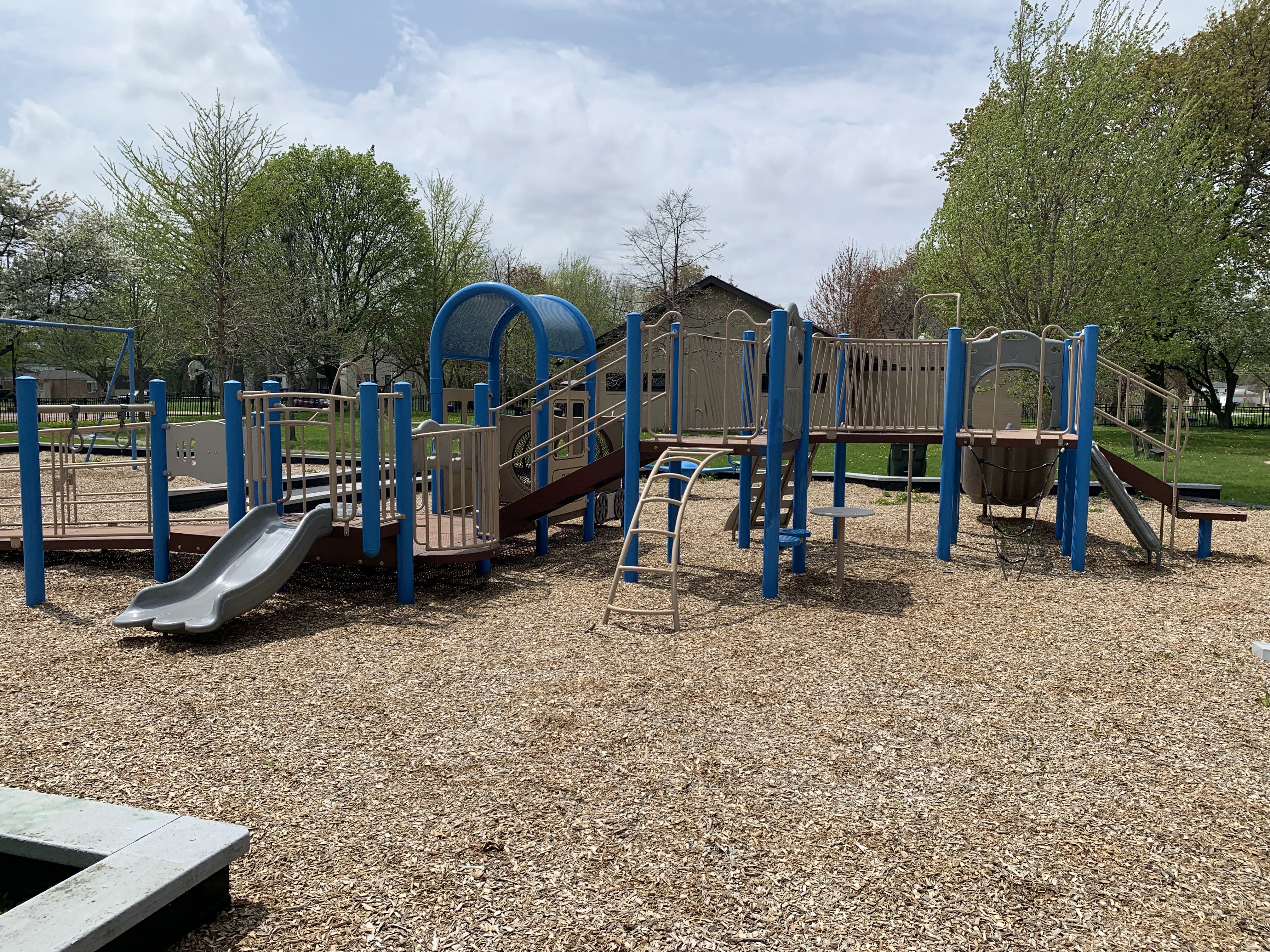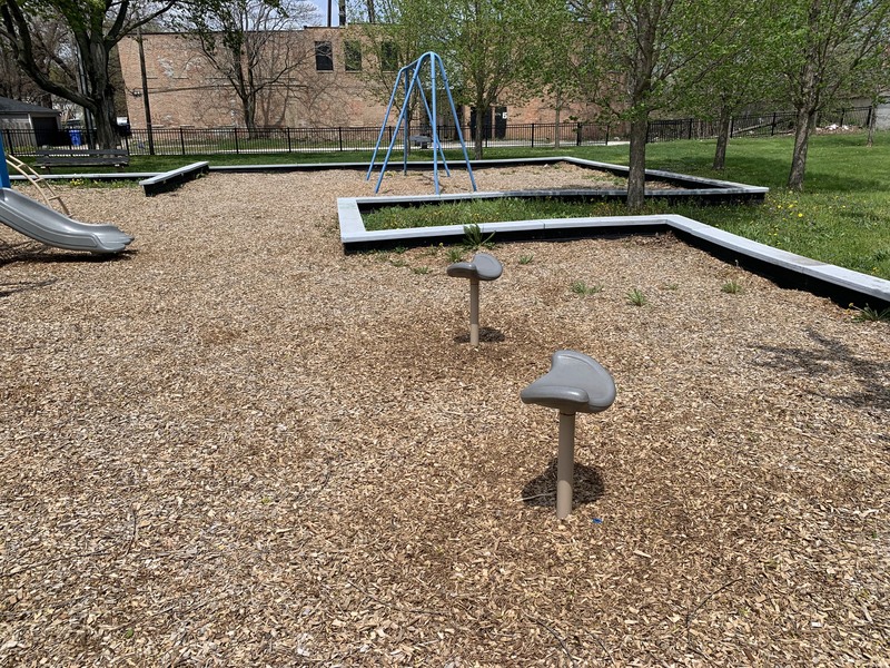 - The playground at Lowe Park was renovated in 2014 and features a train theme fitting its location near a freight train track. The playground consists of a single large structure with several levels and a few slides that would be suitable for a range of children. There are a few standalone elements and the standard set of Chicago Park swings. There is also a small water spray feature nearby with a single 'cactus sprayer' element. The play area is enclosed from the street and the play surface is wood chips. There are a few benches and the Lowe Park fieldhouse is nearby for bathroom access (if open). There are a few trees in the general area but the playground itself is bright and sunny.