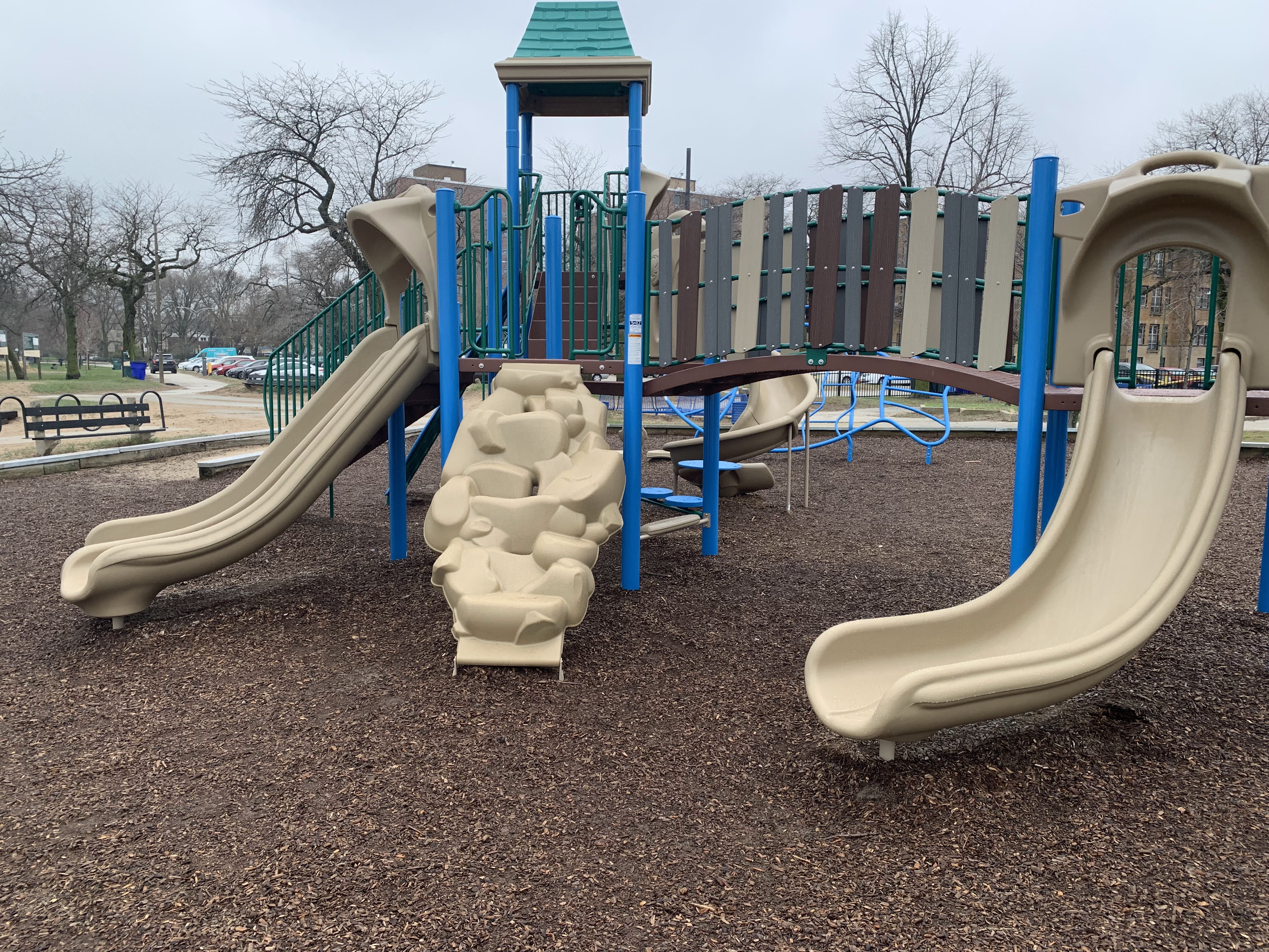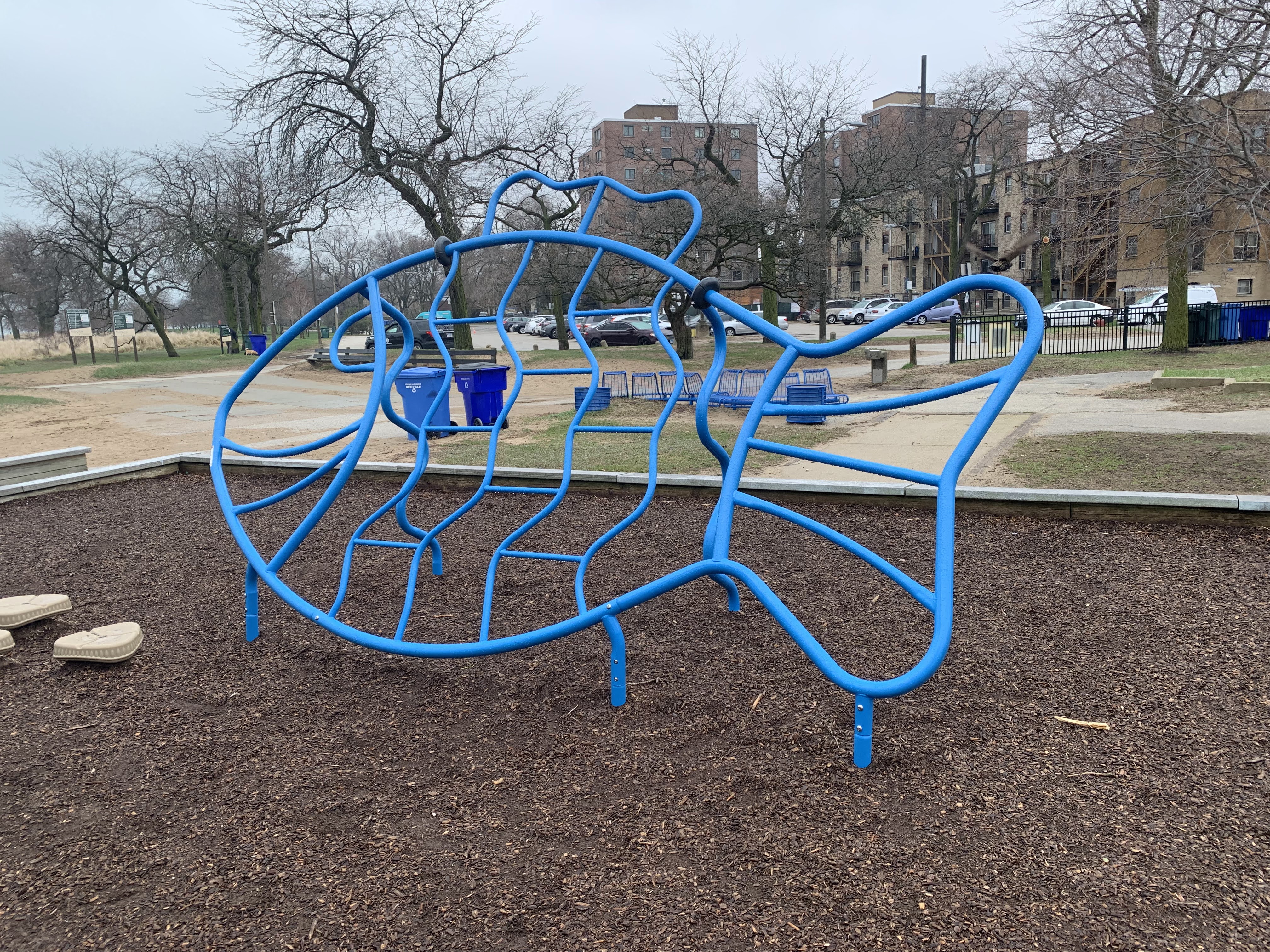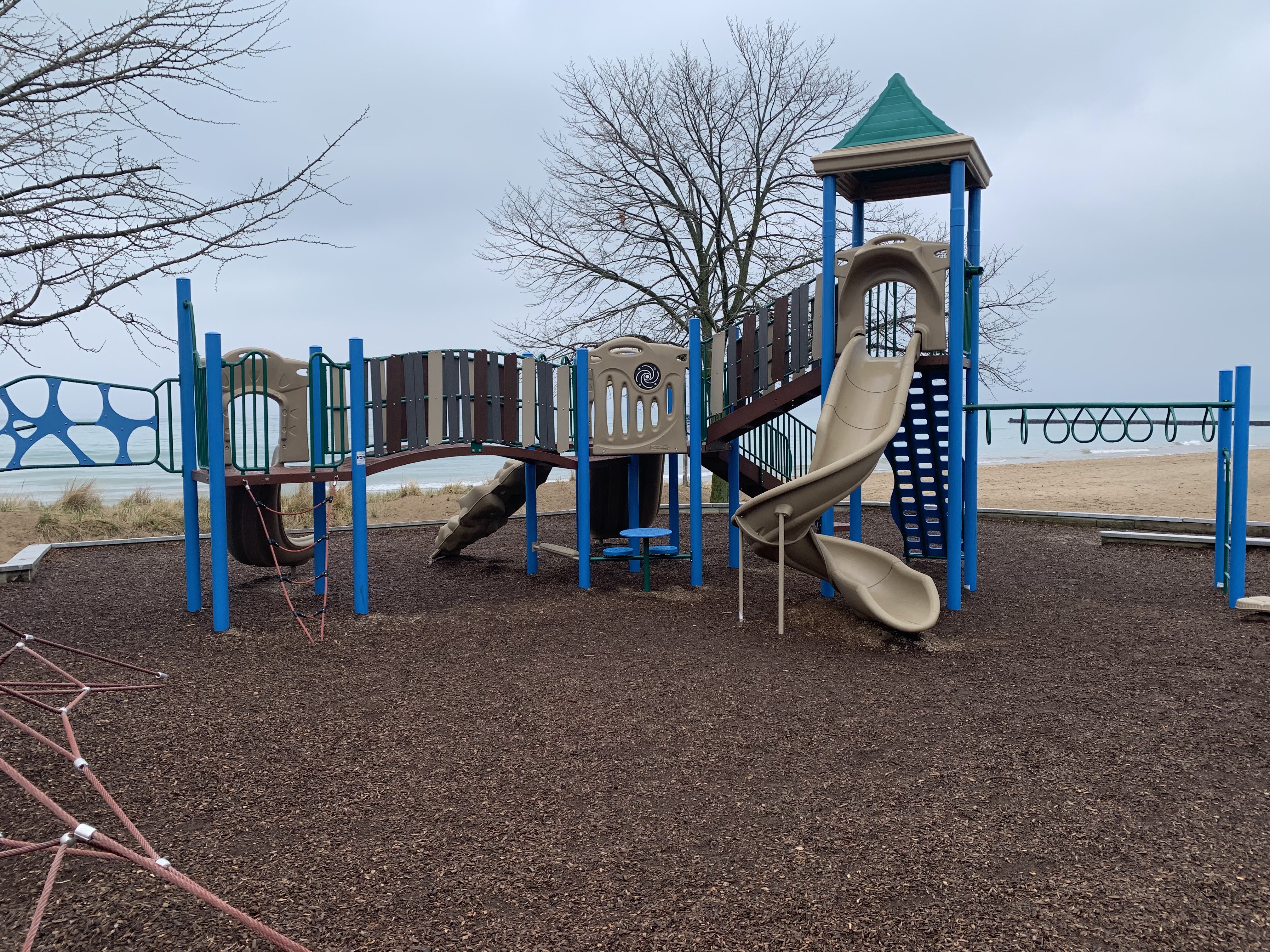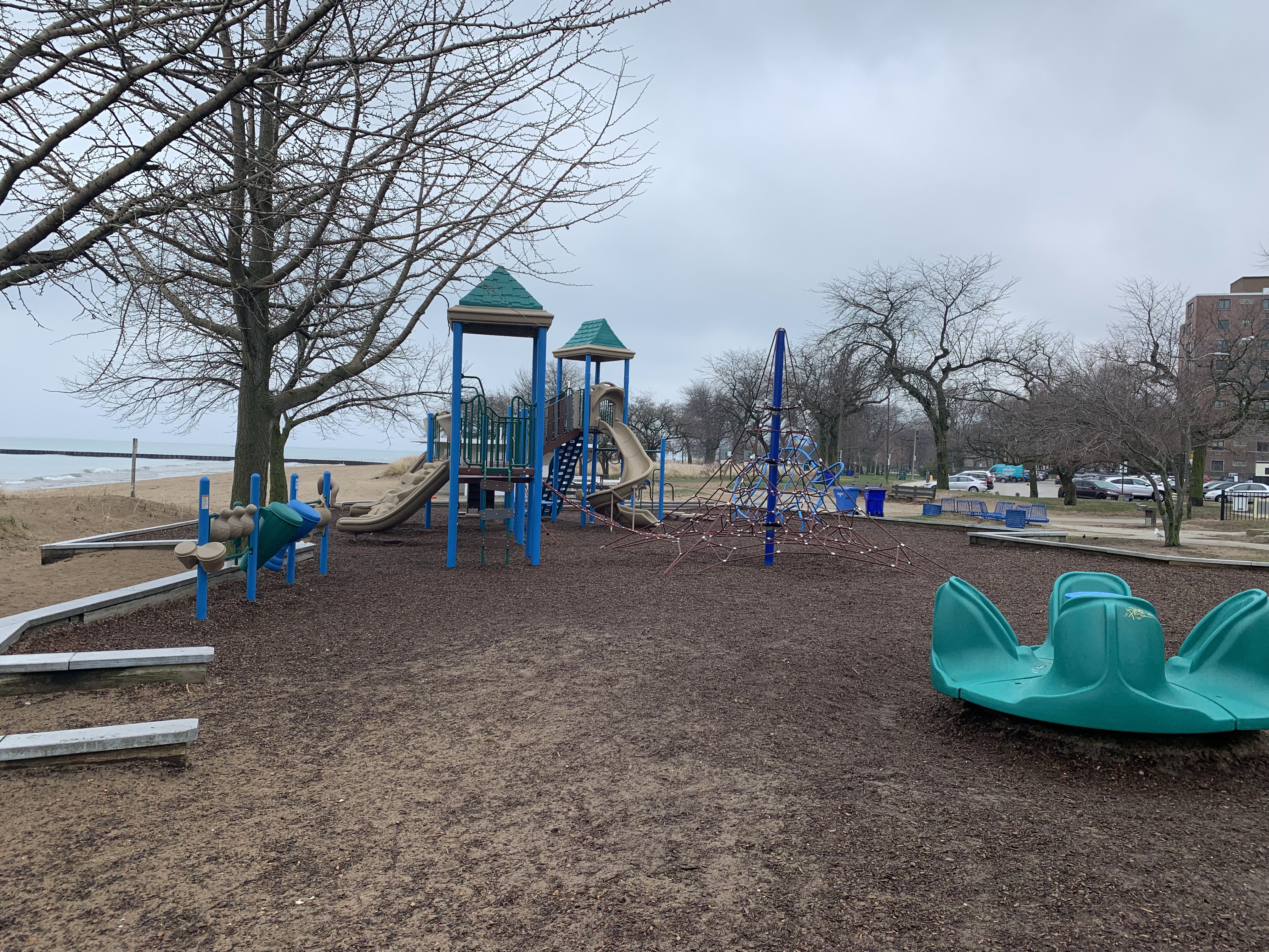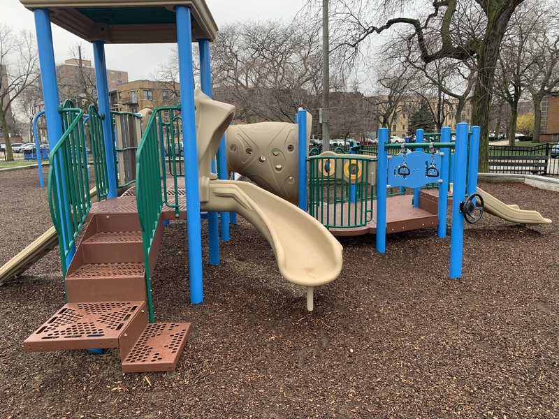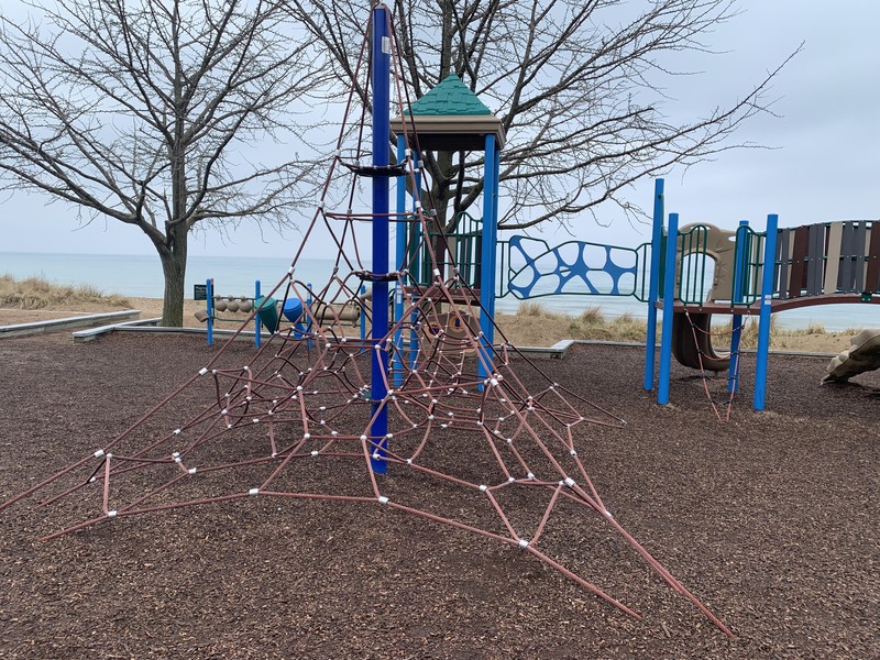 - The Loyola Park playground is a large playground directly next to the Loyola Park Beach on the shores of Lake Michigan. It features a large play structure for older children and a smaller structure for younger children. Unique elements of this playground include a large, metal fish suitable for climbing, an array of musical instruments, and a parent/child swing. The play surface is wood chips though the sandy beach is steps away. There are a few benches nearby and a few trees for shade though the location is quite sunny most of the day. This is a unique playground with great views of Lake Michigan.