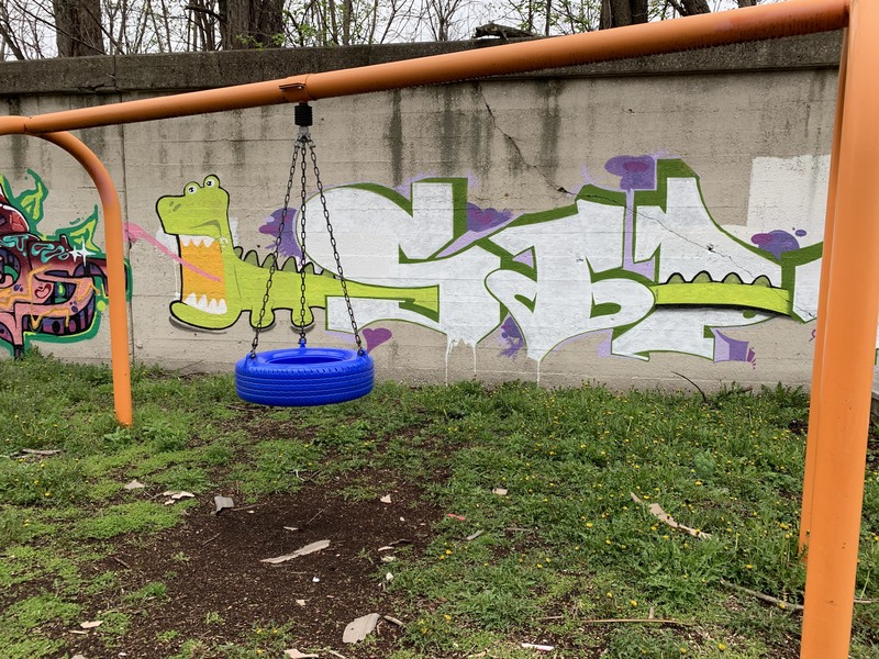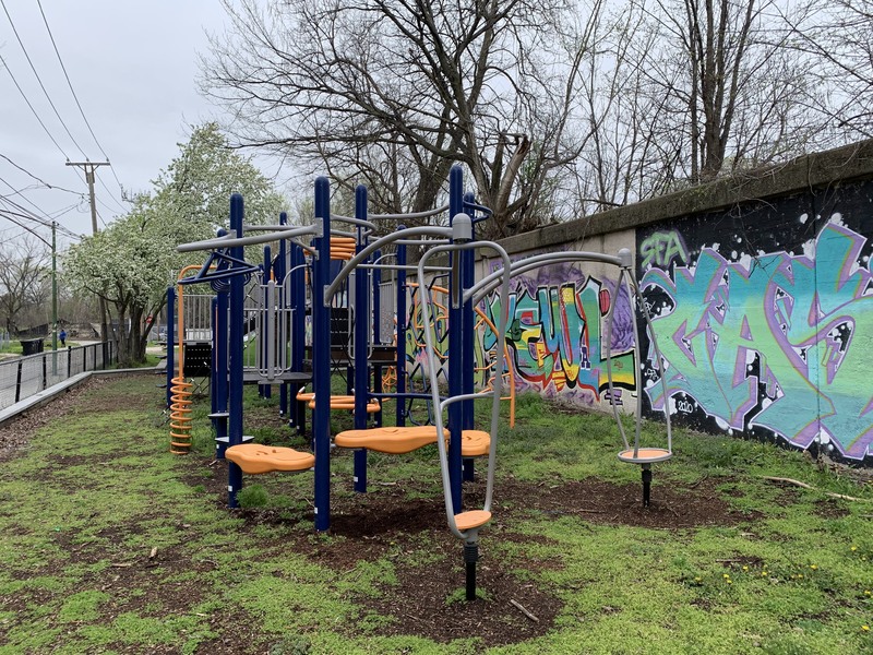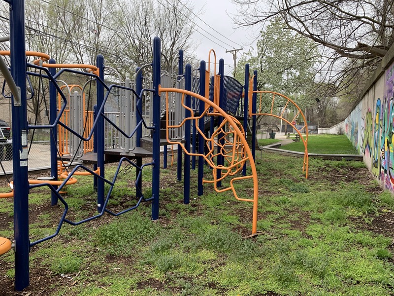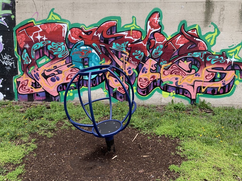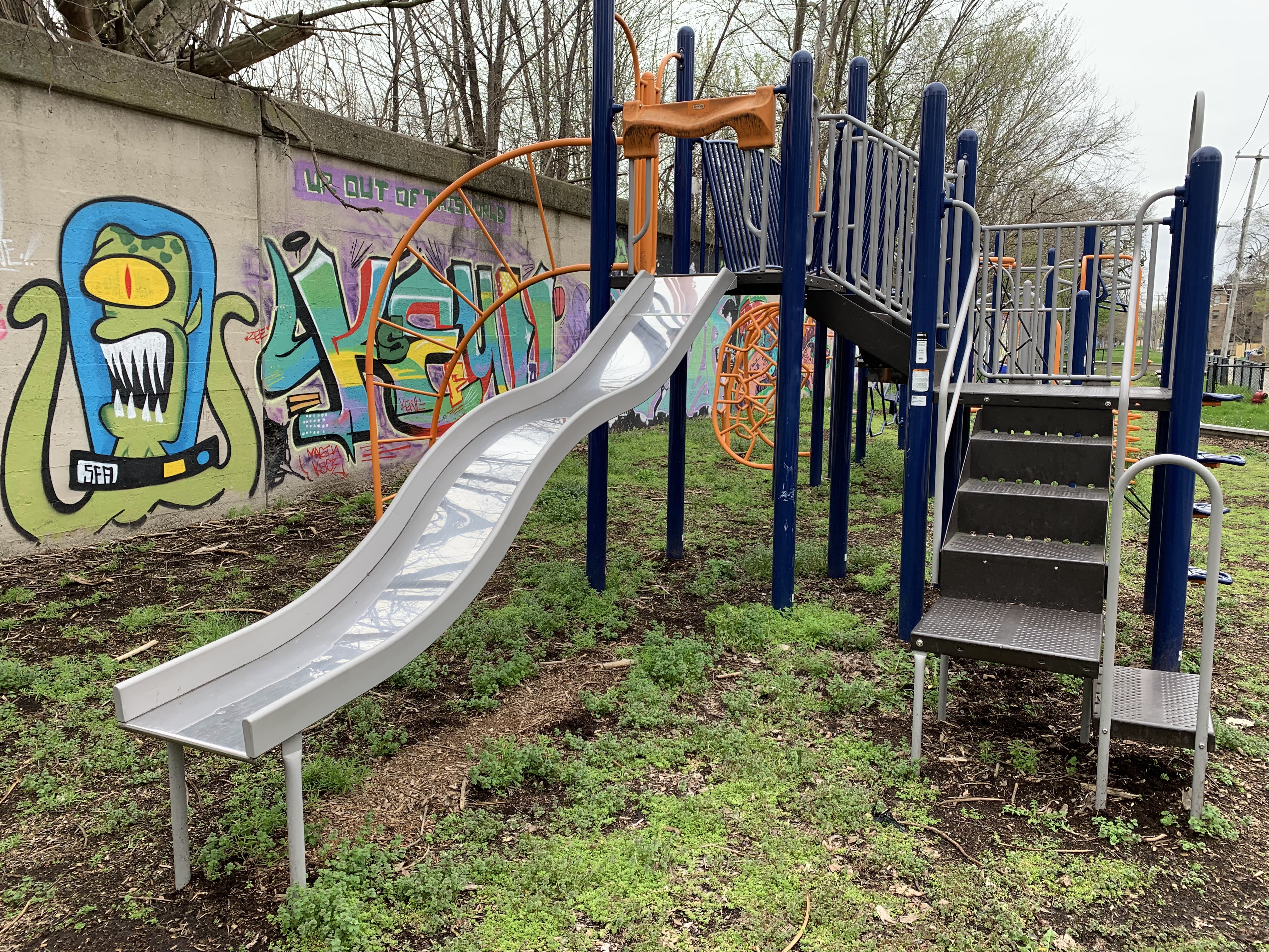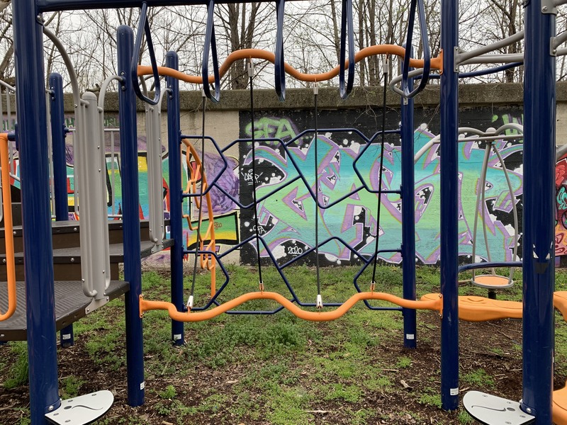 - Lyle Park, situated on a stretch of Wallace Ave that feels more like an alley and next to an elevated freight train line, features some great graffiti art and climbing elements. The main play structure was installed in 2016 and features a number of unique metal climbing and traversing elements and - curiously - just one metal slide. There are swings (toddler, traditional, and tire) in the narrow play area too. The play surface is wood chips and is shaded by large trees.