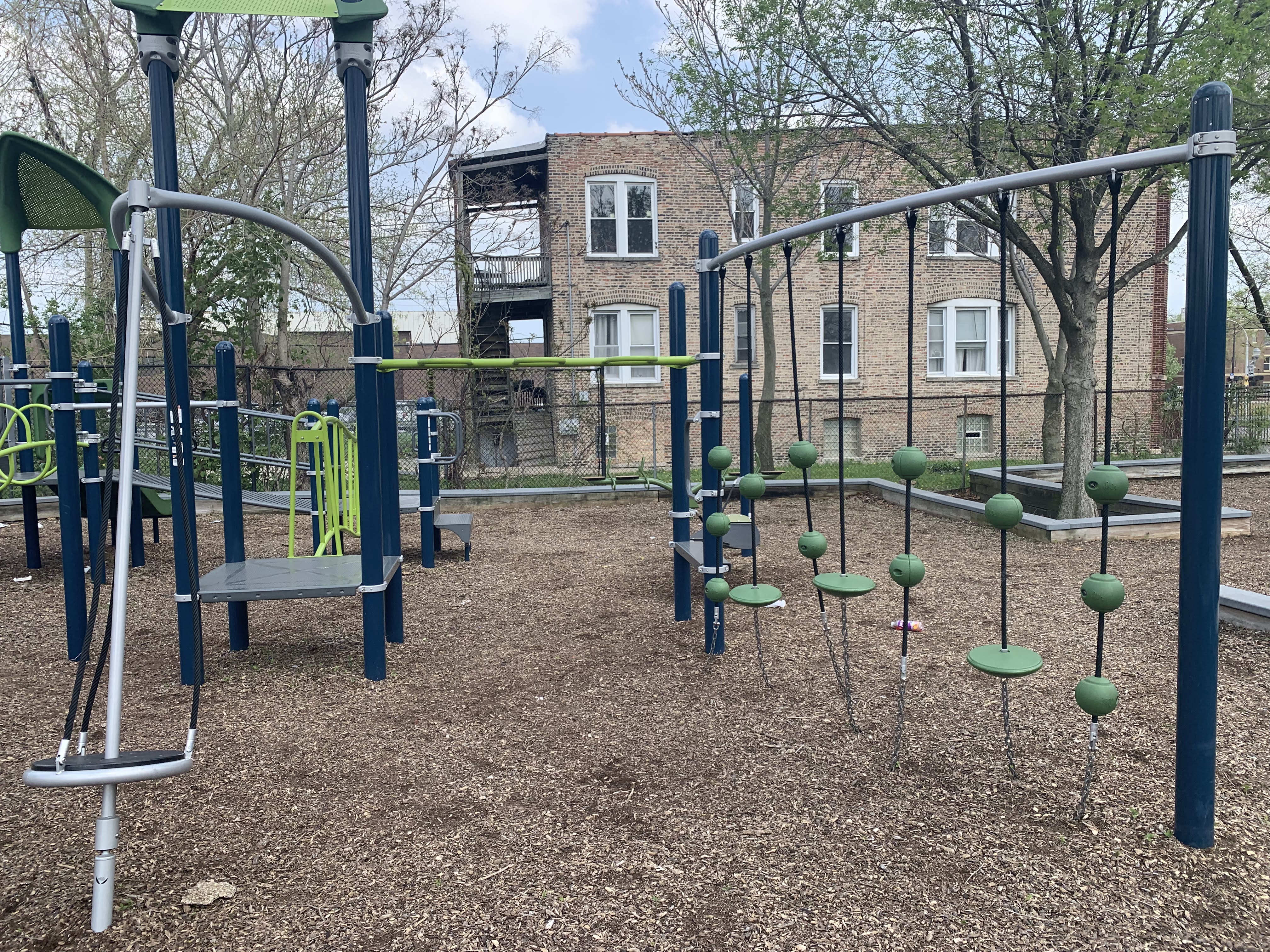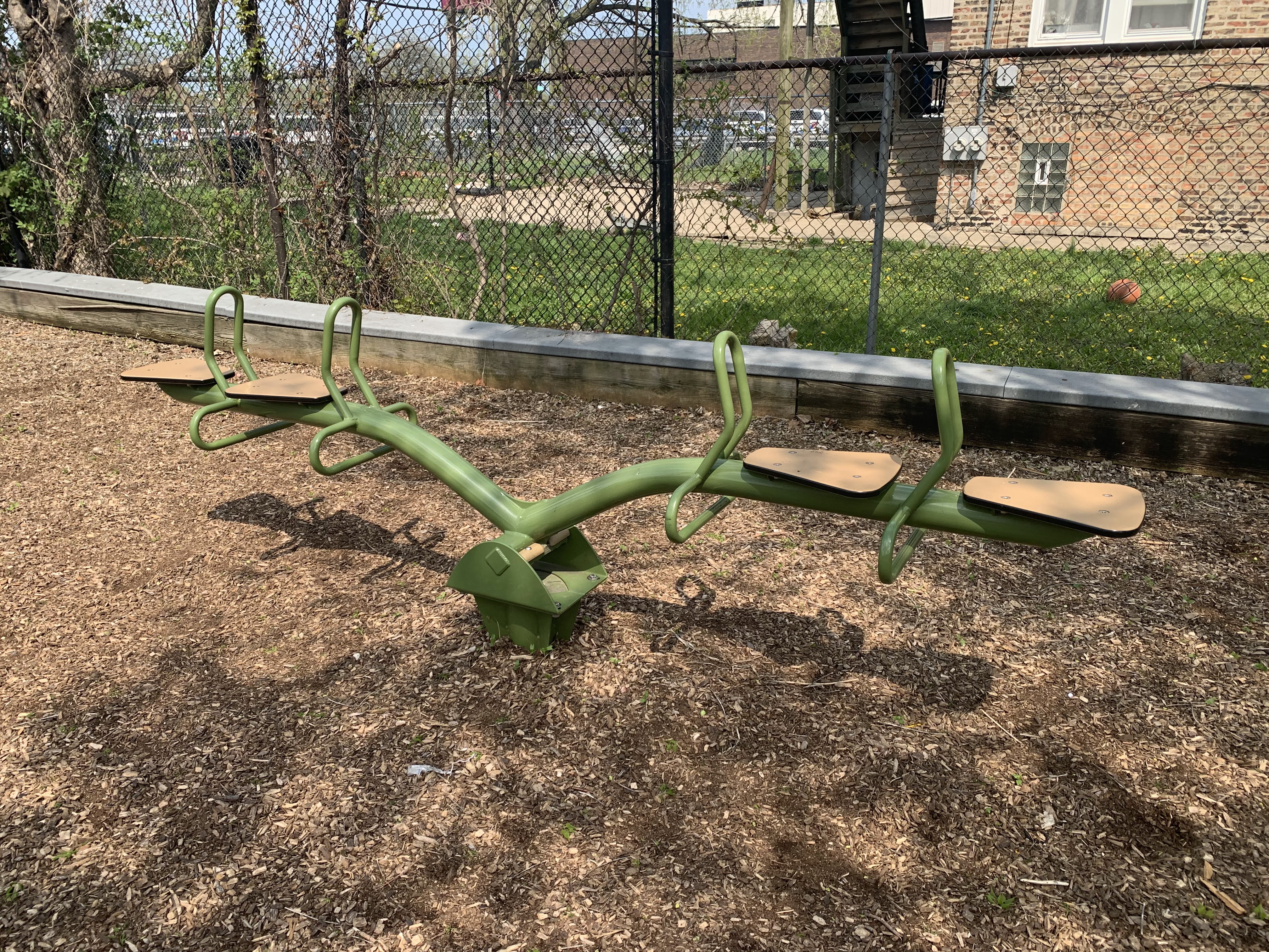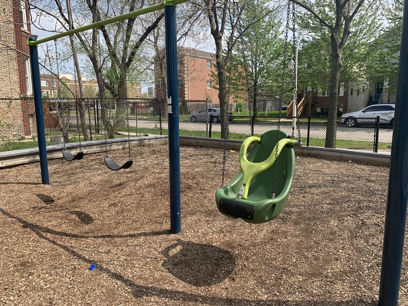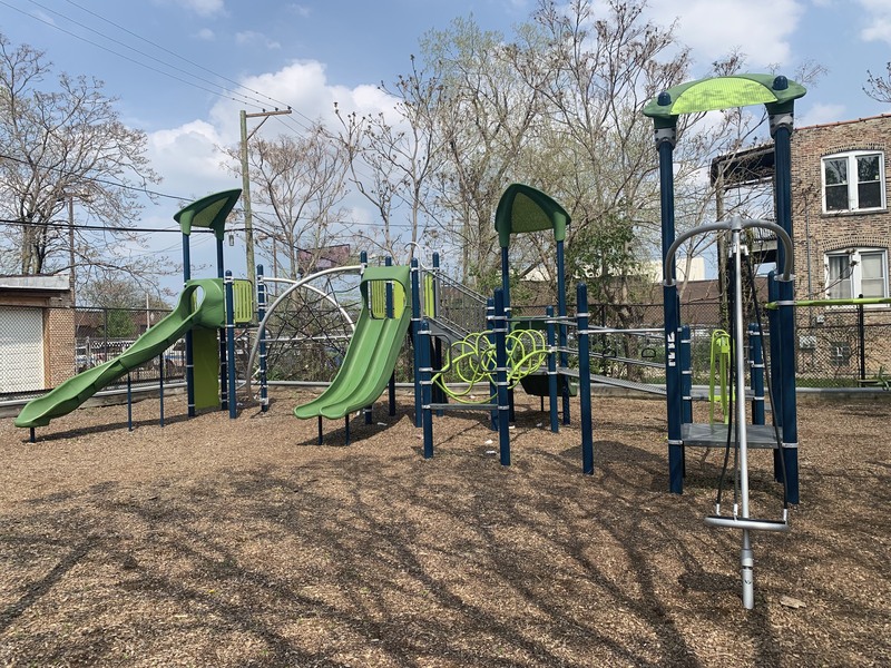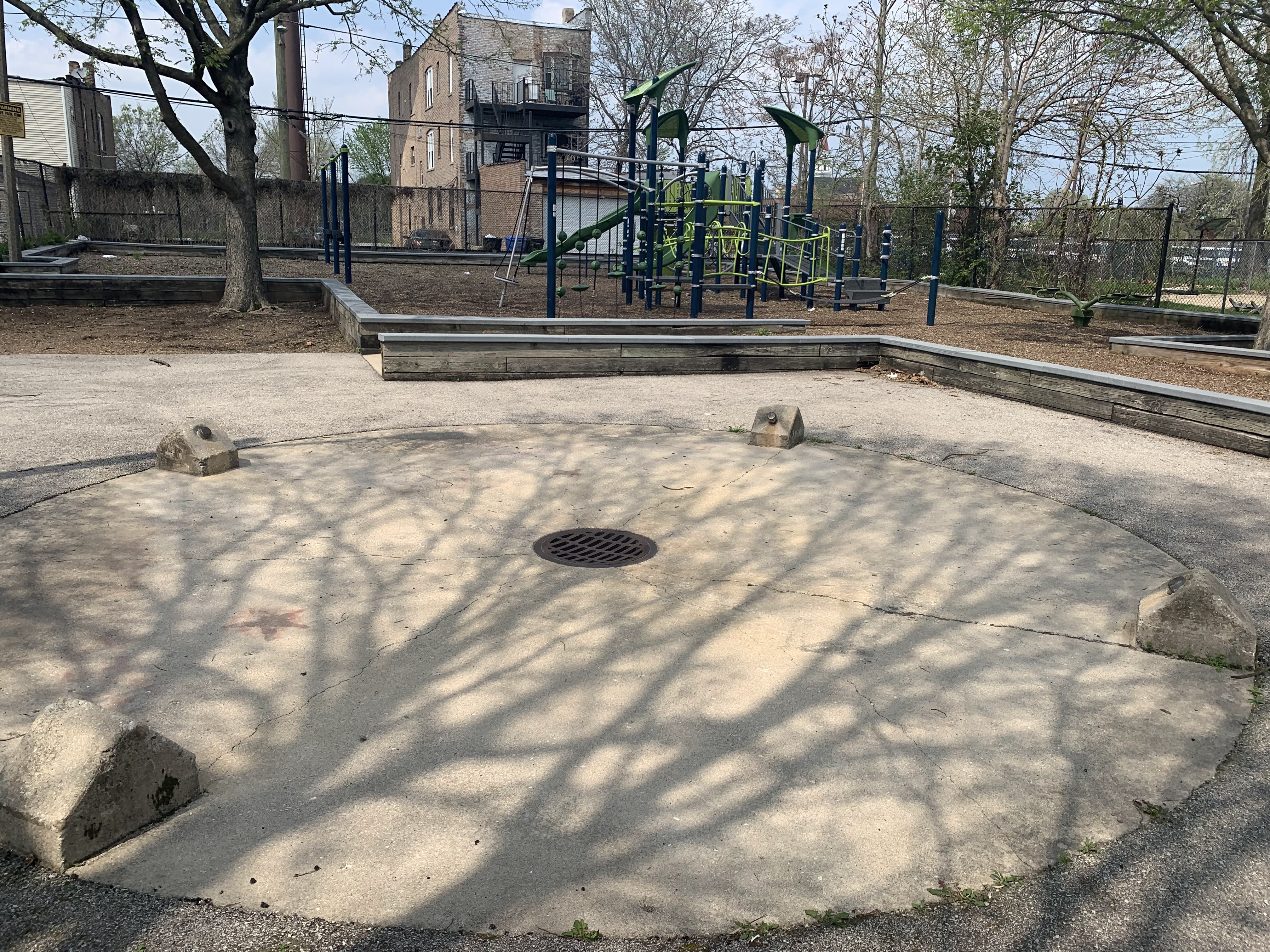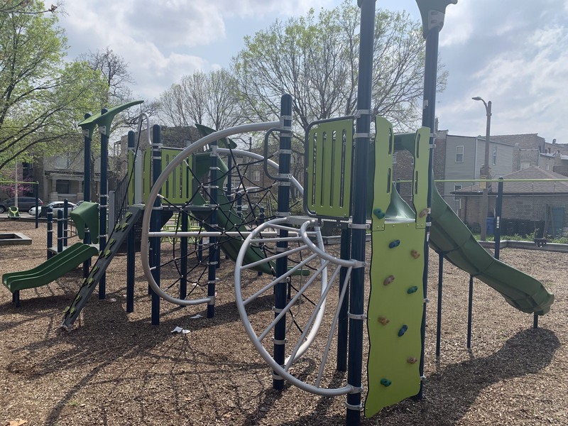 - Magnolia Park is a small neighborhood park with a large playground and small water feature. There is a single, large play structure with a variety of climbing elements (rope/net elements, a horizontal wavy ladder, among others) and a few slides. There is also a standalone see-saw and the standard Park District swings divided between two swing sets. The water feature is a simple 'four sprayer' with four jets of water from angled spouts on the ground. The play area, with a surface of wood chips, is fenced from the street and neighboring lots but it not fully enclosed. A low perimeter walls provides some seating but benches or a picnic table would be a welcome addition to this site. There are some large trees that provide shade throughout the day but the playground is bright and sunny most of the day.