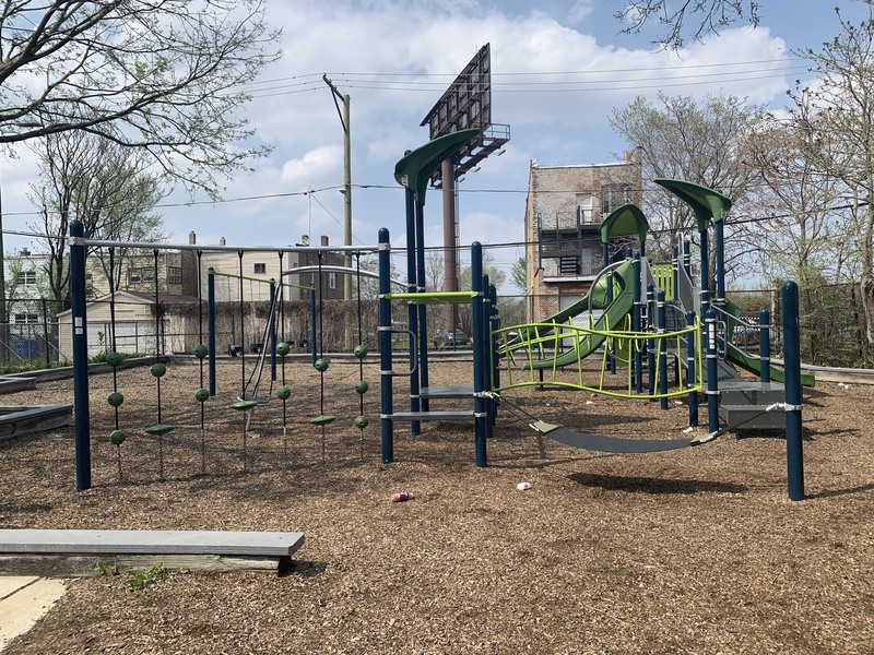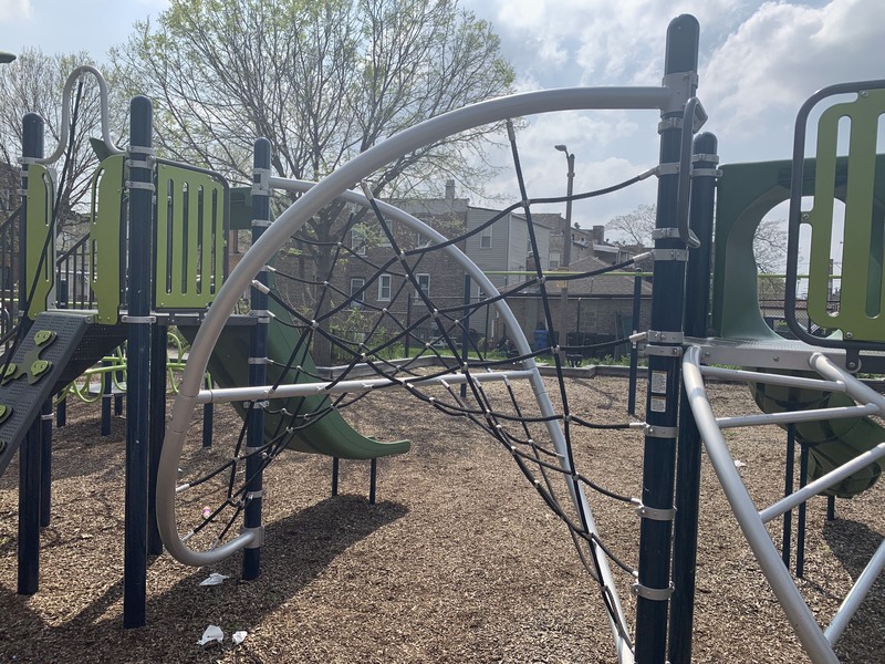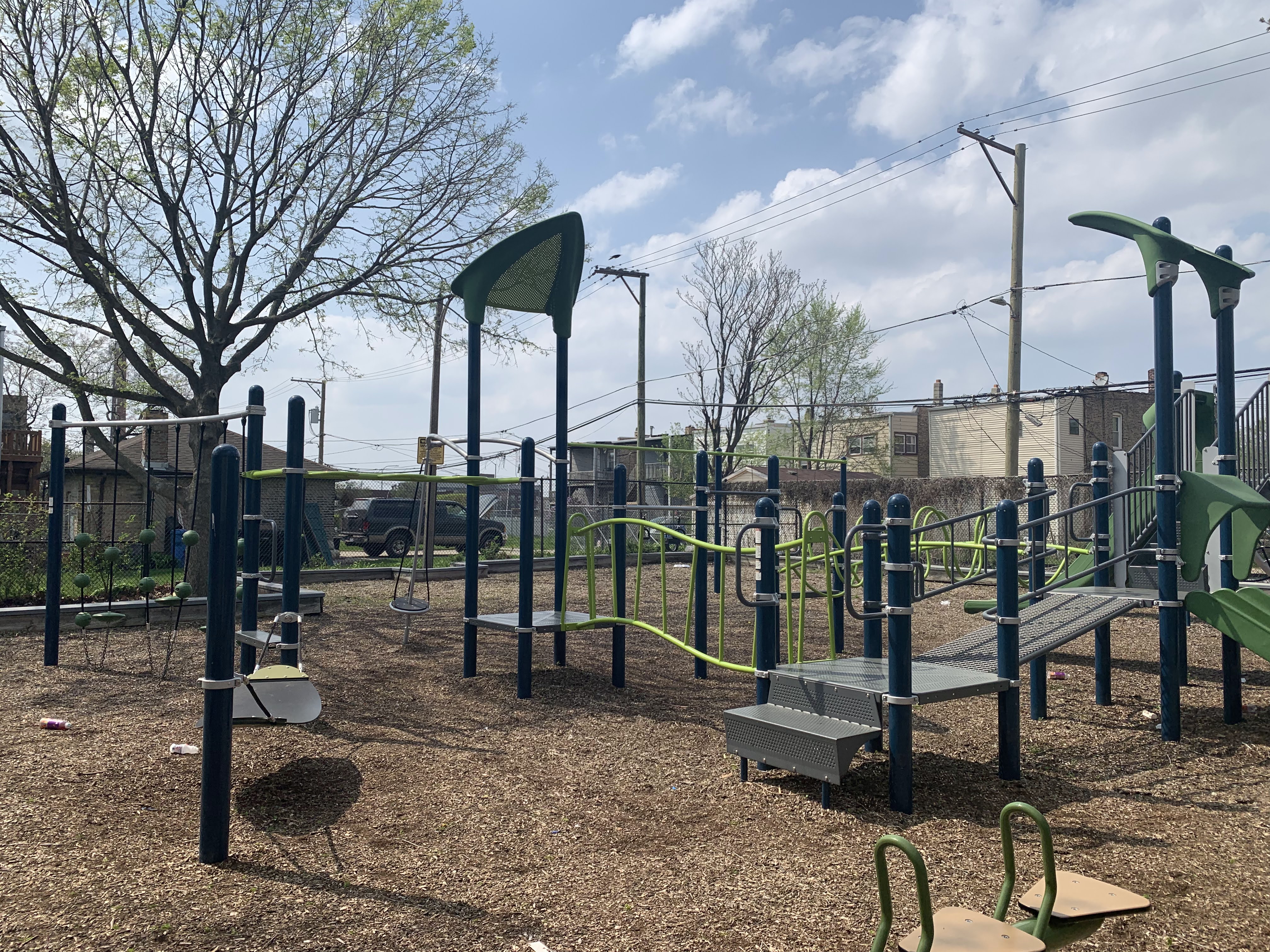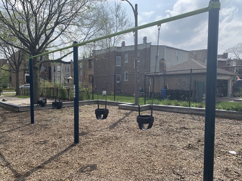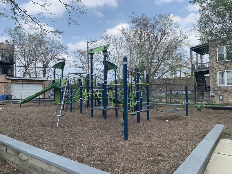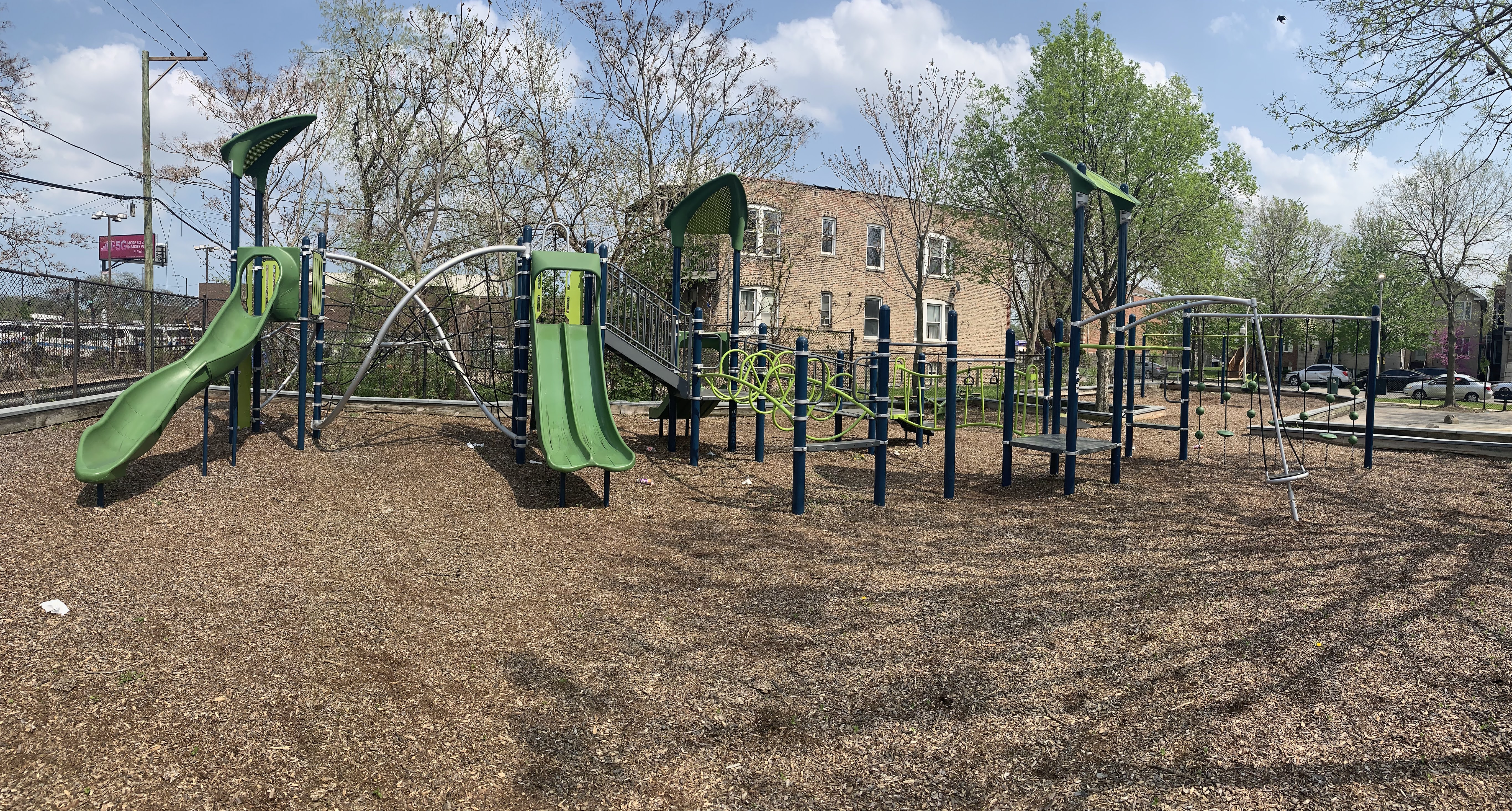 - Magnolia Park is a small neighborhood park with a large playground and small water feature. There is a single, large play structure with a variety of climbing elements (rope/net elements, a horizontal wavy ladder, among others) and a few slides. There is also a standalone see-saw and the standard Park District swings divided between two swing sets. The water feature is a simple 'four sprayer' with four jets of water from angled spouts on the ground. The play area, with a surface of wood chips, is fenced from the street and neighboring lots but it not fully enclosed. A low perimeter walls provides some seating but benches or a picnic table would be a welcome addition to this site. There are some large trees that provide shade throughout the day but the playground is bright and sunny most of the day.