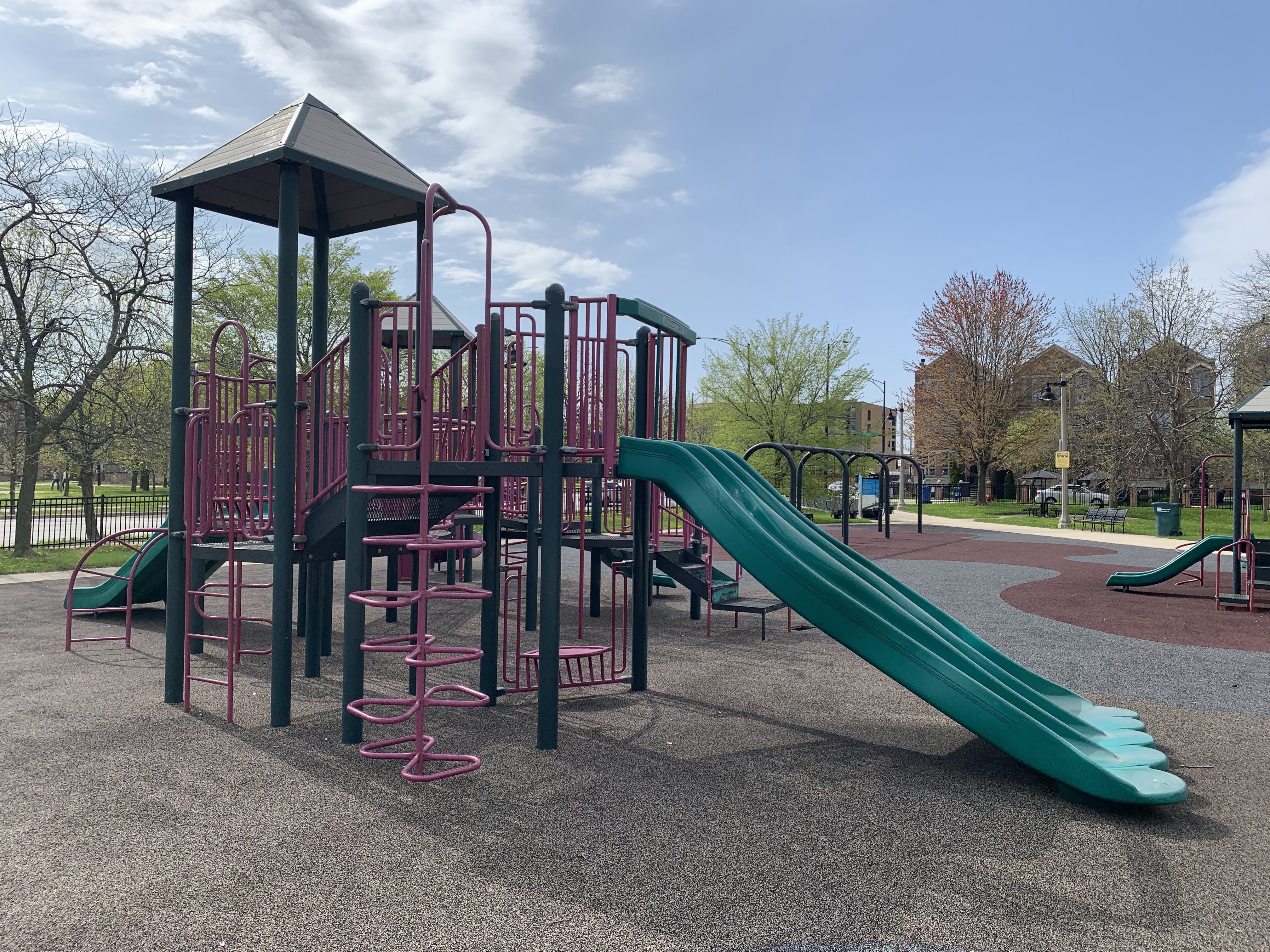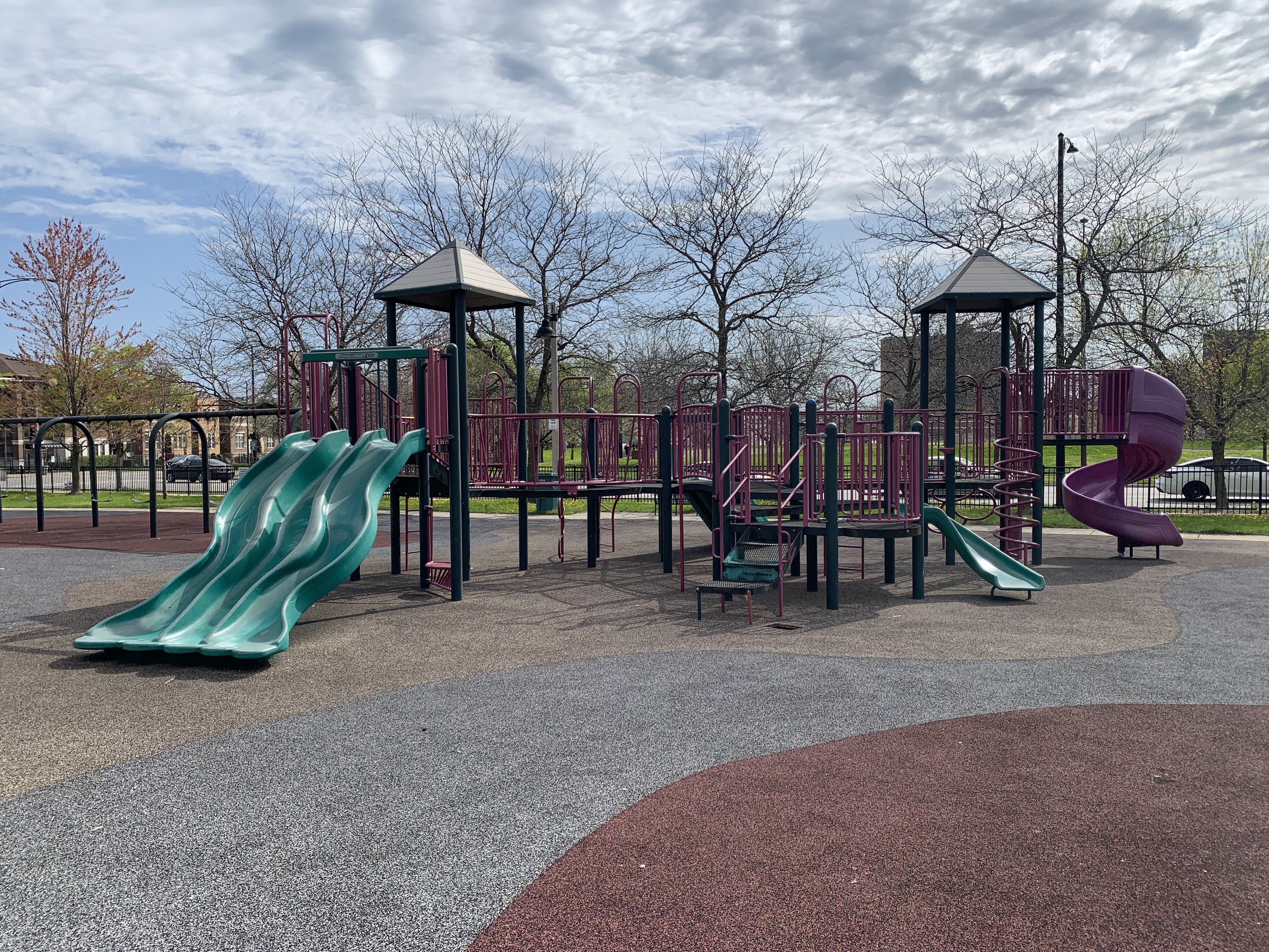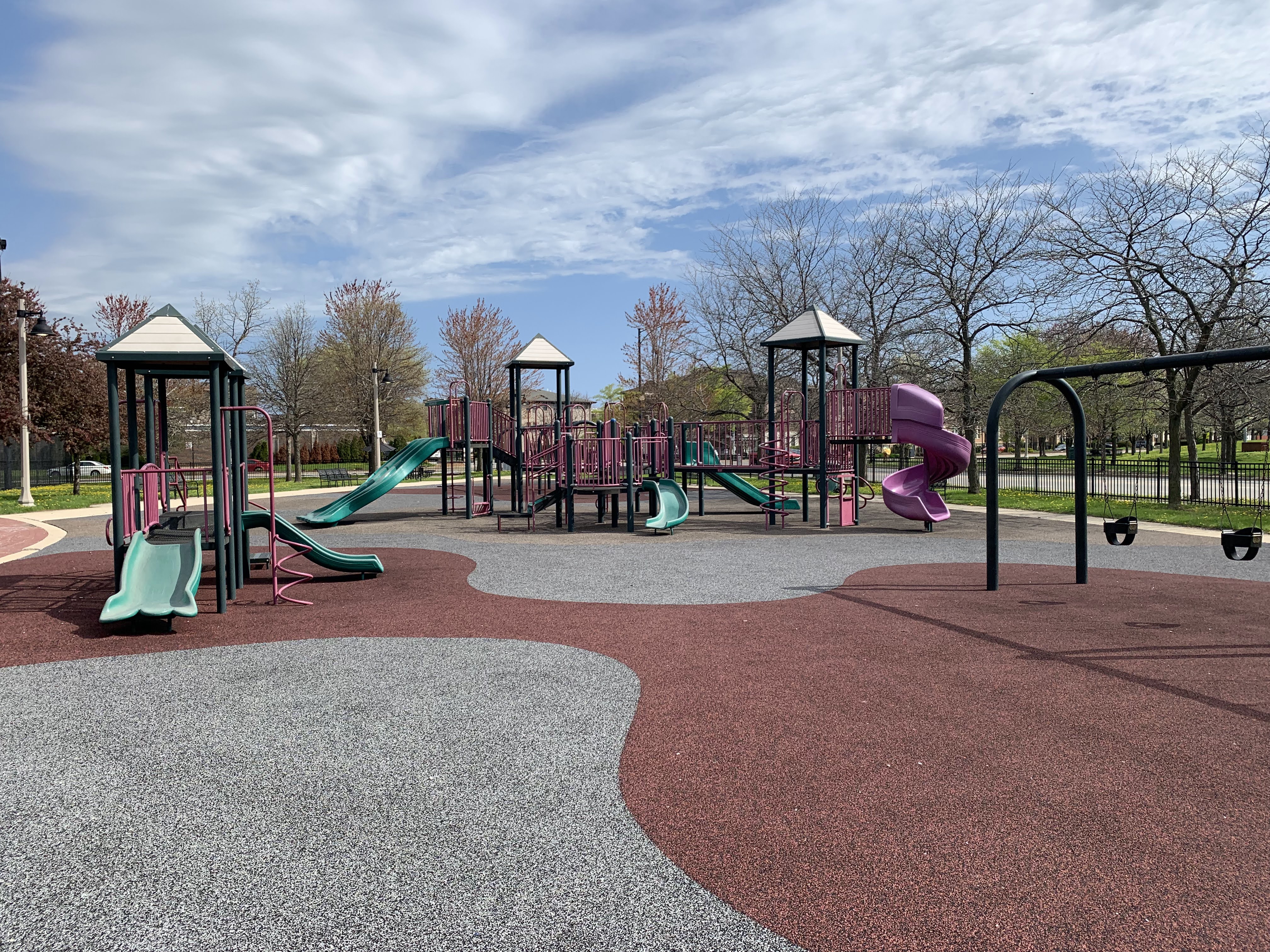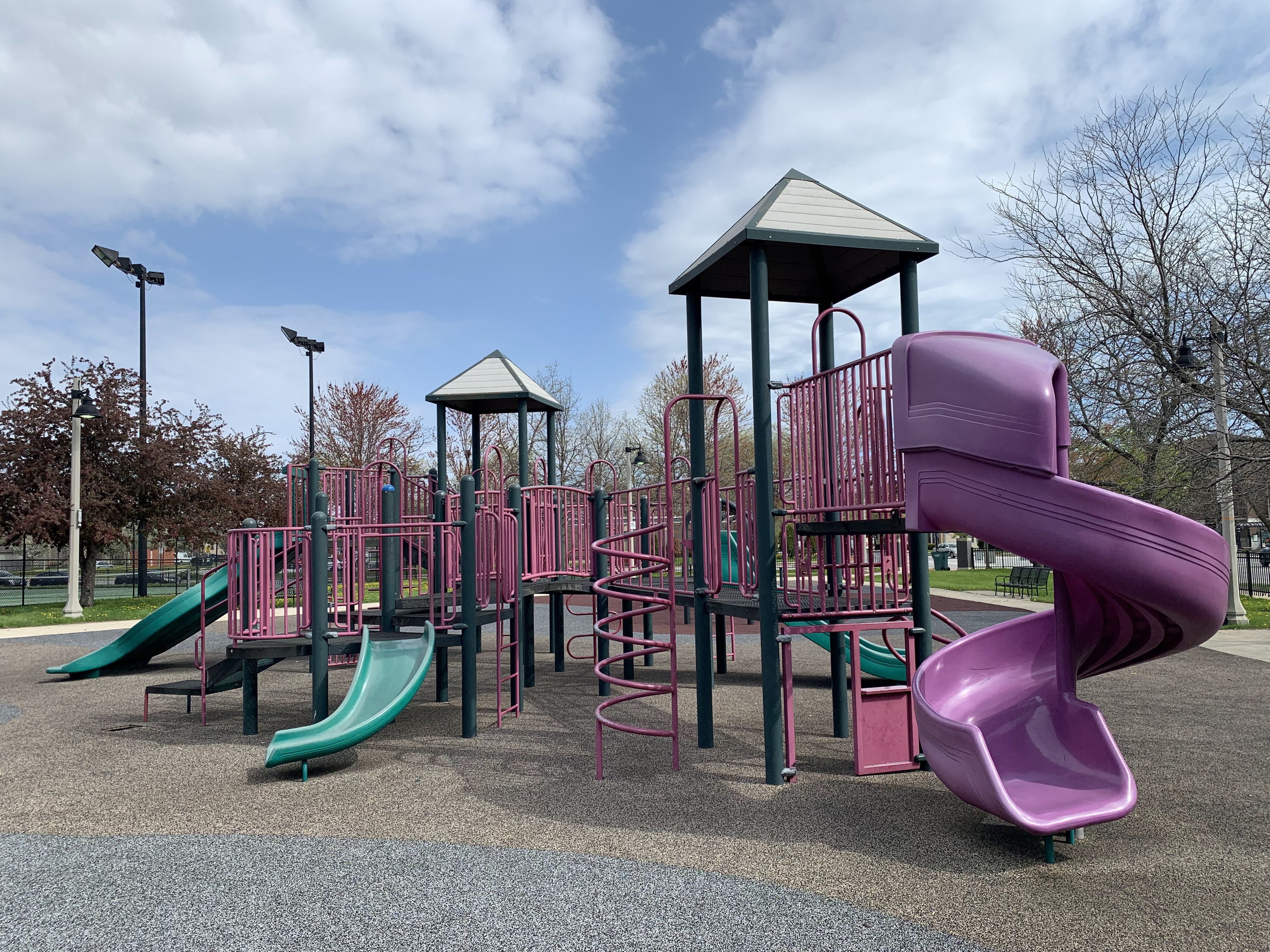 - Mandrake Park was dedicated in 2001 and the playground equipment seems to be original to that era (at the very least, it appears on Google Street View in 2008). There are two play structures - a tiny structure for younger children and a much larger structure for older children. The larger structure contains a triple slide - among others - and some relatively unique climbing elements: an offset corkscrew climber and a ring/bubble climber. There are two sets of swings, one toddler and one standard black belt seat, The play area itself is quite large and has a soft rubber surface. The play area is not fully enclosed but it is fenced from the street and there are a number of benches and even a few picnic tables (with umbrellas!) in the area but the playground itself is bright and sunny. There is also a small fieldhouse nearby with bathrooms and a drinking fountain.