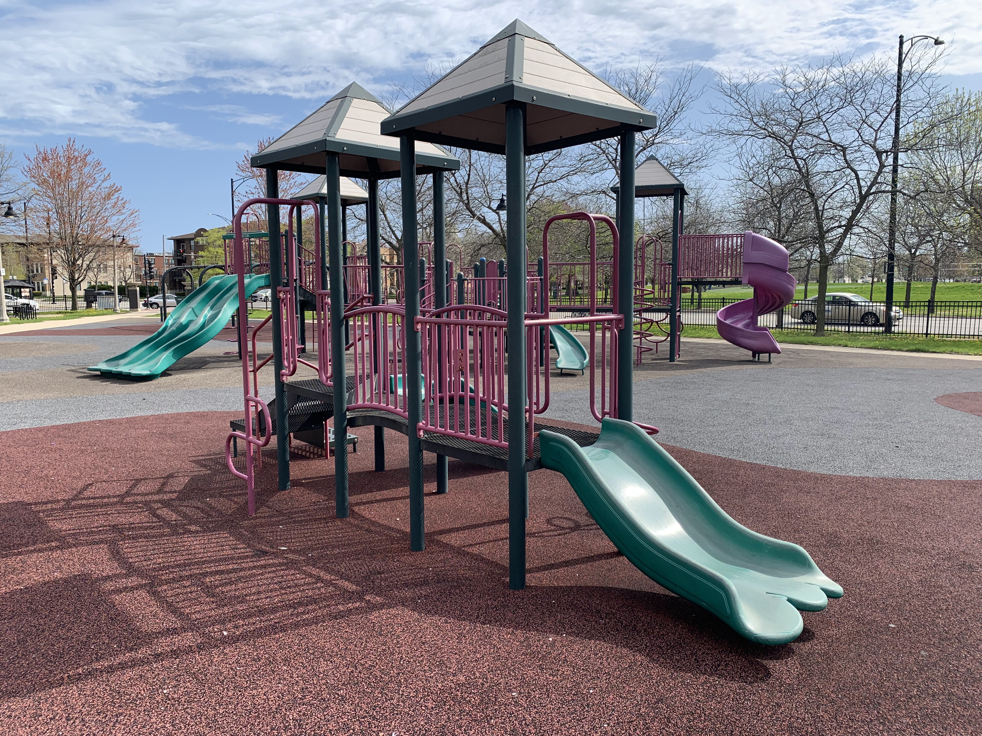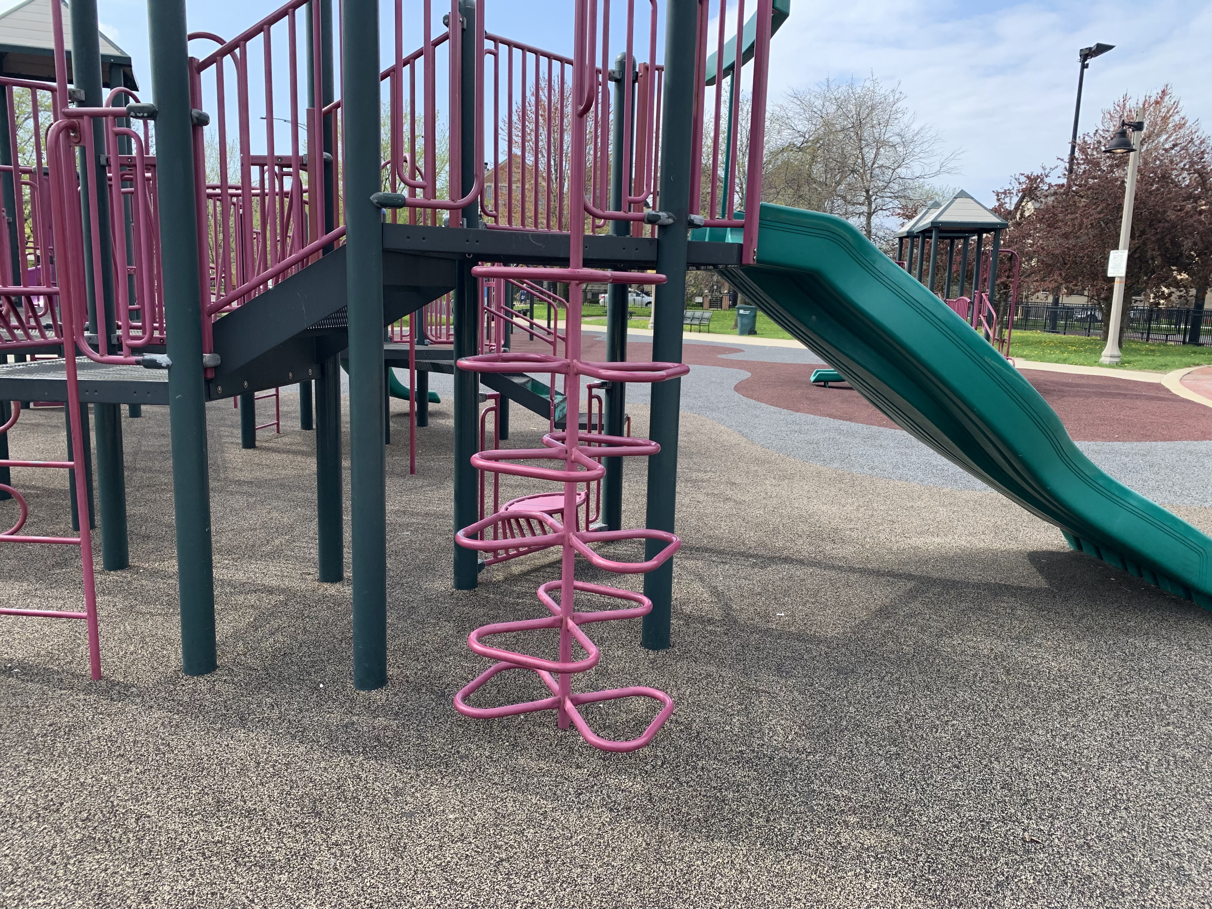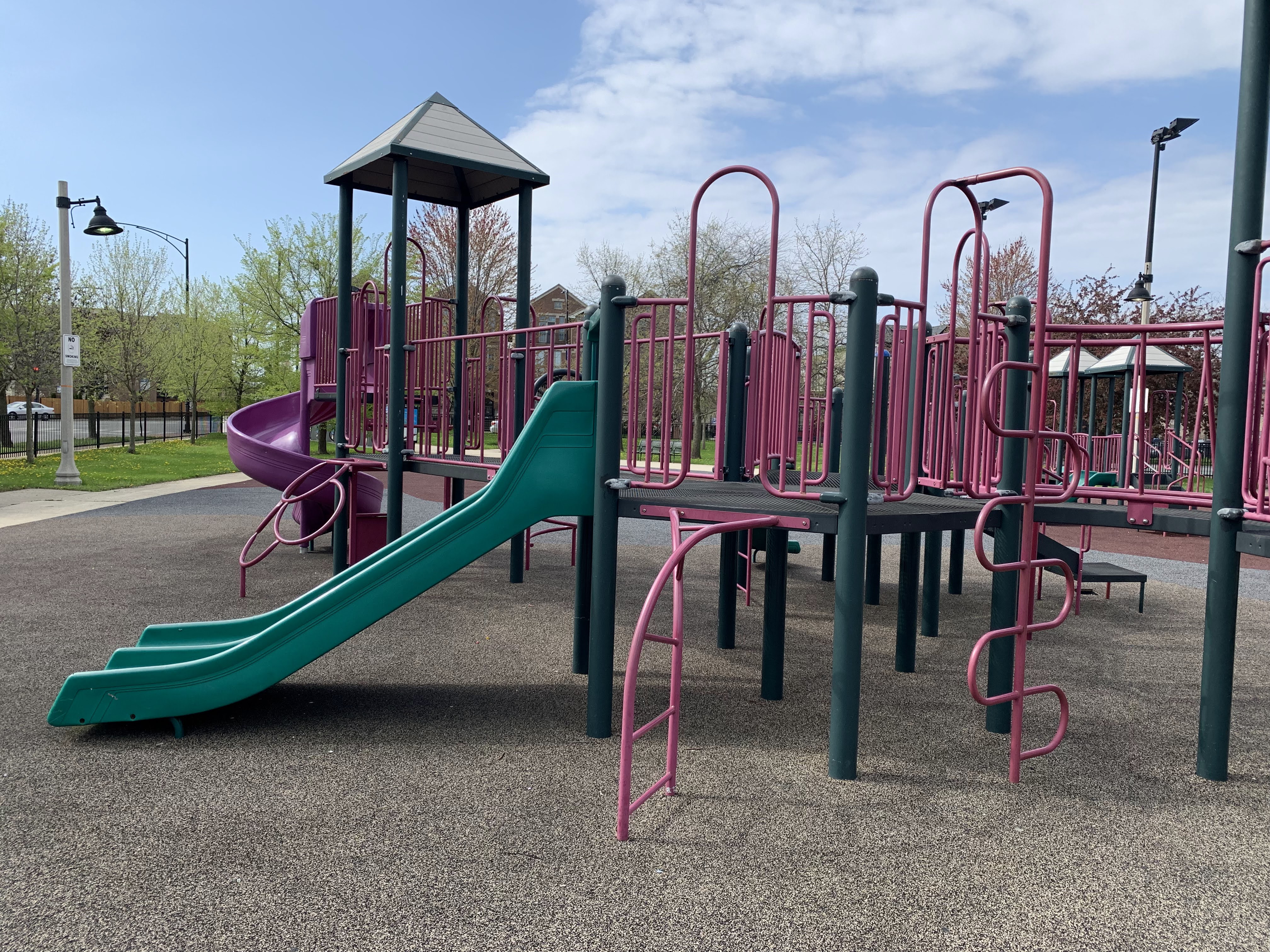 - Mandrake Park was dedicated in 2001 and the playground equipment seems to be original to that era (at the very least, it appears on Google Street View in 2008). There are two play structures - a tiny structure for younger children and a much larger structure for older children. The larger structure contains a triple slide - among others - and some relatively unique climbing elements: an offset corkscrew climber and a ring/bubble climber. There are two sets of swings, one toddler and one standard black belt seat, The play area itself is quite large and has a soft rubber surface. The play area is not fully enclosed but it is fenced from the street and there are a number of benches and even a few picnic tables (with umbrellas!) in the area but the playground itself is bright and sunny. There is also a small fieldhouse nearby with bathrooms and a drinking fountain.