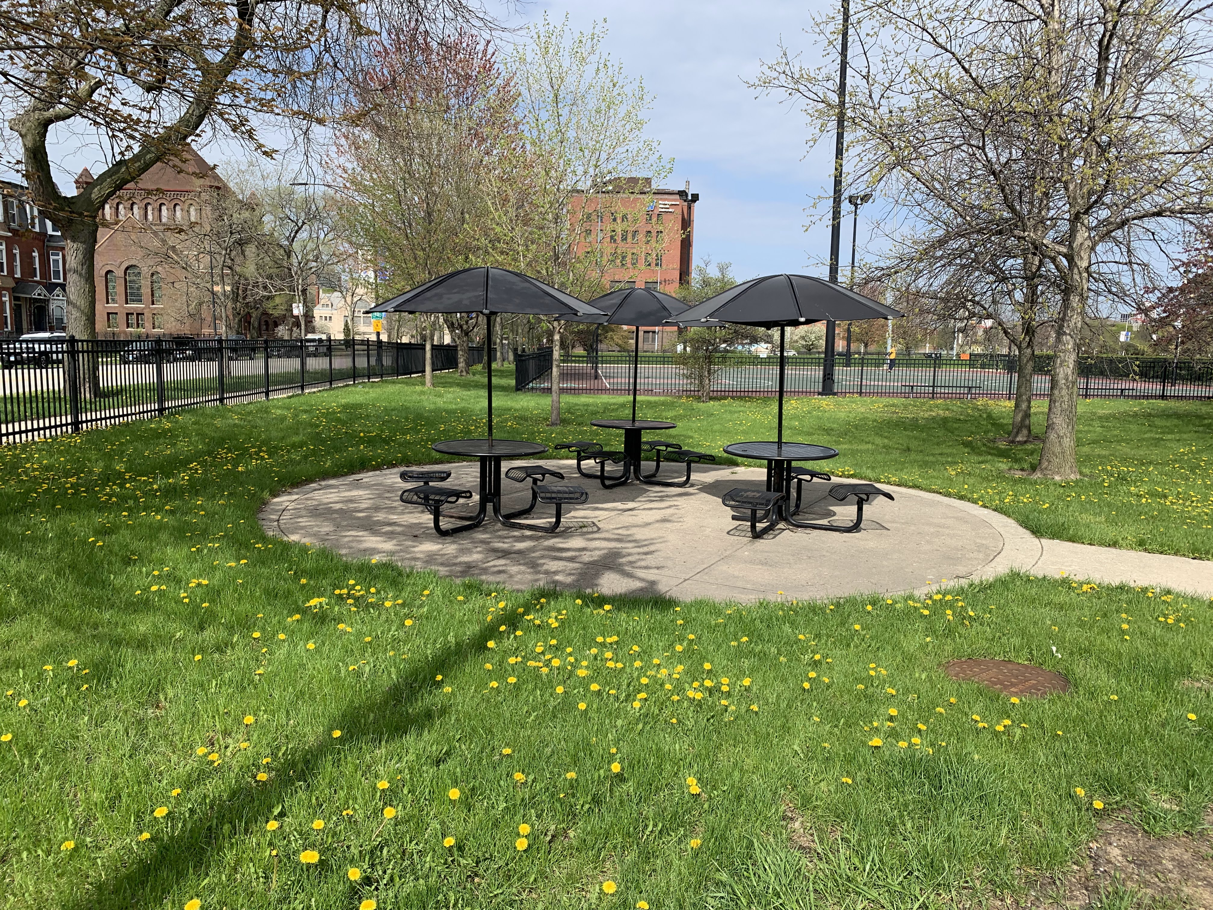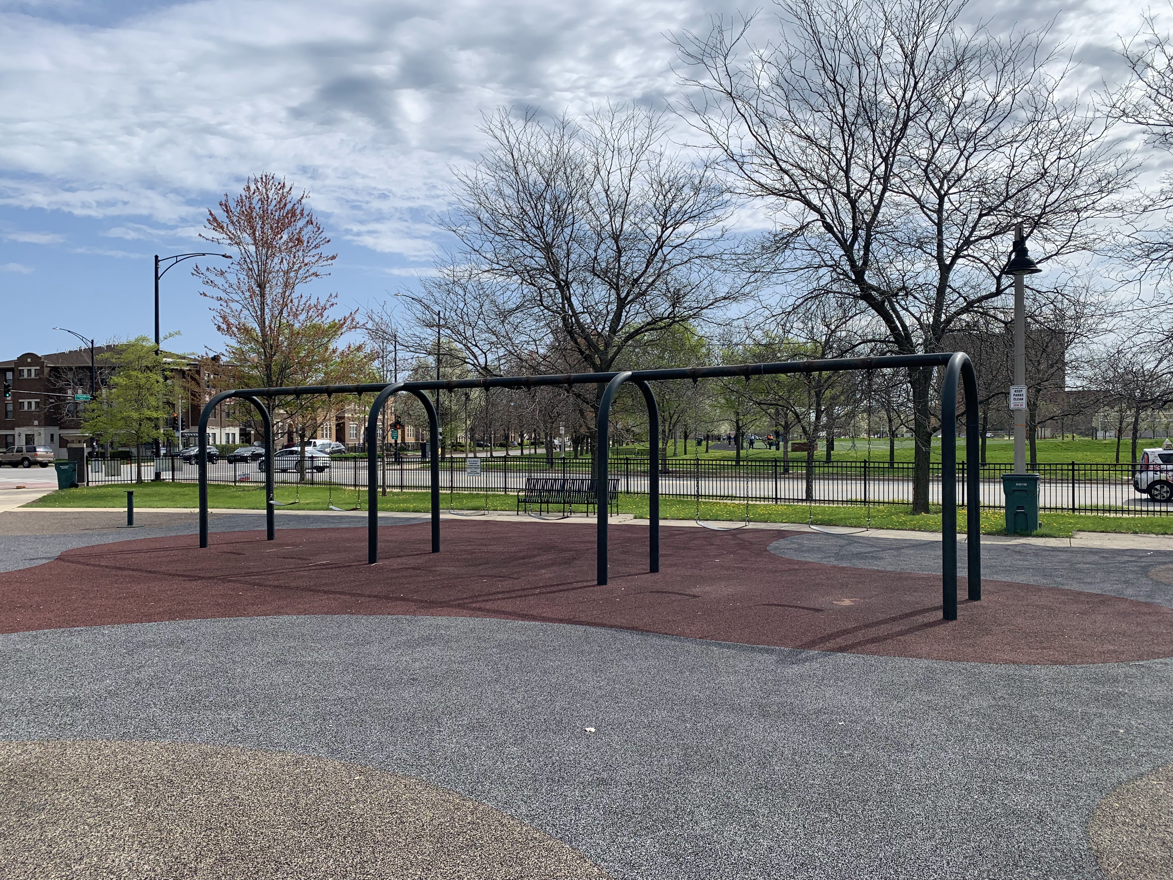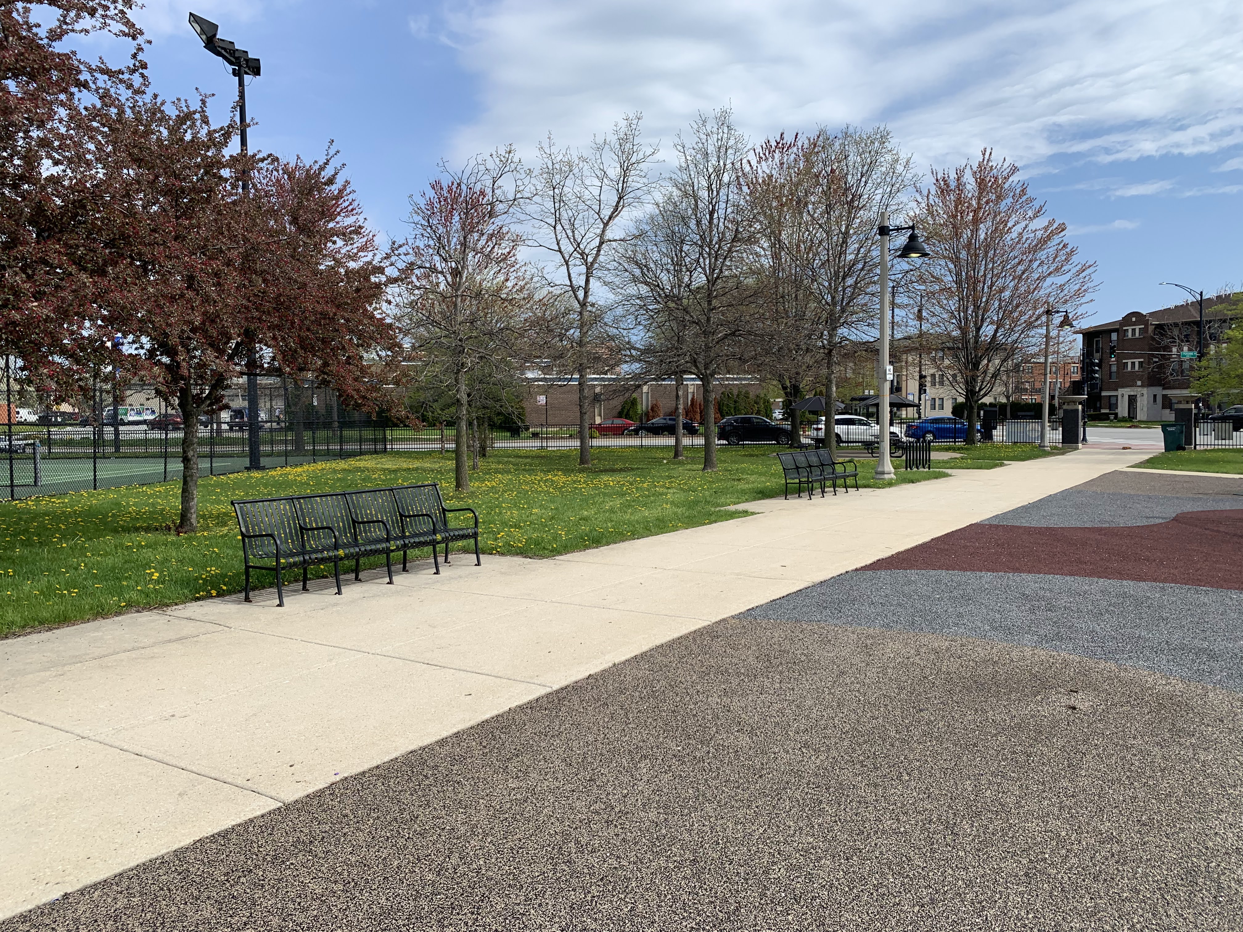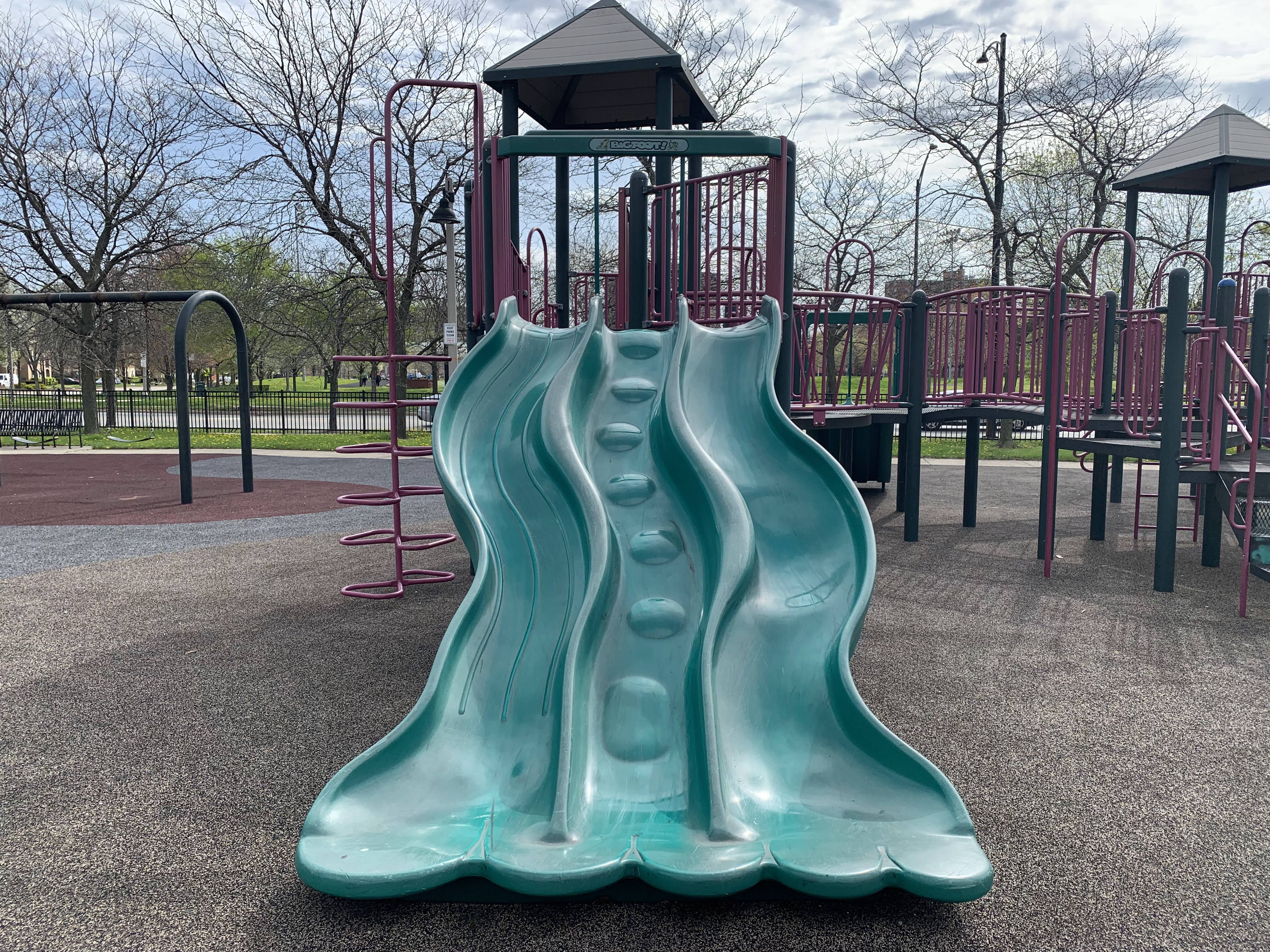 - Mandrake Park was dedicated in 2001 and the playground equipment seems to be original to that era (at the very least, it appears on Google Street View in 2008). There are two play structures - a tiny structure for younger children and a much larger structure for older children. The larger structure contains a triple slide - among others - and some relatively unique climbing elements: an offset corkscrew climber and a ring/bubble climber. There are two sets of swings, one toddler and one standard black belt seat, The play area itself is quite large and has a soft rubber surface. The play area is not fully enclosed but it is fenced from the street and there are a number of benches and even a few picnic tables (with umbrellas!) in the area but the playground itself is bright and sunny. There is also a small fieldhouse nearby with bathrooms and a drinking fountain.