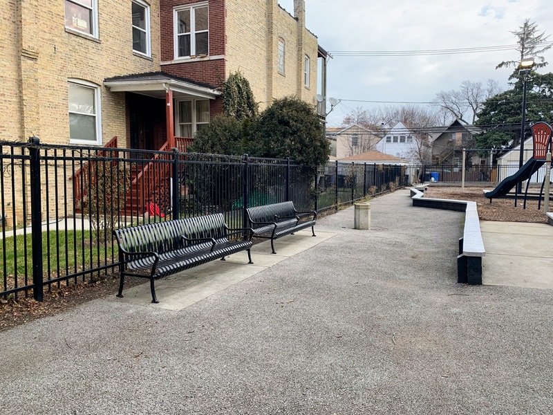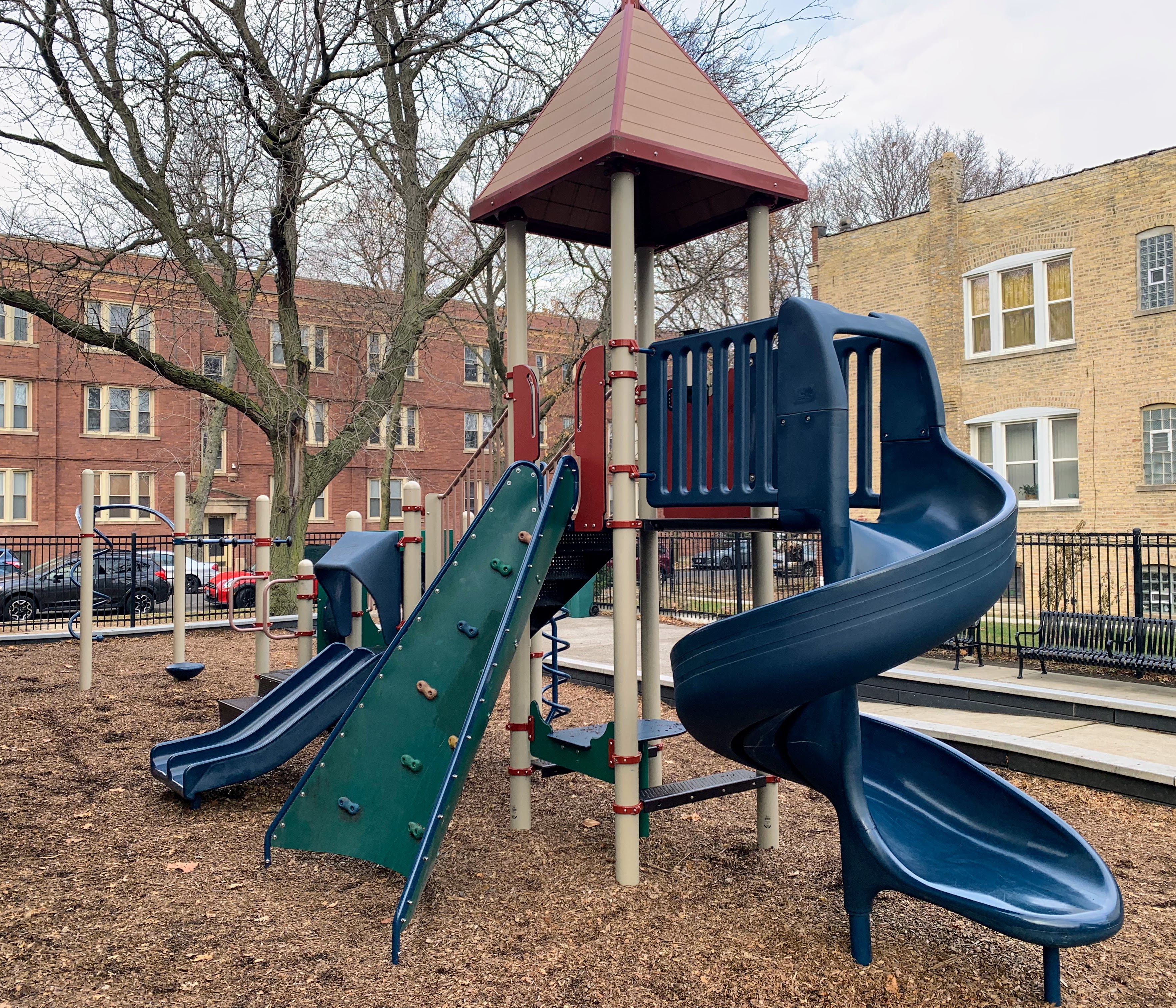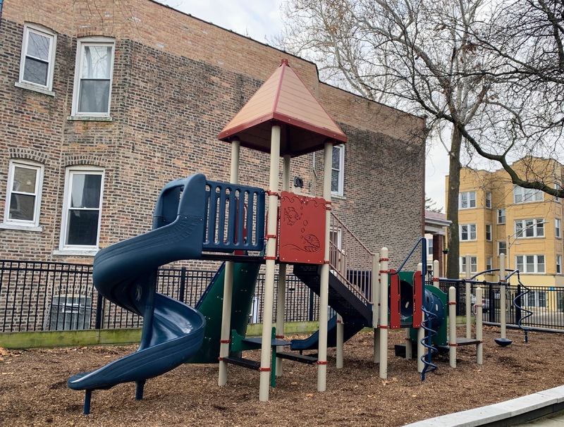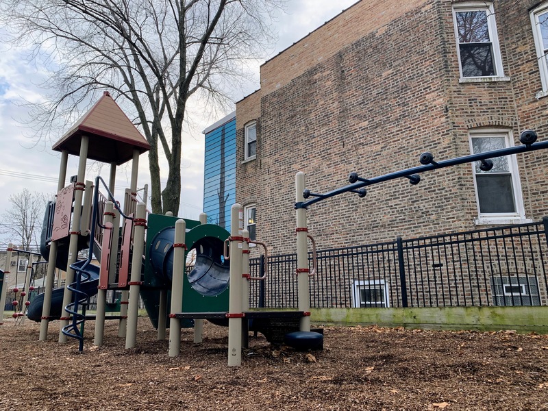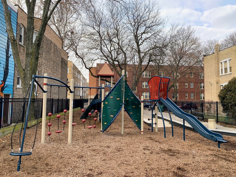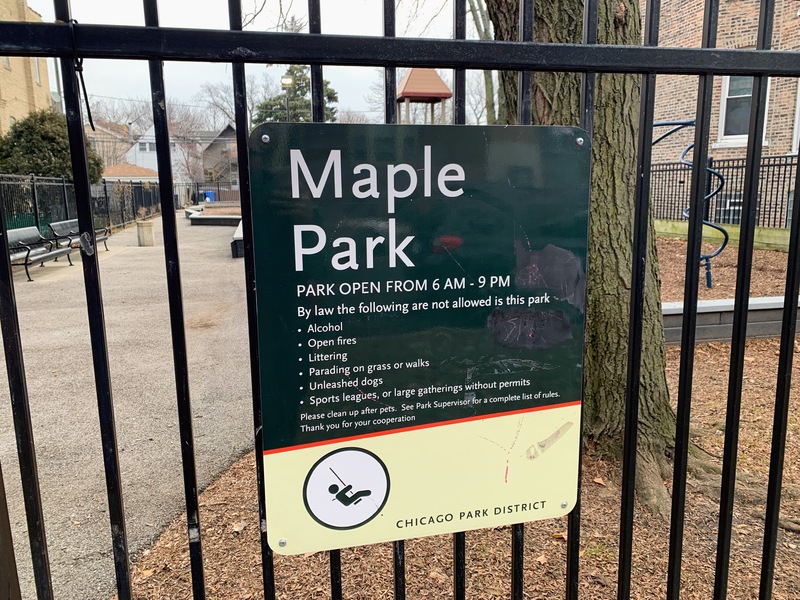 - Maple Park is a small neighborhood pocket park with a large playground. There is a single play structure with the standard elements (slides, climbing elements, and a set of monkey bars) and a swing set near the back of the site with the standard Chicago Park swings (toddler, adaptive, belt seat). The non-play amenities are also standard: a few benches and a drinking fountain bordering a fully enclosed play area with a wood chip surface. I've used the word "standard" three times (well, I guess four times now...) but that's not an insult! This is a great neighborhood playground.