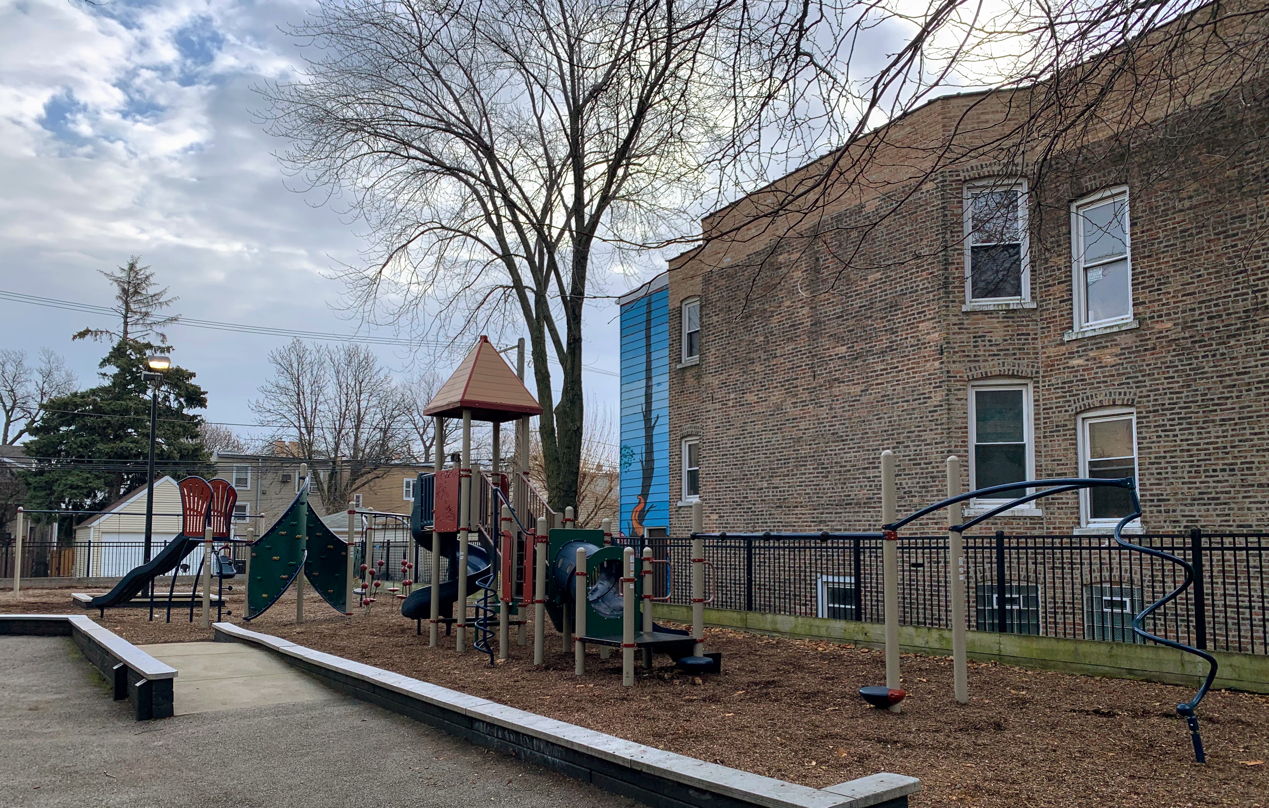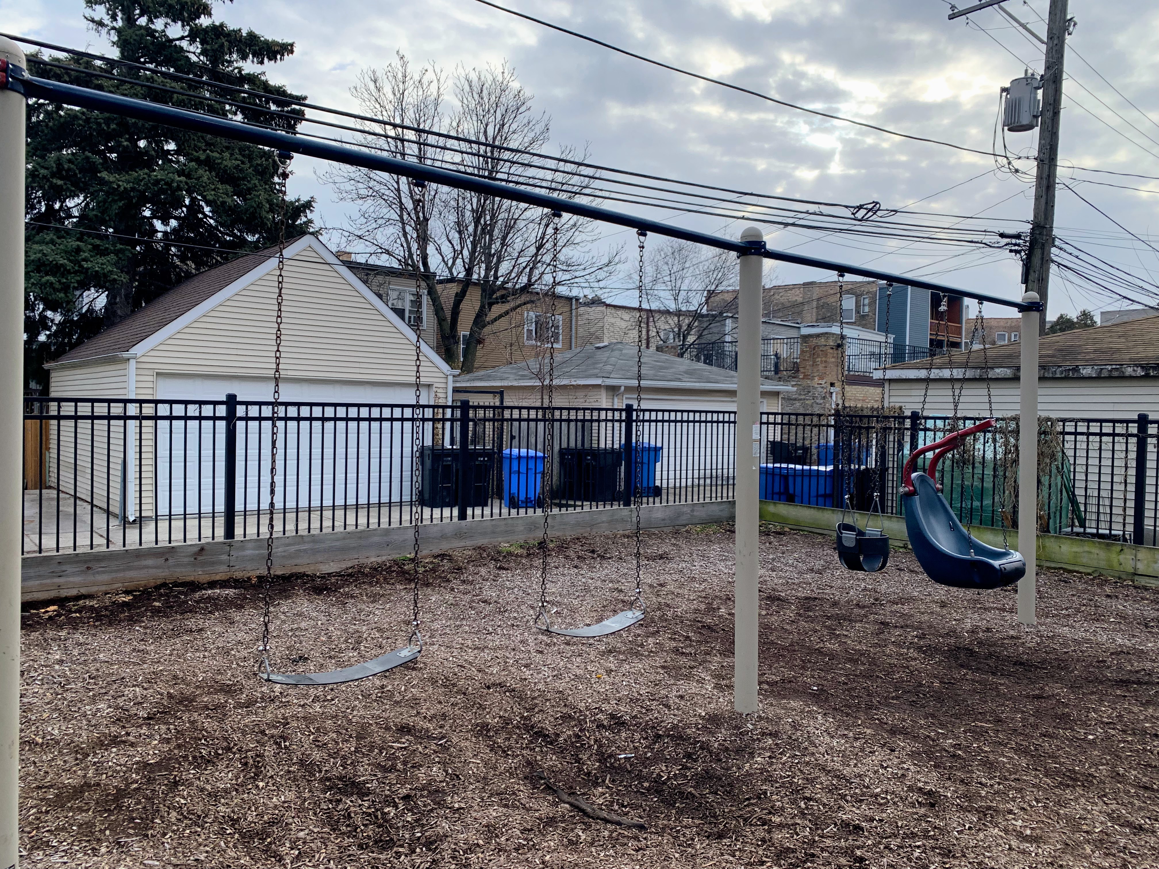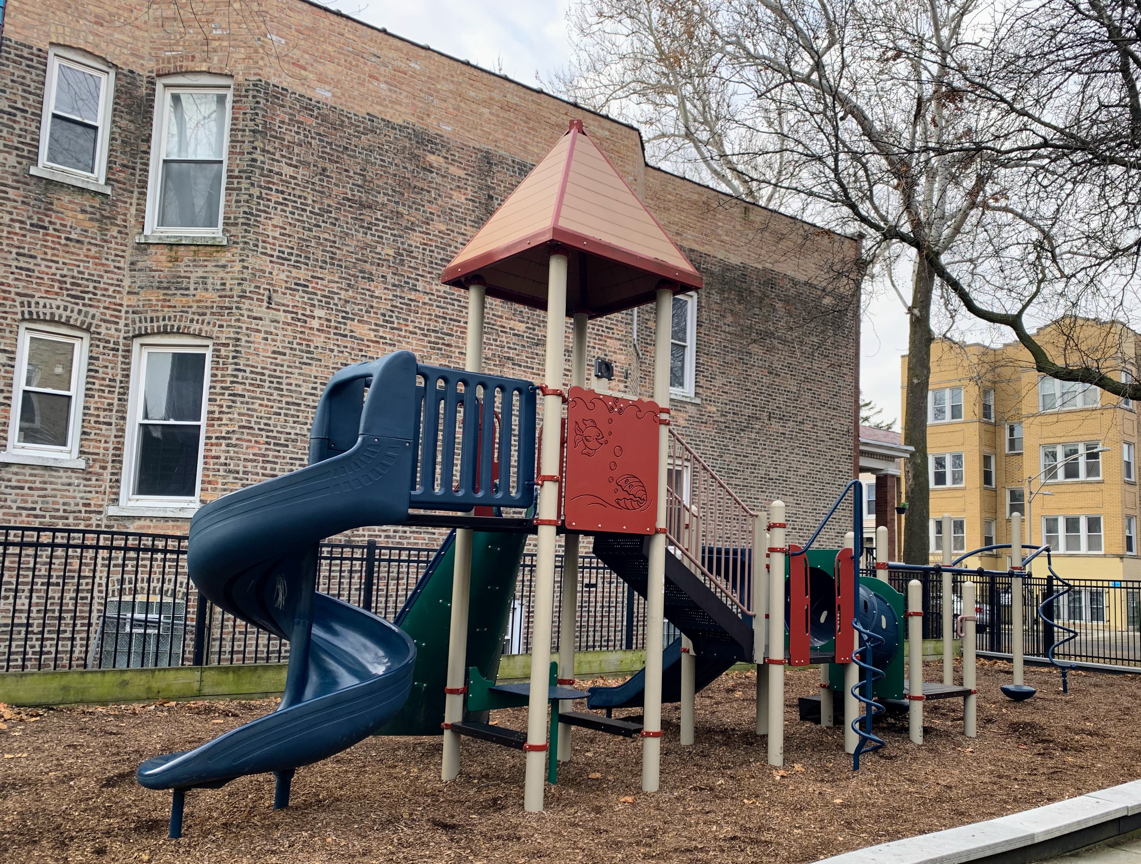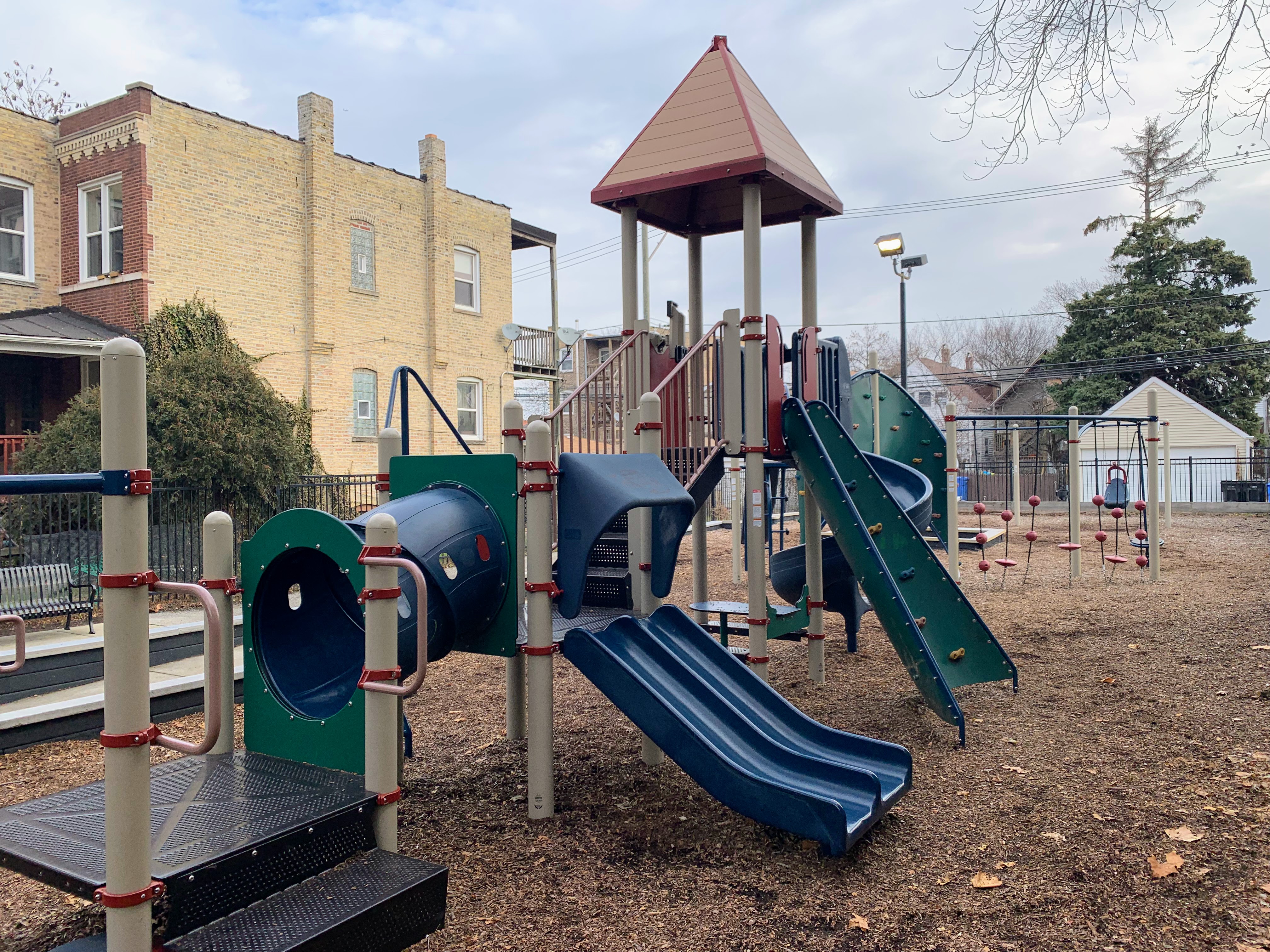 - Maple Park is a small neighborhood pocket park with a large playground. There is a single play structure with the standard elements (slides, climbing elements, and a set of monkey bars) and a swing set near the back of the site with the standard Chicago Park swings (toddler, adaptive, belt seat). The non-play amenities are also standard: a few benches and a drinking fountain bordering a fully enclosed play area with a wood chip surface. I've used the word "standard" three times (well, I guess four times now...) but that's not an insult! This is a great neighborhood playground.