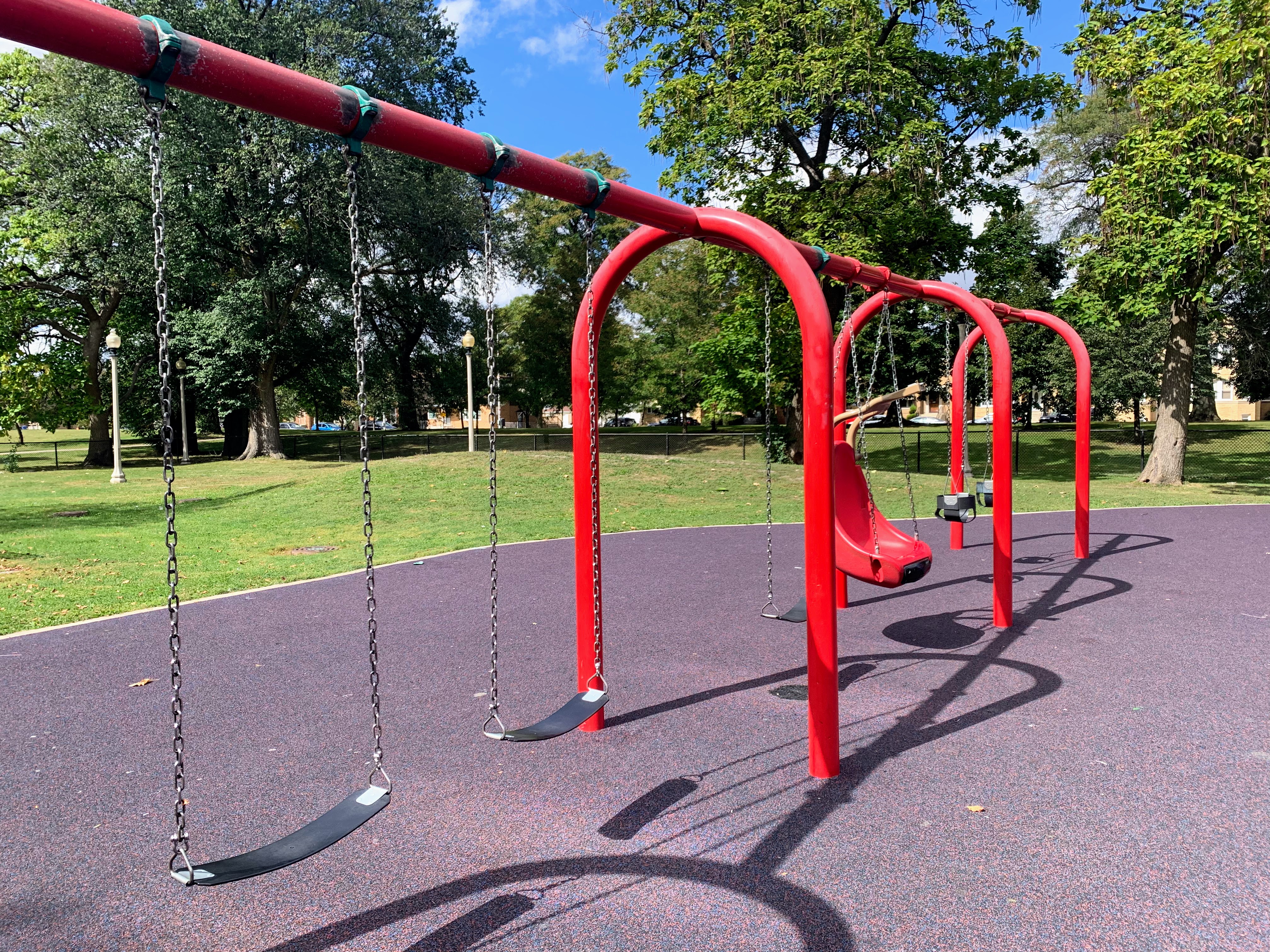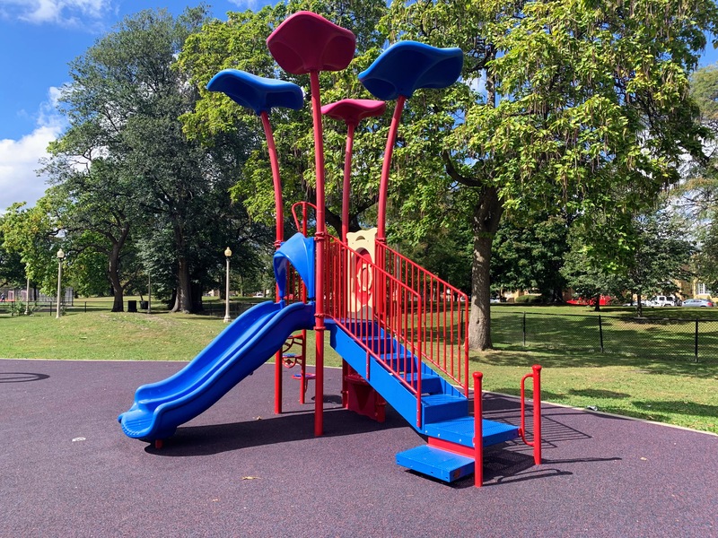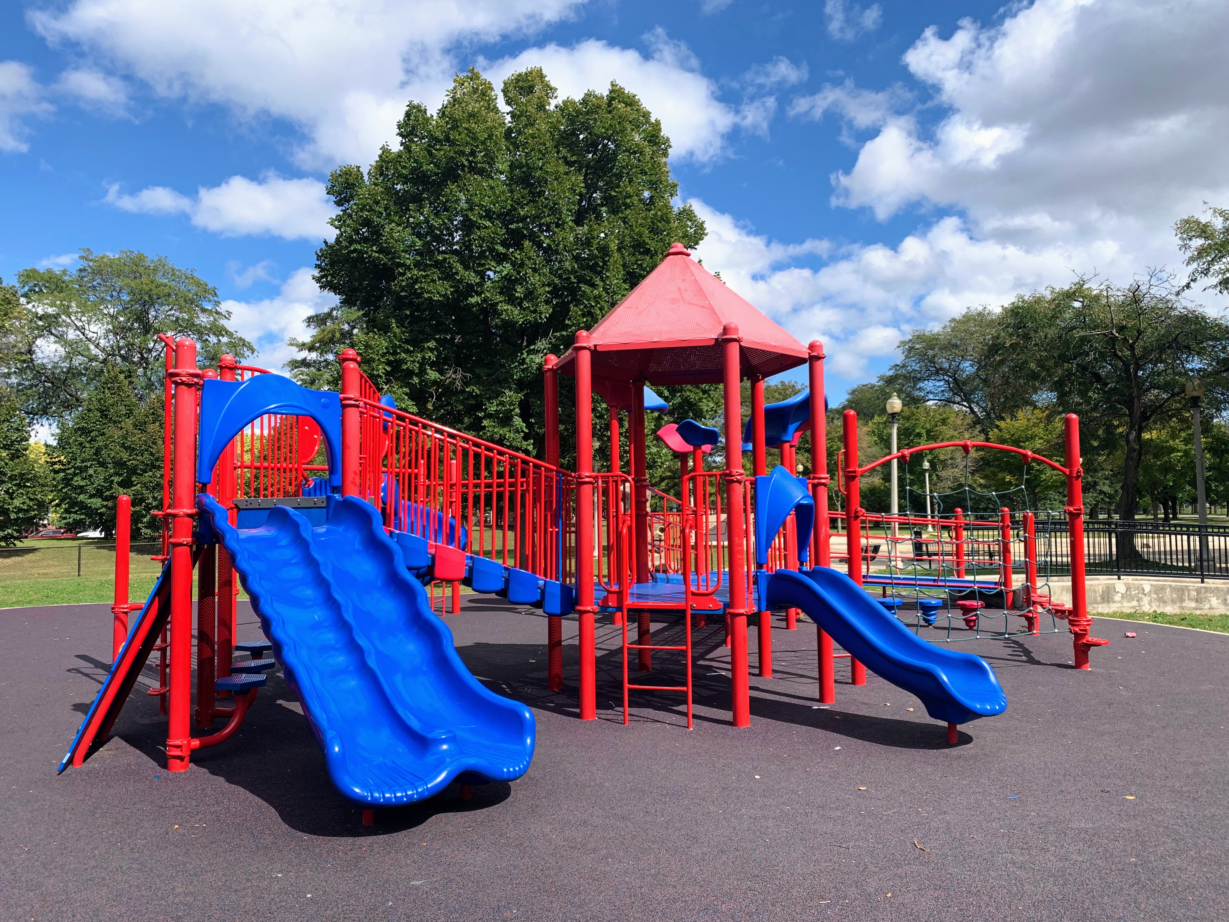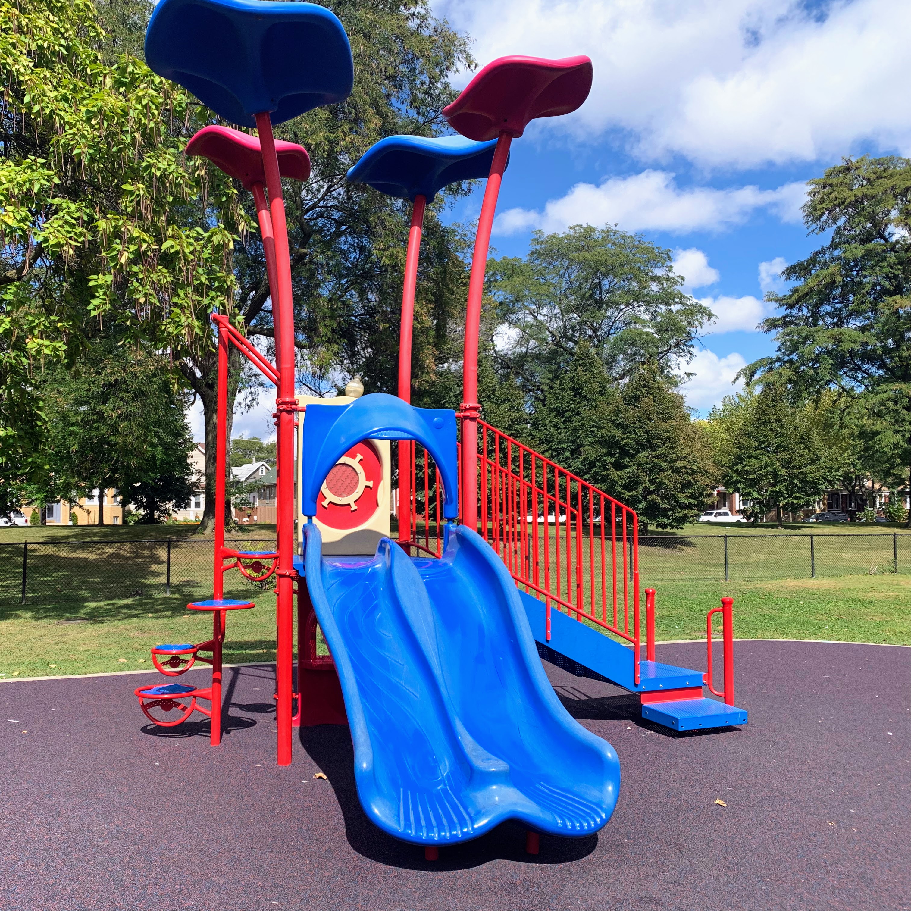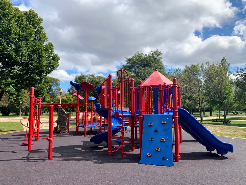 The non-play elements are decent as well. There is a drinking fountain and a few benches scattered near the playground. The play surface is soft rubber and the playground opens to the rest of the park while still being fenced from the street to the north. All although the playground itself lacks shade most of the day, there are lots of large trees nearby for the classic park setting and a shady spot to rest. All in all, a solid playground. - Playground Equipment