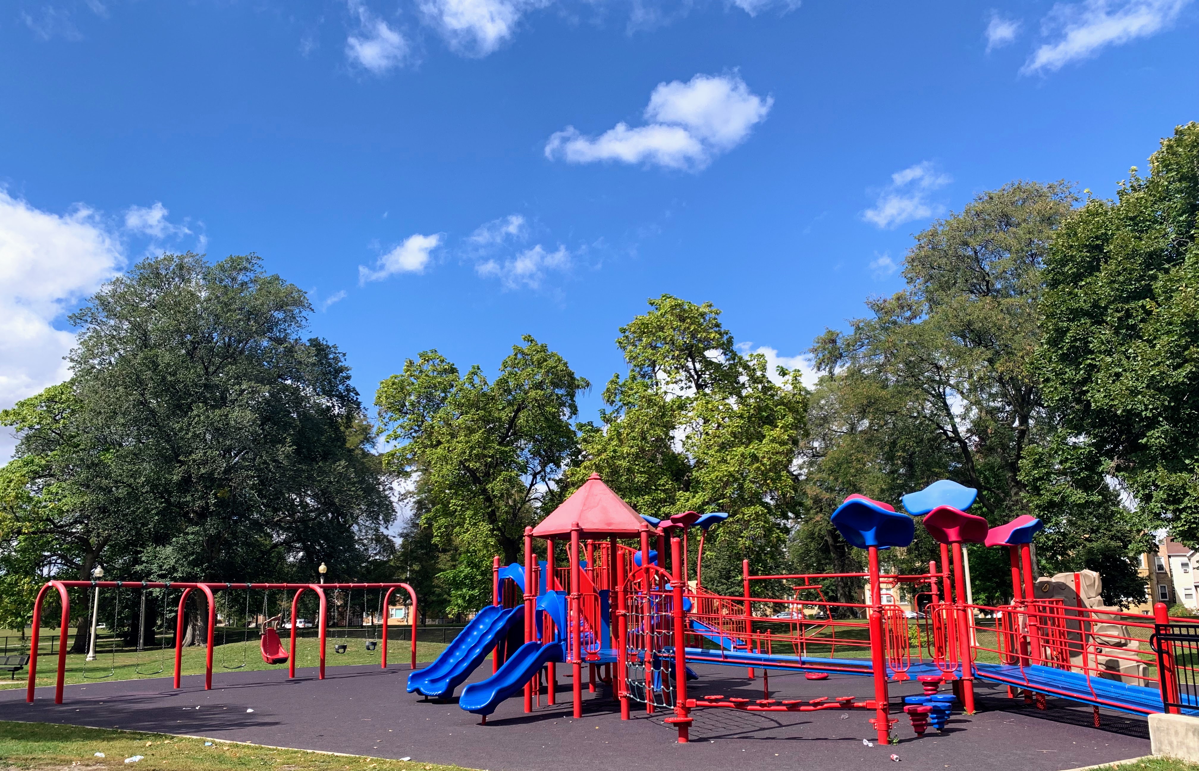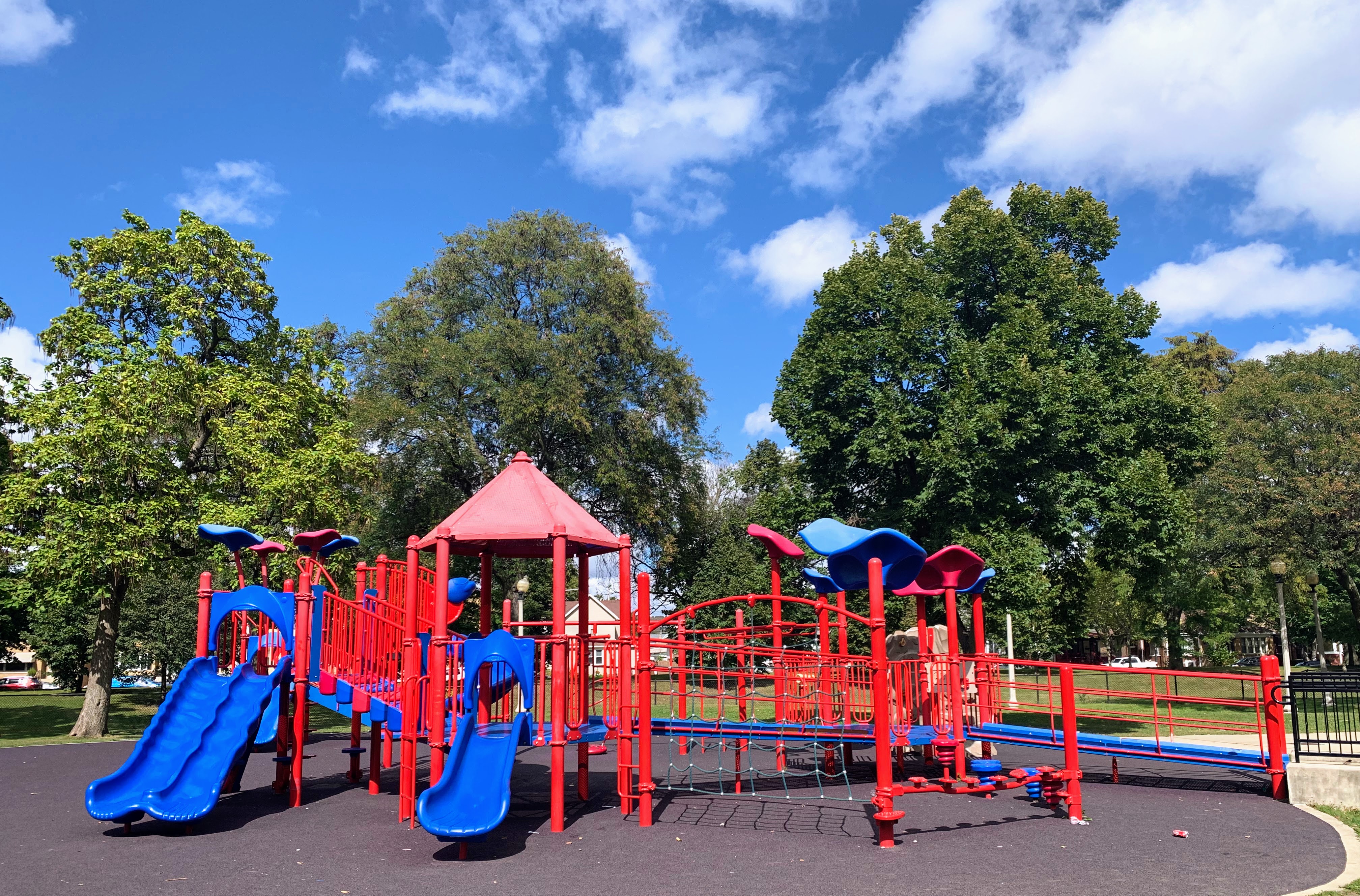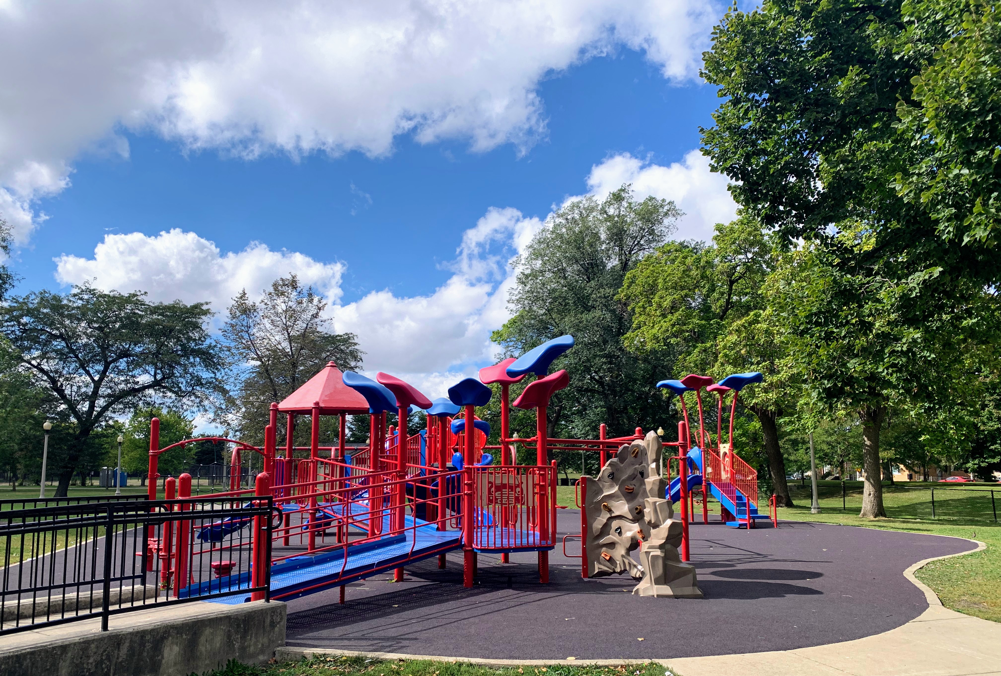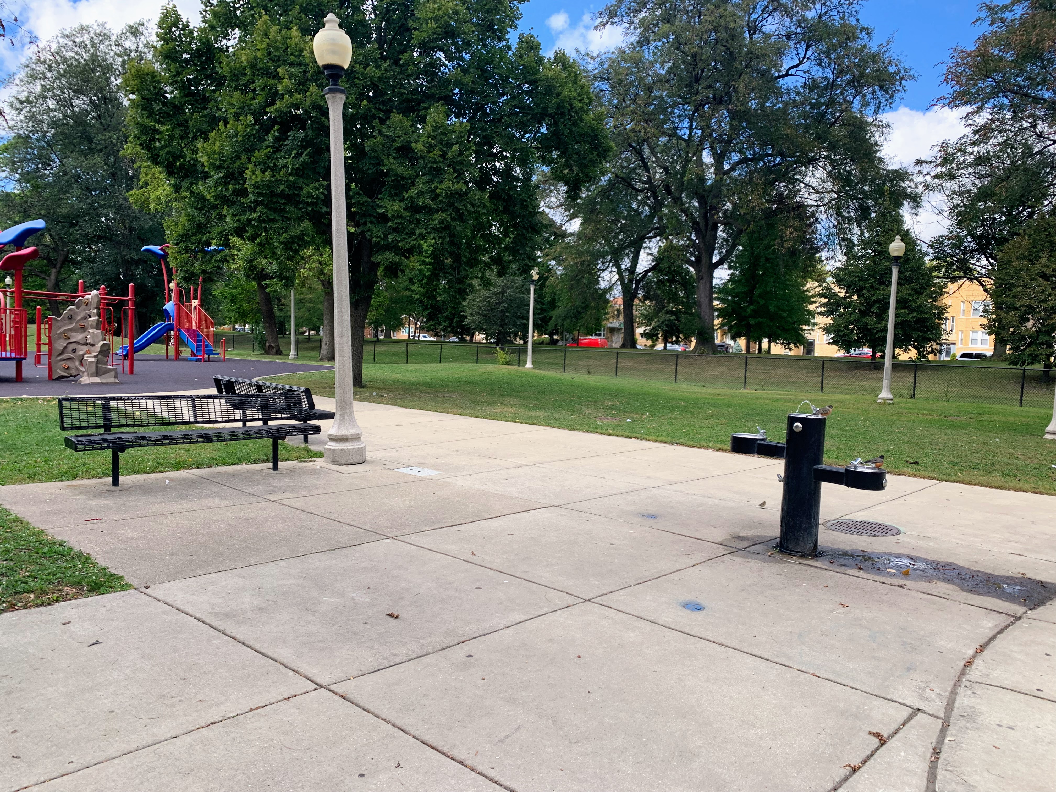 The non-play elements are decent as well. There is a drinking fountain and a few benches scattered near the playground. The play surface is soft rubber and the playground opens to the rest of the park while still being fenced from the street to the north. All although the playground itself lacks shade most of the day, there are lots of large trees nearby for the classic park setting and a shady spot to rest. All in all, a solid playground. - Playground Equipment