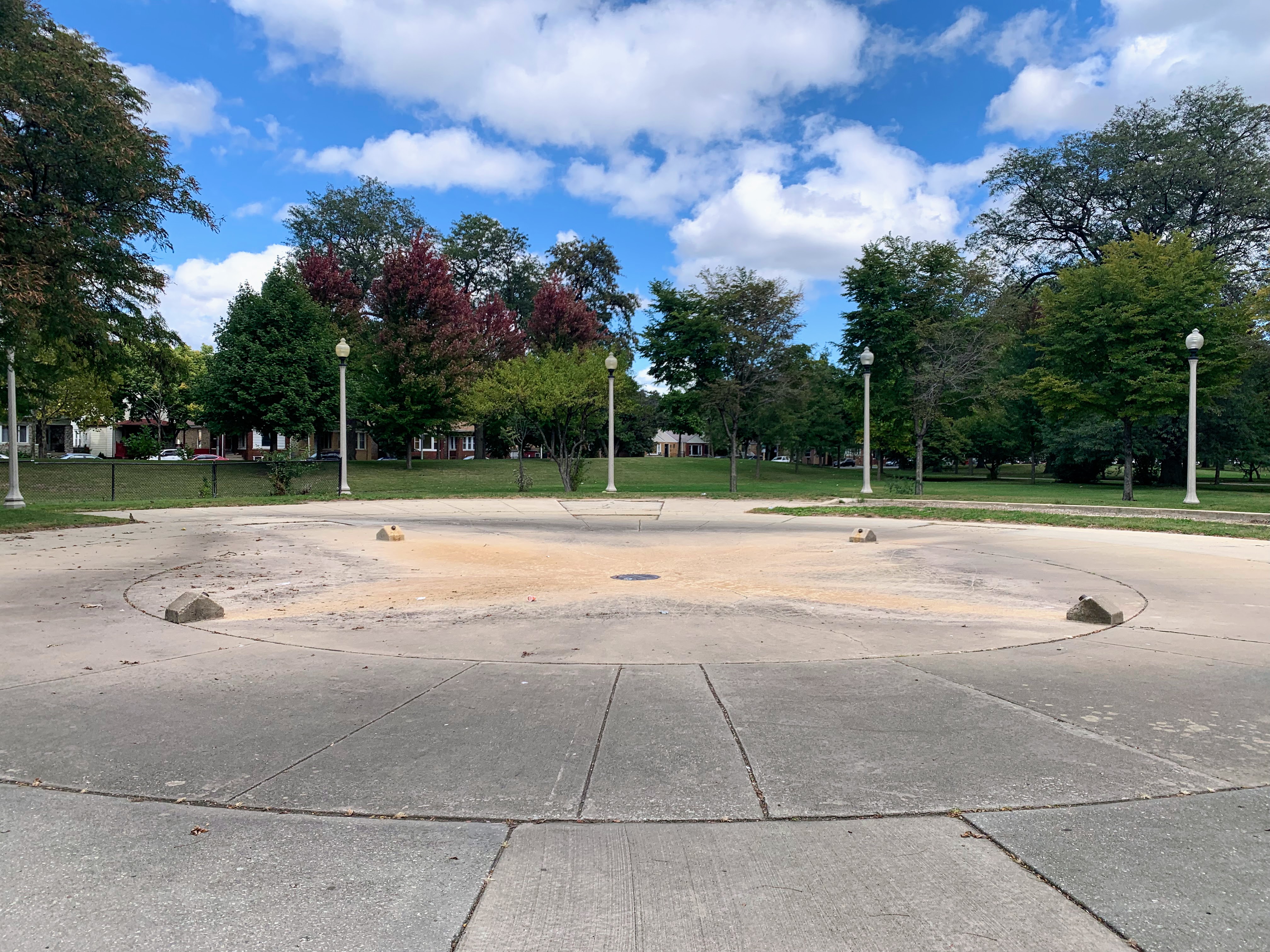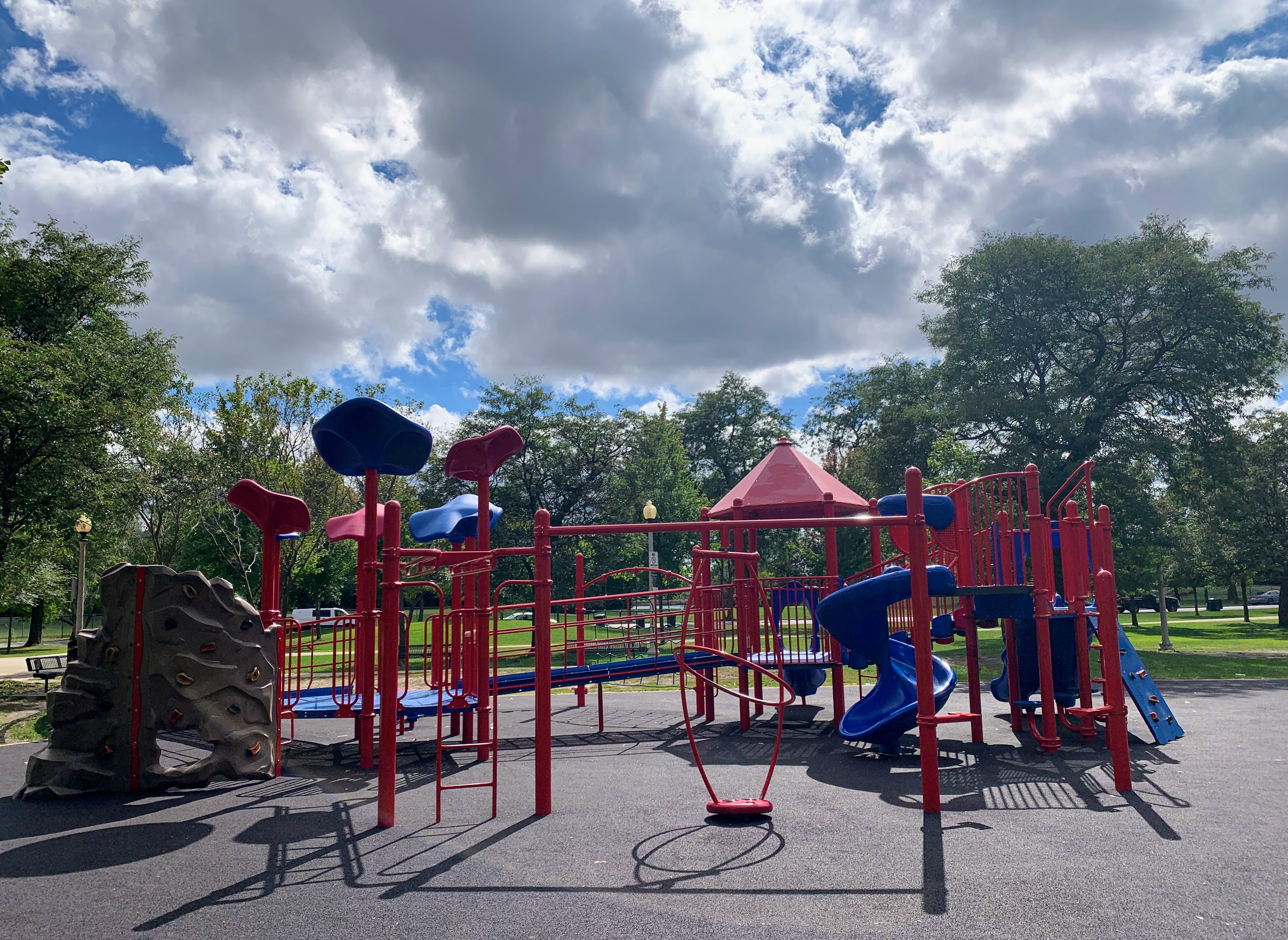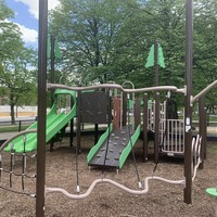 This playground - one of two in Marquette Park - is located near the northwest corner of the park and features two play structures and a water spray feature. The smaller structure, designed for younger children, is quite small with just a slide and a climbing element. Relatively speaking, the structure for older children is much larger and includes a larger variety of elements. A set of swings with the Chicago Park standards - toddler, adaptive with harness, and belt seat - round out the equipment. The water spray feature is a standard 'four sprayer.'