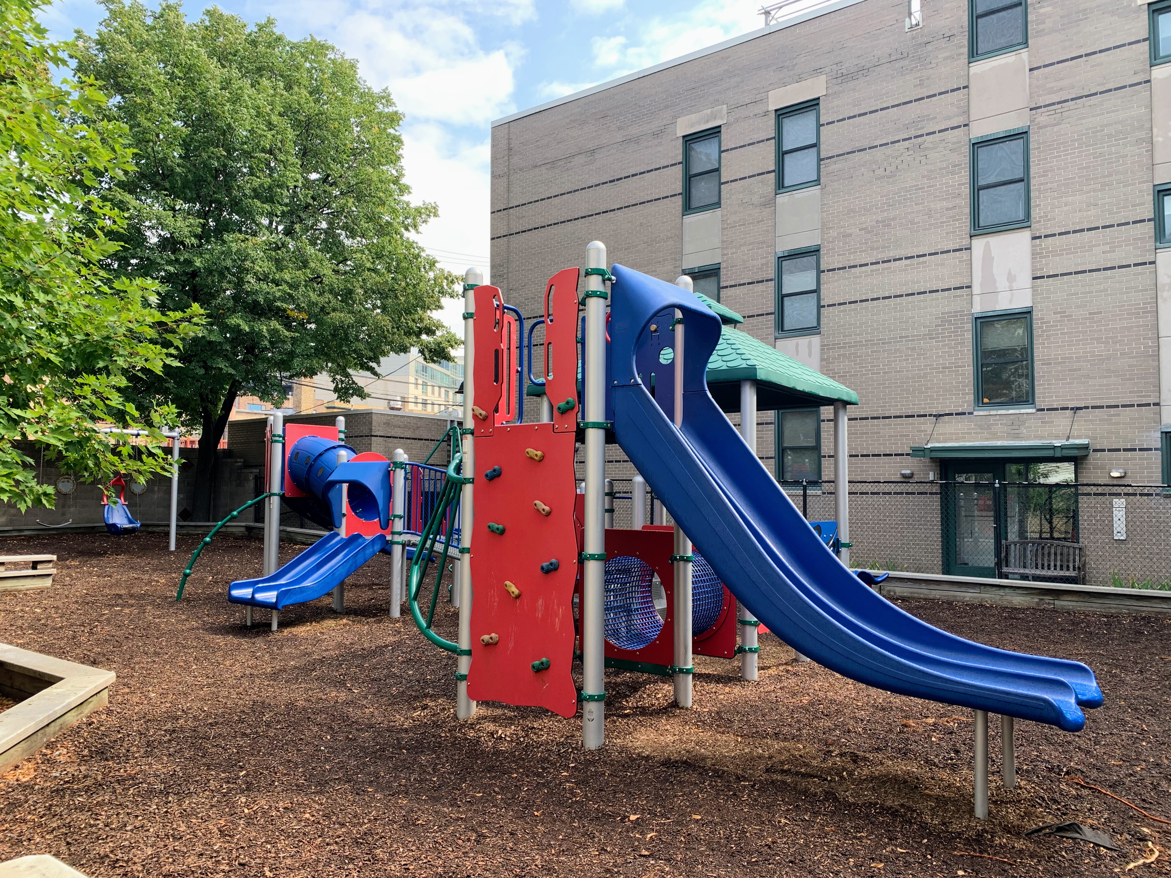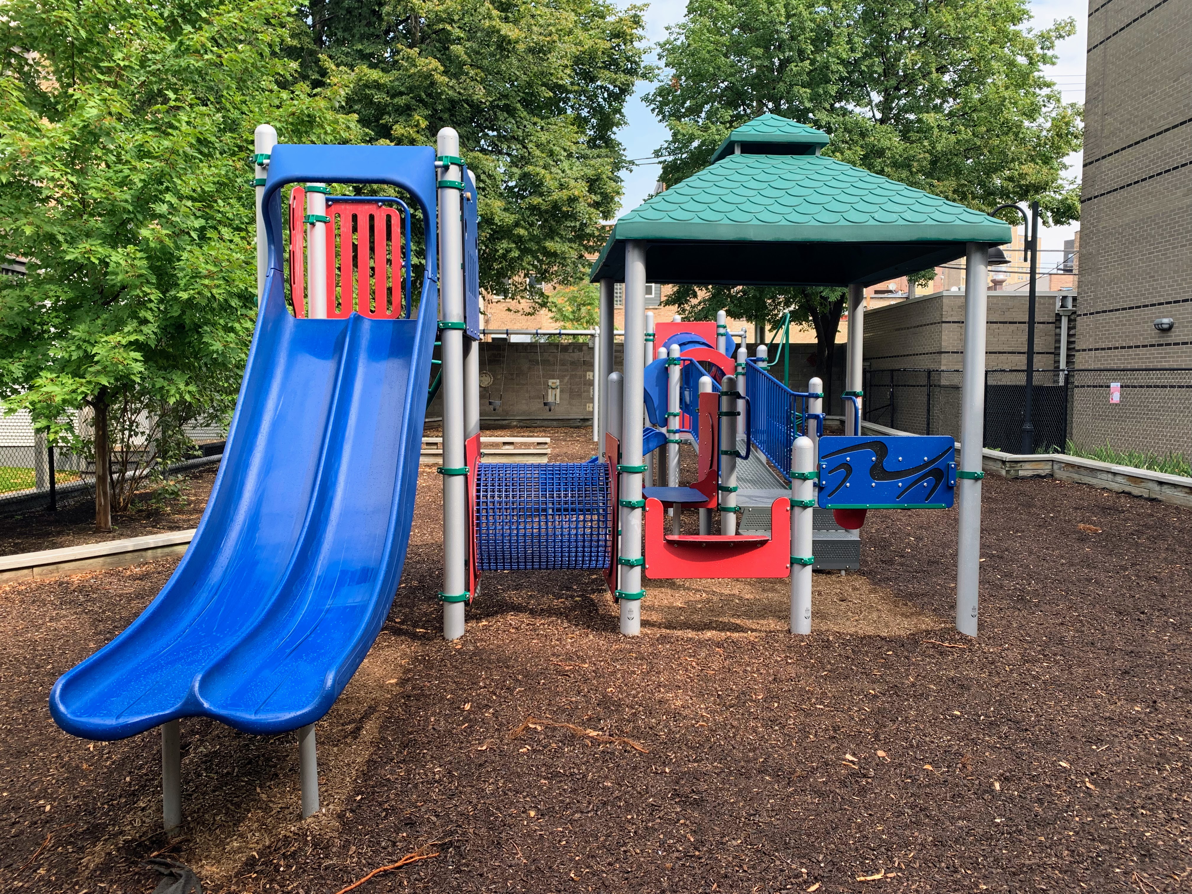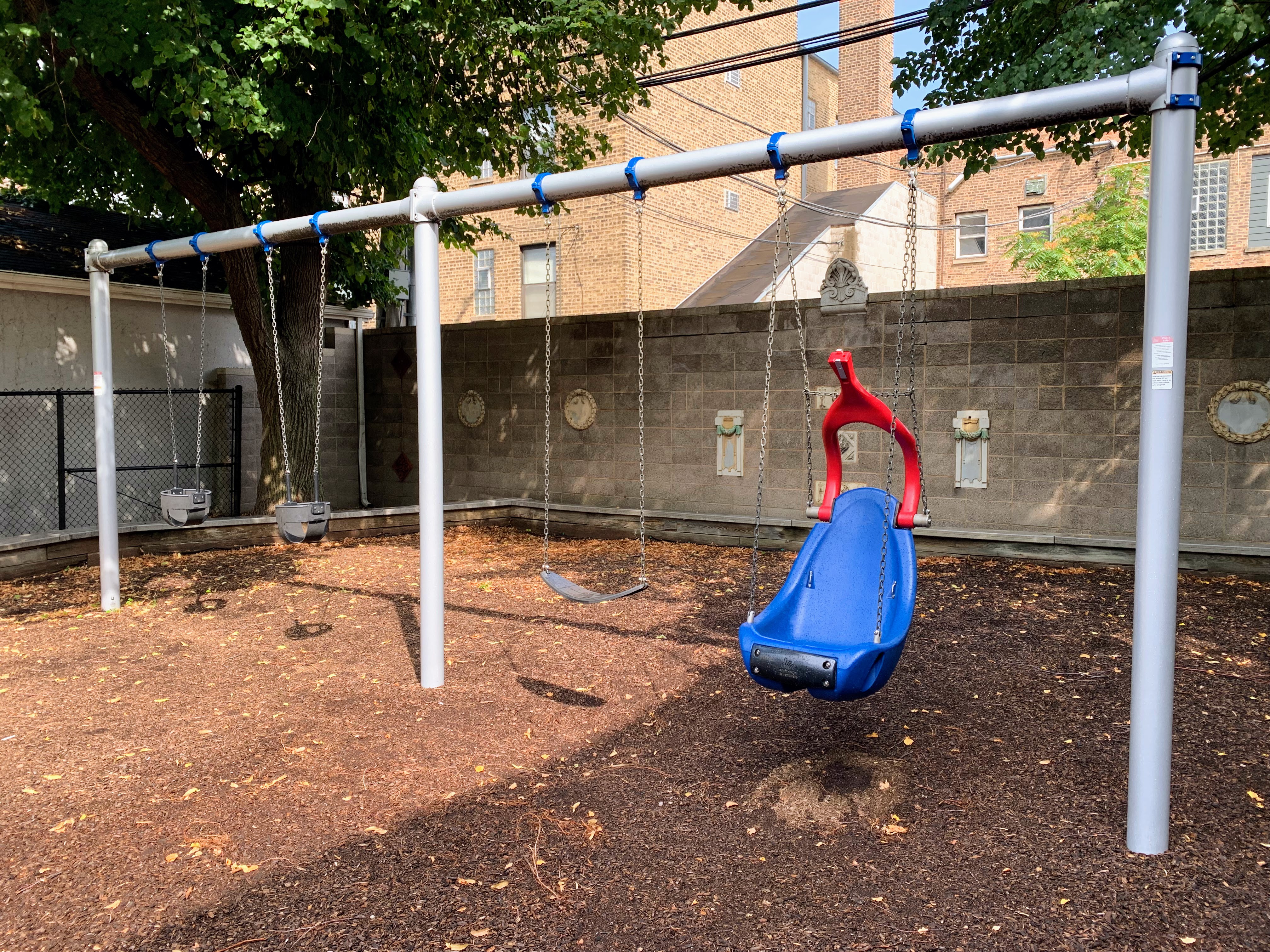 - Martin Park contains a solid neighborhood playground. There is the standard set of swings (toddler, adaptive with harness, and belt seat) and a play structure with a few slides and climbing elements. The play area is fully enclosed and the play surface is wood chips. There is a bench and low perimeter walls provide additional informal seating. All in all, this is a solid neighborhood playground for younger children.