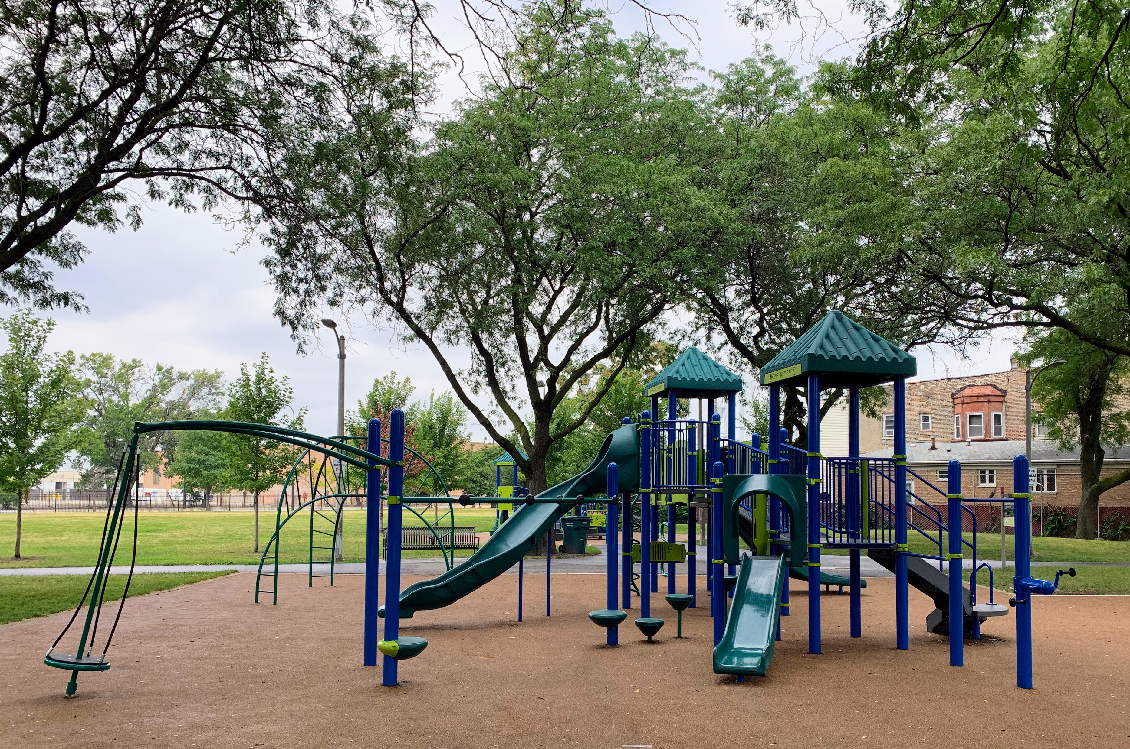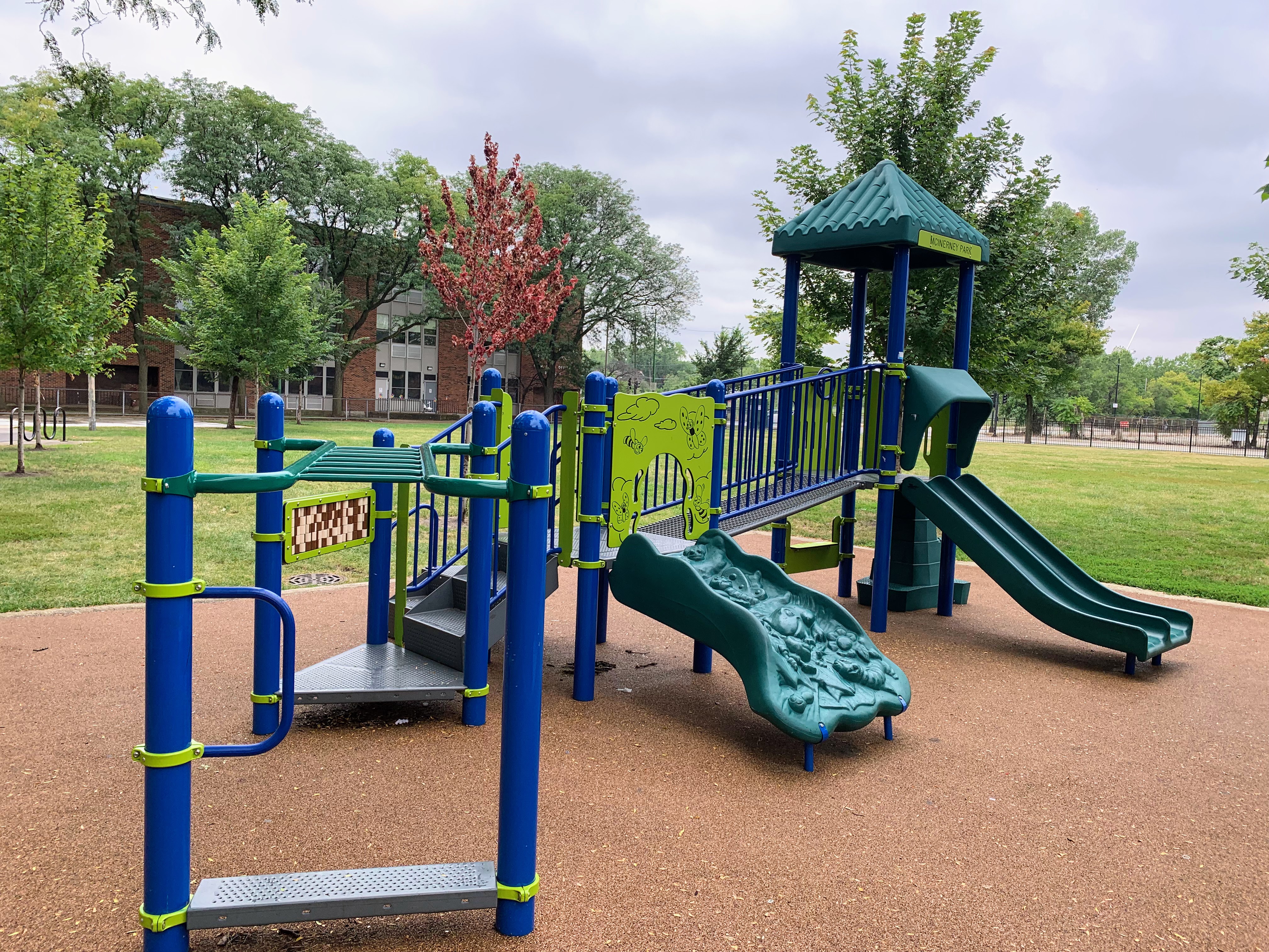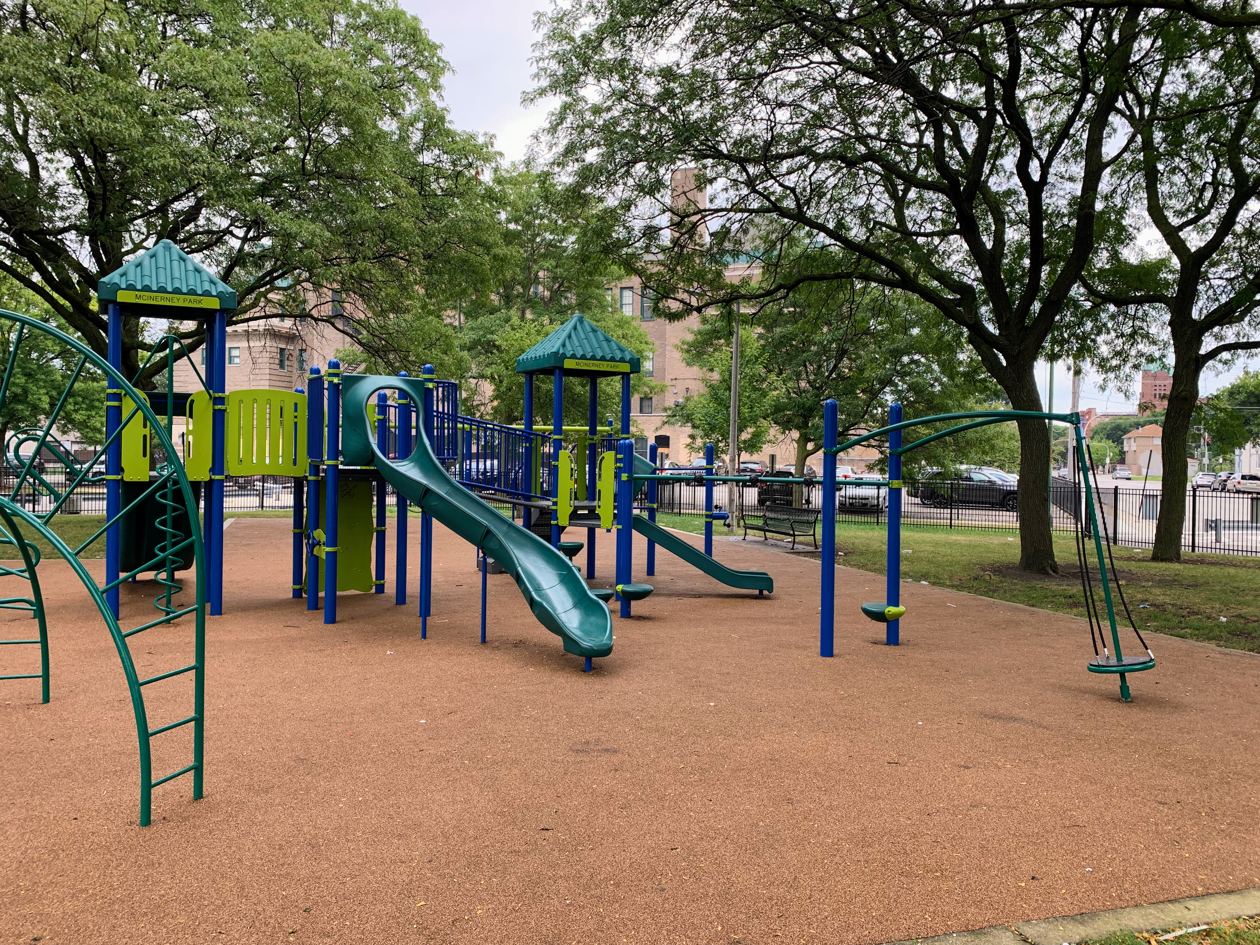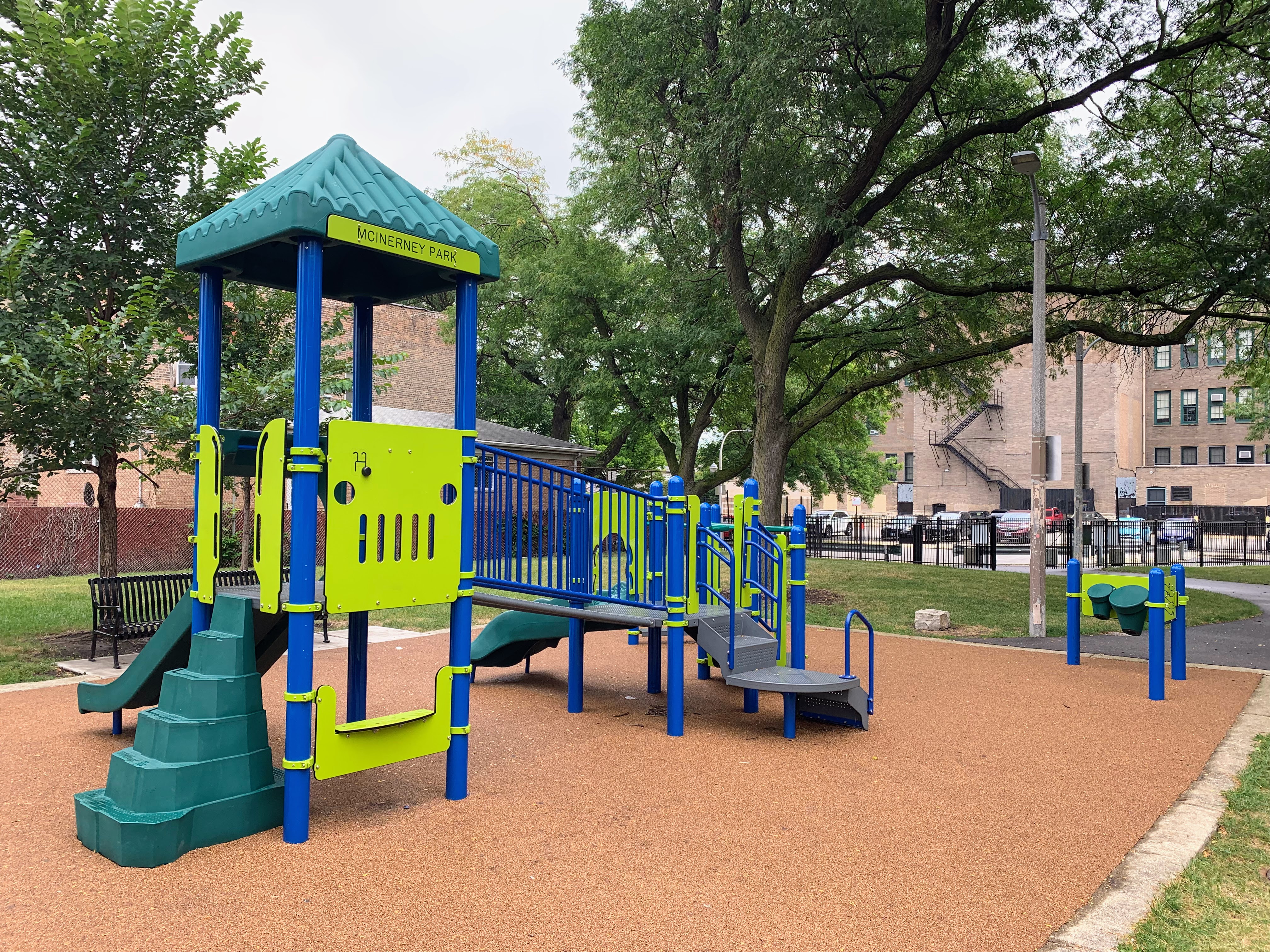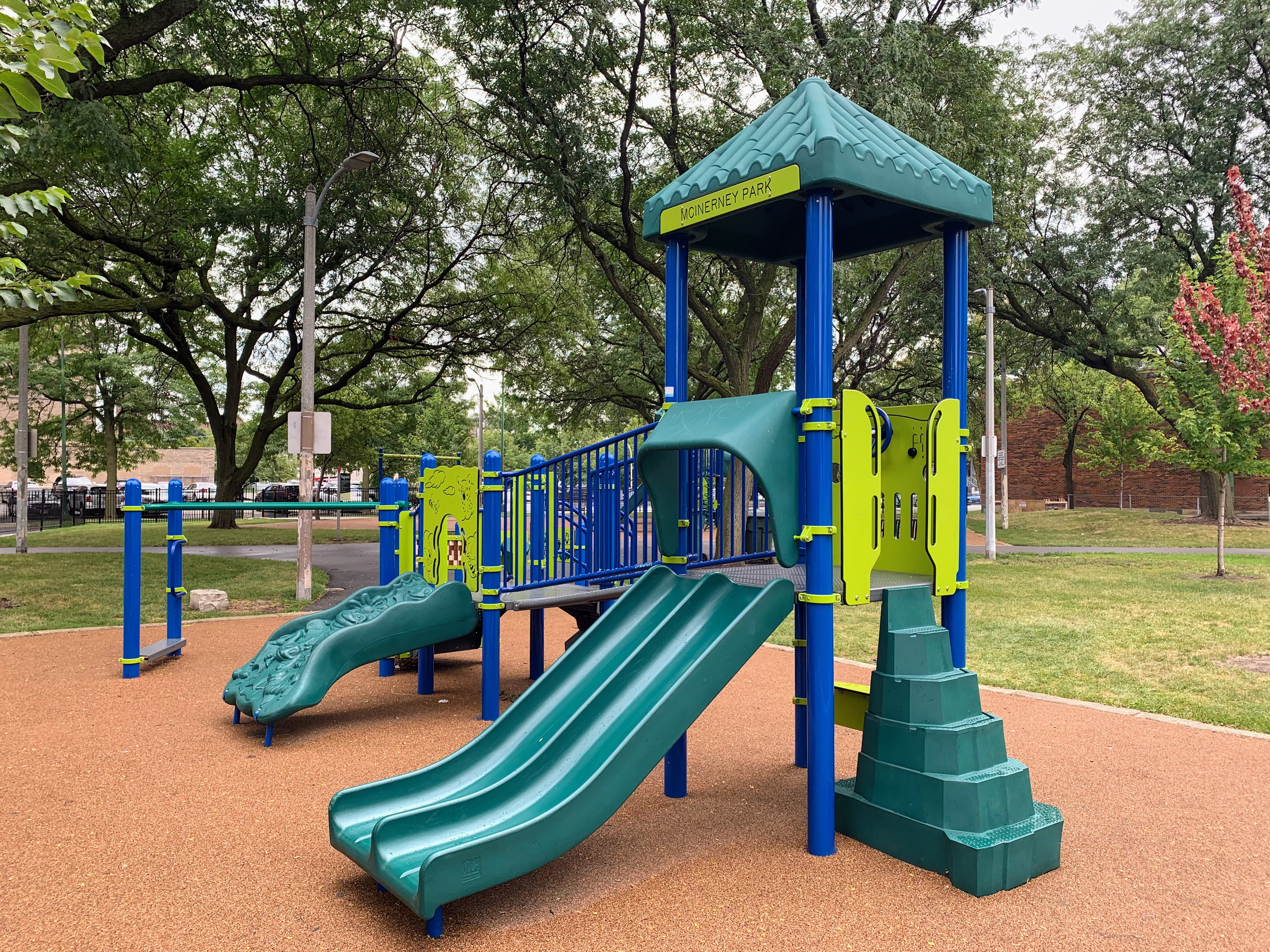 - McInerney Park features a nice playground shaded by large, mature trees. There are two separate areas - one with a smaller structure for younger children and the other with a larger structure for older children - and a small set of swings. Both structures are relatively large and offer a variety of options for park-goers. The play area is fenced from the street but not fully enclosed and opens directly into the rest of McInerney Park. The play surface is soft rubber and there are benches and trees for seating and shade. There is nothing particularly noteworthy or novel about this playground; it's just a solid neighborhood playground in the best sense of the term. Highly recommend.