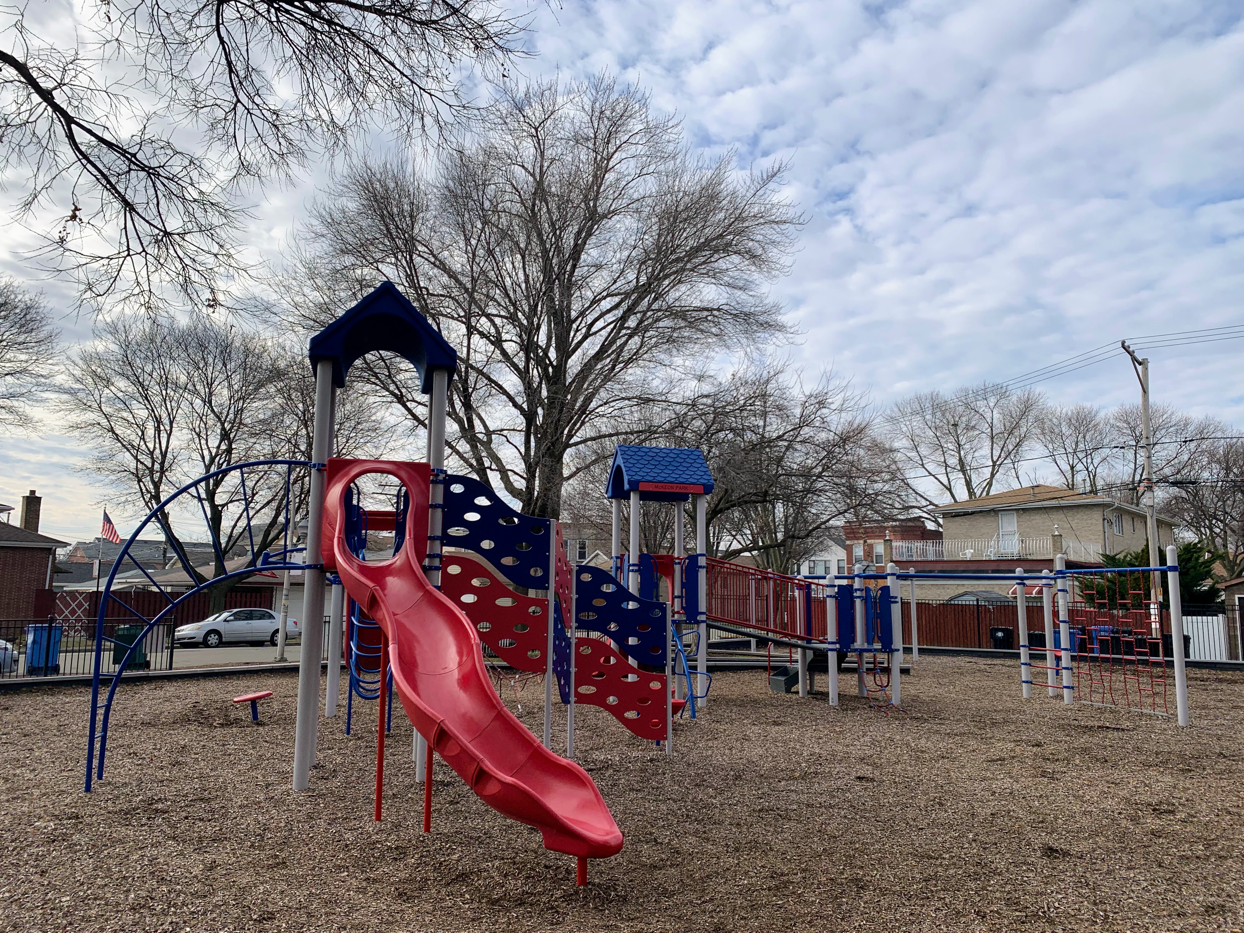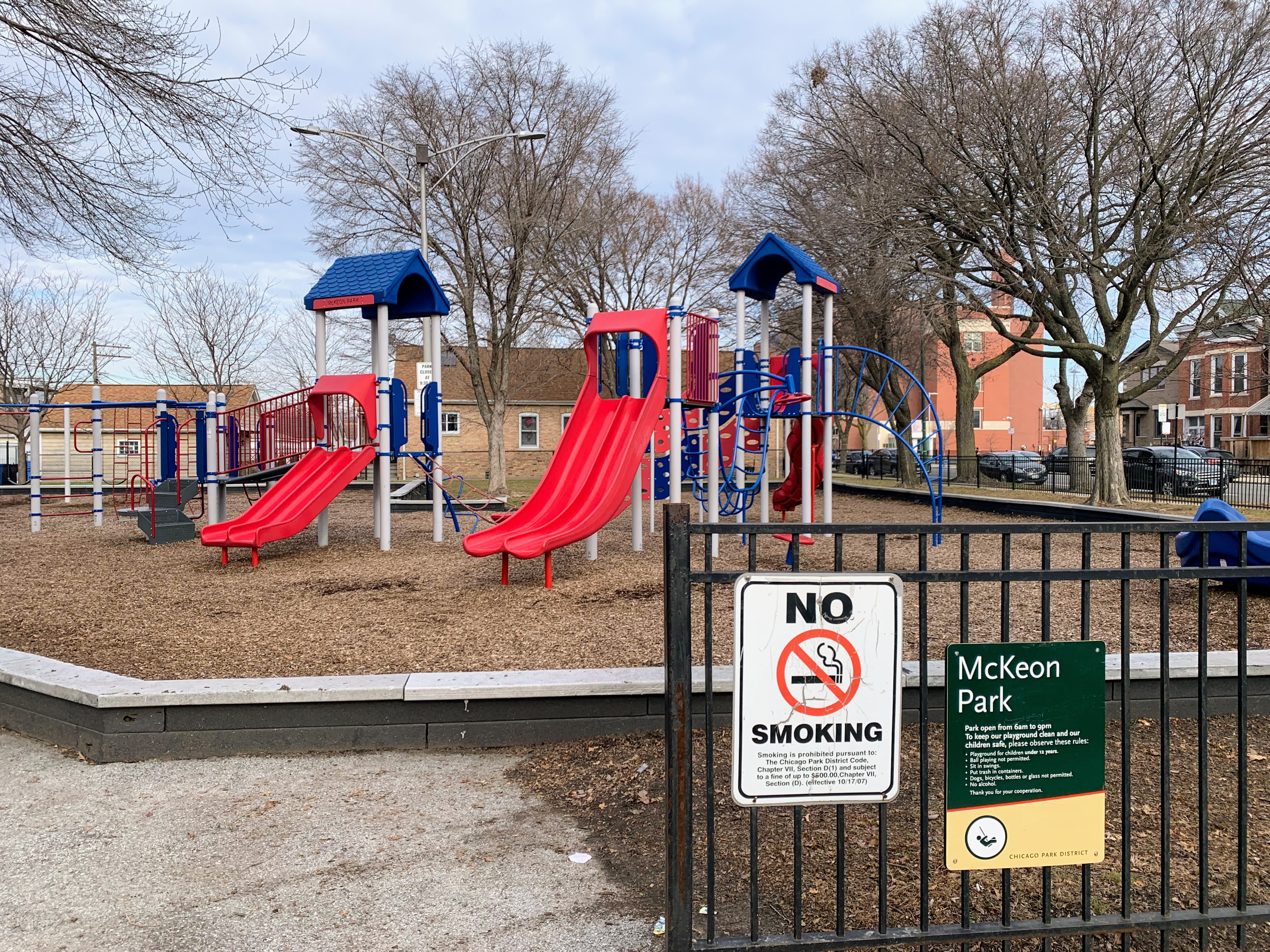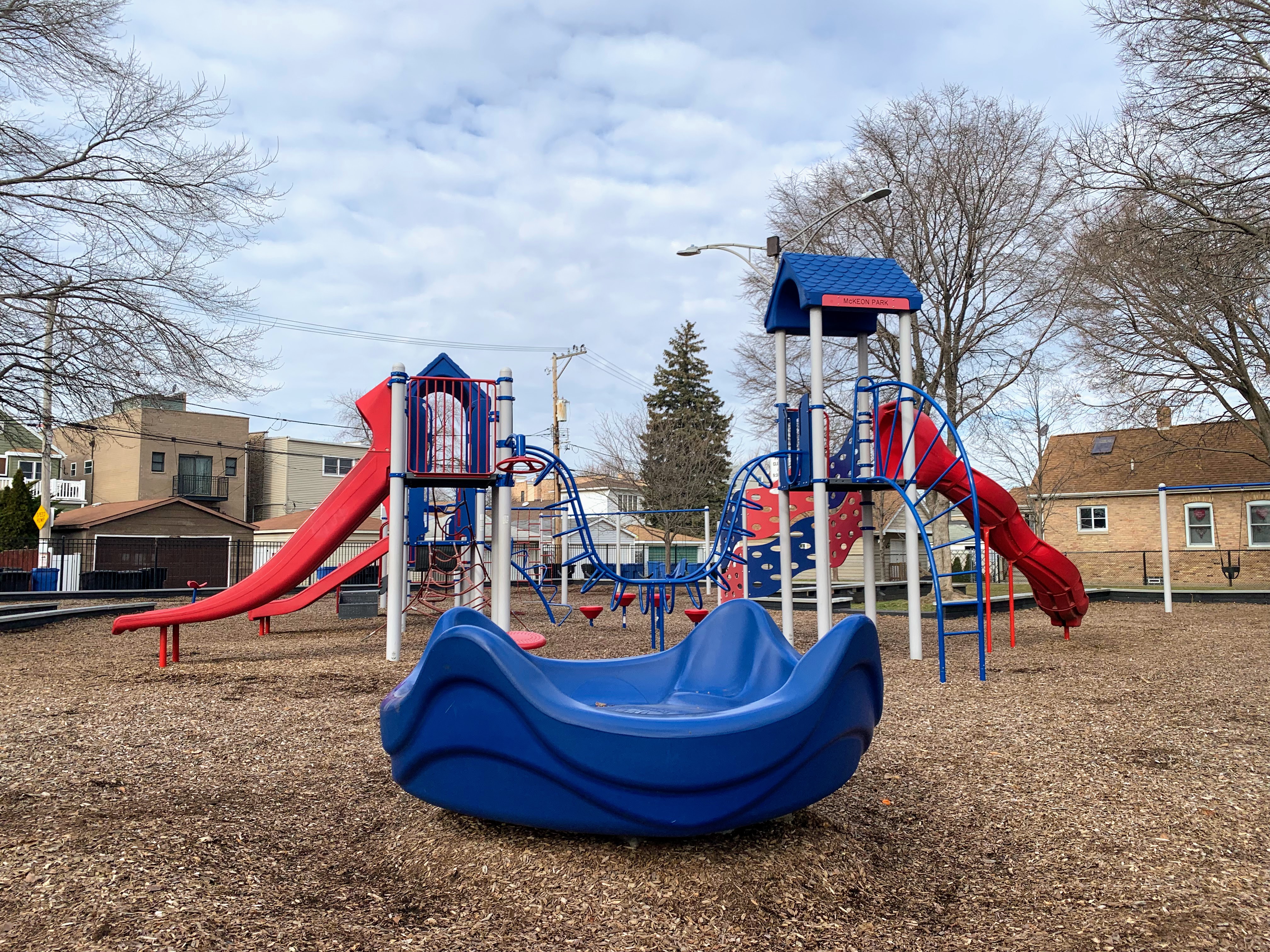 - McKeon Park is a moderate sized neighborhood playground with a large playground that was renovated in 2014. There are a variety of swings (toddler, adaptive, belt seat, and a tire swing!) and a large play structure with a few slides, climbing elements, and monkey bars. The play area is quite large and covered in a wood chips with a grassy area to the north. The setting is great - a quiet residential area - but the amenities are lacking. There are a few benches around the perimeter of the park but adding a few picnic tables or a drinking fountain would improve this site. Despite these imperfections, this is a still a great playground.