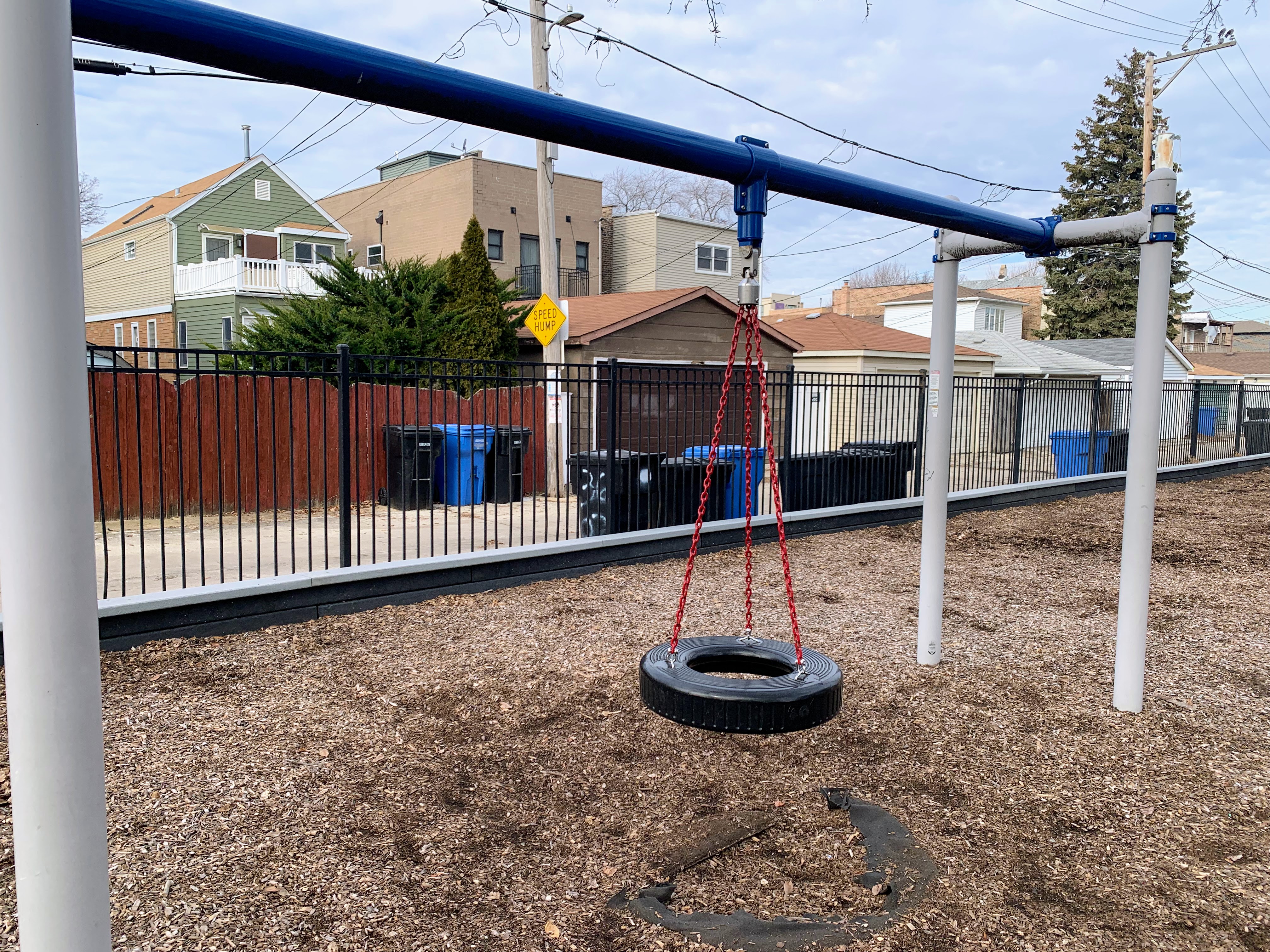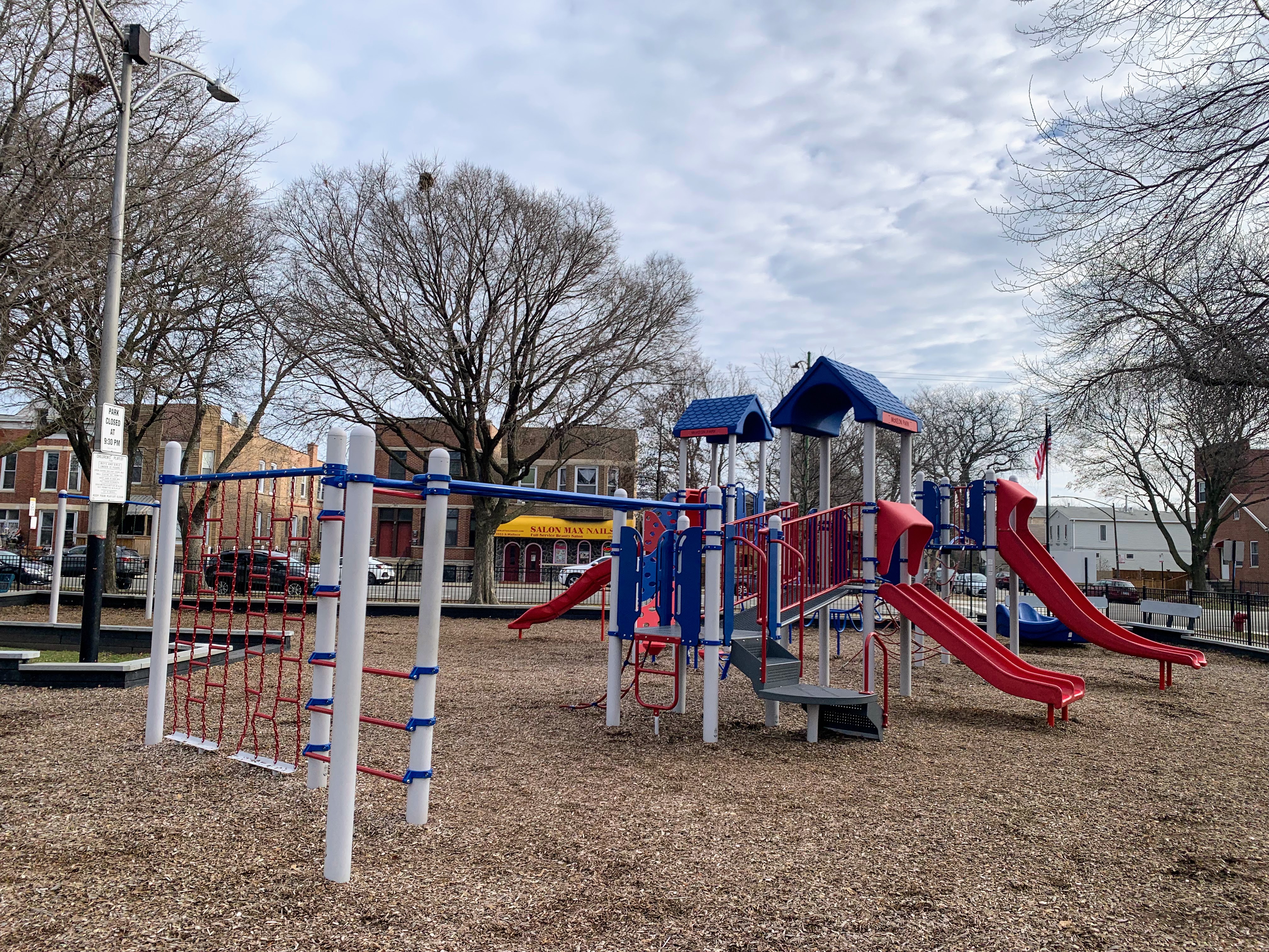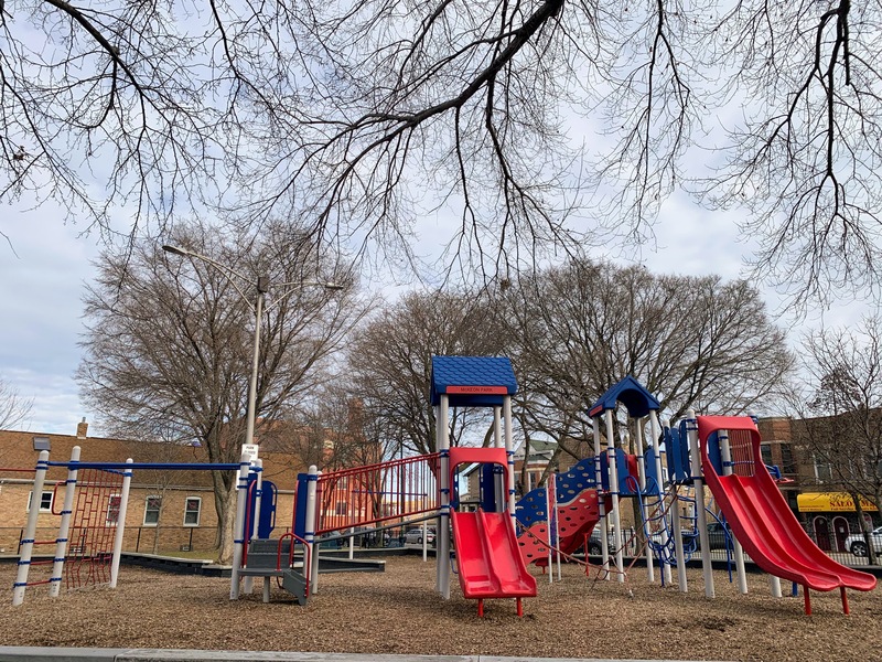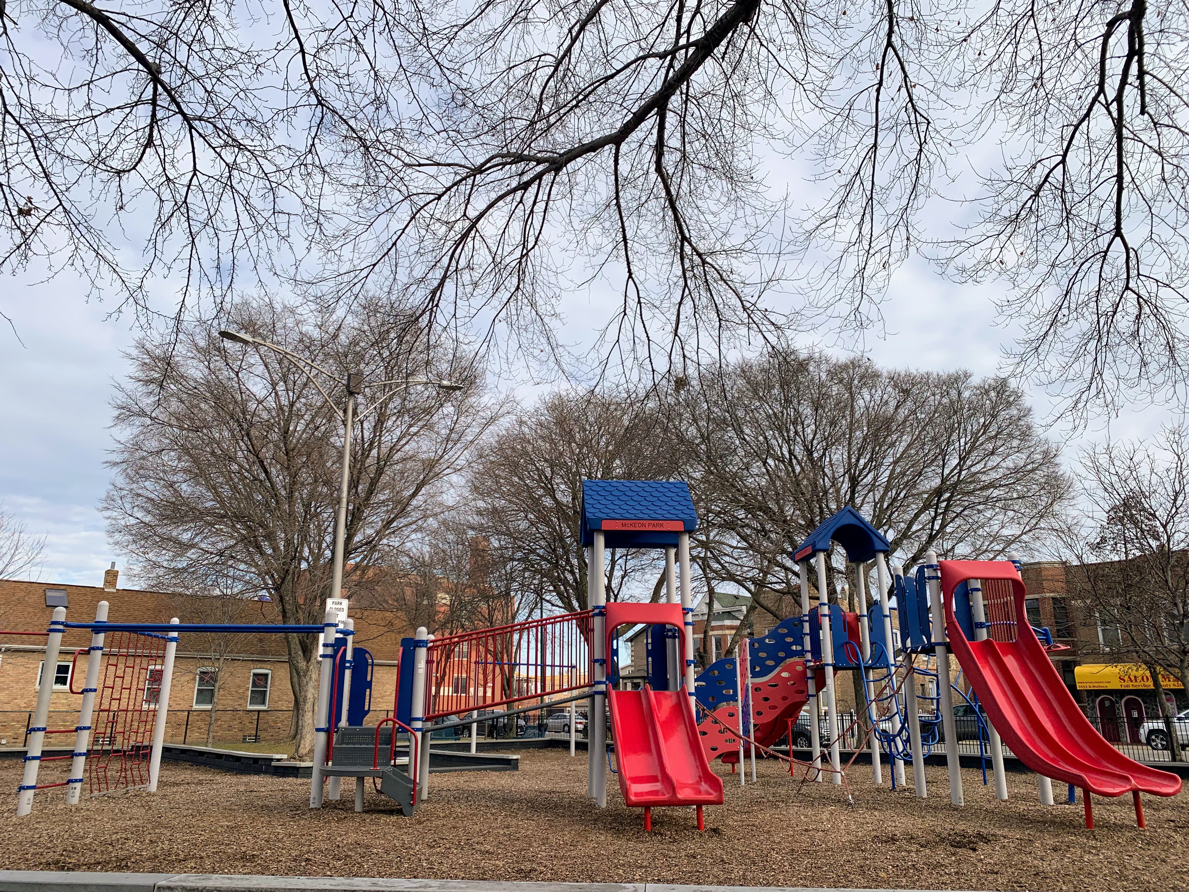 - McKeon Park is a moderate sized neighborhood playground with a large playground that was renovated in 2014. There are a variety of swings (toddler, adaptive, belt seat, and a tire swing!) and a large play structure with a few slides, climbing elements, and monkey bars. The play area is quite large and covered in a wood chips with a grassy area to the north. The setting is great - a quiet residential area - but the amenities are lacking. There are a few benches around the perimeter of the park but adding a few picnic tables or a drinking fountain would improve this site. Despite these imperfections, this is a still a great playground.