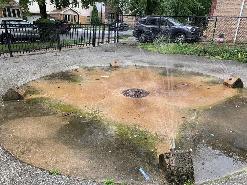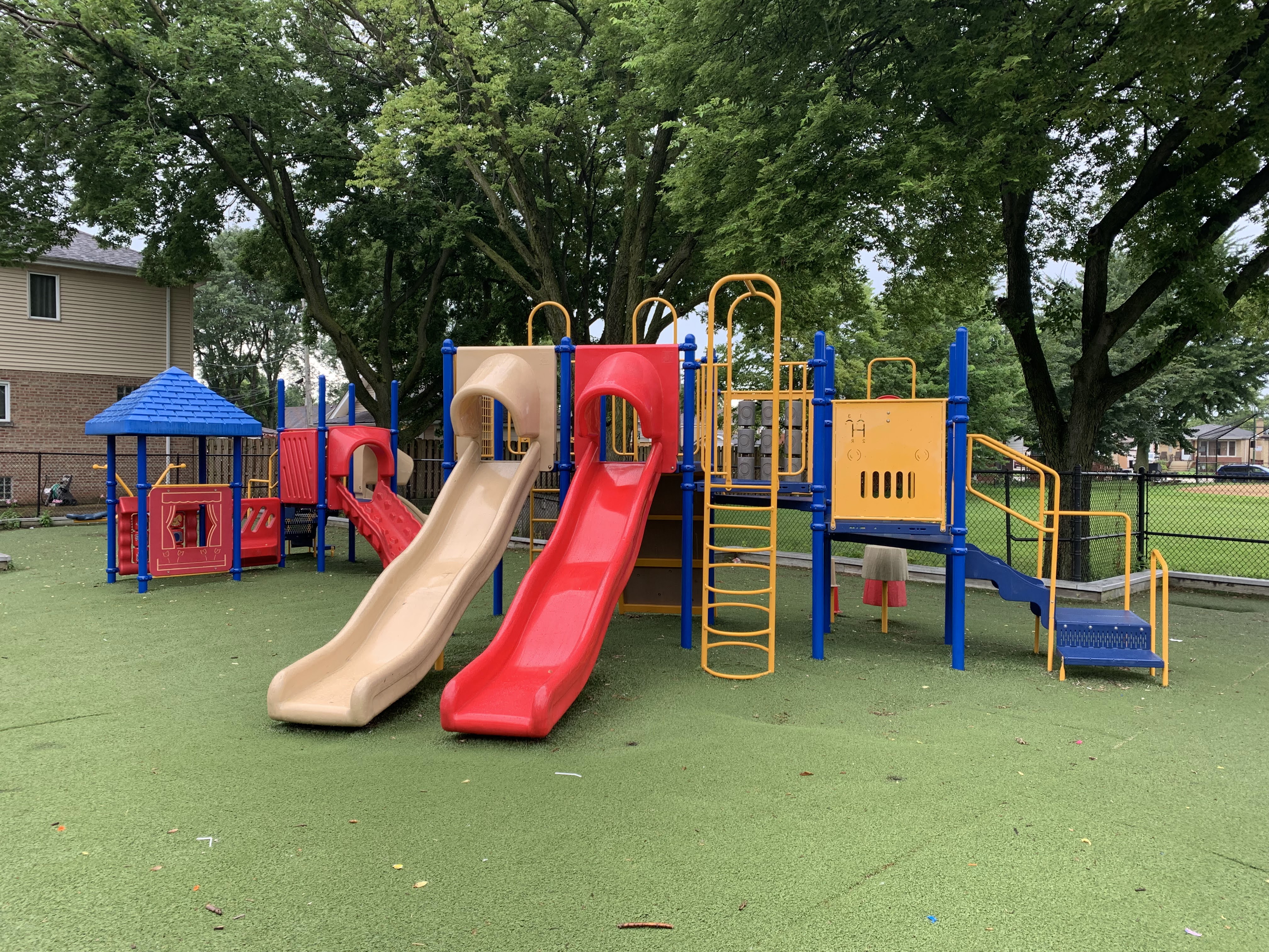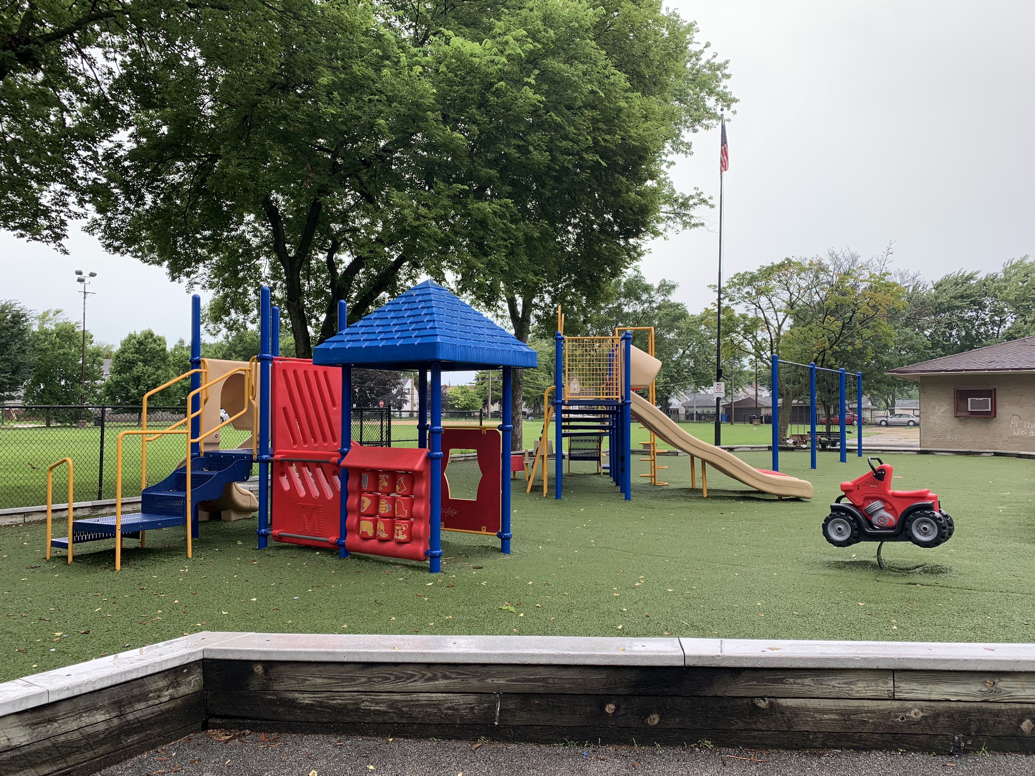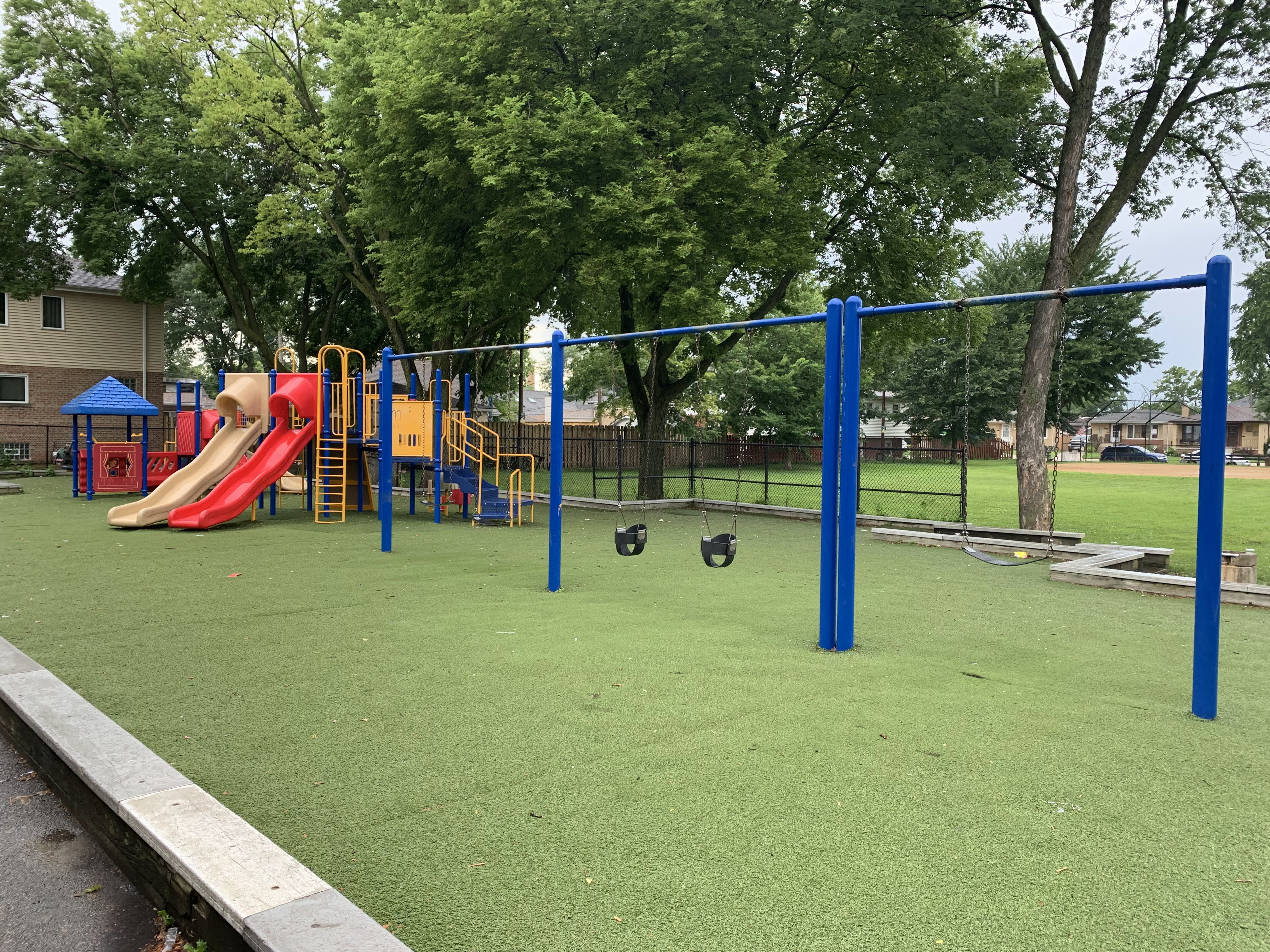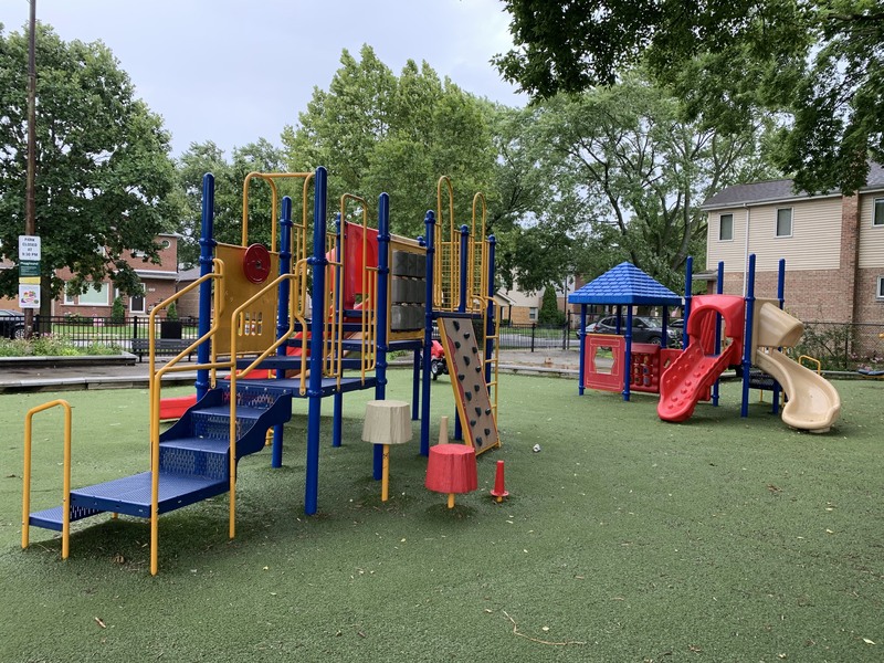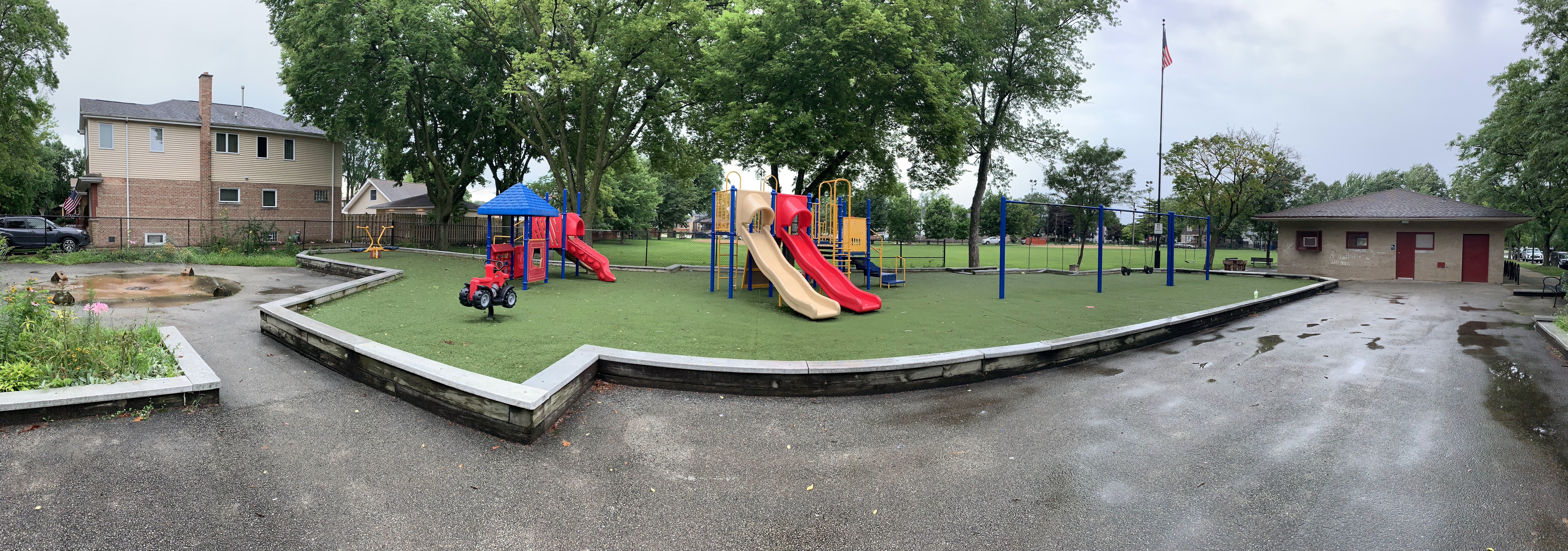 - Tucked just off a quiet cul-de-sac, the playground at McKiernan Park features some interesting - although perhaps somewhat dated - playground equipment. There are two structures - one smaller and one larger - that offer some of the standard play elements: slides and a few climbing elements. There is a small swing set, a few standalone elements, and a simple water spray feature. There are benches and a small table near the play area as well as a some large trees providing some shade. The play area is fenced from the street and opens directly into the park and the play surface is artificial turf. The small park district building nearby should provide access to bathrooms (when open).