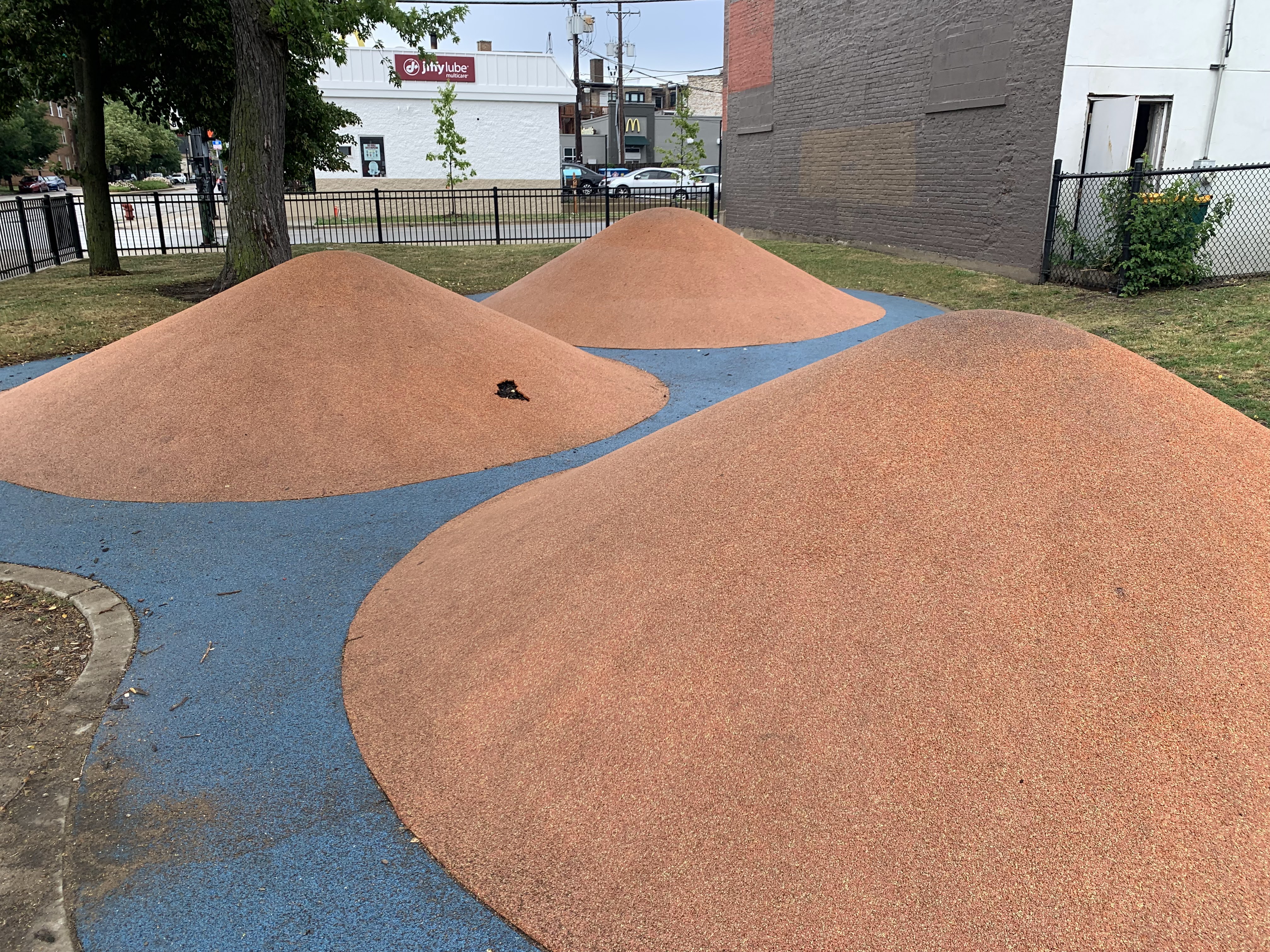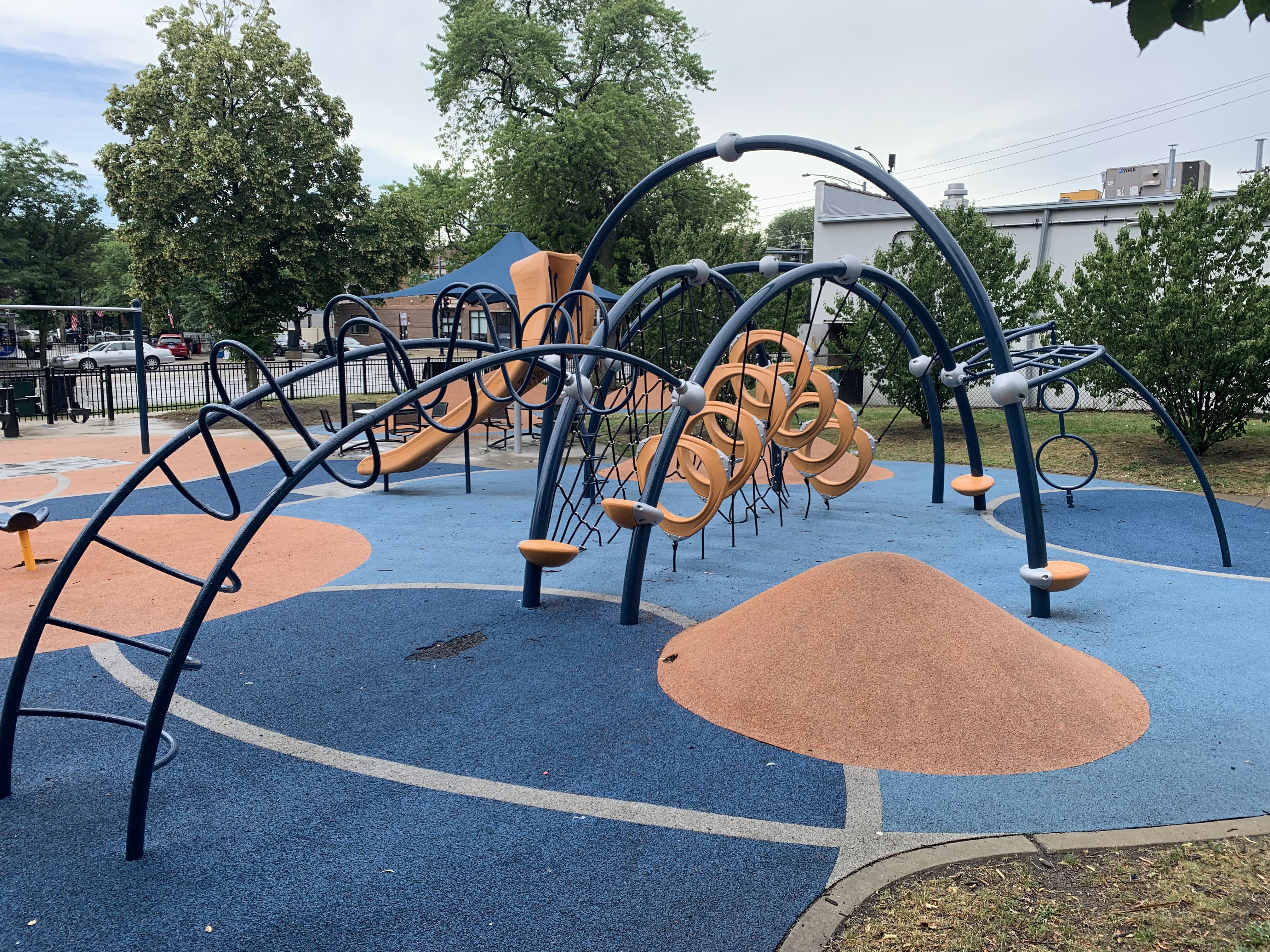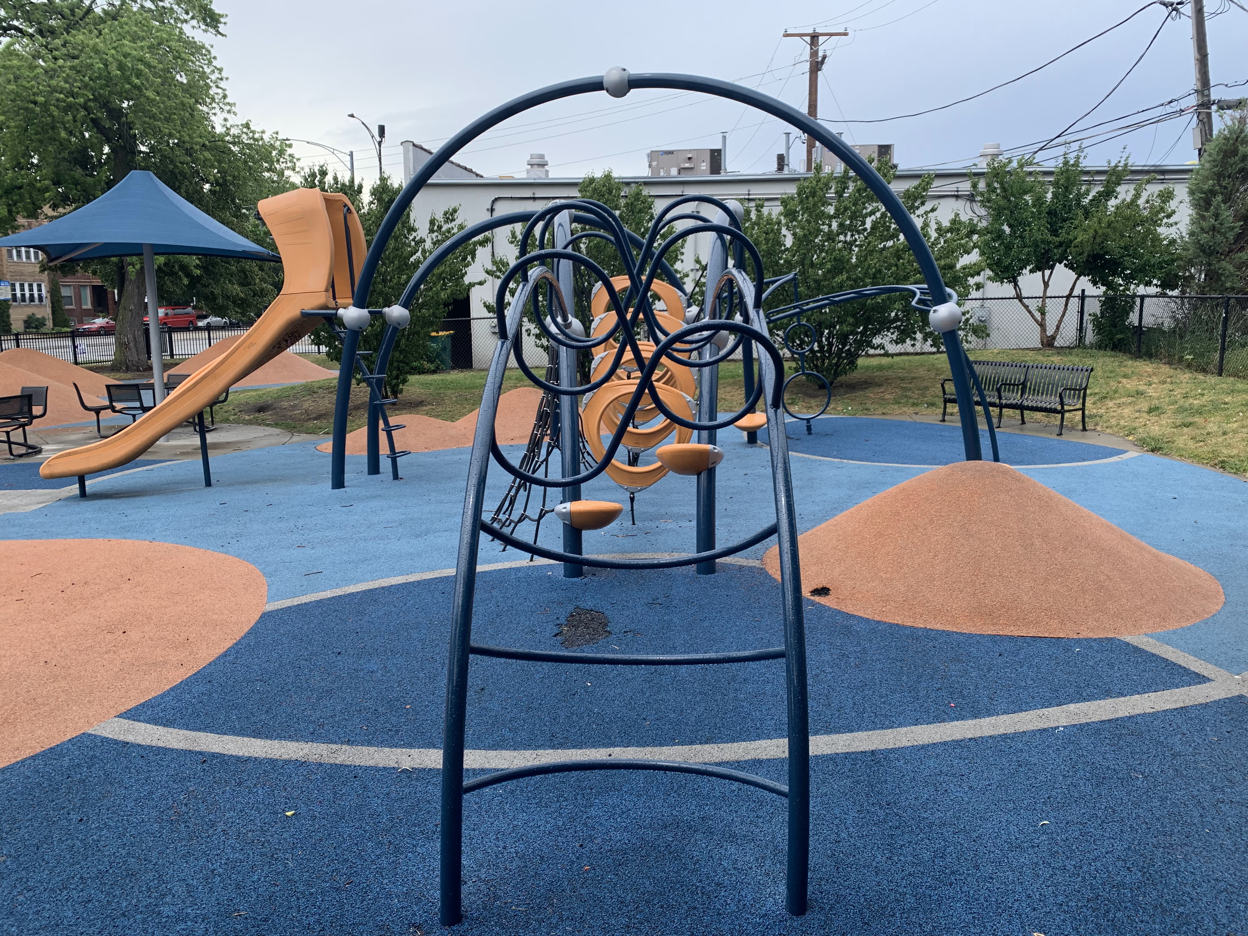 - Renovated in 2013, this small playground features a swing set and a set of modern climbing elements. The swing set includes the standard swings: toddler, adaptive, and belt seat. The rest of the playground isn't a traditional play structure but is instead a collection of climbing elements made of metal and rope and a single curved slide. The play area is fully enclosed and features a soft rubber surface that is mounded and sculpted so that the surface itself is a play element. There are a number of nice amenities in this park as well including benches, a drinking fountain, and picnic tables under a large shade umbrella.