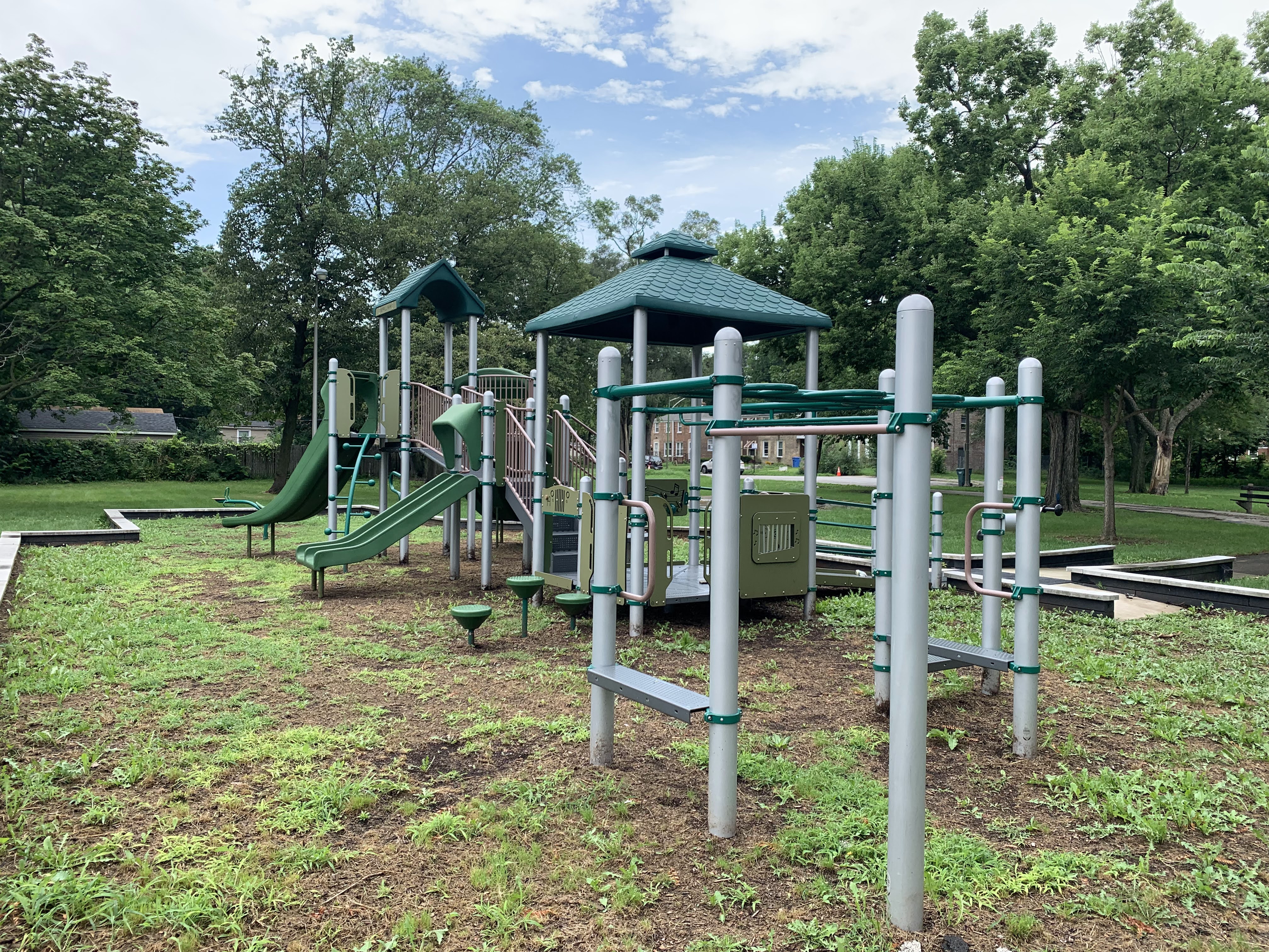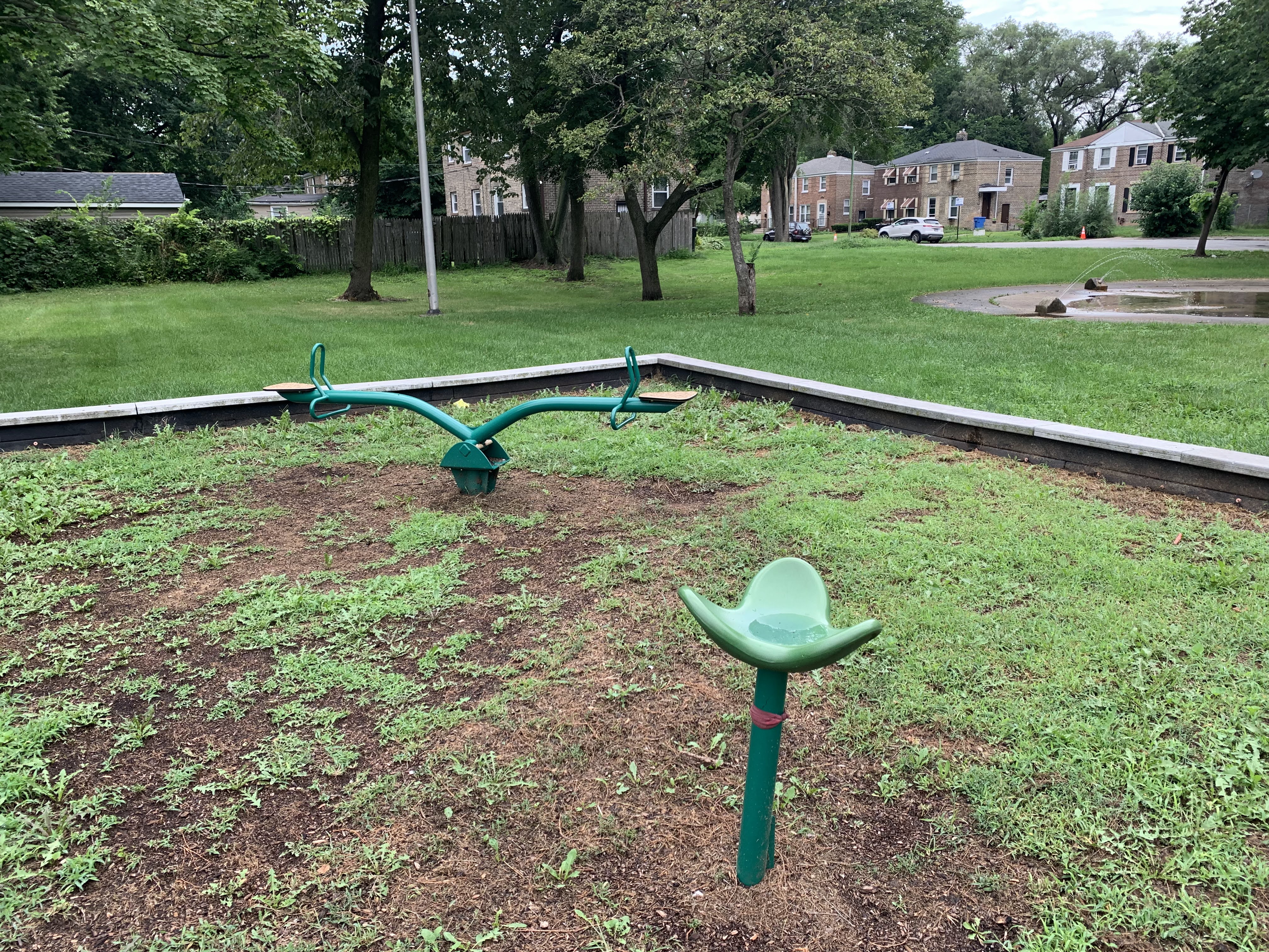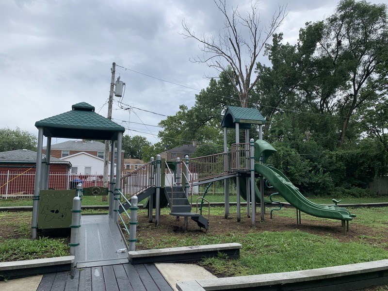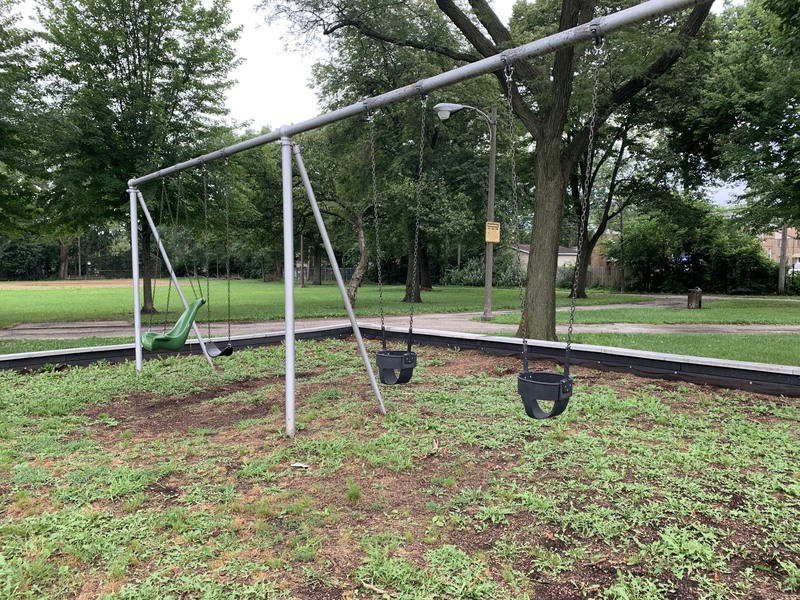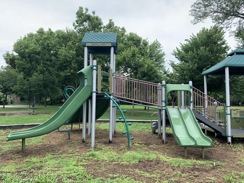 - Off the nearby streets, the playground in Merrill Park offers some of the standard Chicago Park playground options. There is a large play structure with a variety of slides, climbing elements, and monkey bars. There is a standard set of Chicago Park swings. There is a simple water spray feature. Surrounding by grass, this playground is not enclosed nor does it have seating nearby. The play surface is wood chips and, despite many trees in the park, the play area itself is bright and sunny.
