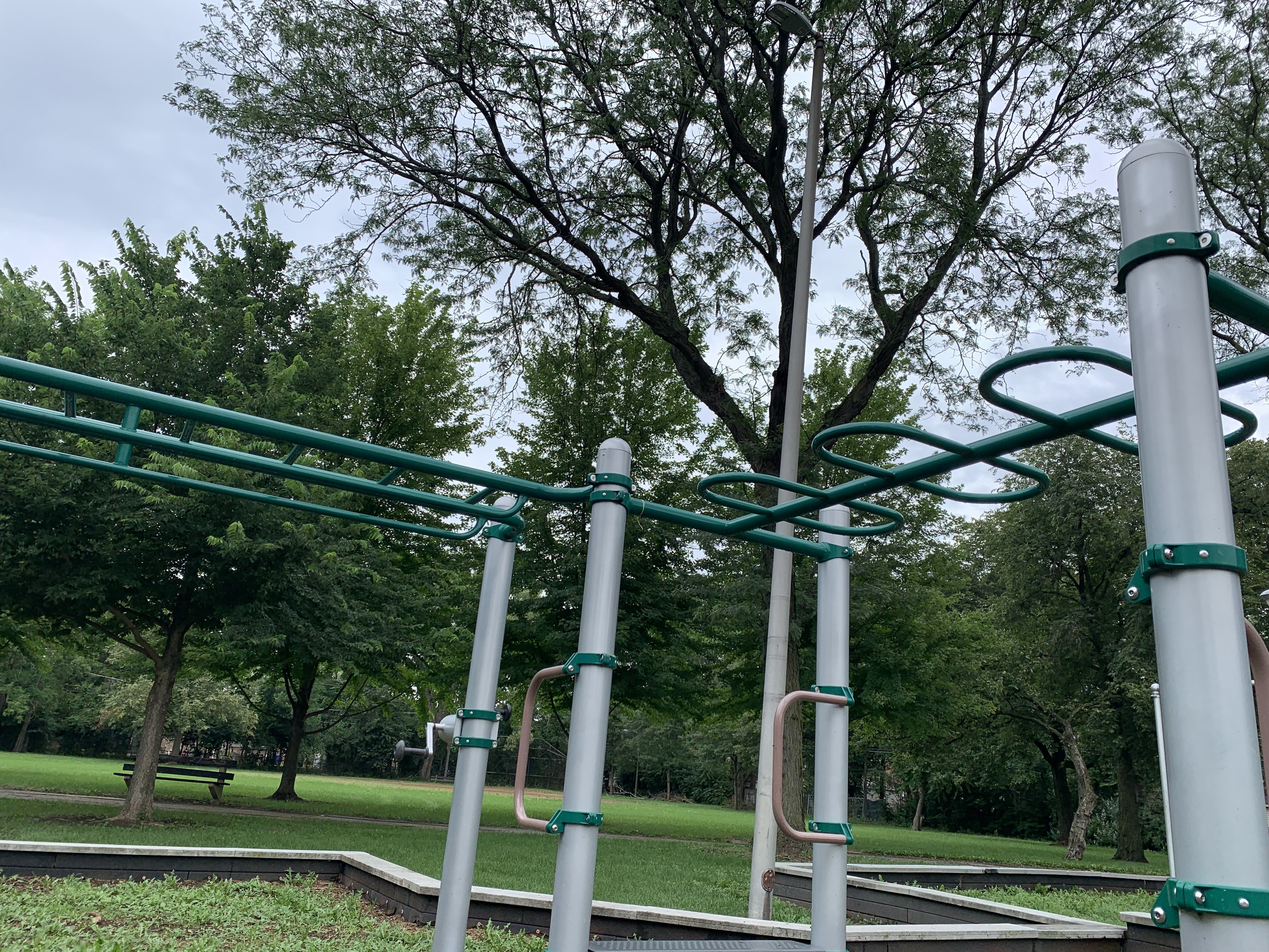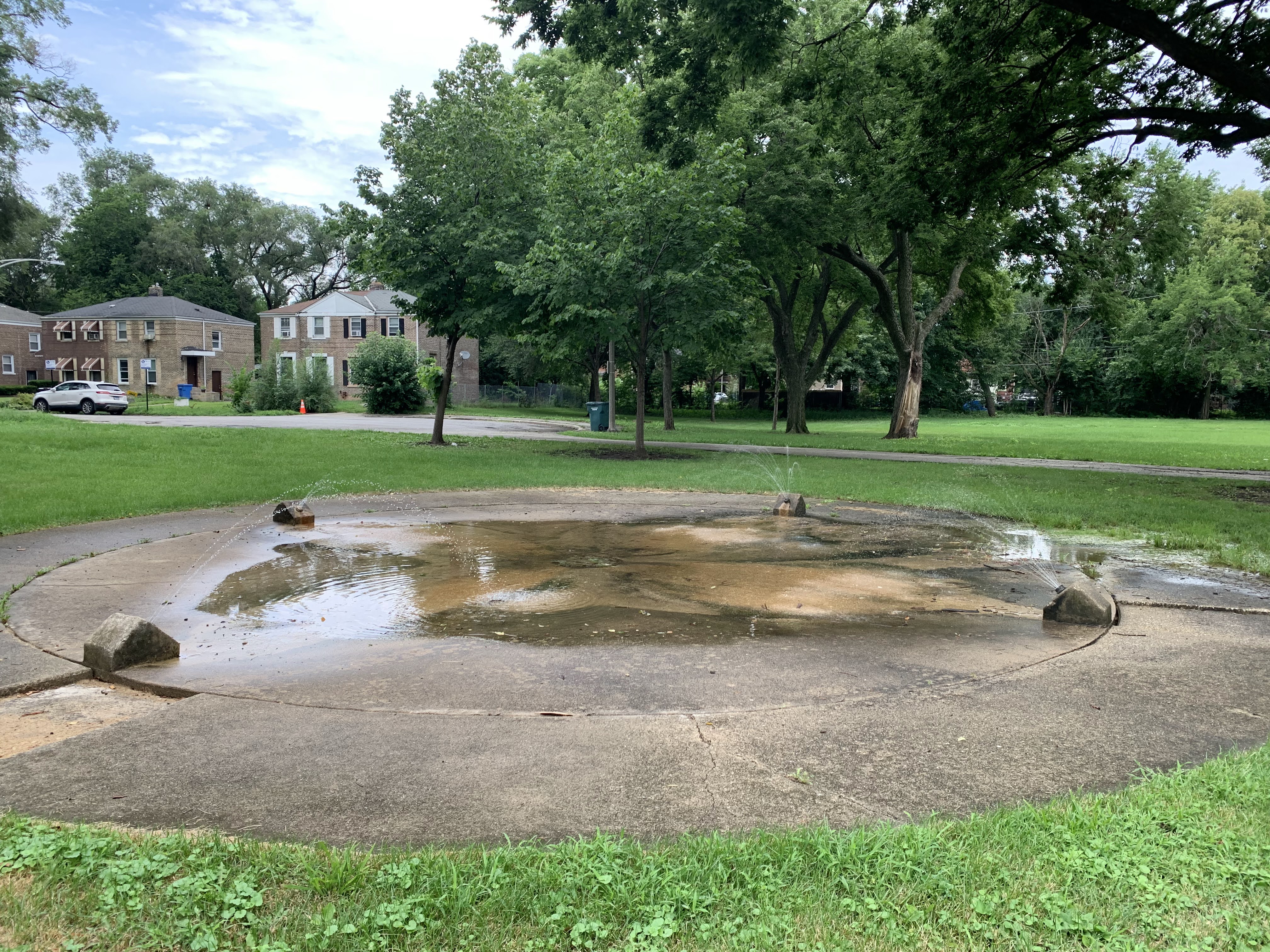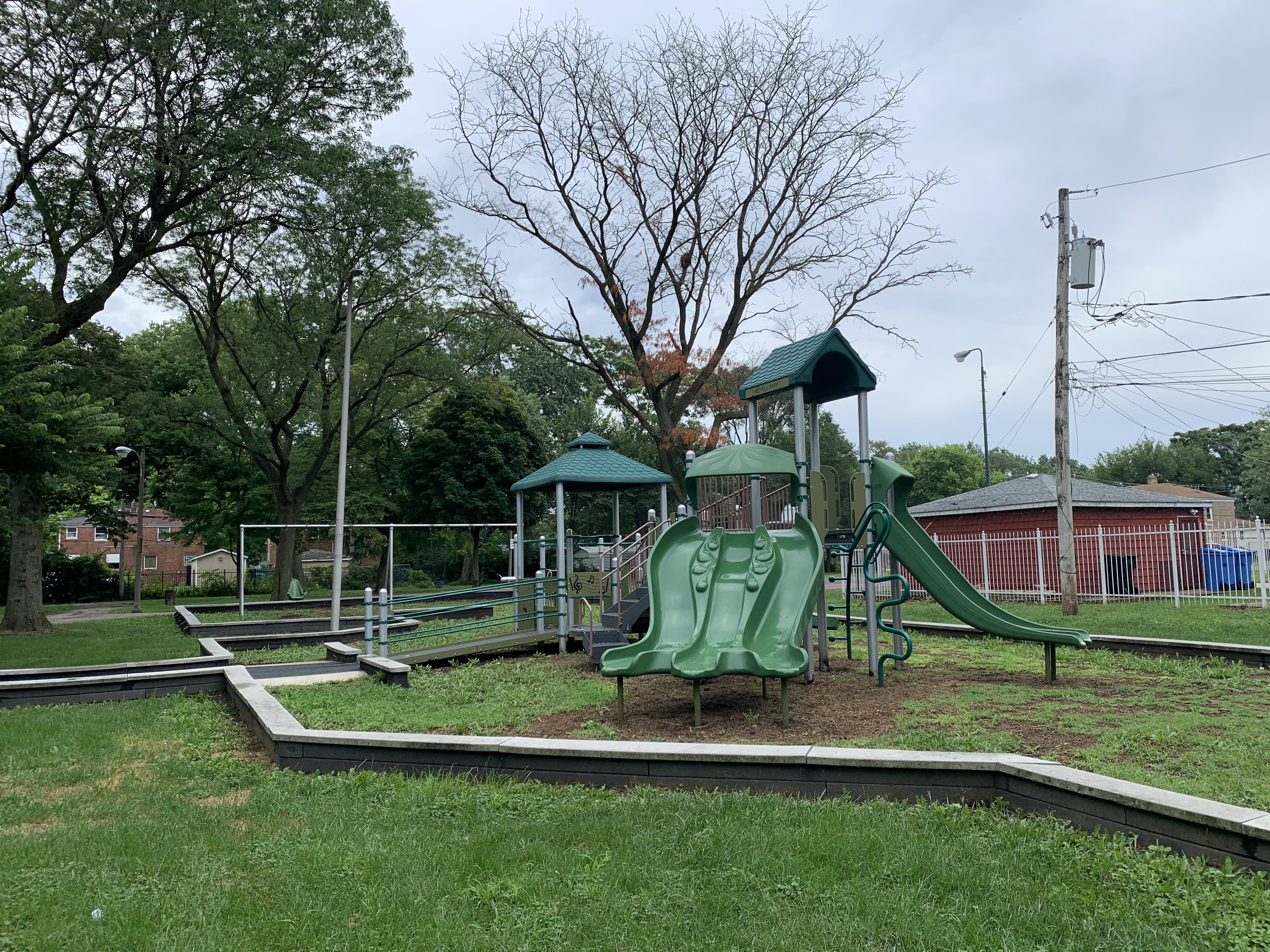- Off the nearby streets, the playground in Merrill Park offers some of the standard Chicago Park playground options. There is a large play structure with a variety of slides, climbing elements, and monkey bars. There is a standard set of Chicago Park swings. There is a simple water spray feature. Surrounding by grass, this playground is not enclosed nor does it have seating nearby. The play surface is wood chips and, despite many trees in the park, the play area itself is bright and sunny.