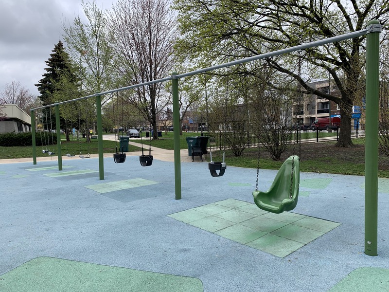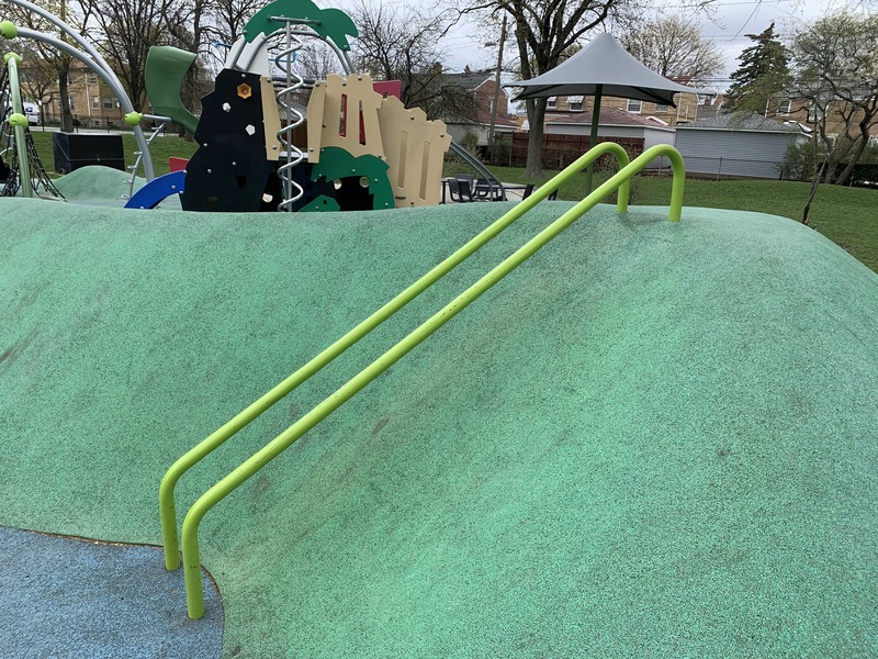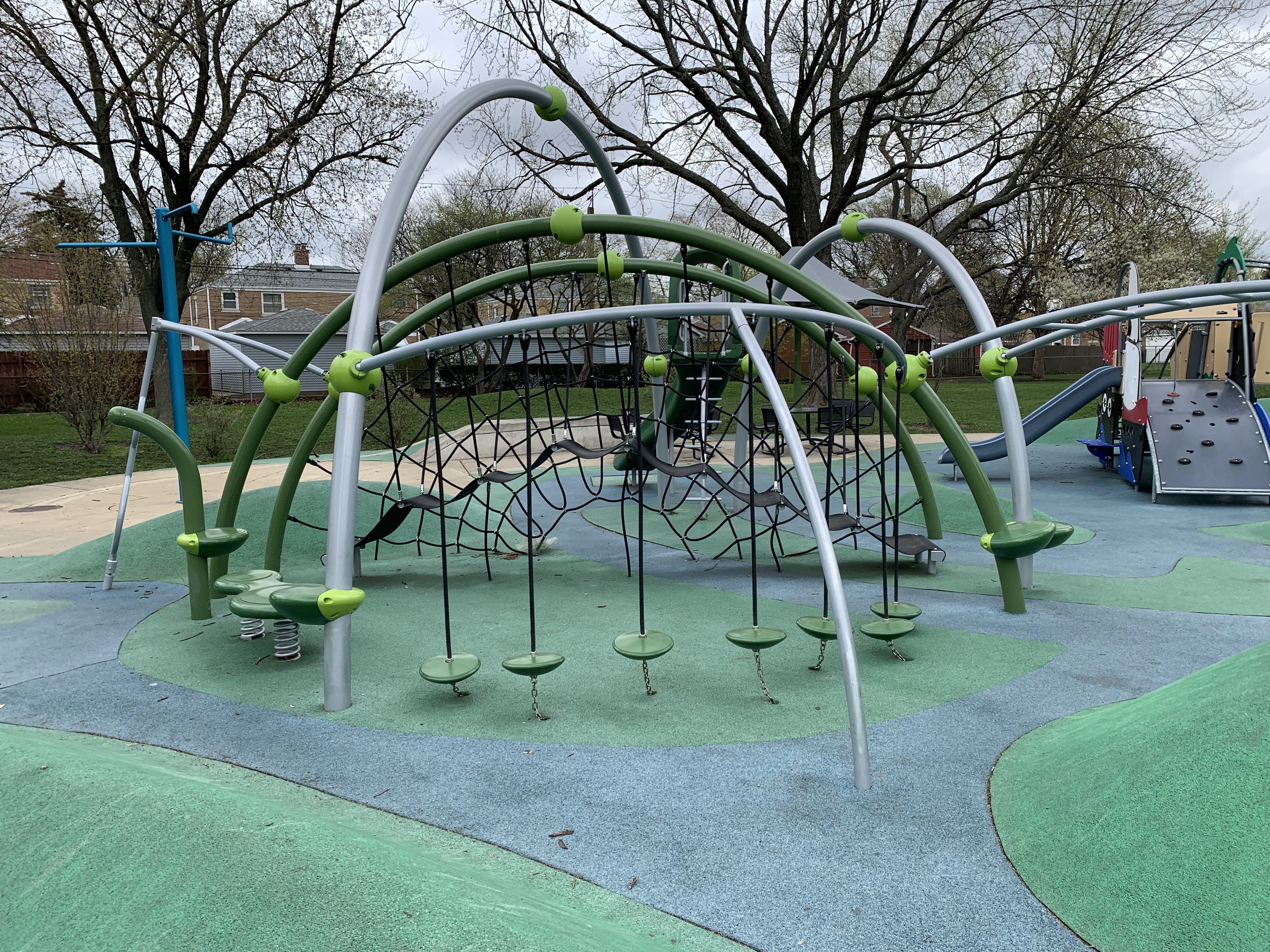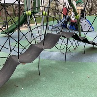 - The playground in Merrimac Park is located in the northeast corner of the park and has a lot of modern features. The play surface is soft rubber that is mounded in spots making the surface itself a play feature. On top of that surface, there are several large climbing and traversing elements that are very modern including some large semi-circular climbing nets, rings and hanging steps, and a wavy black belt bridge. There is also a smaller play structure for younger children. There are a few standalone elements including a rail slide and a spinning seat as well as the more traditional varieties of swings (toddler, traditional, and molded bucket). There is also a water spray feature with a triple overhead spray element. There are a few benches and picnic tables as well as a large shade canopy making for a comfortable experience for all. Highly recommend this modern playground.