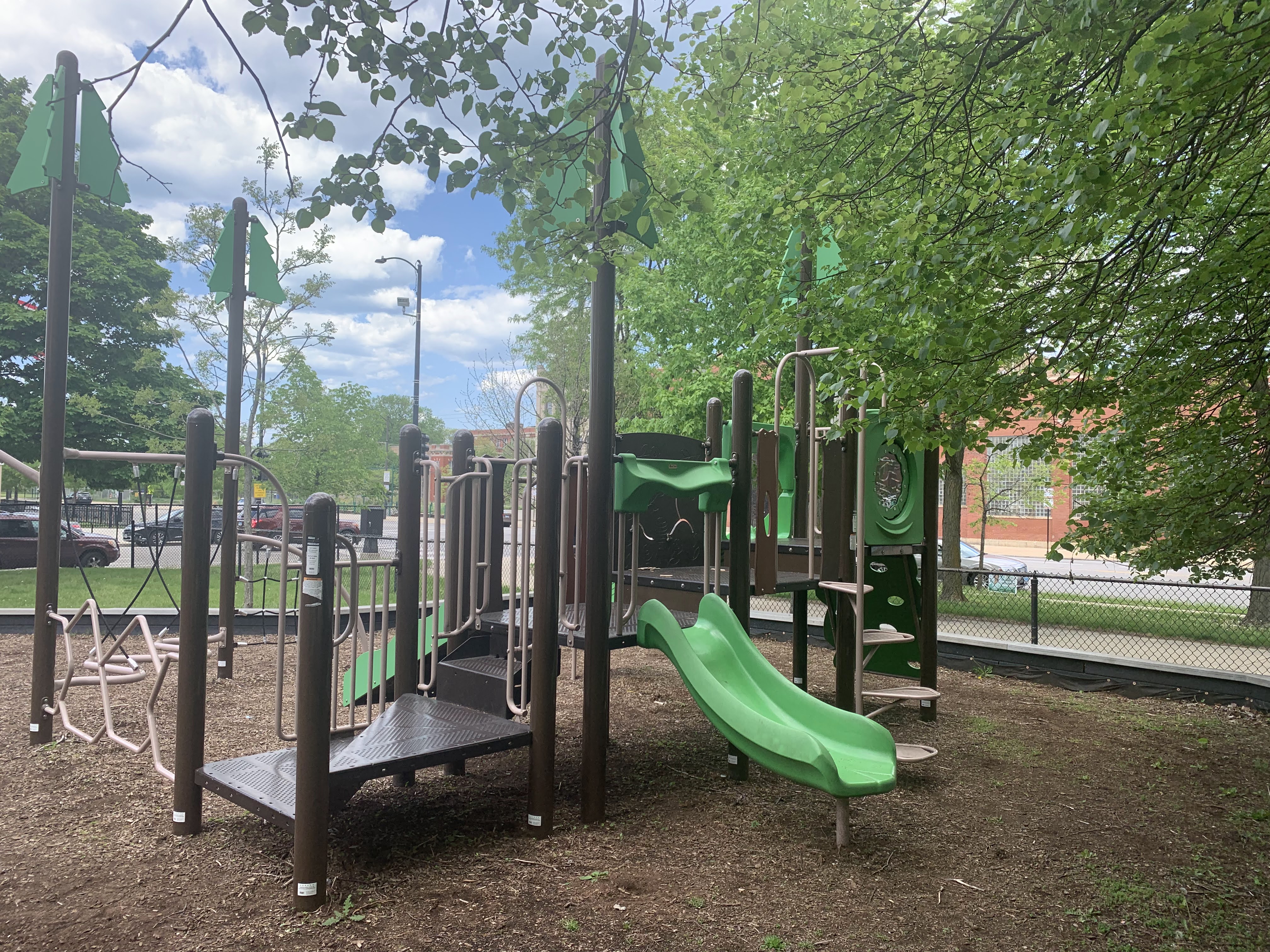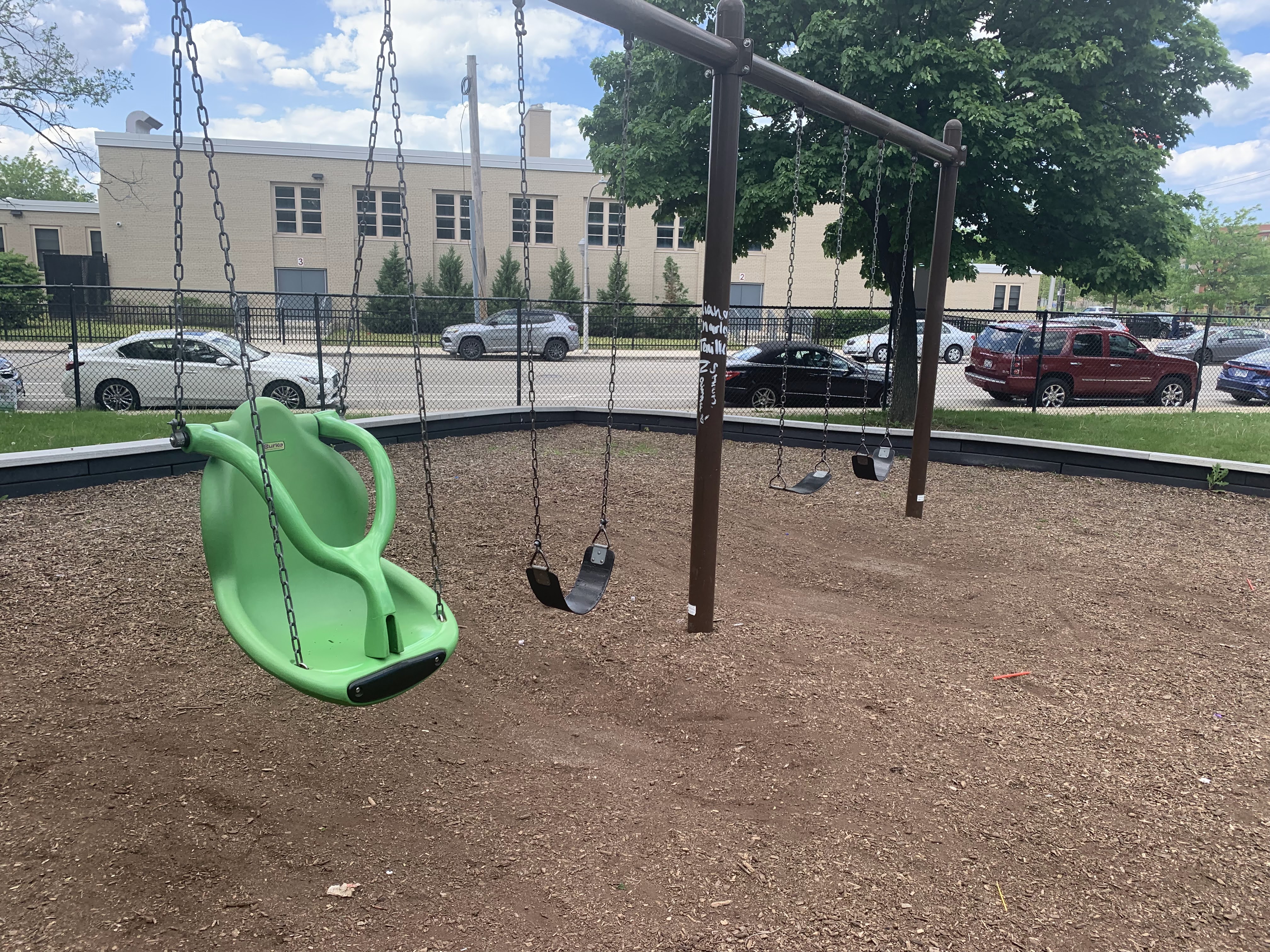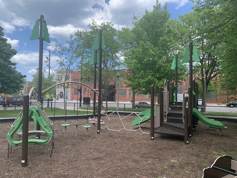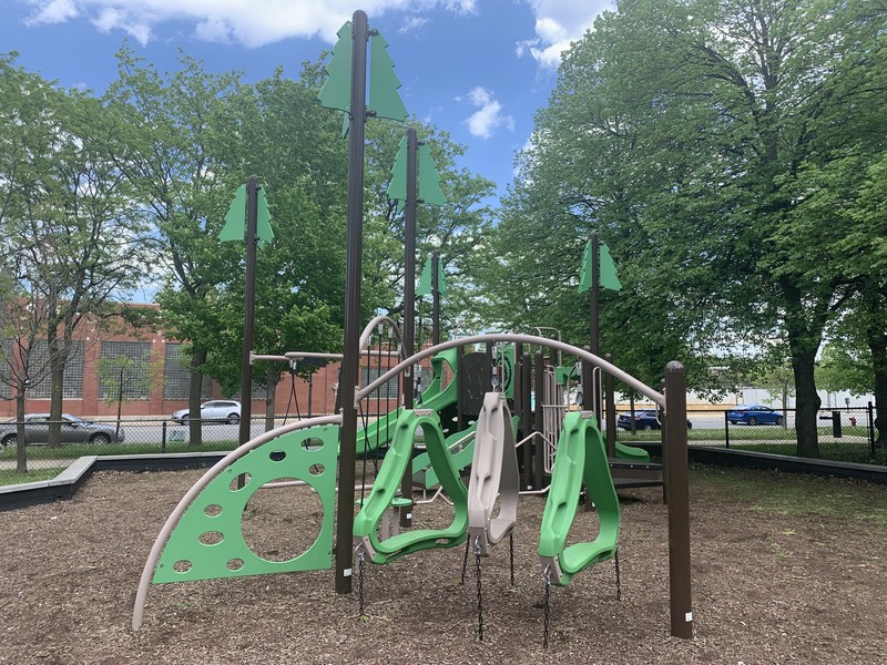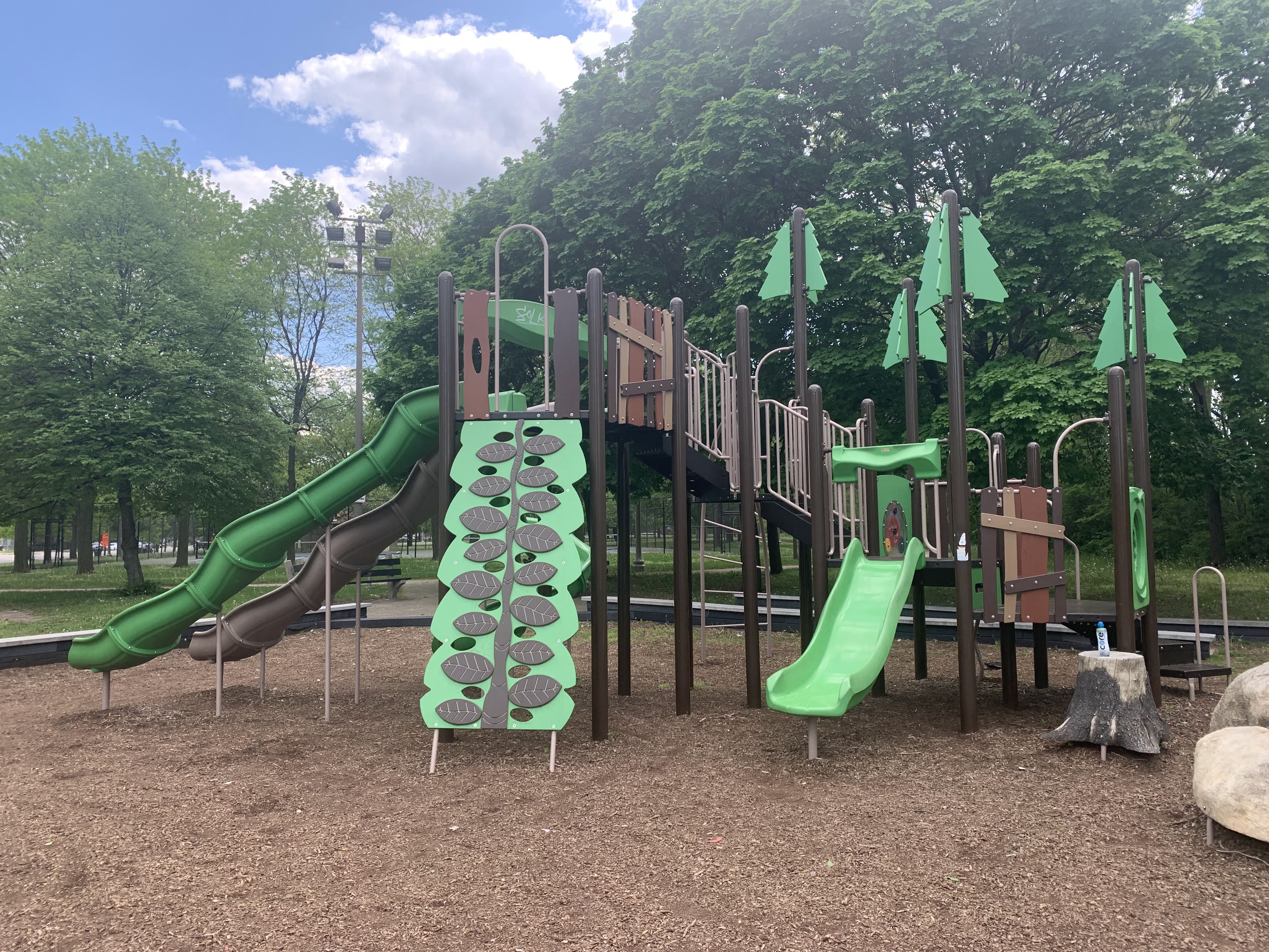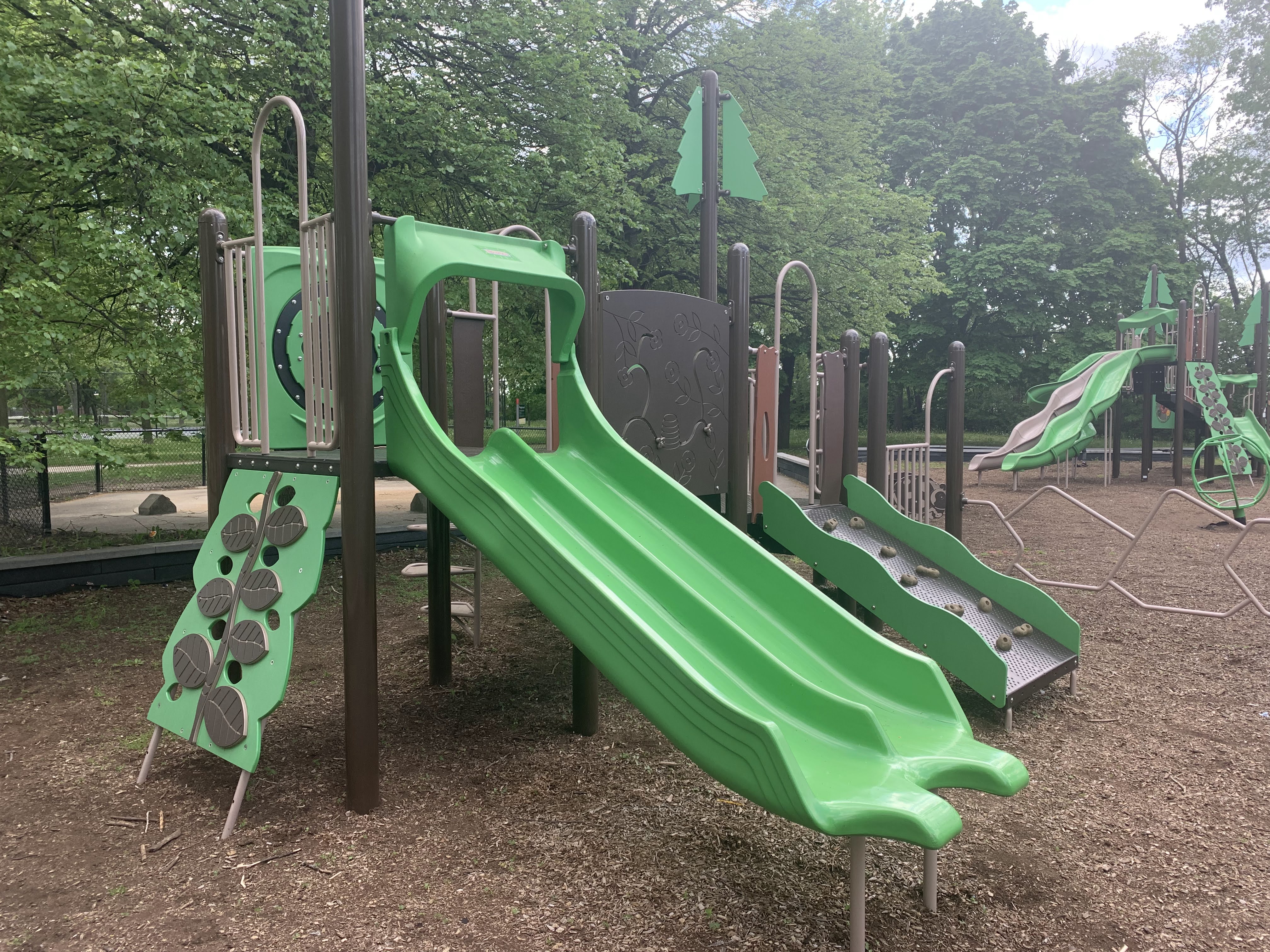 - The playground of Metcalfe Park is on the north side of the park and features a variety of swings and two play structures. The swings - toddler, adaptive with a harness, belt seat, and a tire swing - are solid offerings and the structures both include a number of slides and unique climbing elements. There is also a small 'four sprayer' water spray feature at this park near the playground. The play area isn't fully enclosed but it is fenced from the street. There are a few benches near the playground and the main surface is wood chips.