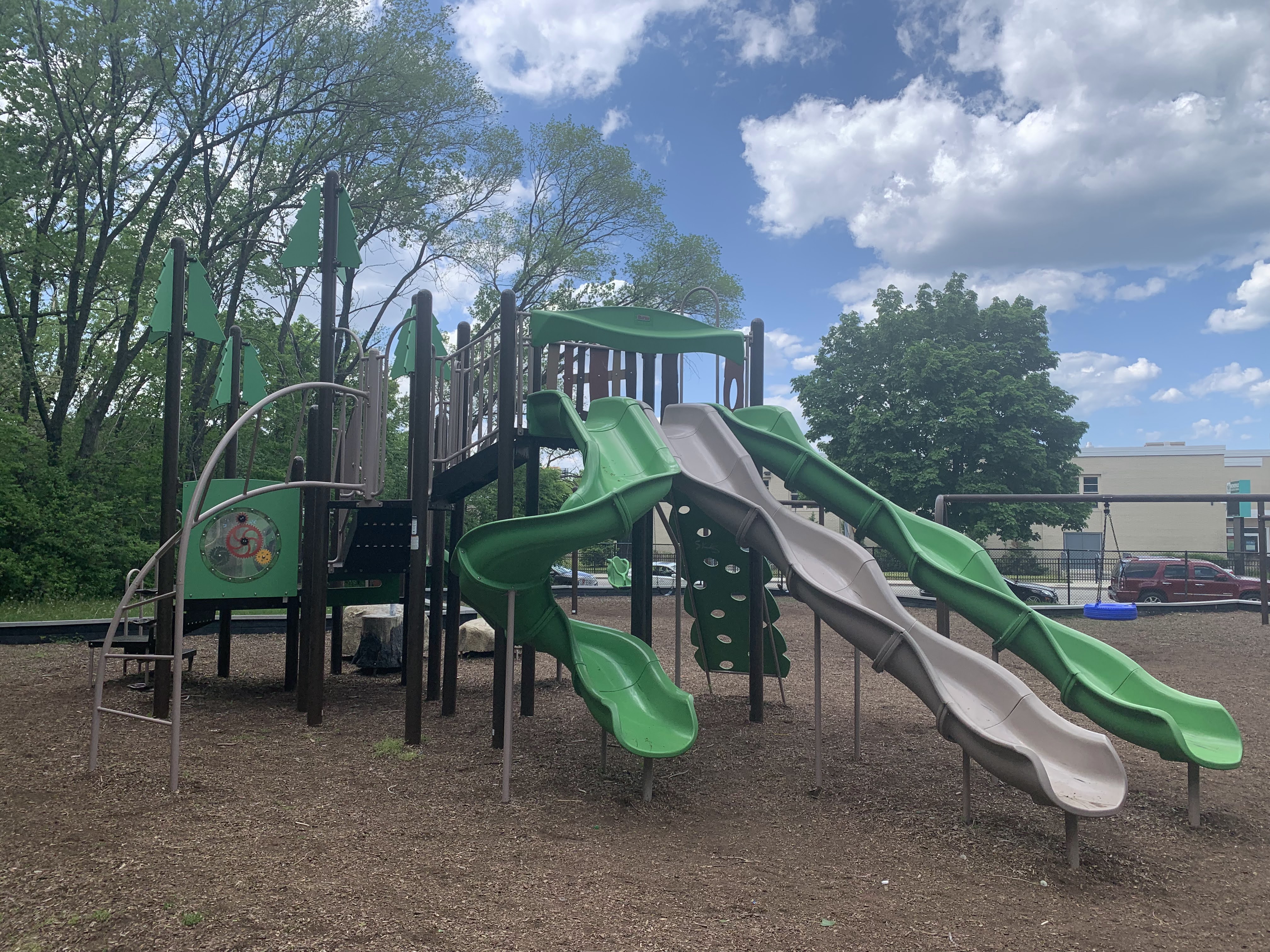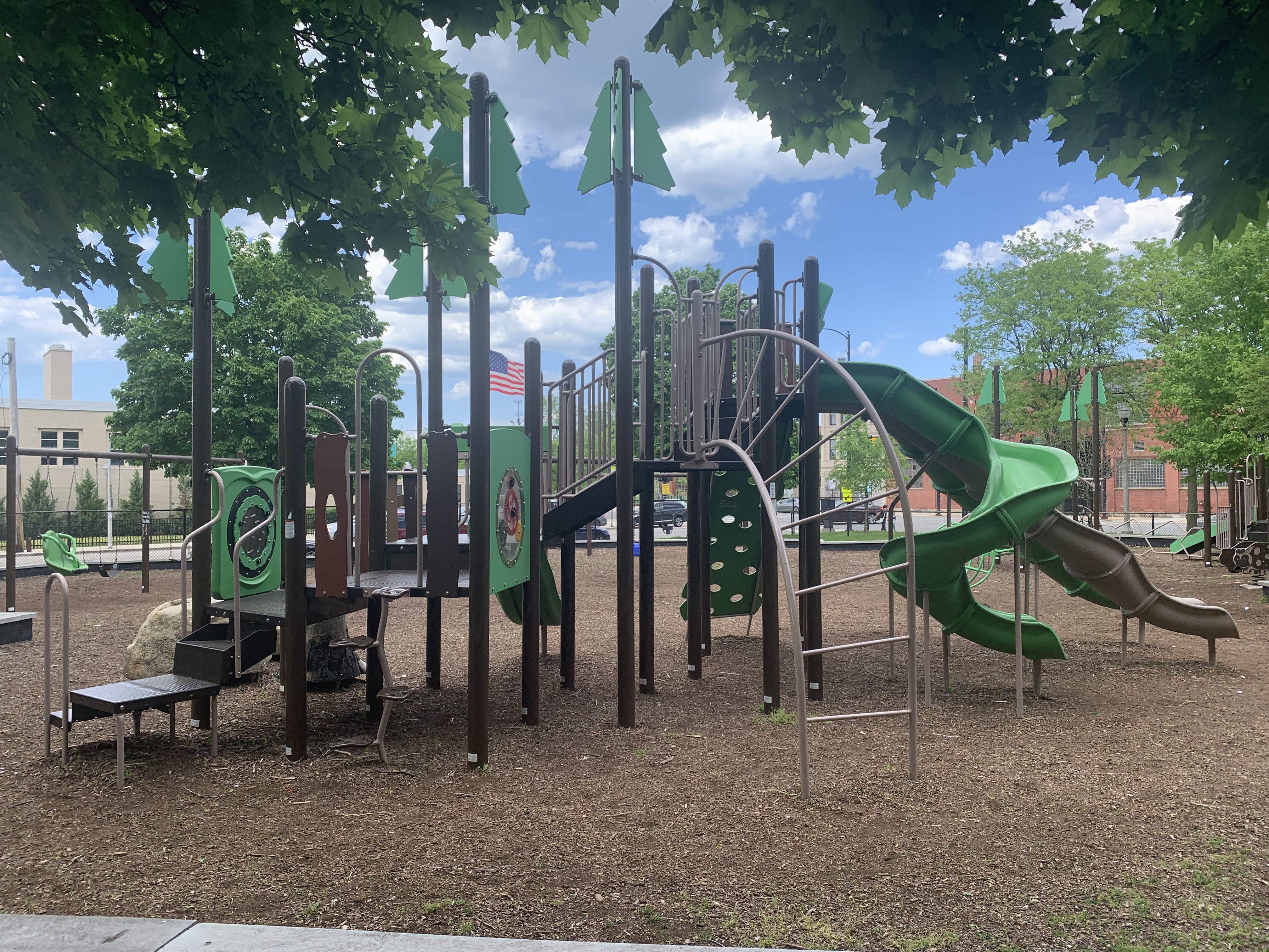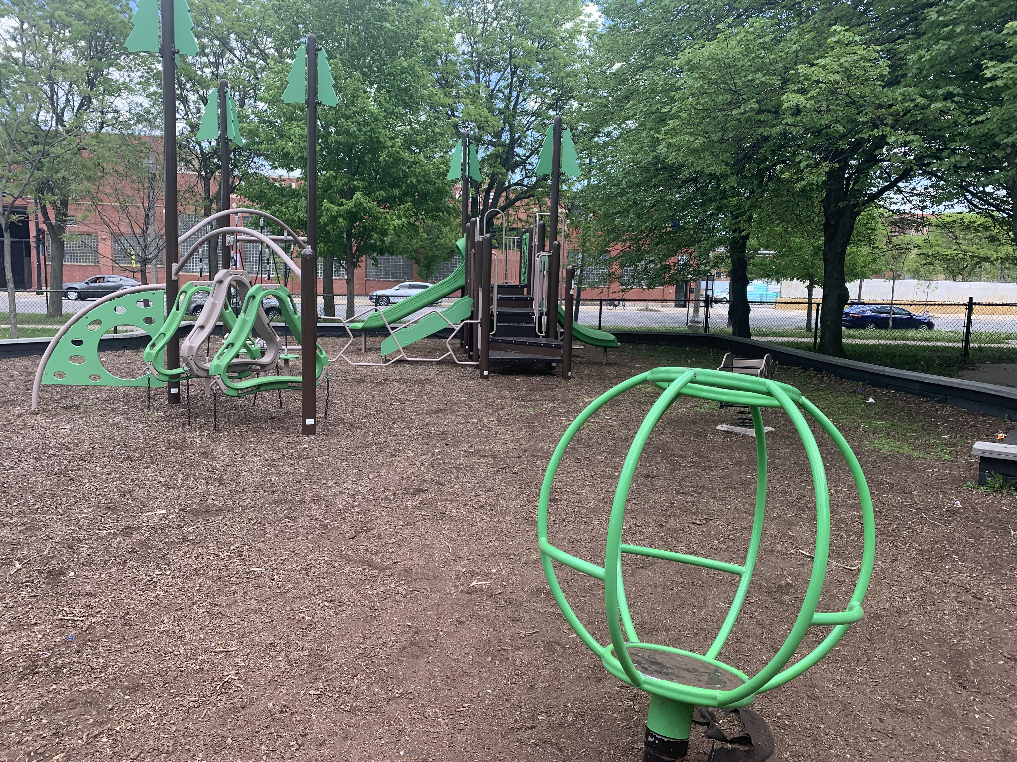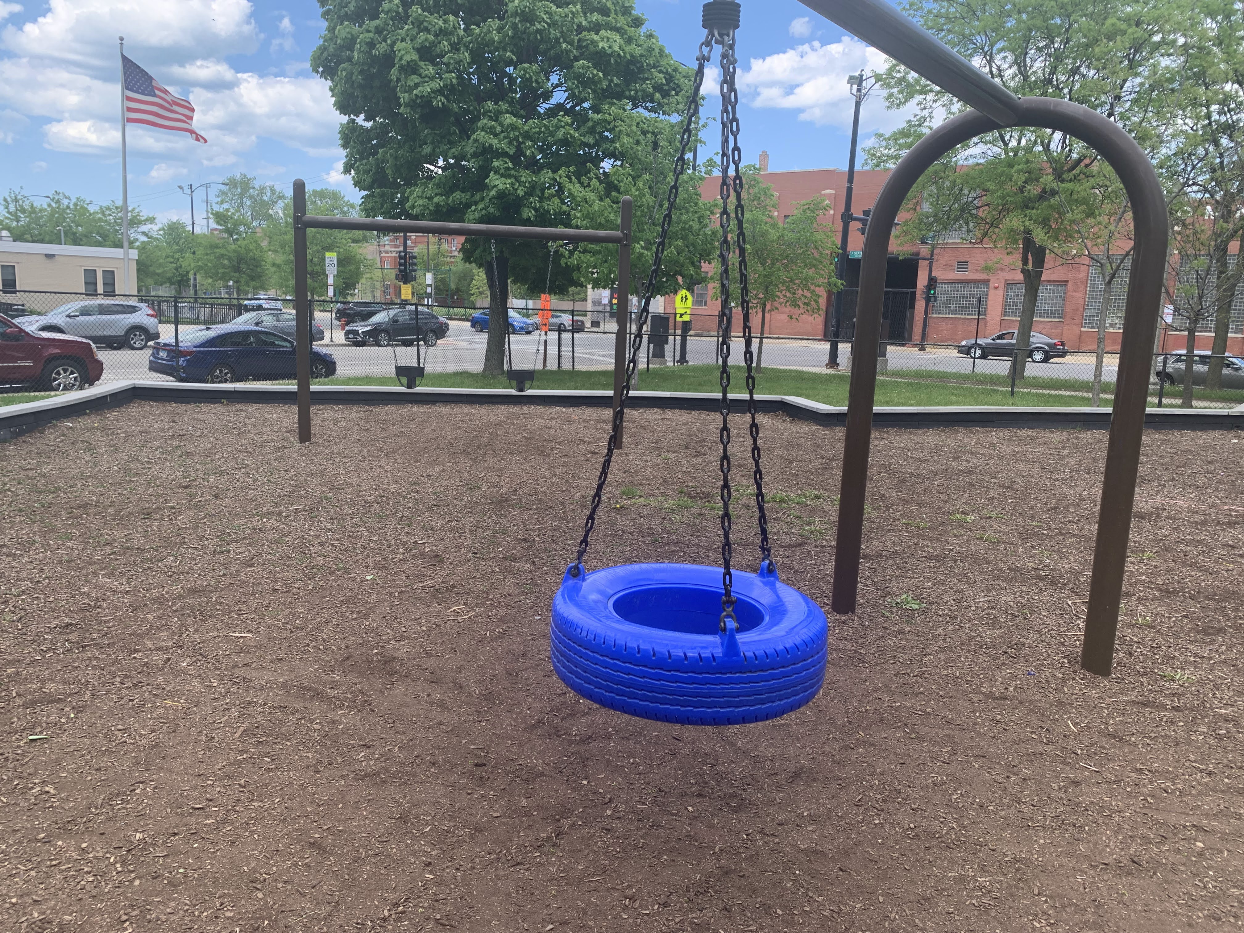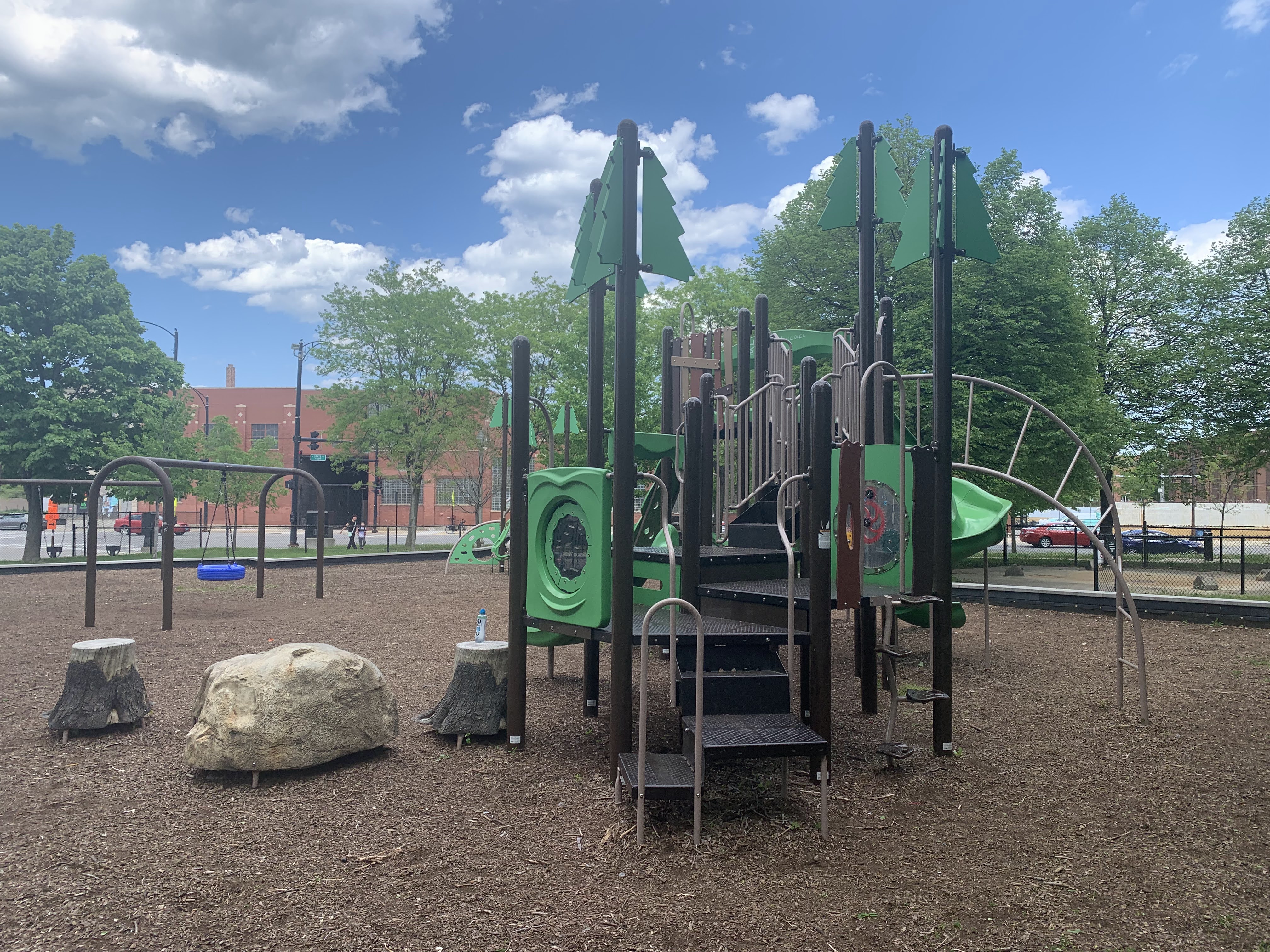 - The playground of Metcalfe Park is on the north side of the park and features a variety of swings and two play structures. The swings - toddler, adaptive with a harness, belt seat, and a tire swing - are solid offerings and the structures both include a number of slides and unique climbing elements. There is also a small 'four sprayer' water spray feature at this park near the playground. The play area isn't fully enclosed but it is fenced from the street. There are a few benches near the playground and the main surface is wood chips.