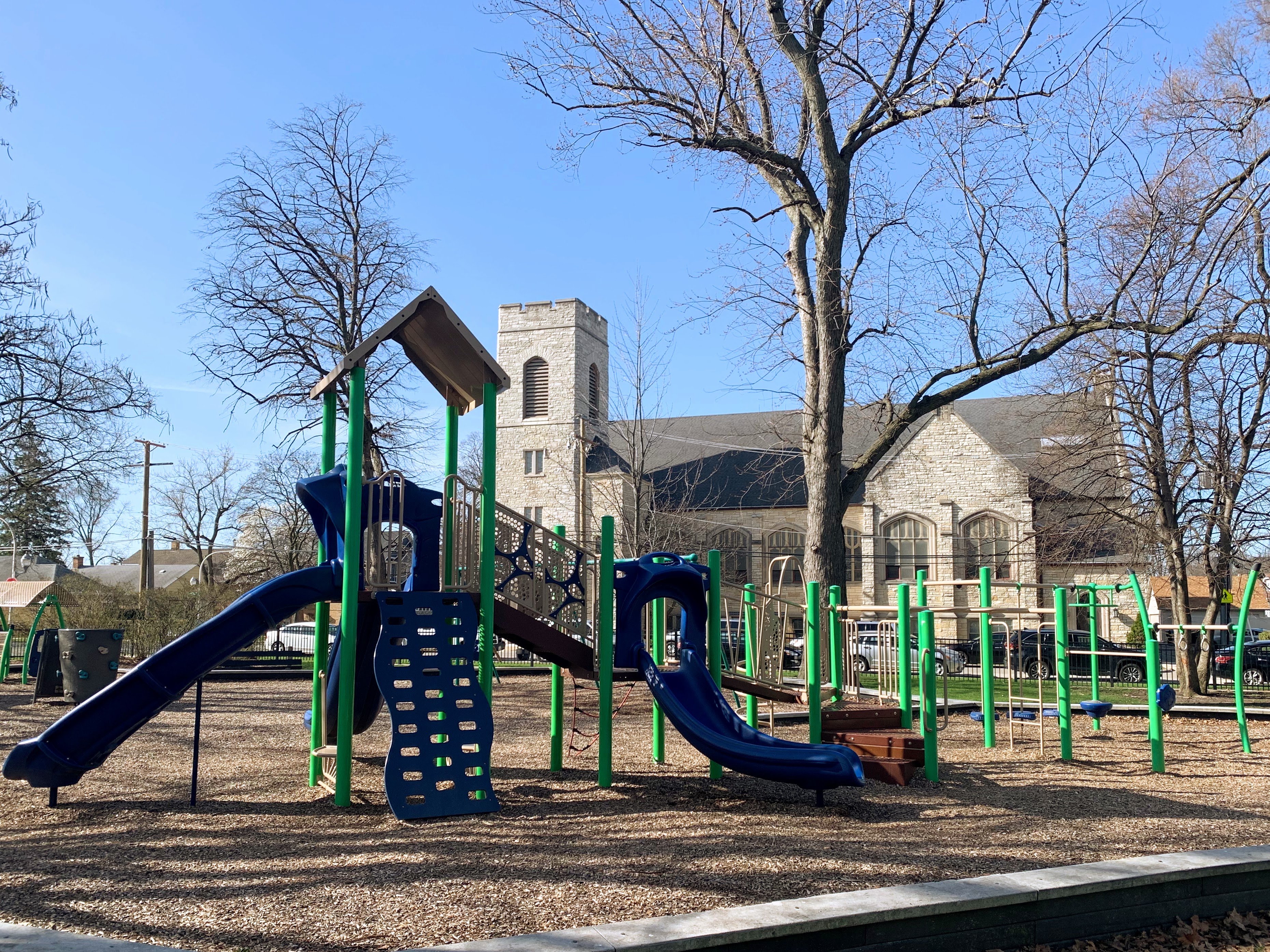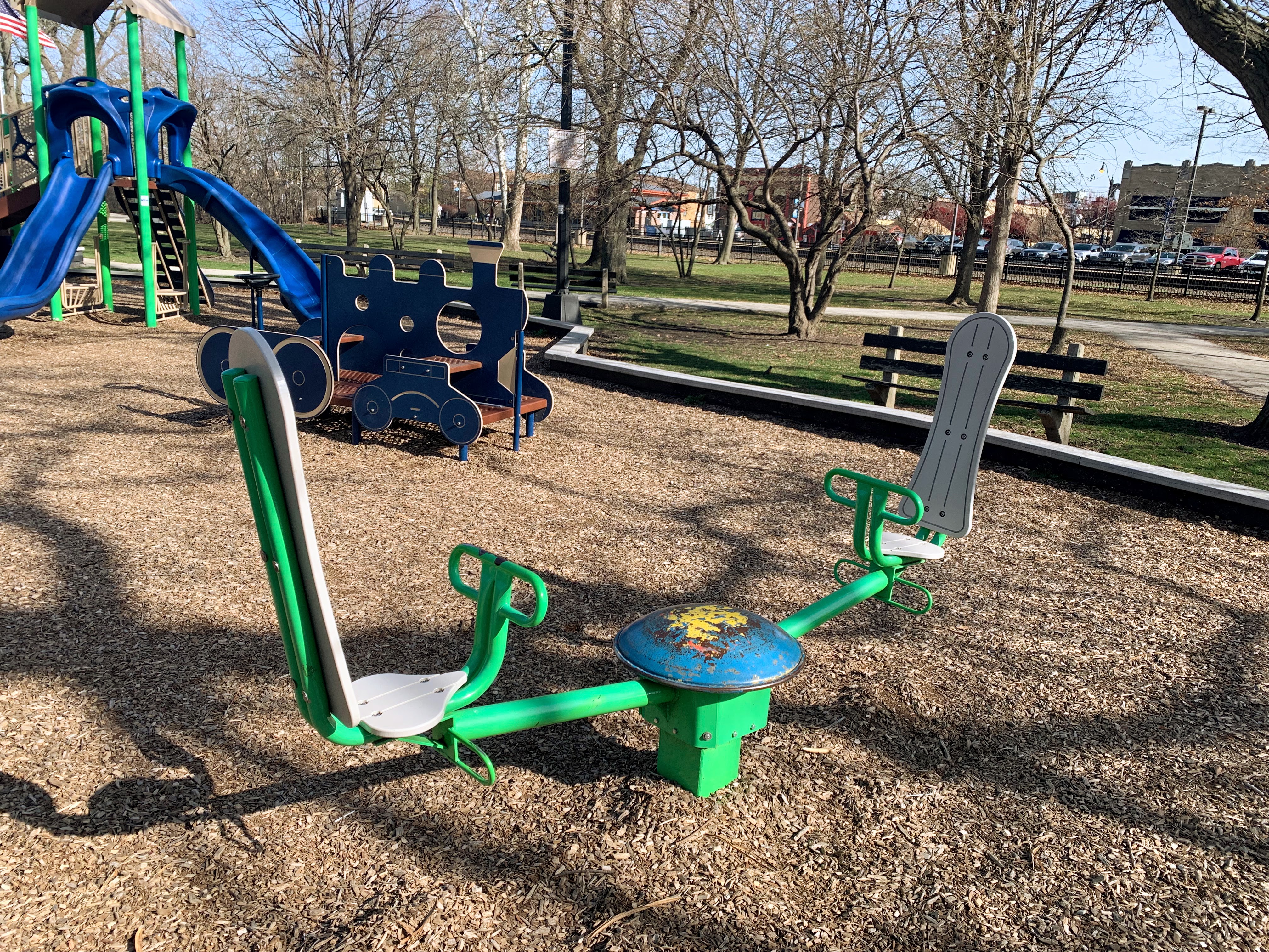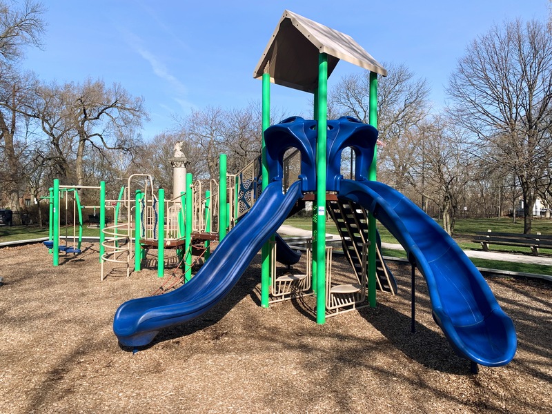 - Monument Park is a small neighborhood park with a playground featuring decent shade trees and wood chips underfoot. Standard playground equipment with a train play structure suitable for the location adjacent to the Metra tracks. The play area is fenced but not fully enclosed and there are a few benches for seating.