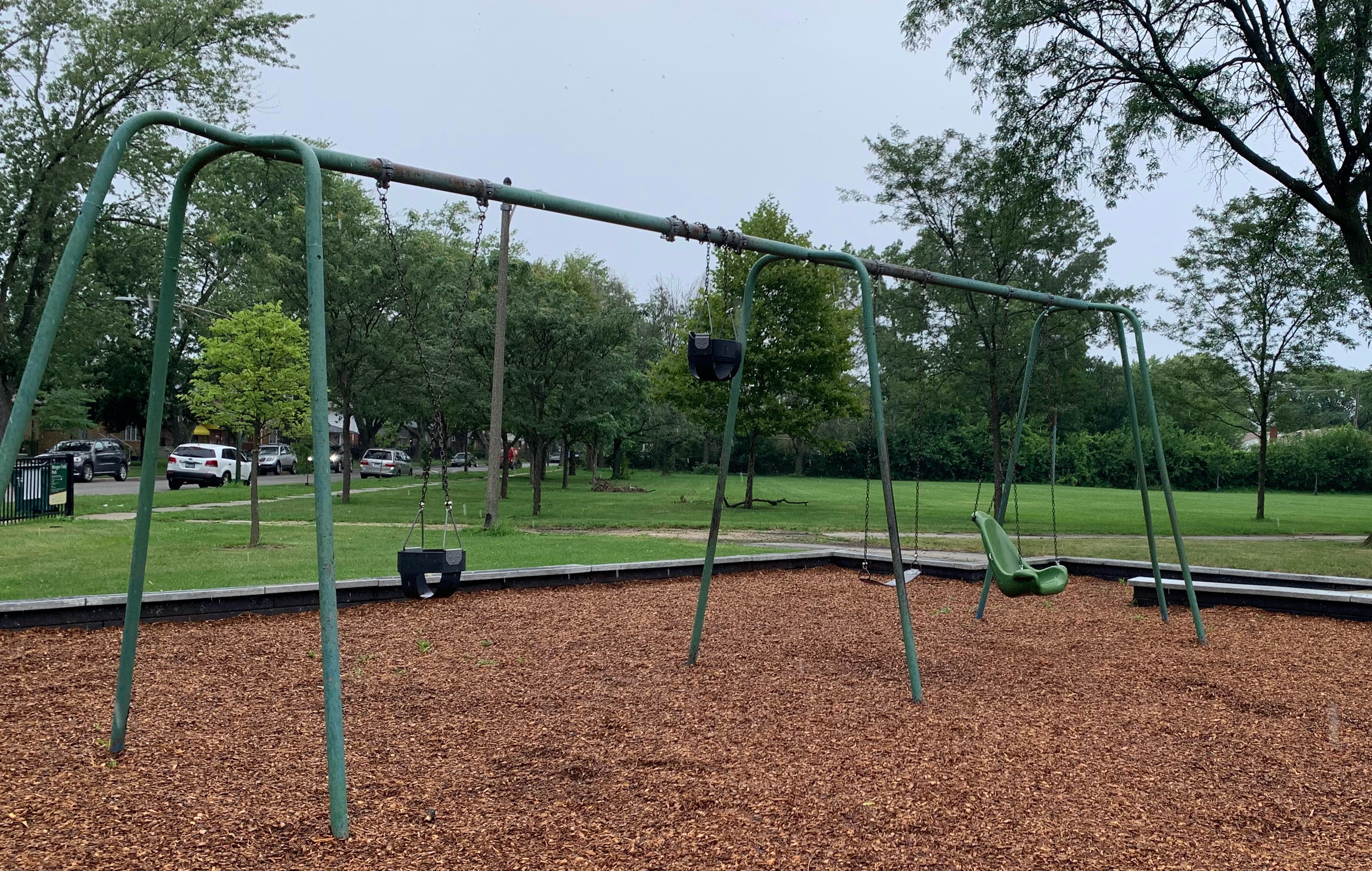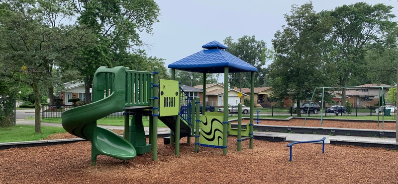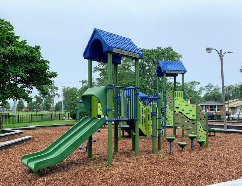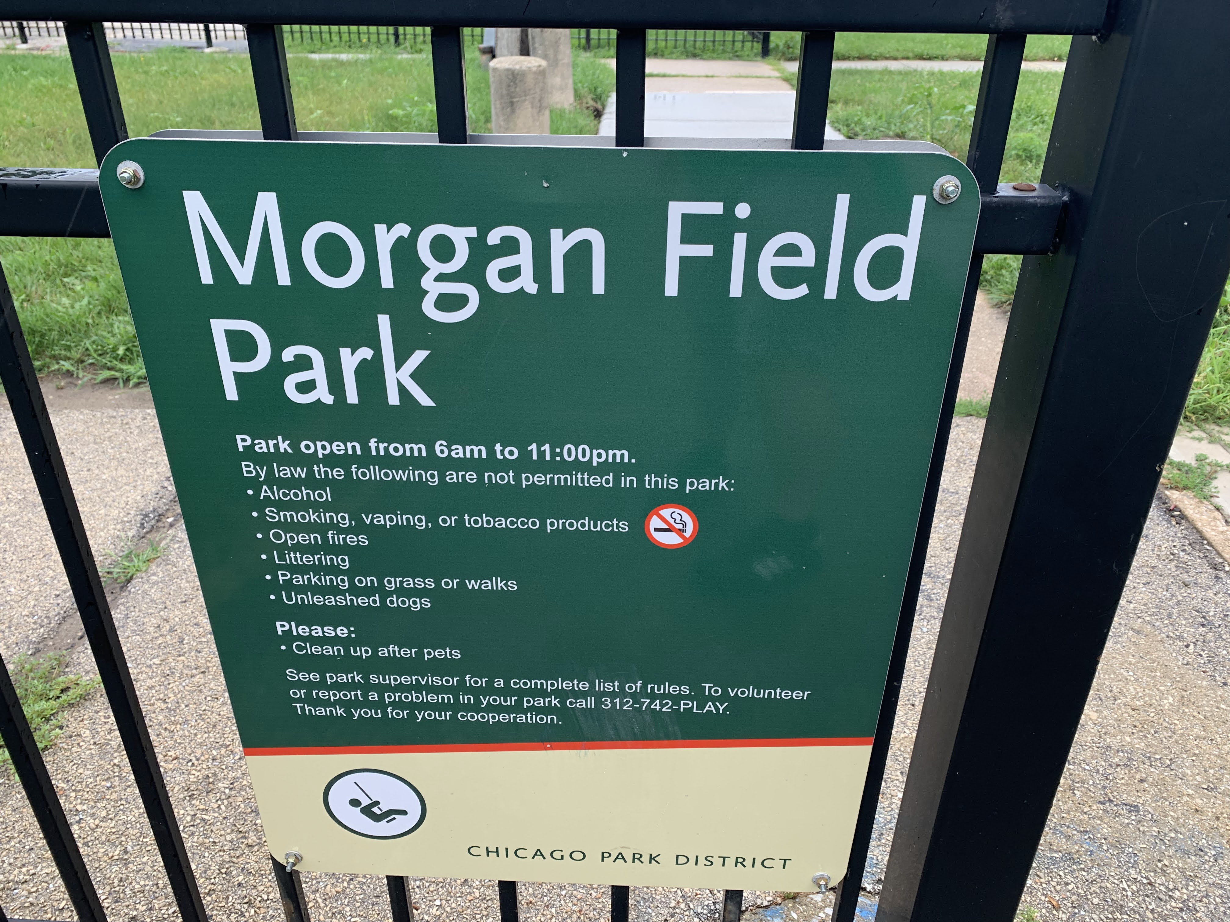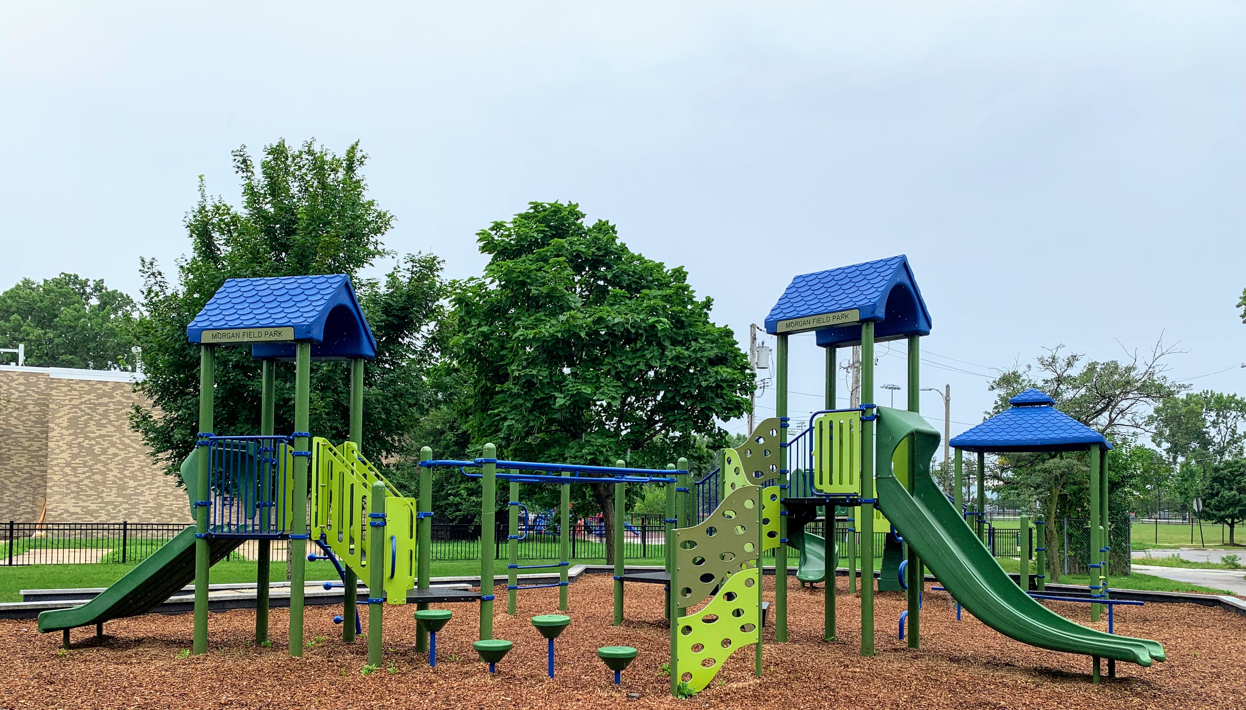 - The playground at Morgan Field Park is a basic and traditional playground. I don't mean that as an insult but merely as descriptive. This playground has the essential elements - large play structure with slides, various climbing elements, monkey bars, standard Park District swings - without much else. Set in the middle of a small field and surrounded by grass, and with wood chips as the main play surface, this playground is a standard neighborhood playground.