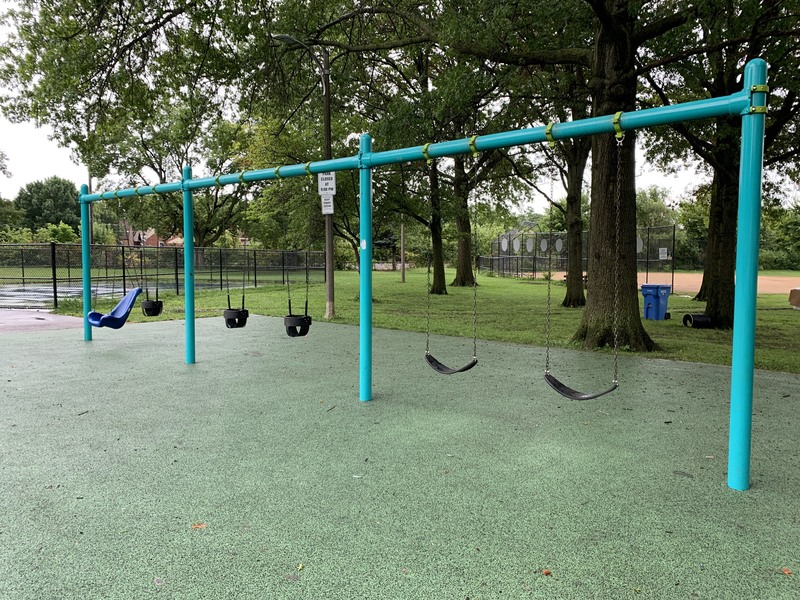 The play surface is soft rubber and there are a few benches and a drinking fountain in the area. The play area opens to the rest of the park but is fenced and fully enclosed from the street. Some trees to the south provide some shade and the park fieldhouse provides access to bathrooms (when open). All in all, this is a good neighborhood playground. - Playground Features