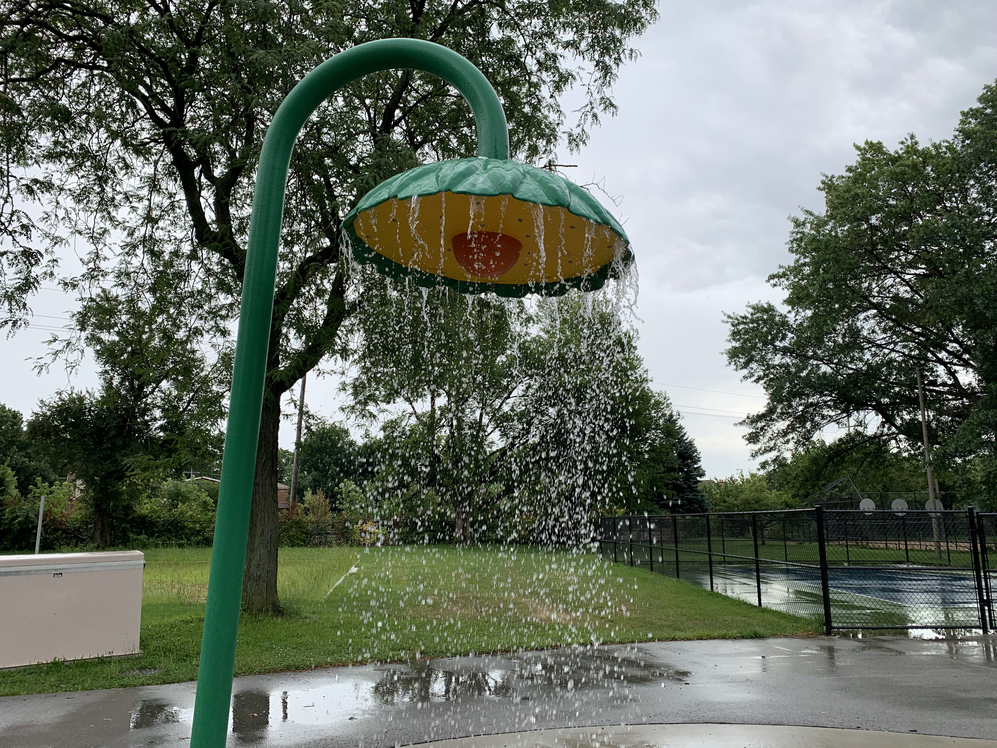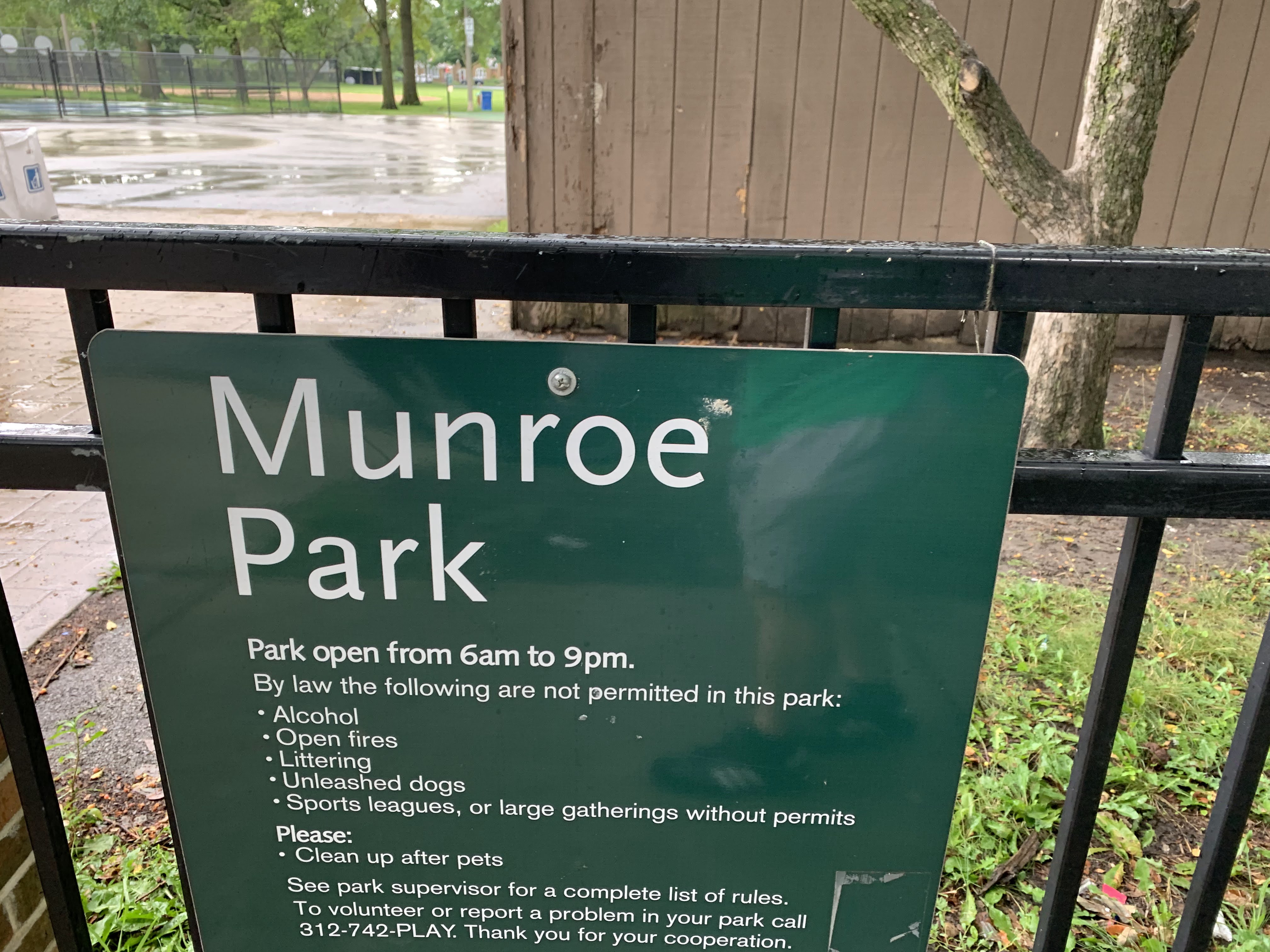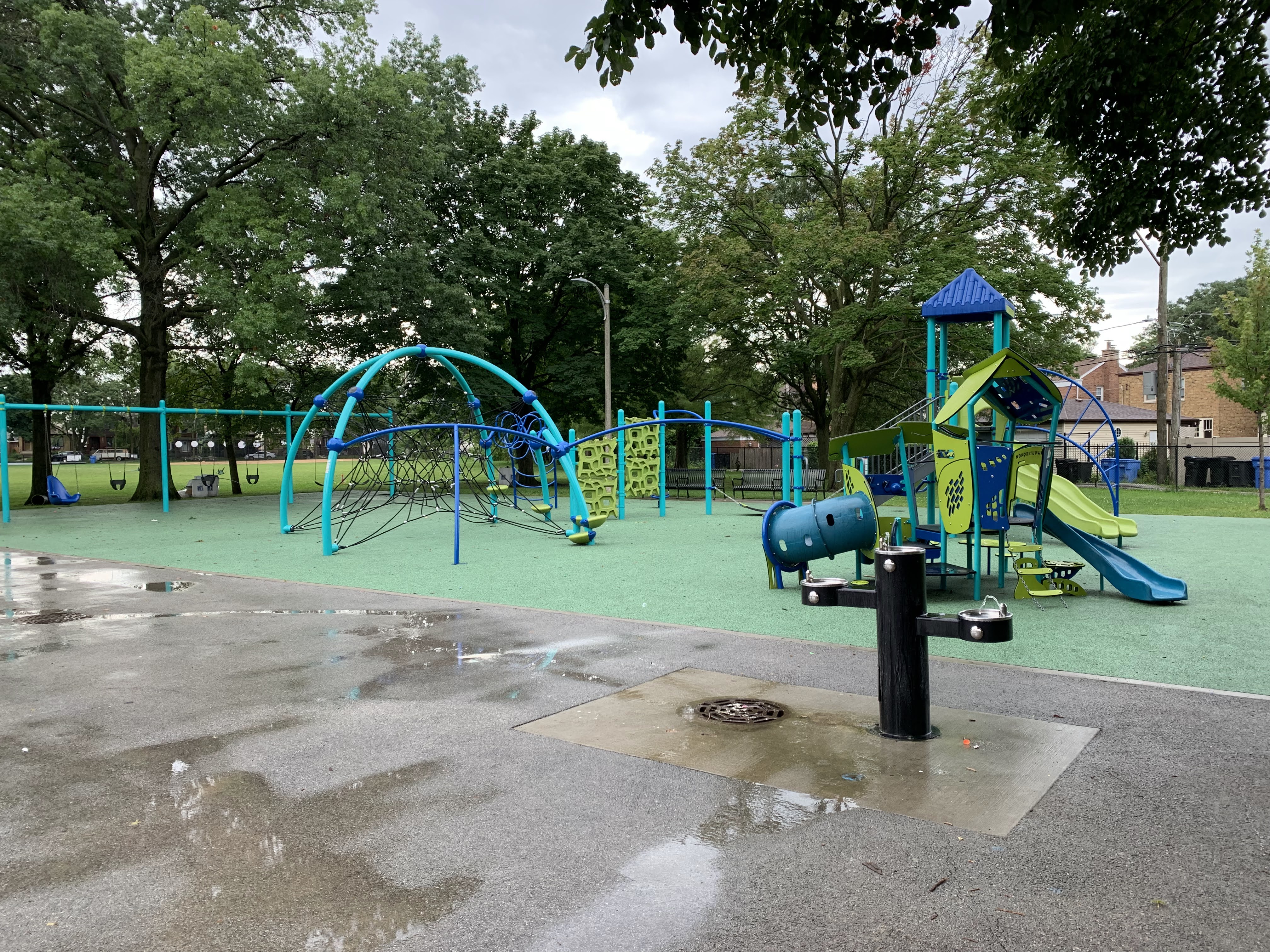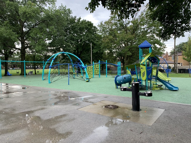 The playground at Munroe Park features a small structure for younger children, a larger collection of elements for older children , the standard set of Chicago Park swings, and a small water spray feature. The collection of elements for older children features a rope net climbing element, geometric climbing walls, and other metal climbing elements.