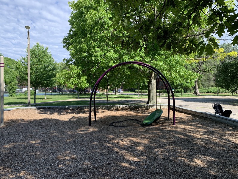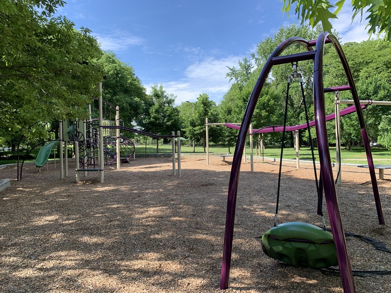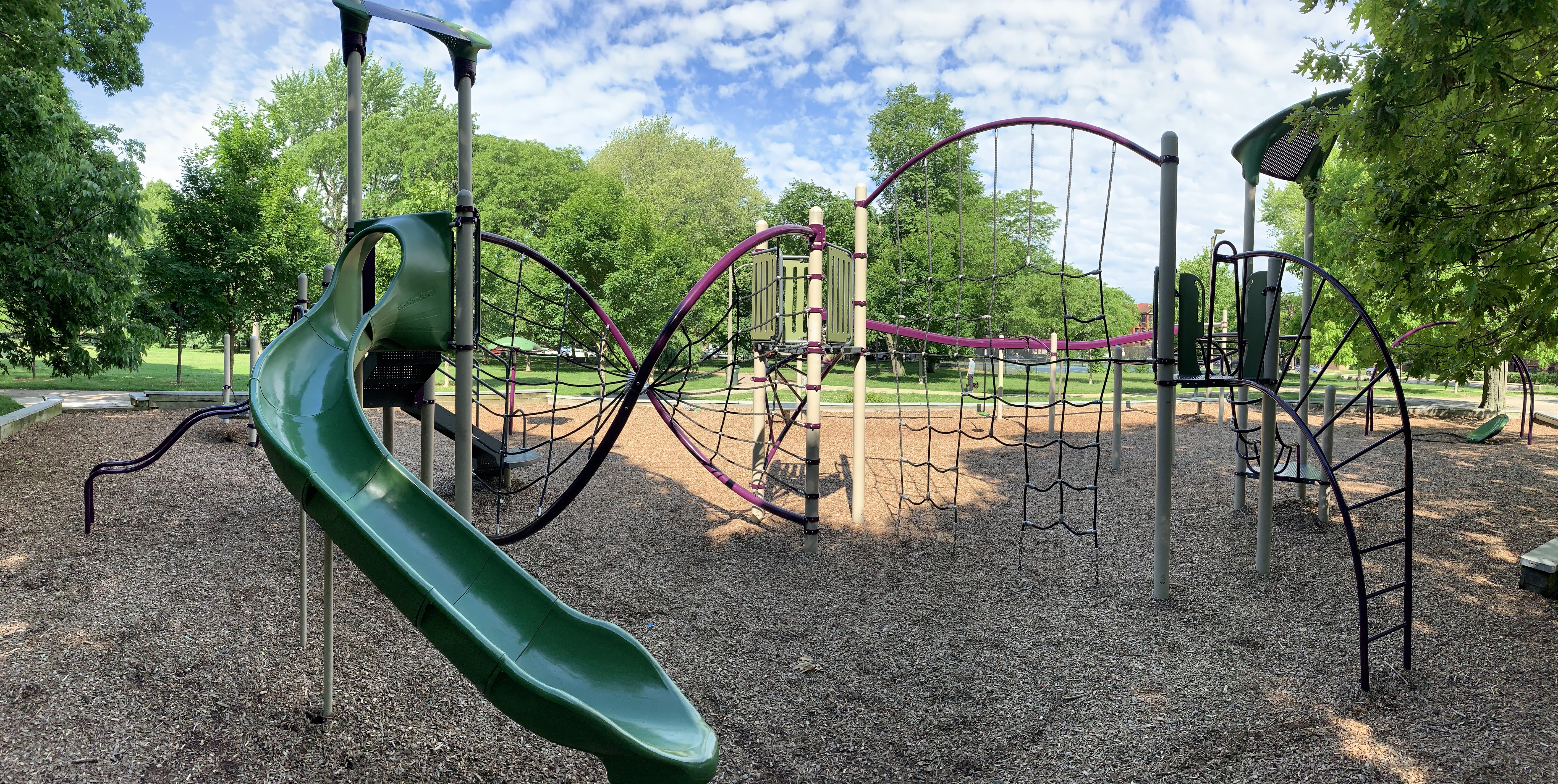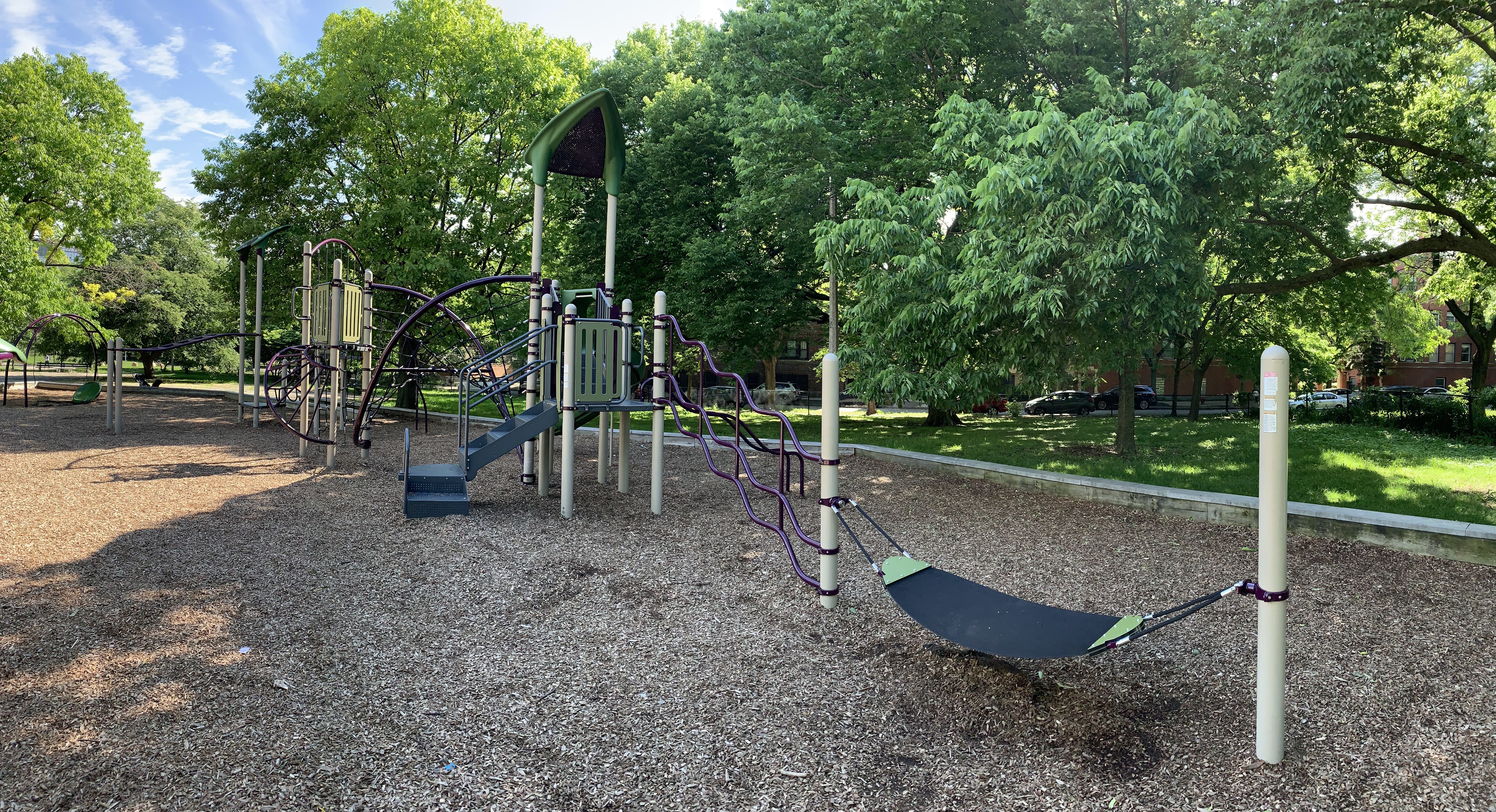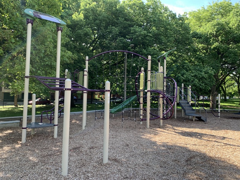 - This playground - one of two in Nichols Park - is located on the east side of the park and seems designed for older children. Rather than a traditional play structure, this playground is a collection of various climbing and traversing elements as well as a few standalone elements (including a zipline!). The playground is fenced from the street but is not fully enclosed and instead opens directly into the park. Although there aren't benches of picnic tables, the low perimeter wall provides some seating. Large trees provide some shade to the area and the play surface is wood chips.