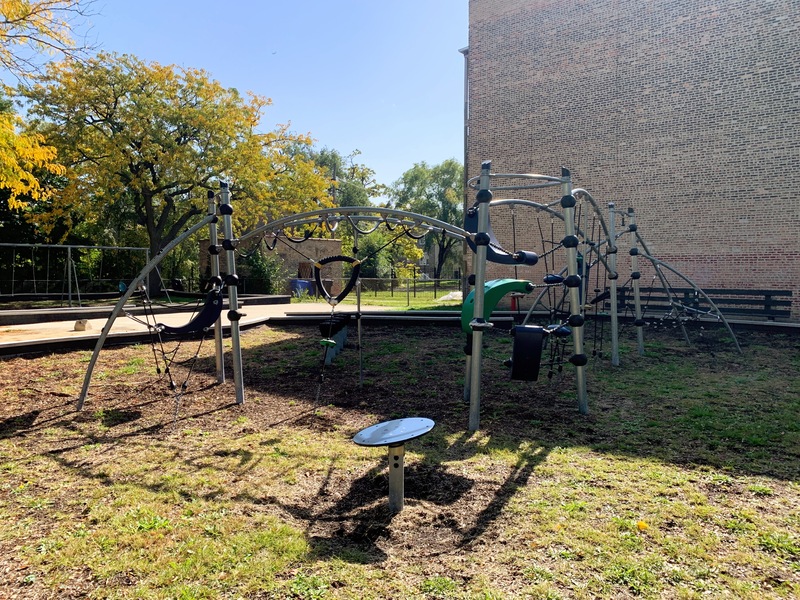 The non-play amenities are basic: a few benches and a play surface of wood chips for a bright and sunny site. - Playground Equipment