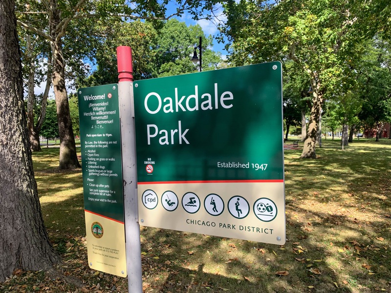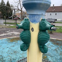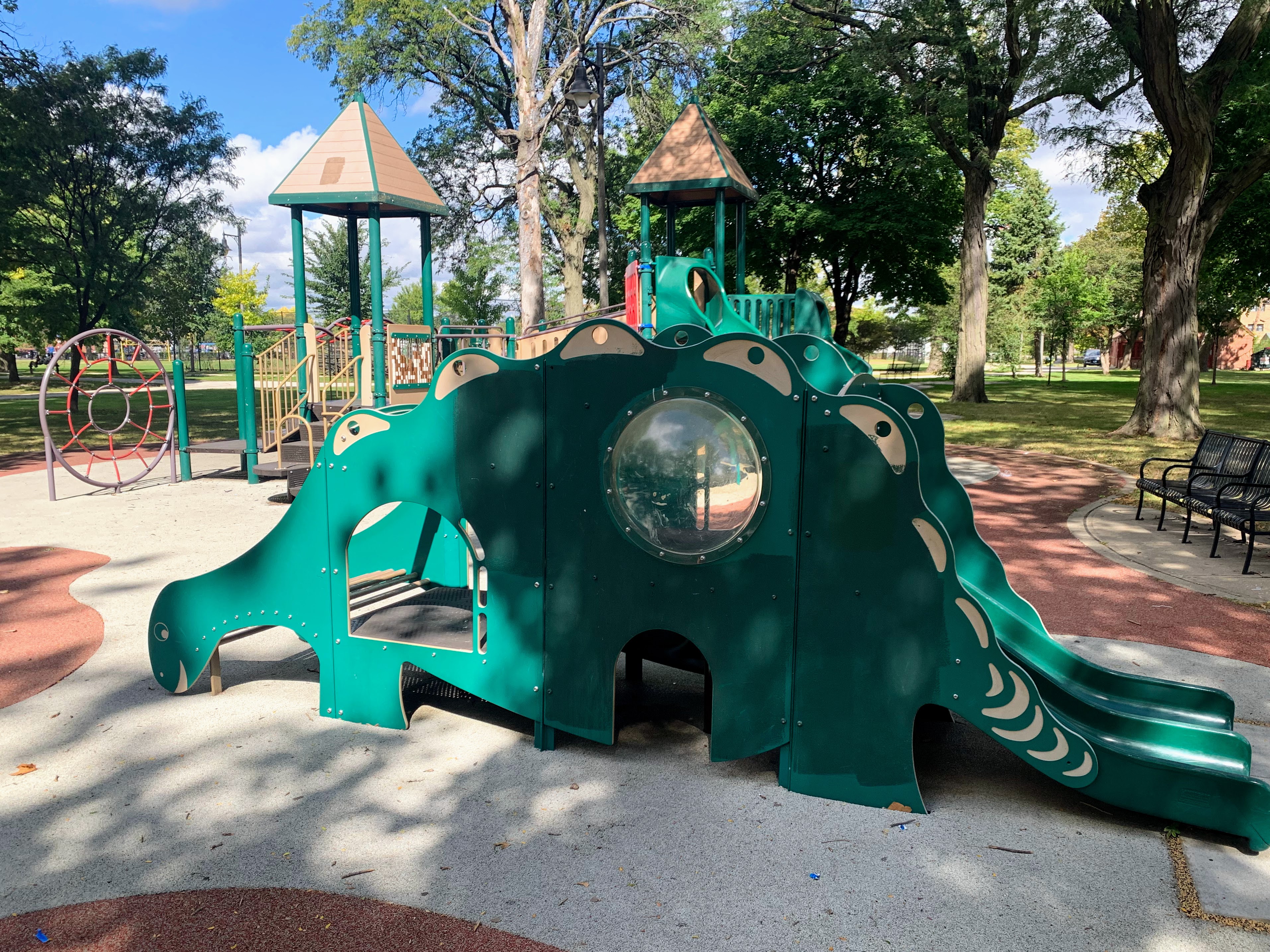 The playground at Oakdale Park is a gem and shows how combining equipment, amenities, and nature makes for a great playground experience. The playground equipment is solid but not vastly different from other playgrounds; there is a moderate play structure with slides and climbing elements, a smaller 'play dinosaur' designed for younger children, and a set of swings (toddler and belt seat). There is a small water spray feature a little ways away as well.