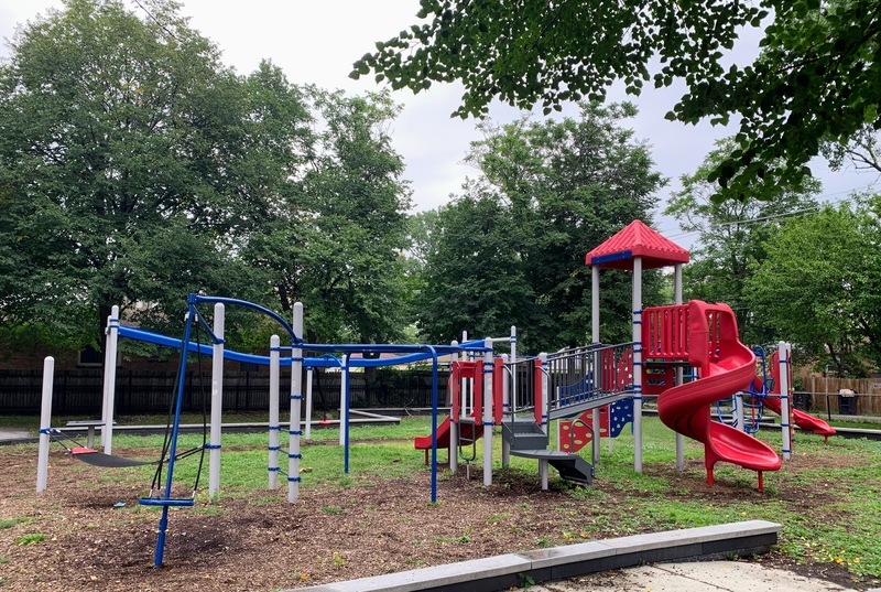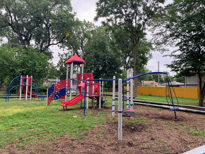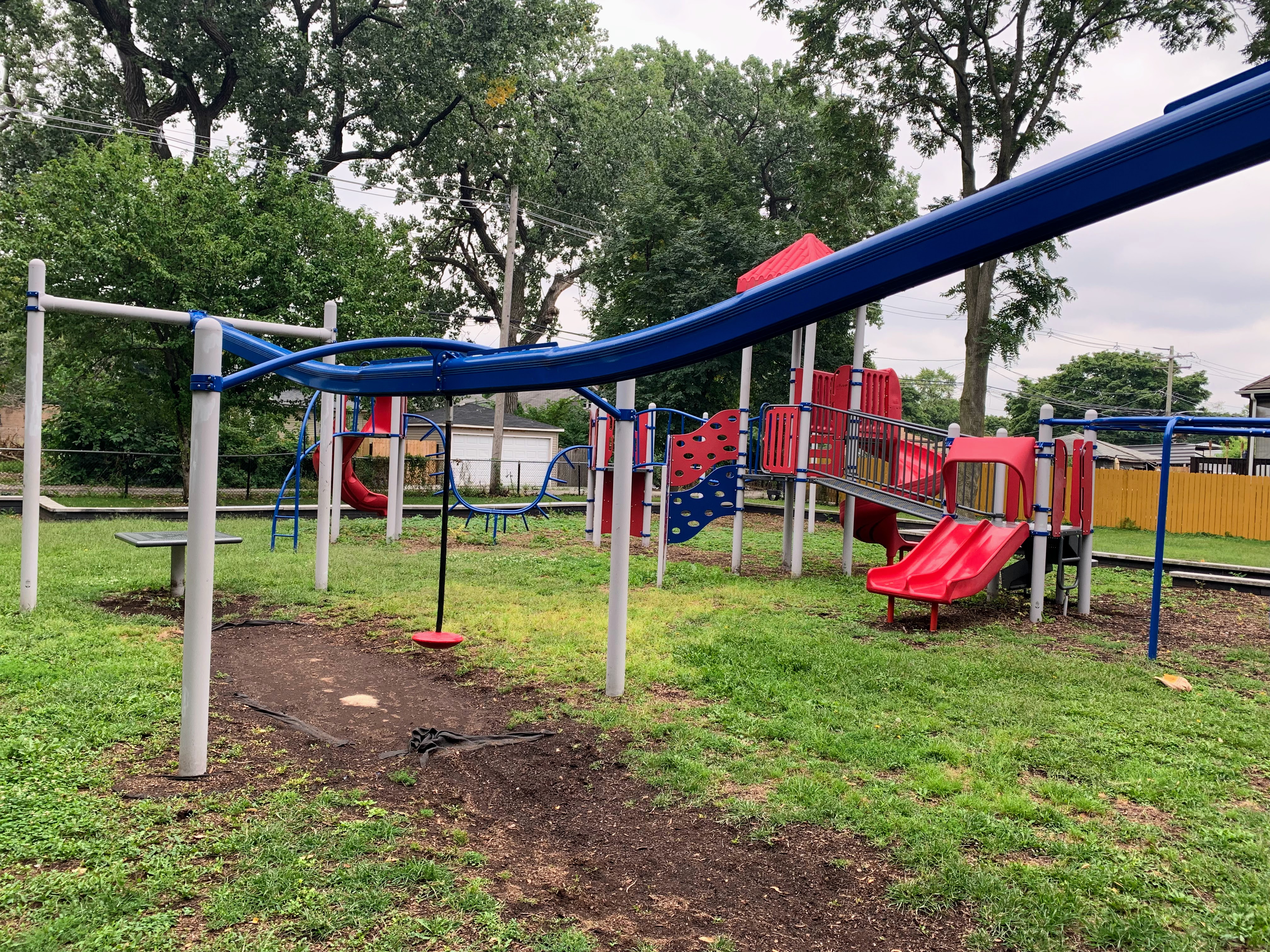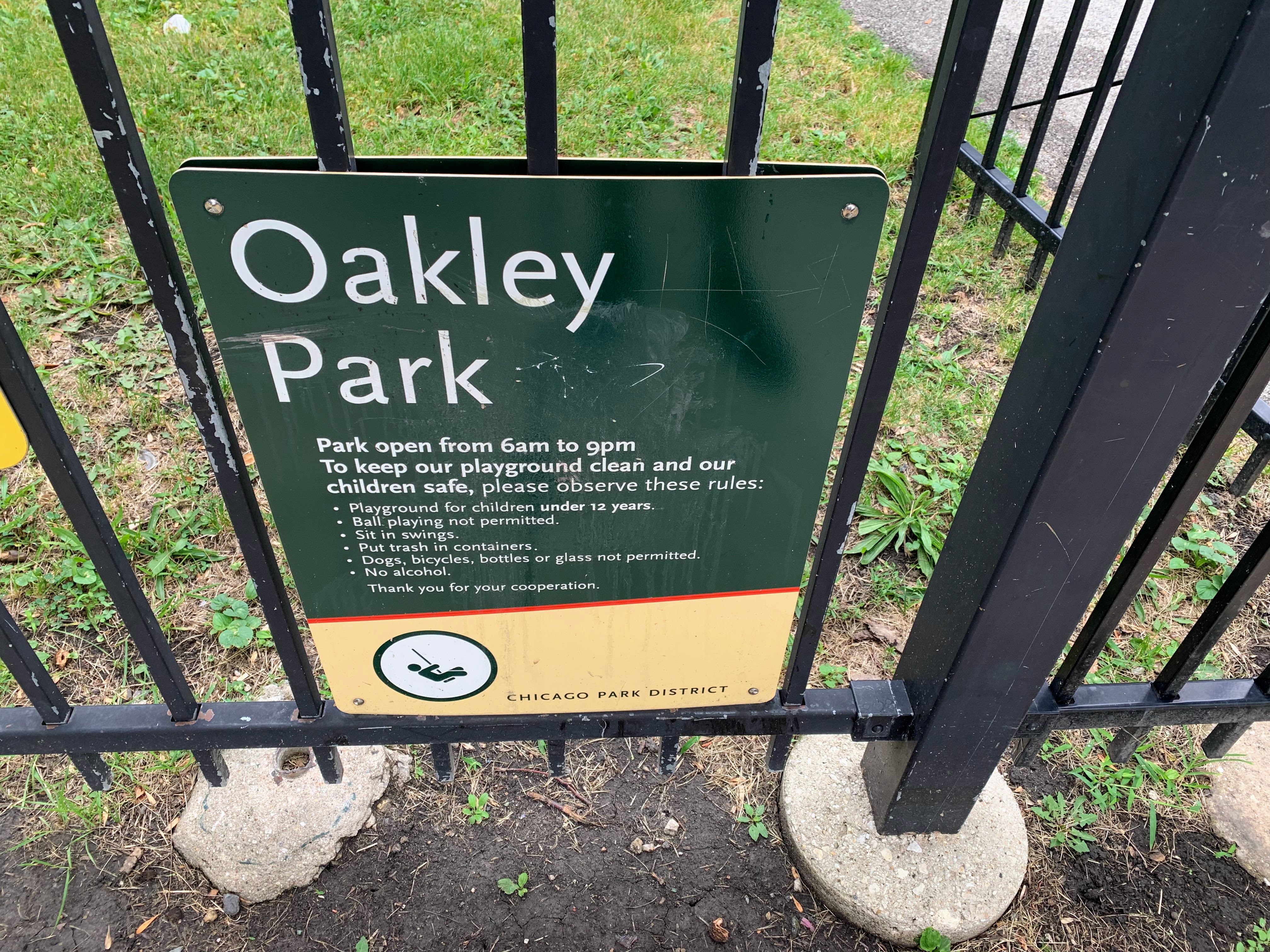 - Oakley Park features a classic and yet timeless playground. The equipment is new and well-maintained with a sprawling play structure, two sets of swings, and zip line. The play surface is wood chips and there are a few benches around the perimeter of the park. The play area is fully enclosed and shaded by large trees. It's a classic playground.