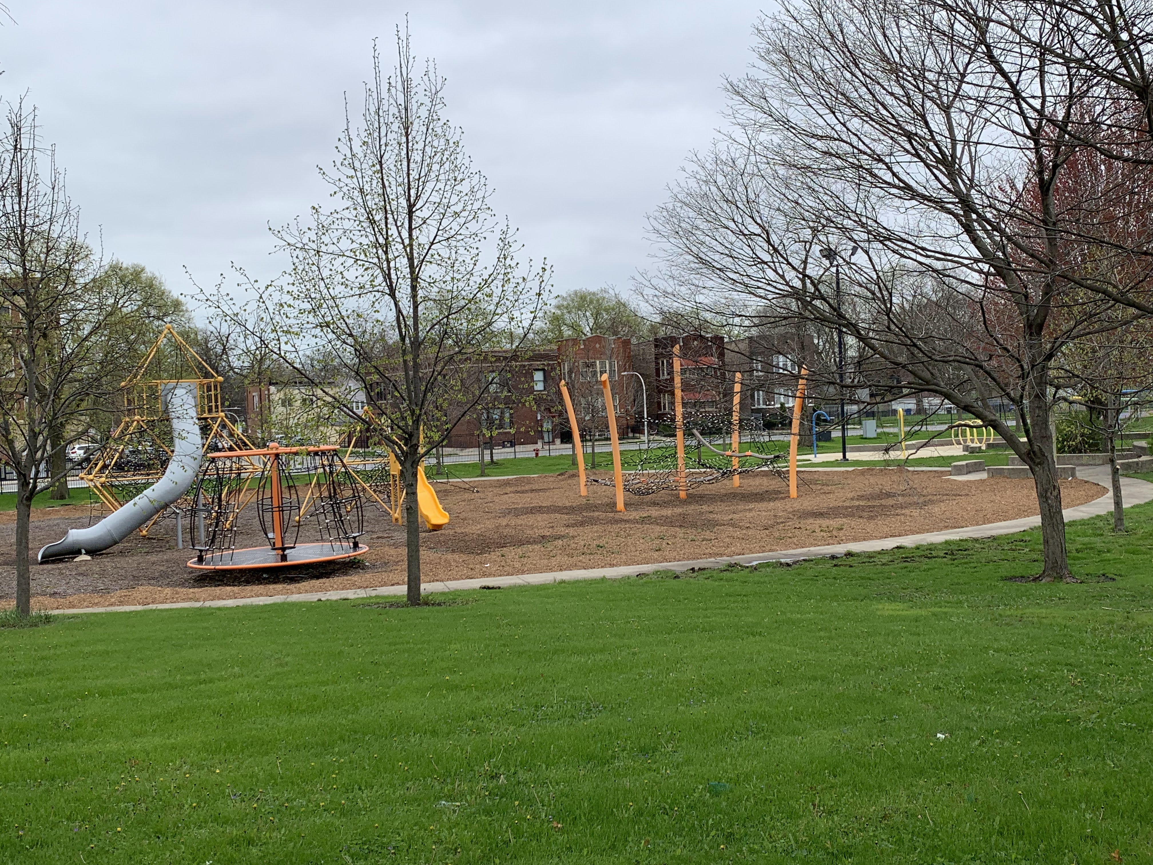 "In 1998, the Chicago Park District created a major regional playground in Ogden Park. One of the city's most exciting places for children, the Ogden Park playground includes assembly and stage areas, play equipment, an interactive water feature, and a canopied carousel." This - according to the Chicago Park District's website - helps explain the massive enclosed area on the east side of Ogden Park.