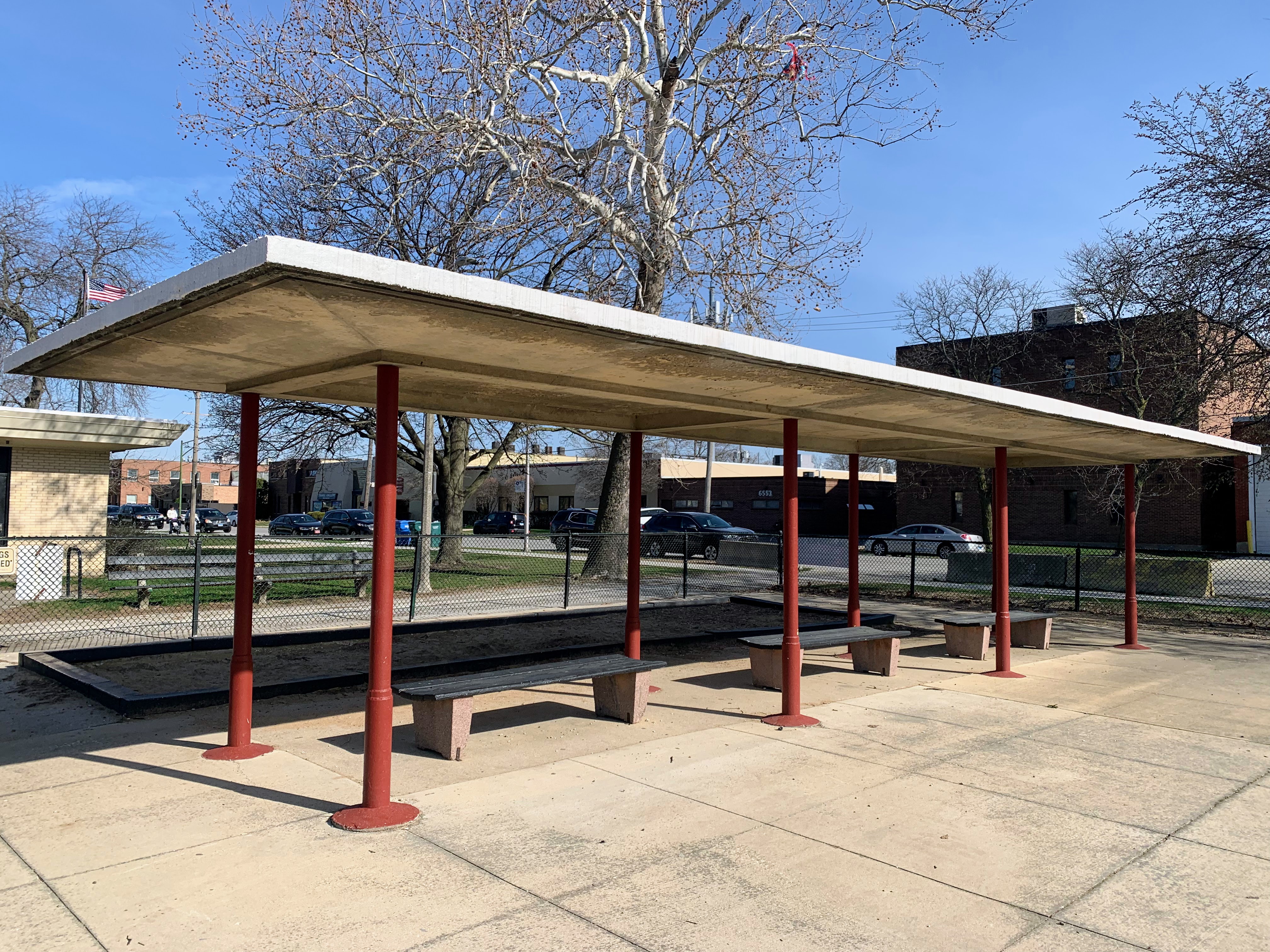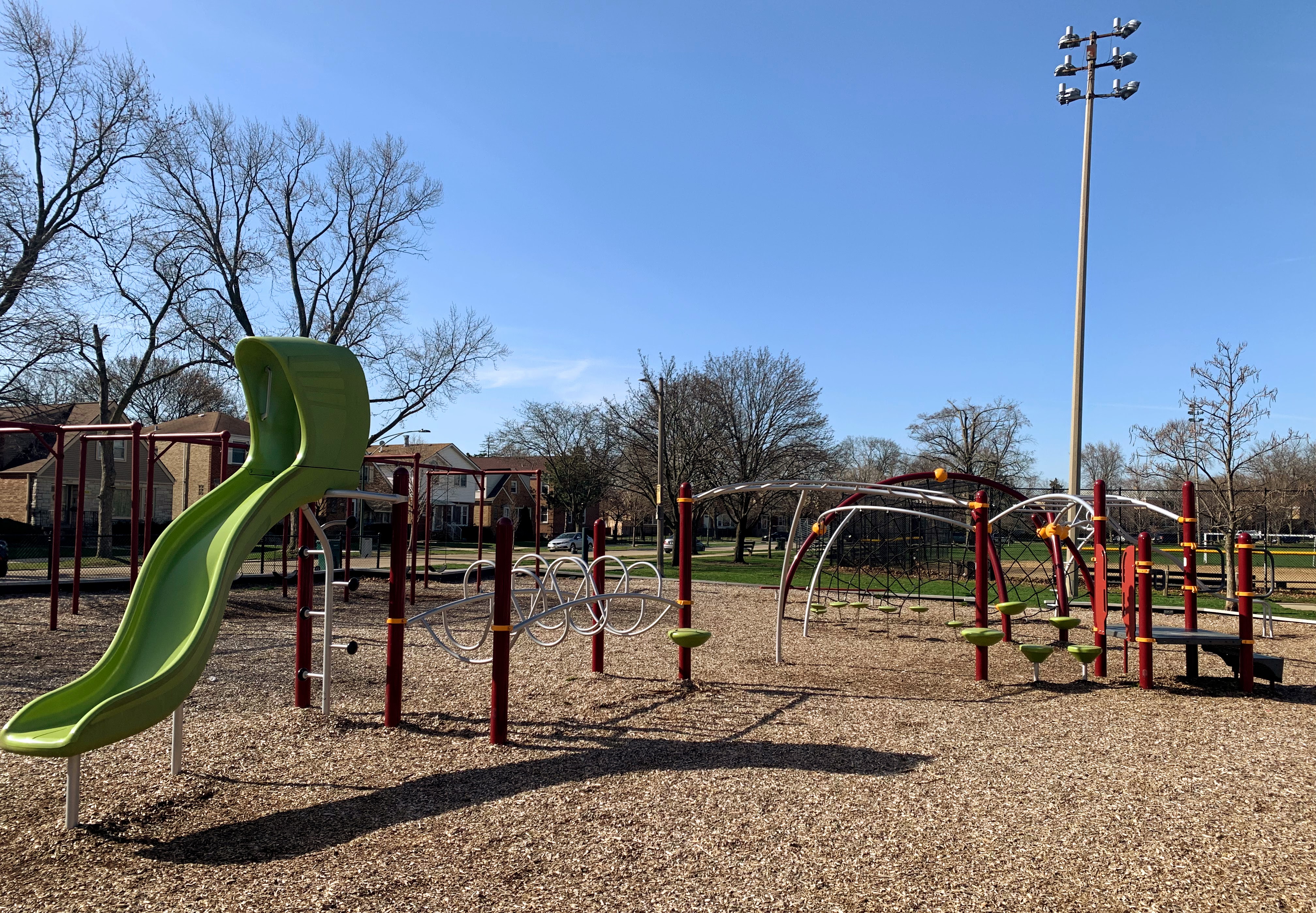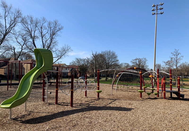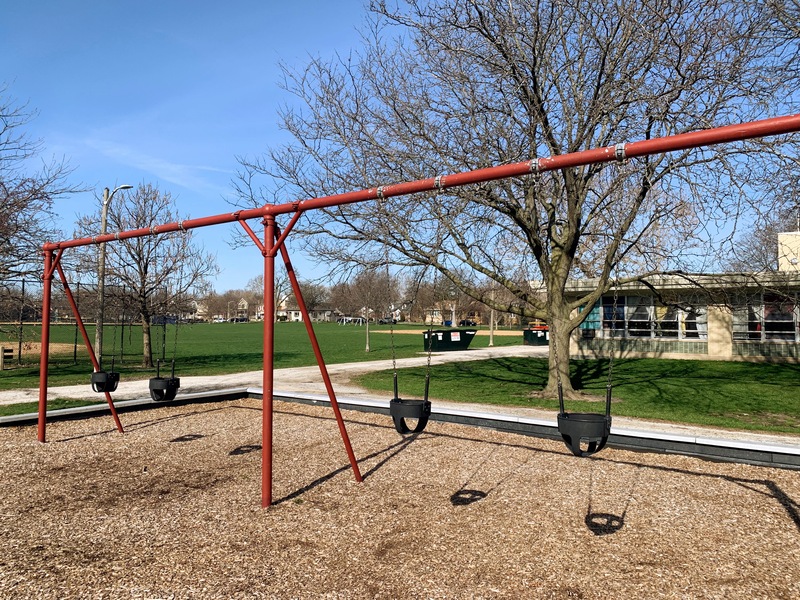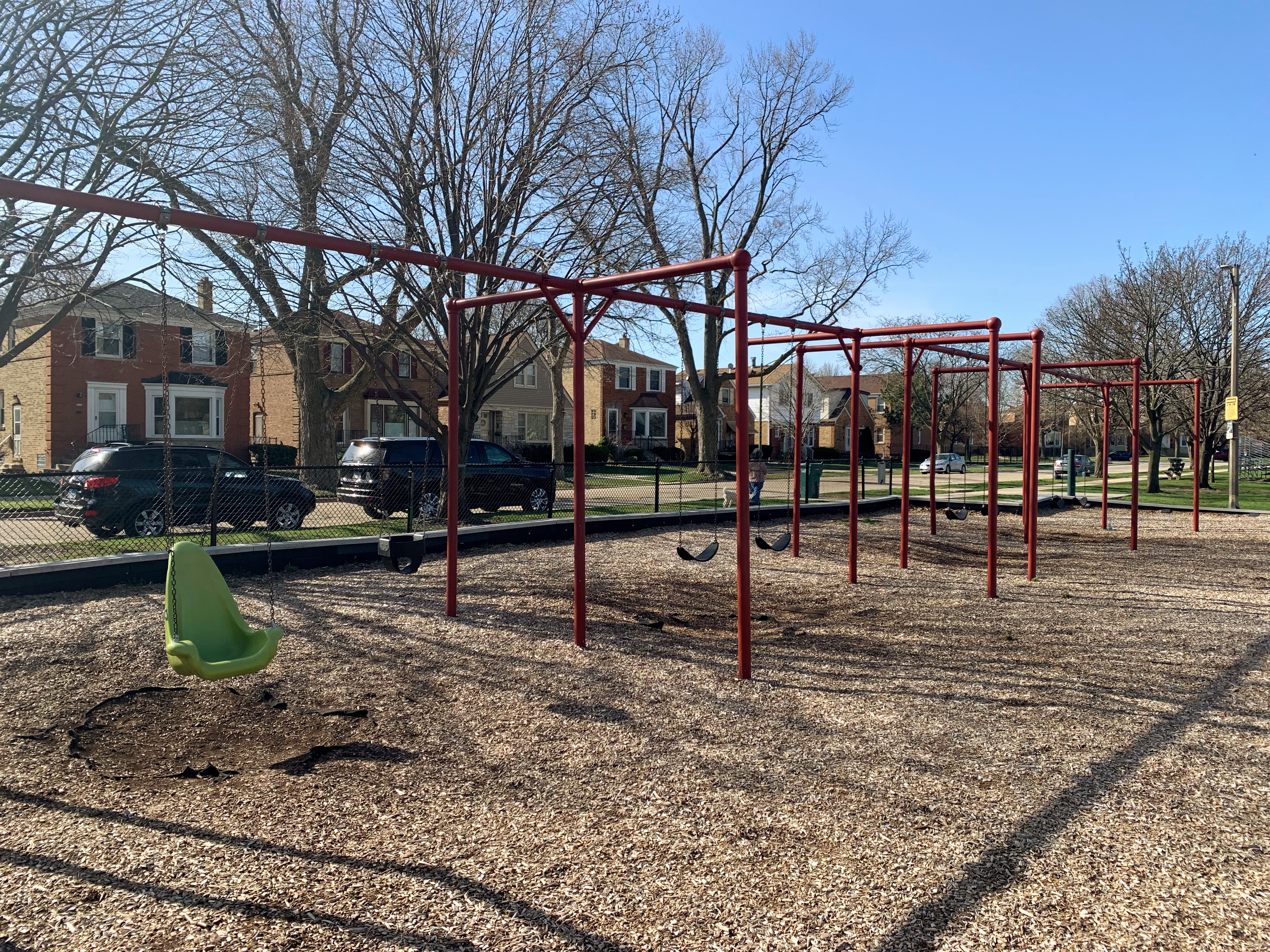 - This playground features a large, wood-chipped area and 16 (!) swings. This playground also features several standalone elements for older children (two different kinds of monkey bars, a few different slides, and a climbing net) and an area for younger children. This area is bright and sunny and has a water feature flanked by two shaded areas with benches.