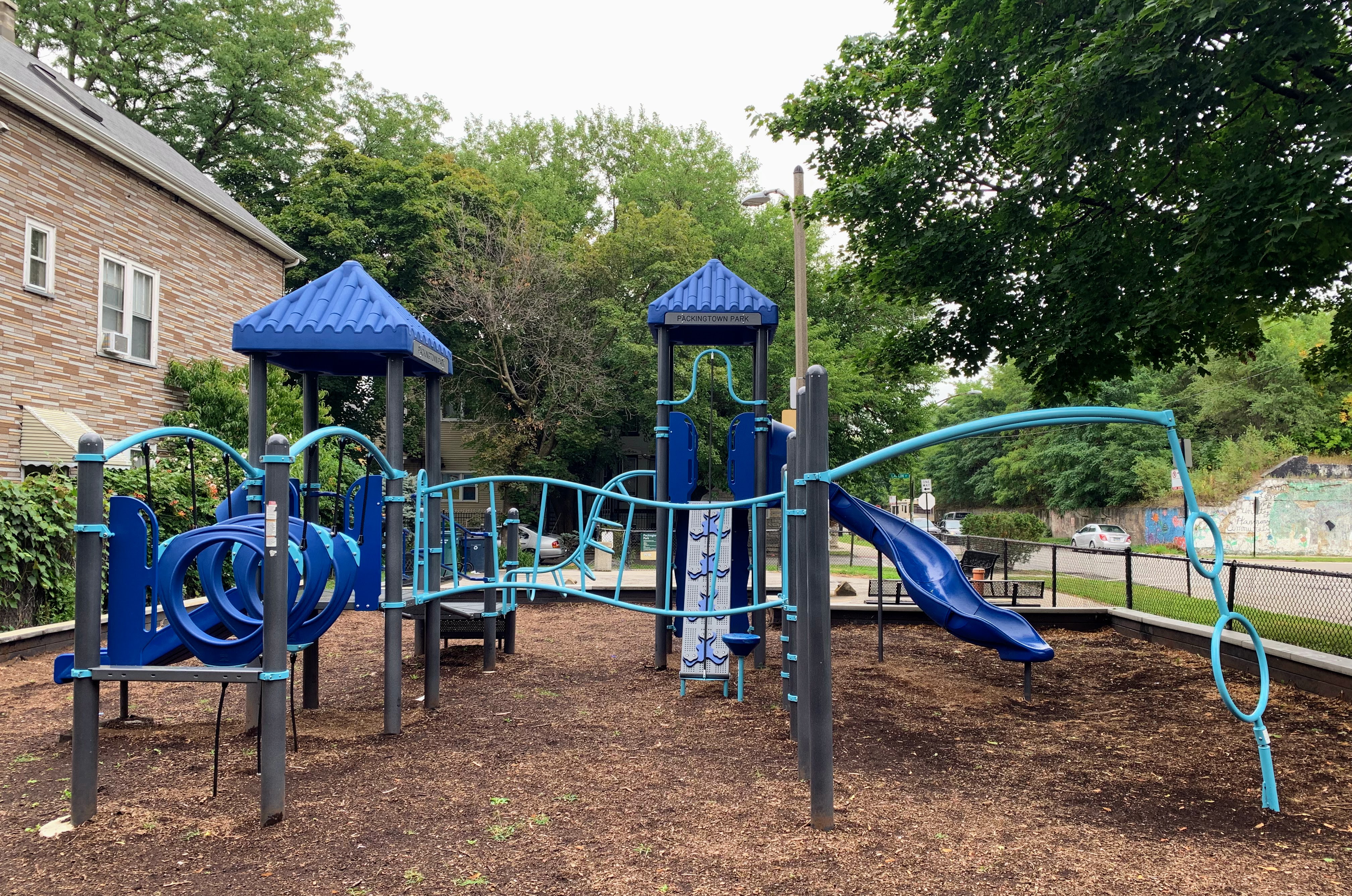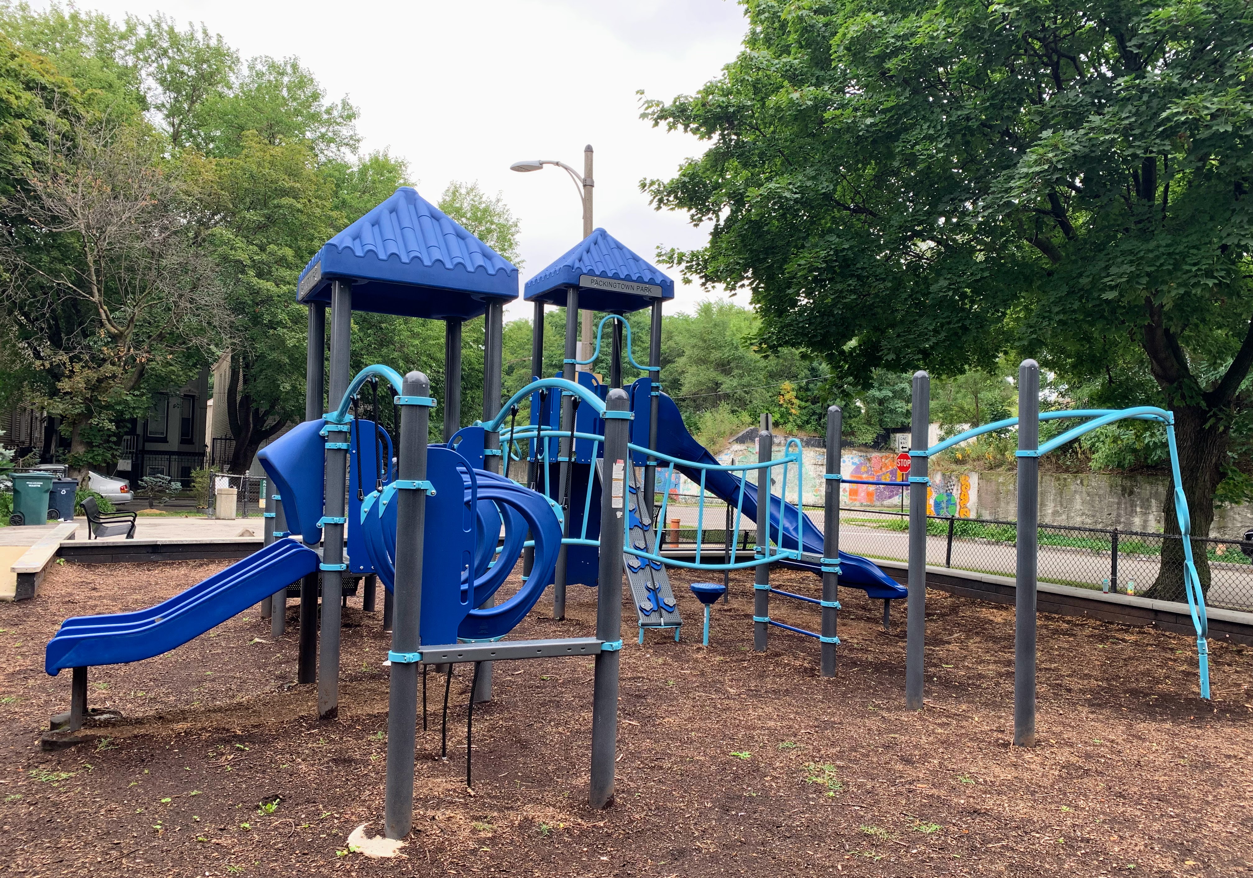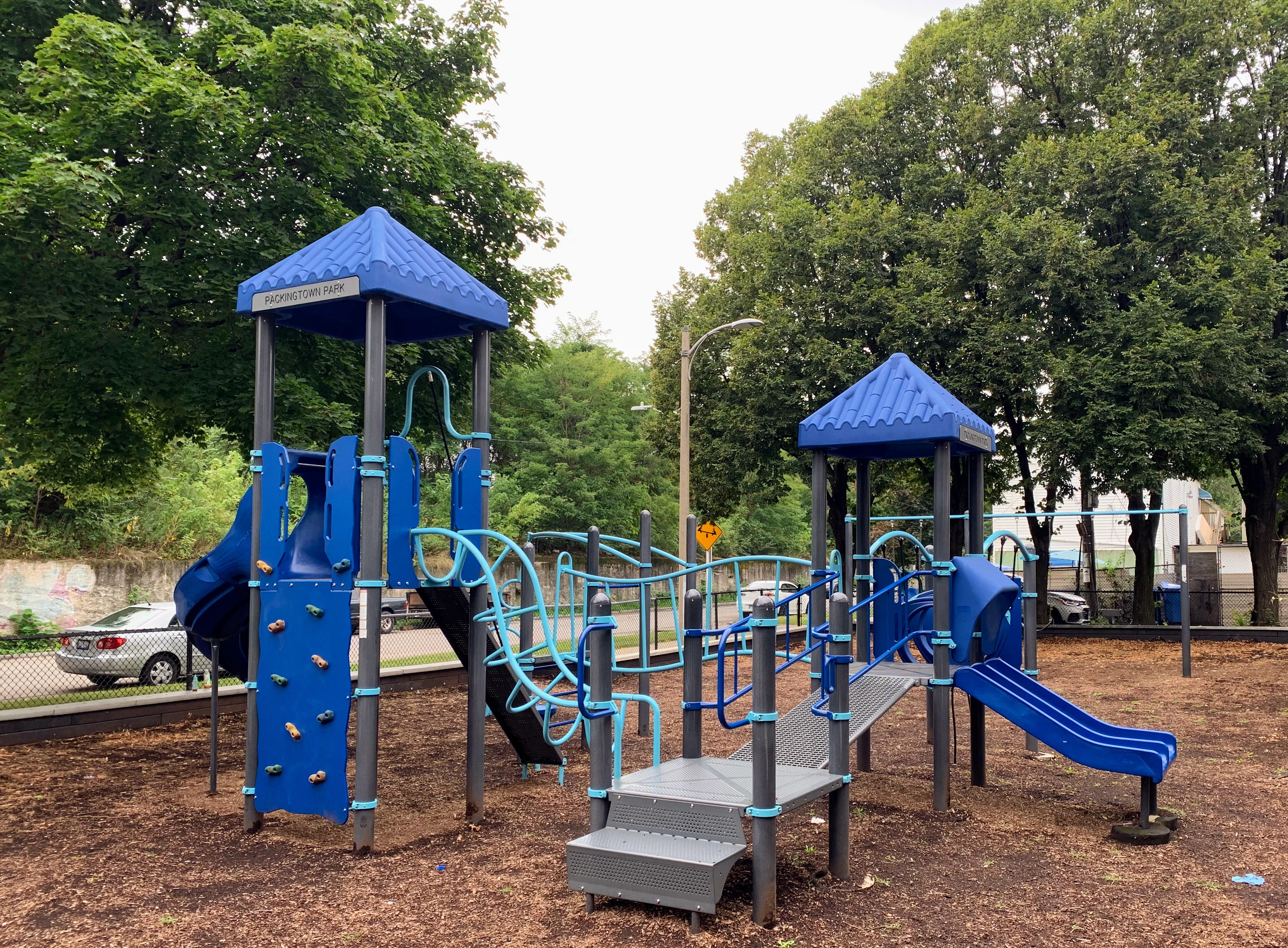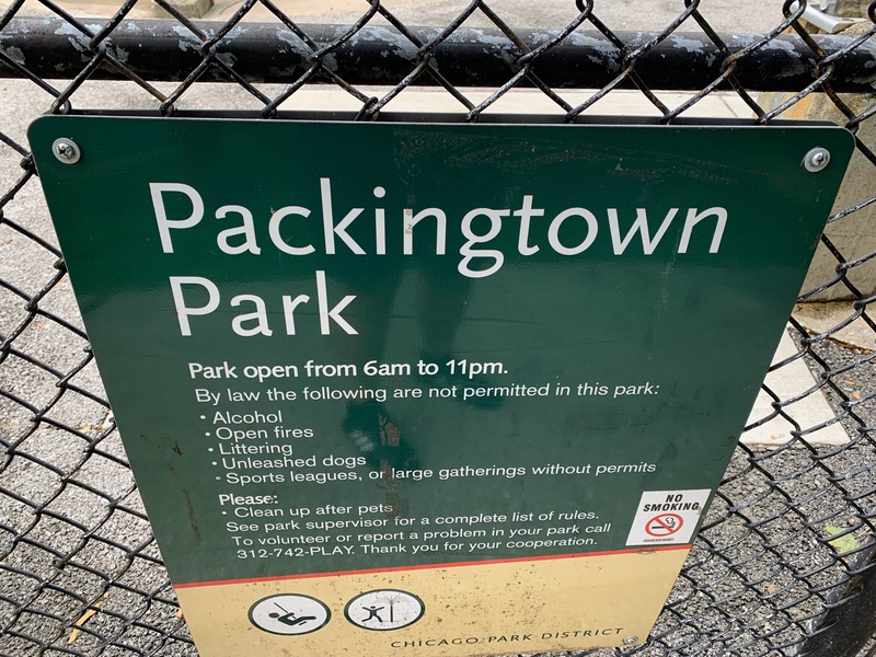 - The Packingtown Park playground packs a punch. This tiny neighborhood pocket park has a moderate sized play structure with a variety of equipment, a set of swings with the Chicago Park essentials (toddler, adaptive, and belt seat) and a small "four sprayer" water spray feature. The playground is fenced from the street but not fully enclosed and features the 'classic' playground amenities of benches, a drinking fountain, and a wood chip play surface. All in all, a solid neighborhood playground.