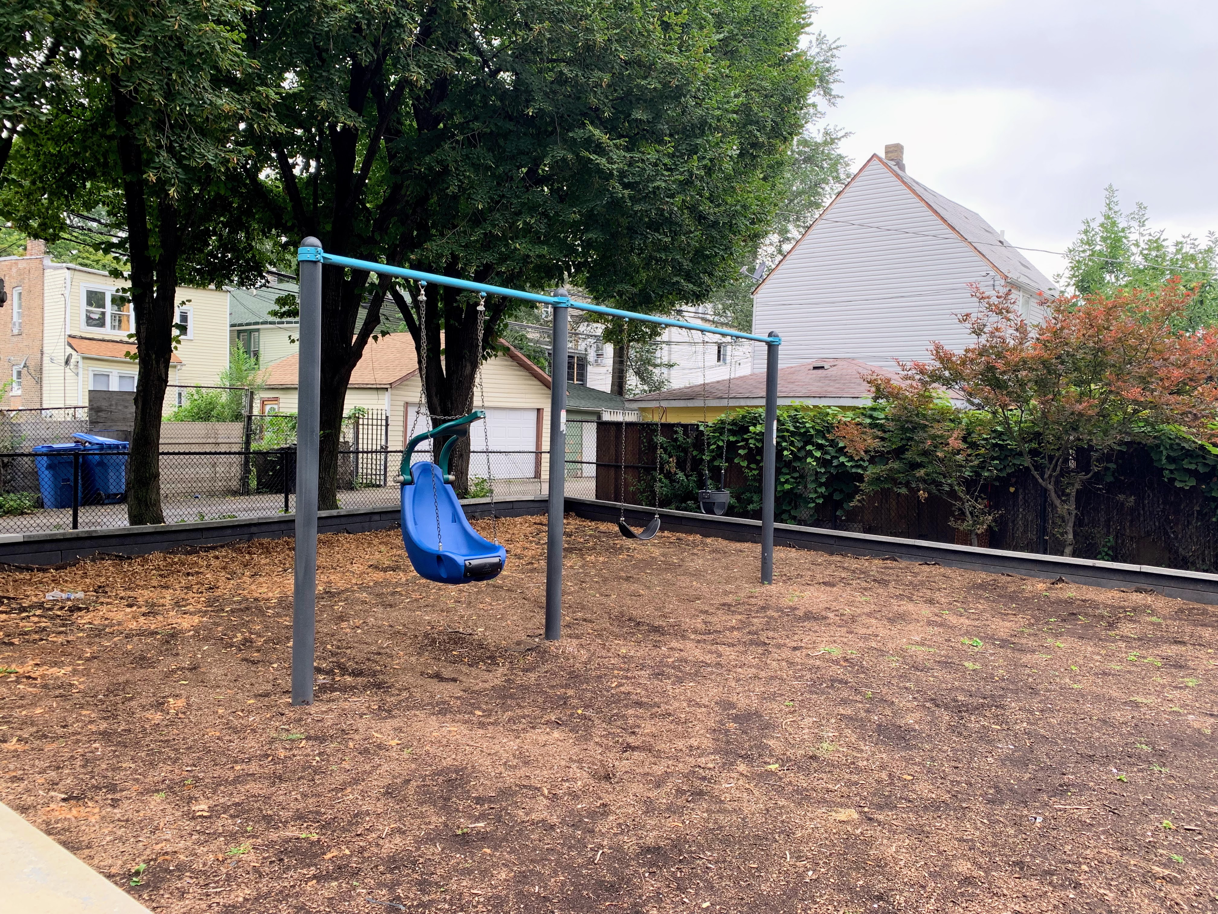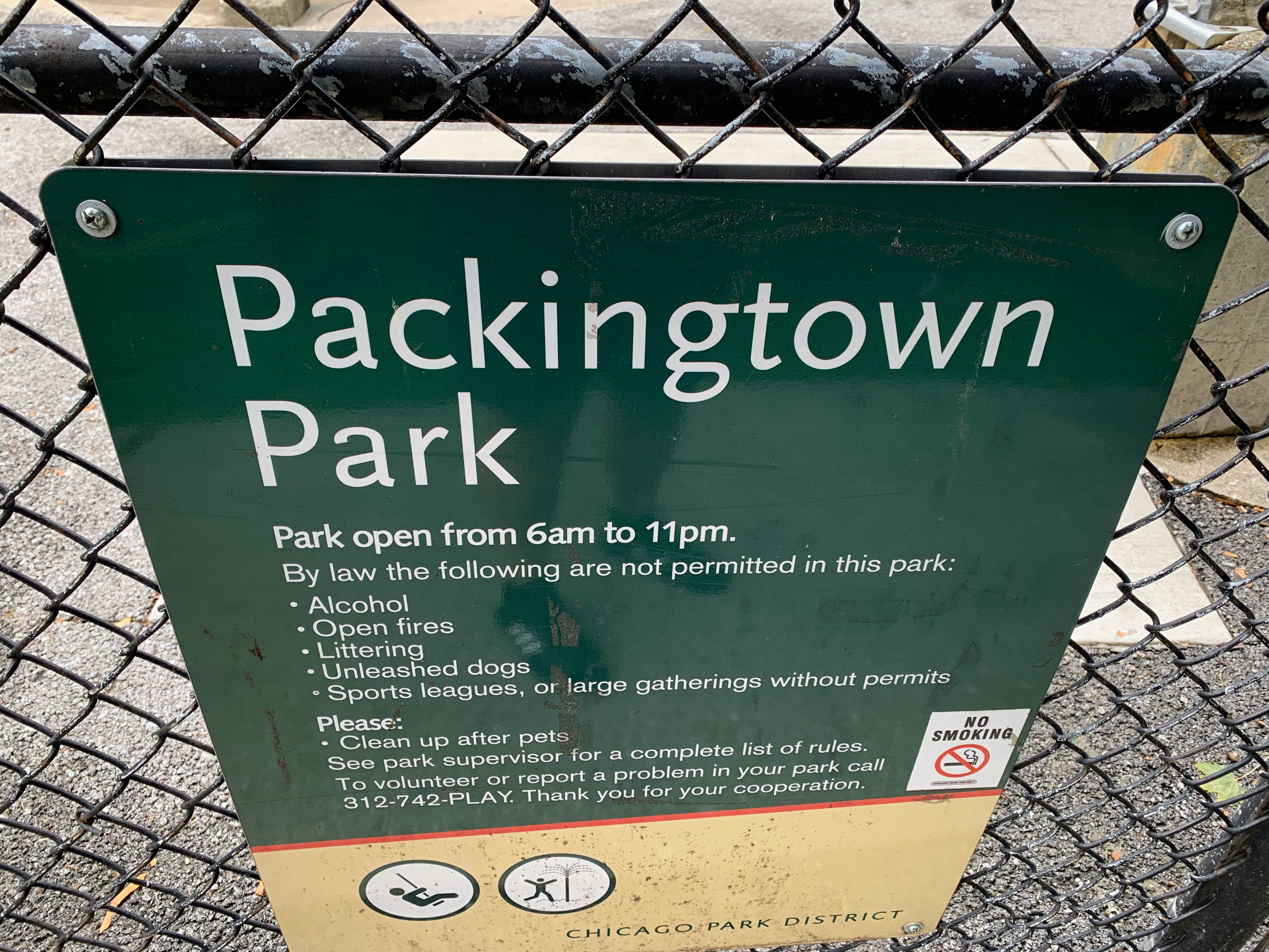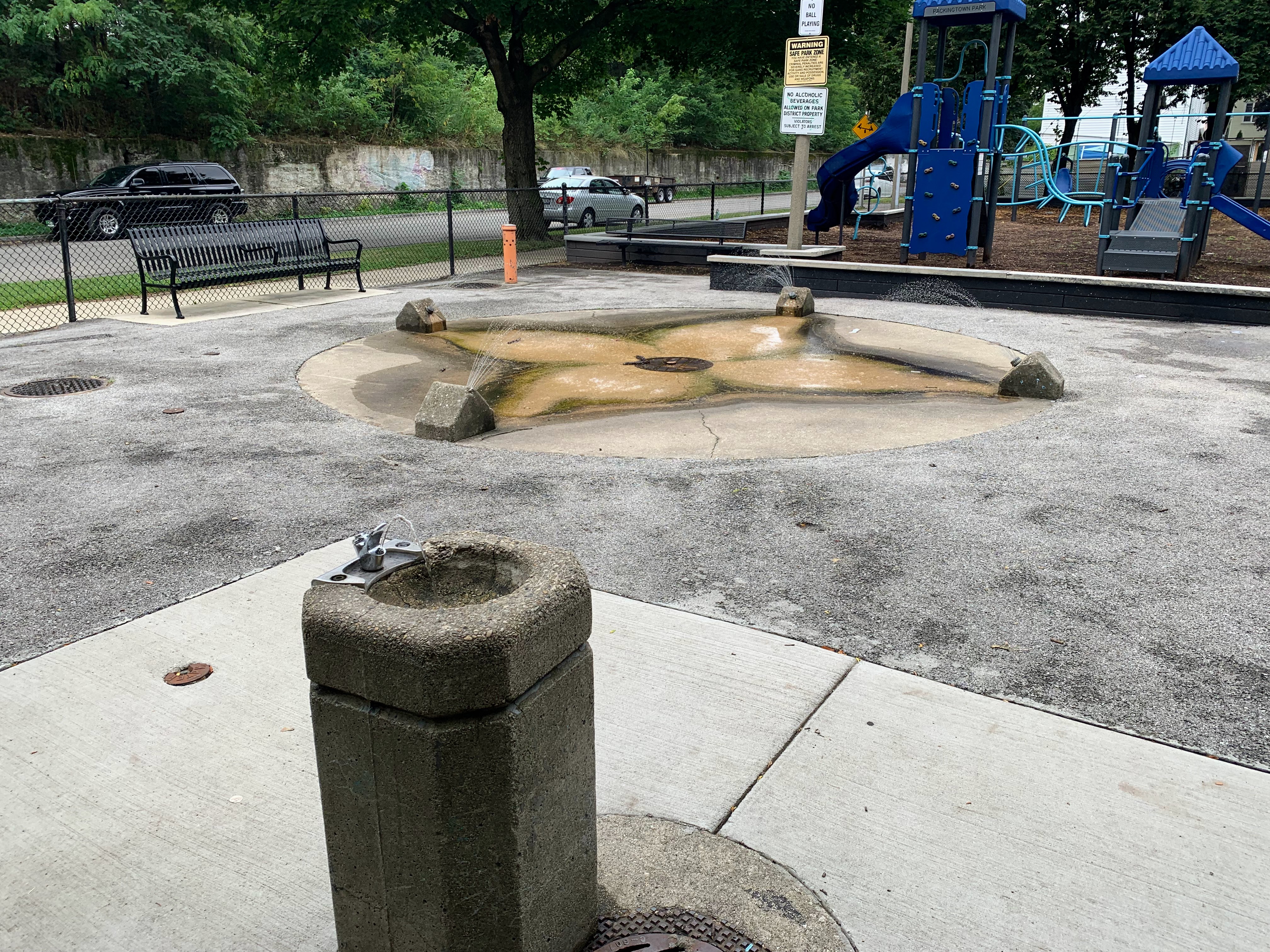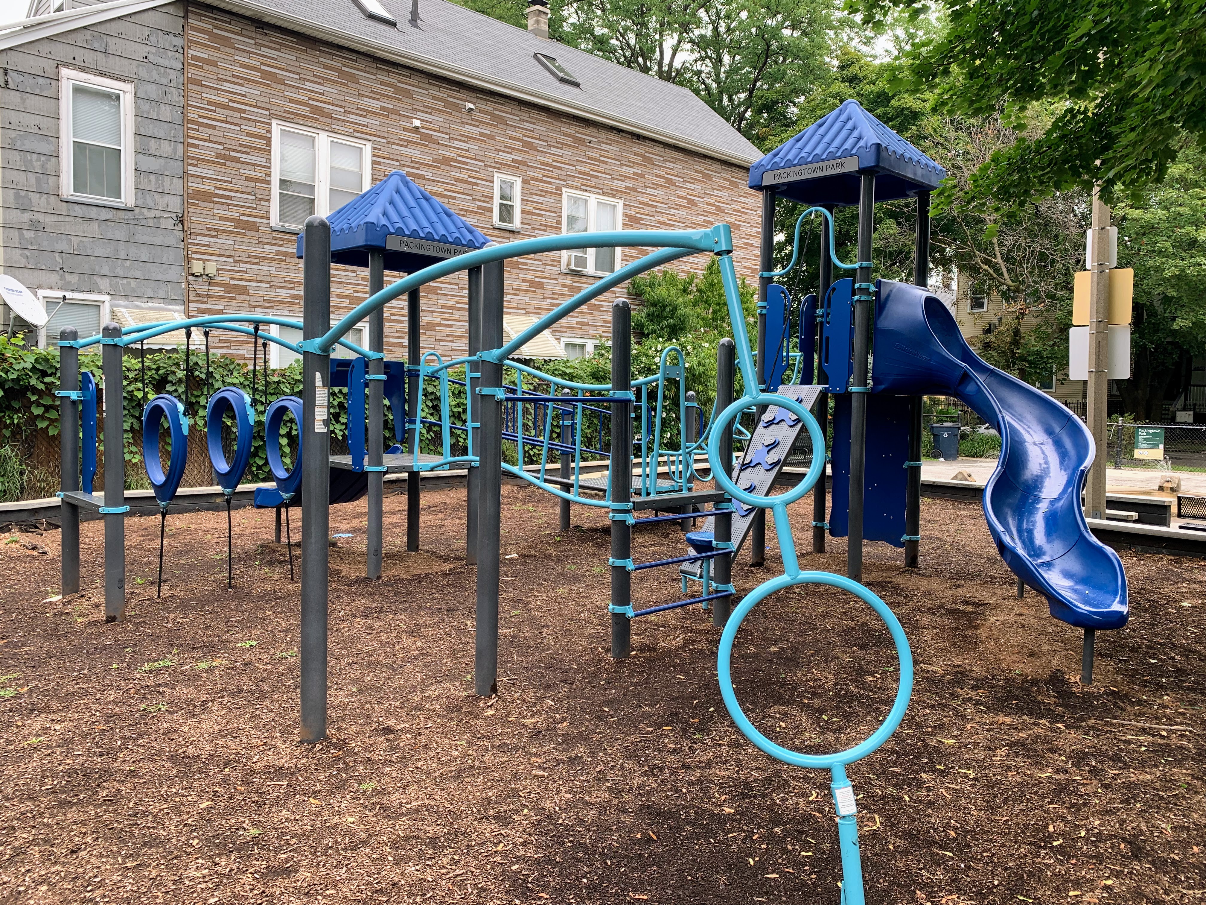 - The Packingtown Park playground packs a punch. This tiny neighborhood pocket park has a moderate sized play structure with a variety of equipment, a set of swings with the Chicago Park essentials (toddler, adaptive, and belt seat) and a small "four sprayer" water spray feature. The playground is fenced from the street but not fully enclosed and features the 'classic' playground amenities of benches, a drinking fountain, and a wood chip play surface. All in all, a solid neighborhood playground.