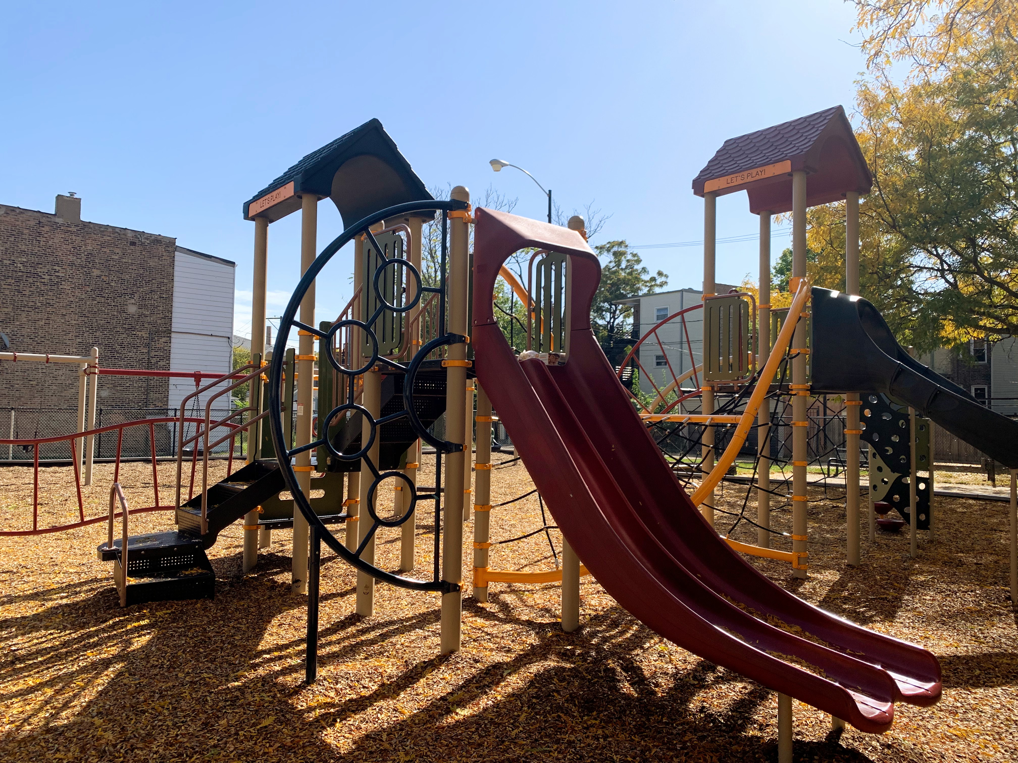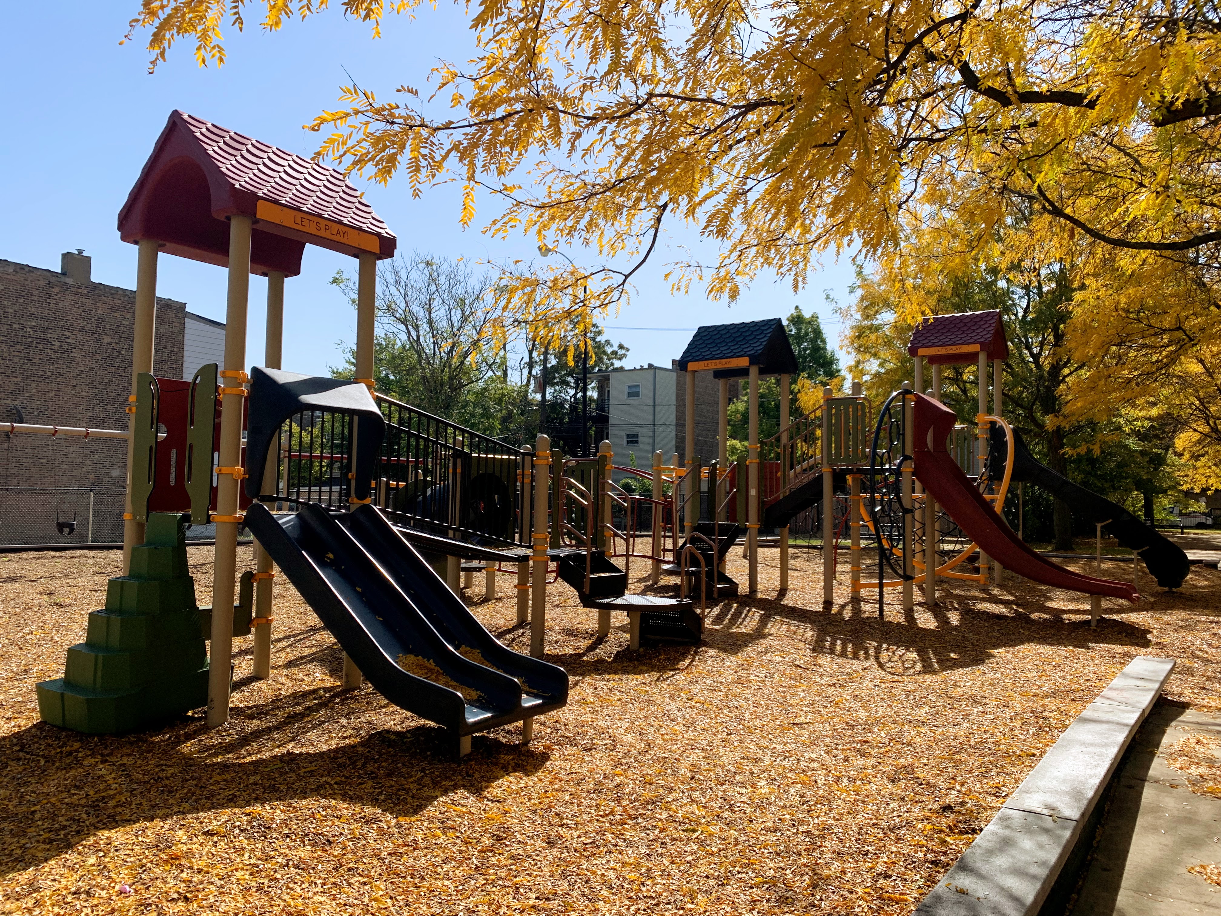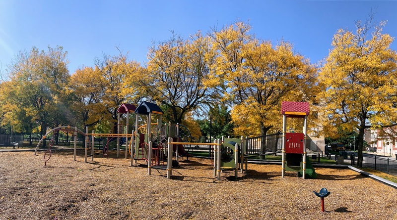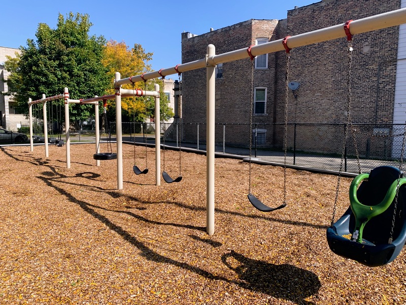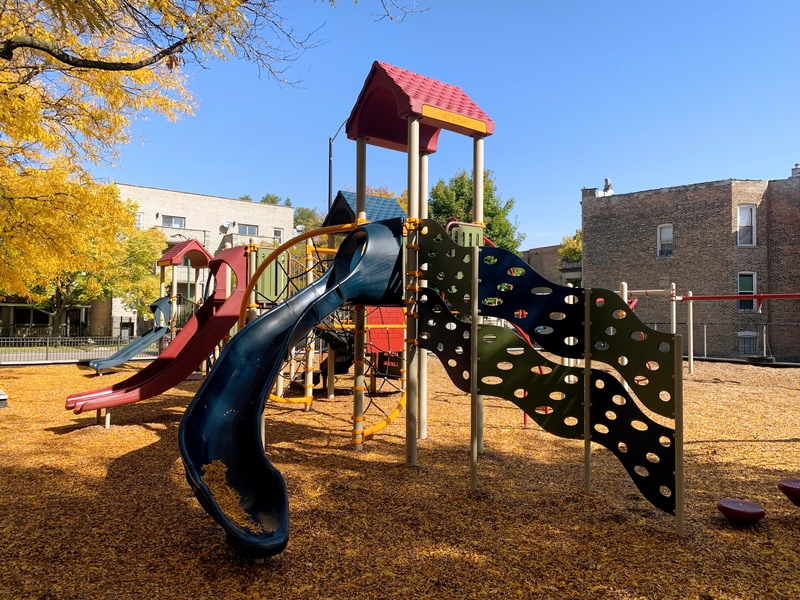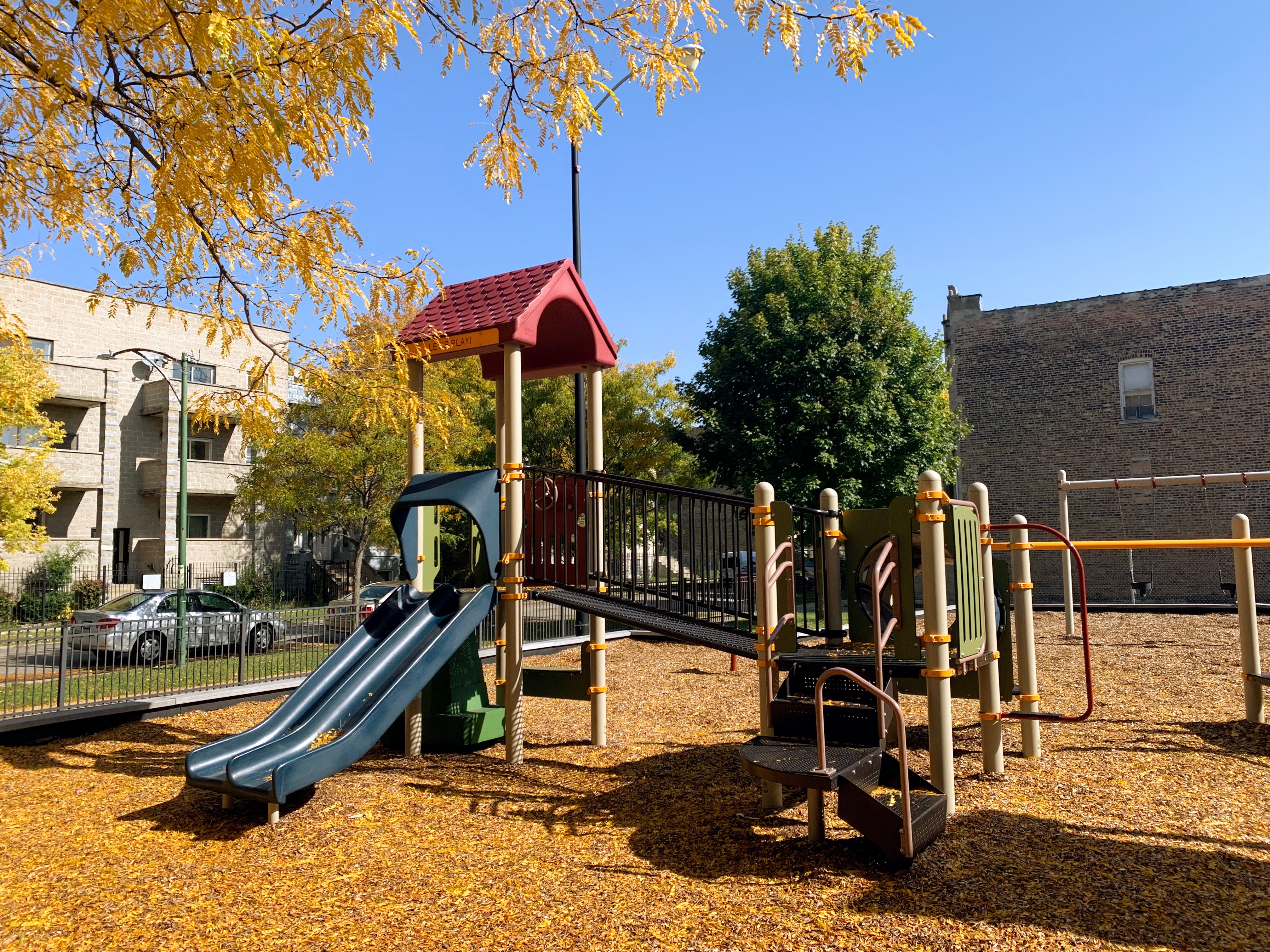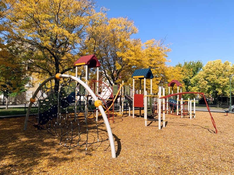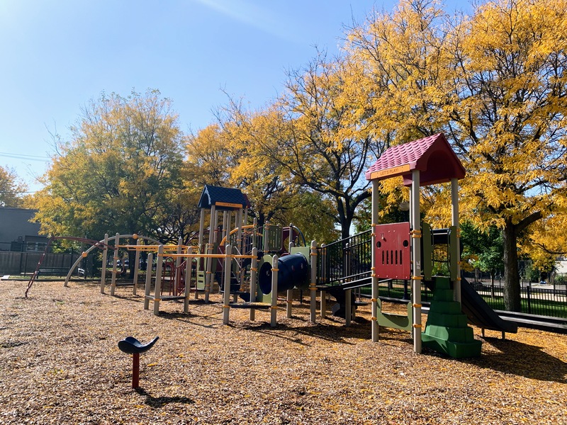 - Park number 500 is a uniquely shaped park with a decent playground. There is a single large play structure with a variety of slides and climbing elements as well as a large swing set with an above average offering of swings: toddler, adaptive, belt seat, and tire swing. The play area is fully enclosed and the play surface is wood chips. There are some nice, mature trees on the west side providing some shade and a bench for seating.