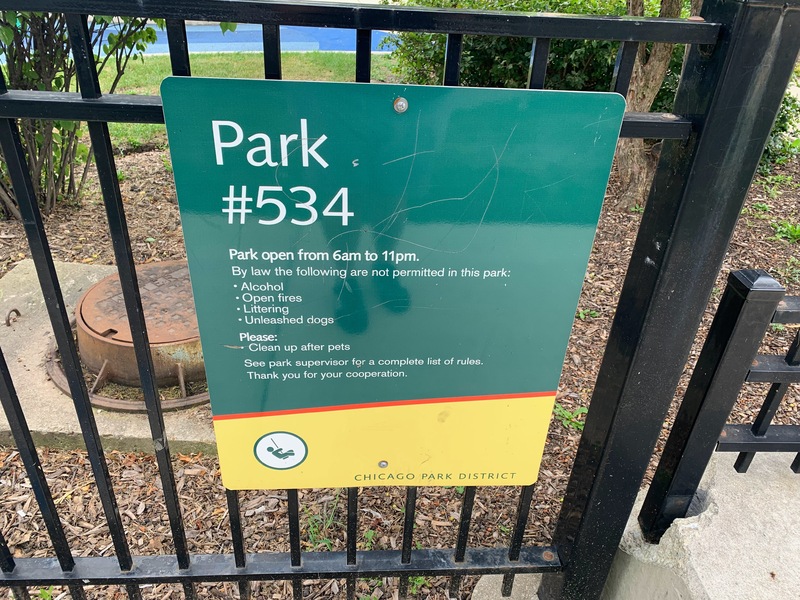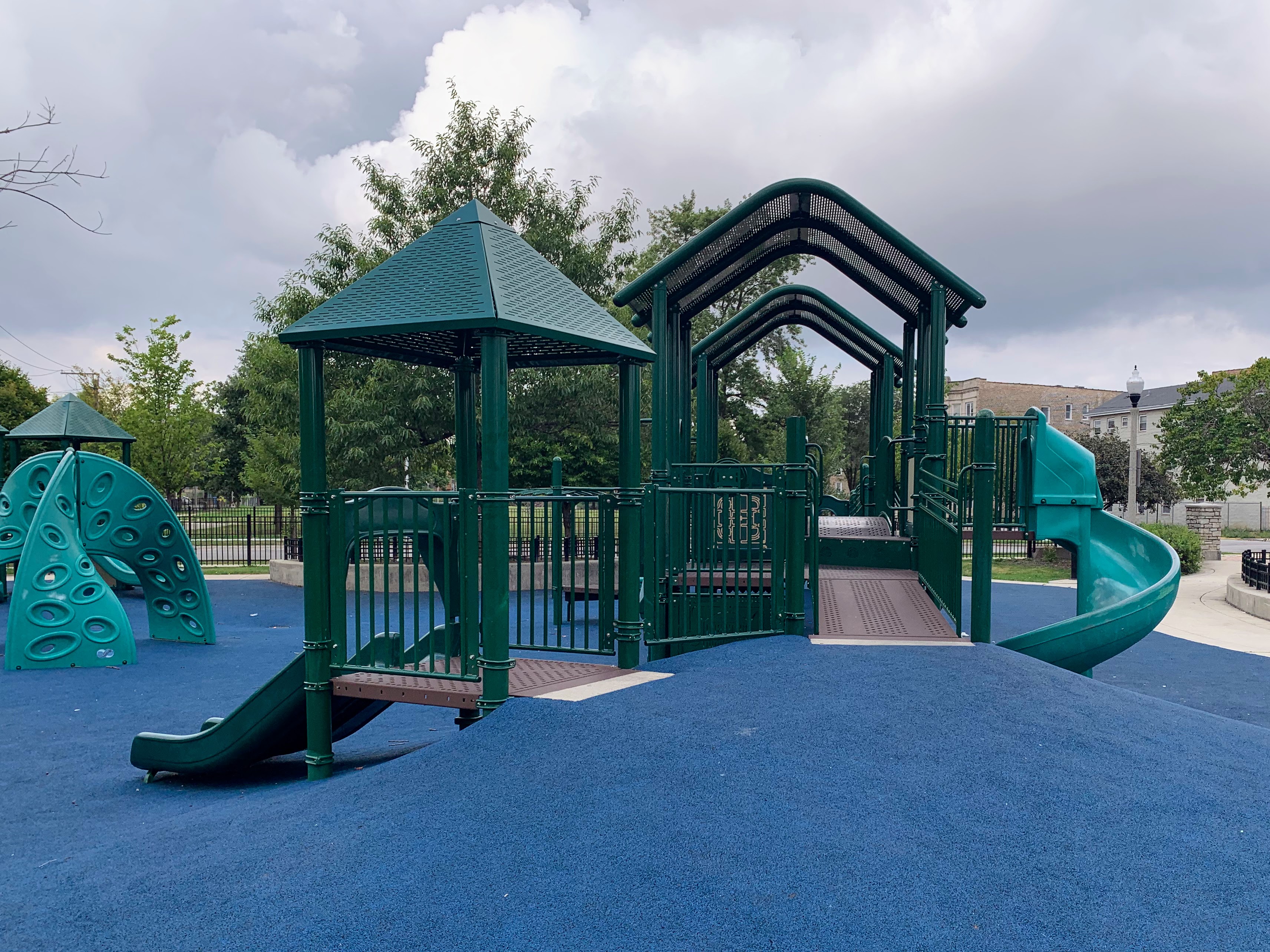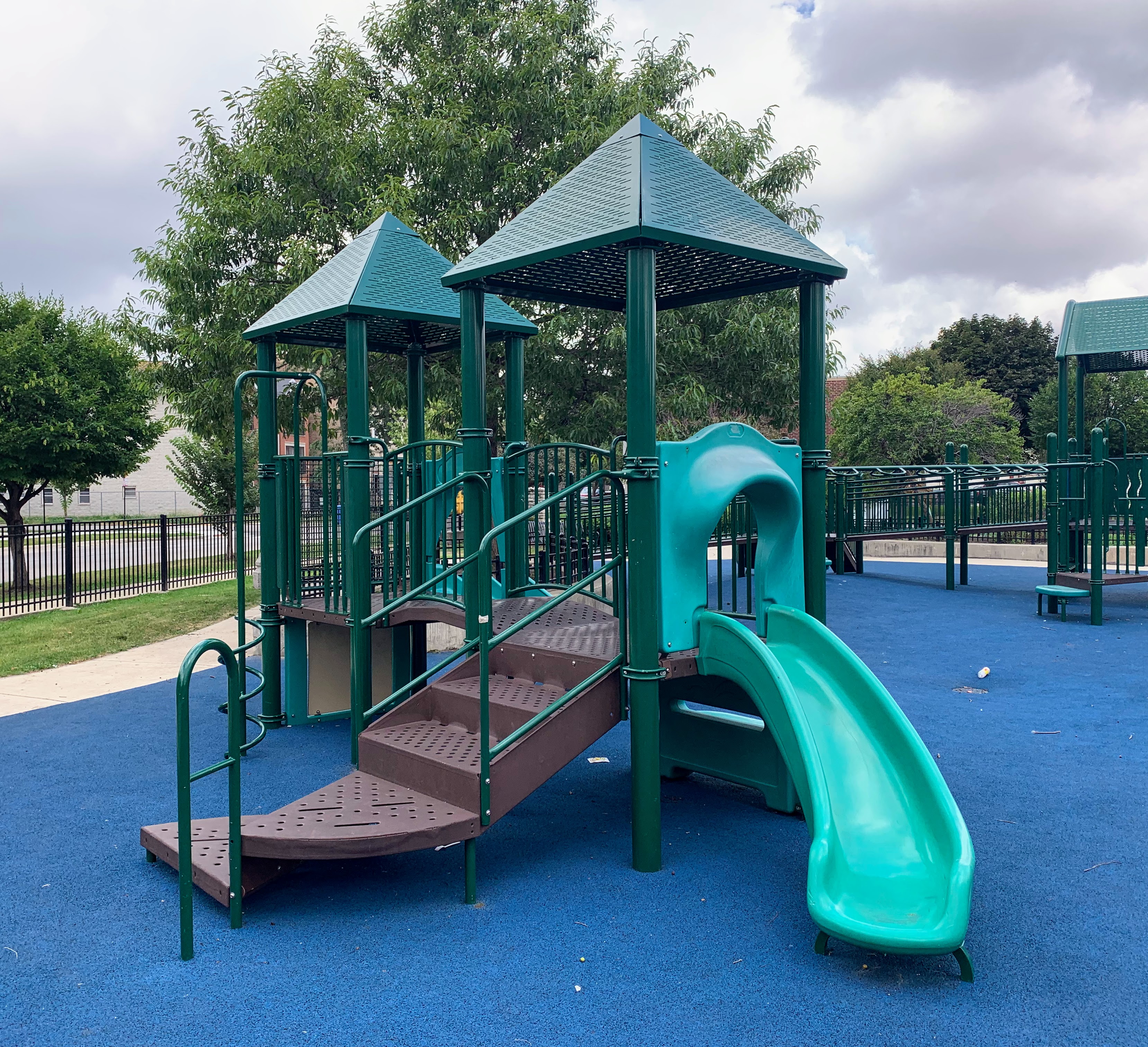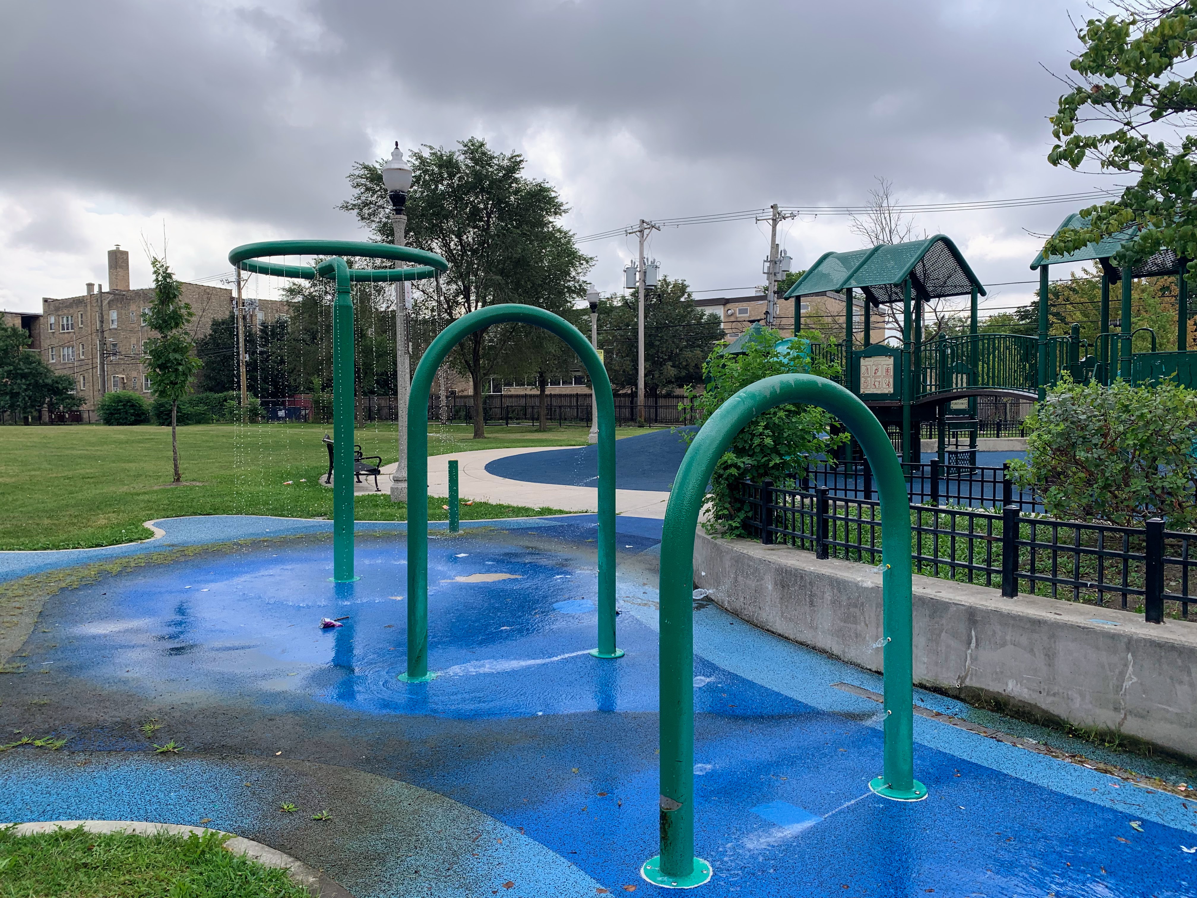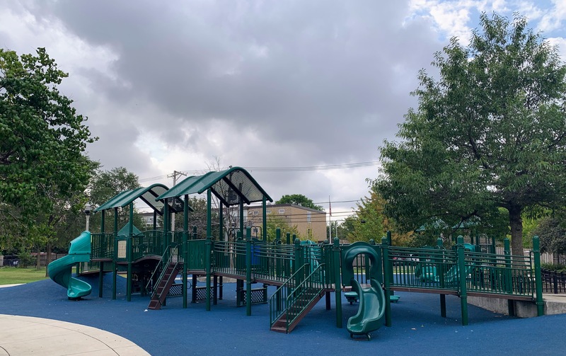 Park 534 features a nice playground and water spray feature in the middle of the park. There is small swing set with two toddler swings and two belt seat swings and then two play structures. The smaller one is for younger children and features a couple of slides and climbing elements. The larger structure is quite large and sprawling with a few slides, climbing elements, and a variation of monkey bars. The larger structure is also quite accessible via ramps on both sides. The water spray feature includes two water spraying arches and a halo shower sprayer.