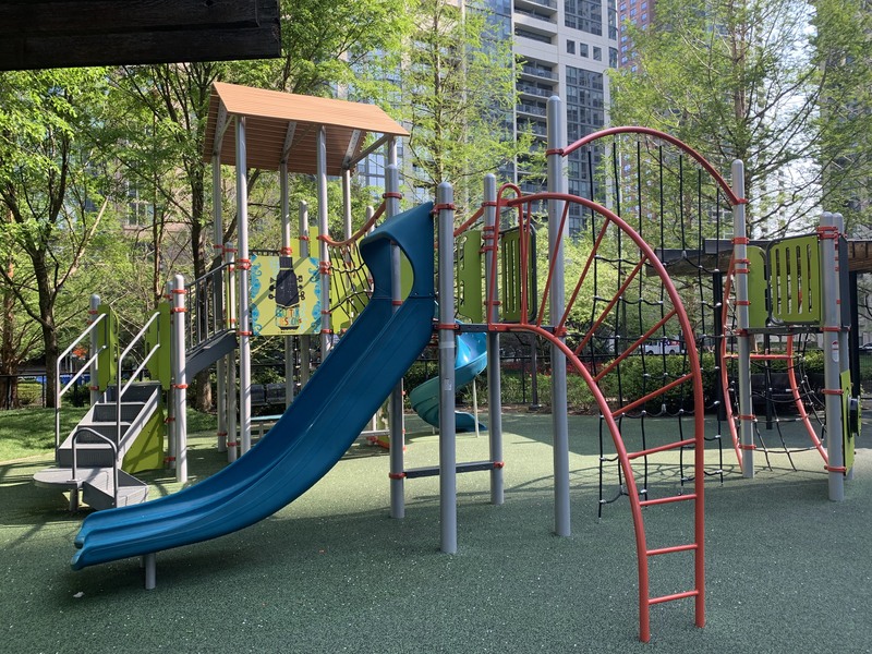 The Elizabeth Benton Playground in Lakeshore East Park is a gem of a playground. Set in the middle of the highly landscaped park, this playground features modern equipment, a small water feature, and lots of amenities. There are two main play structures. The larger structure includes a few slides and climbing elements as well as a few rope climbing features. The smaller structure, designed for younger children, features some low monkey bars, smaller slides, and smaller climbing elements. There is also a small interactive element and igloo-esque structure with holes for creative play. There is a standard set of swings (toddler and belt seat) and a standalone xylophone and drums. There is a simple water spray features (jets from the soft rubber surface) in the middle of the playground.