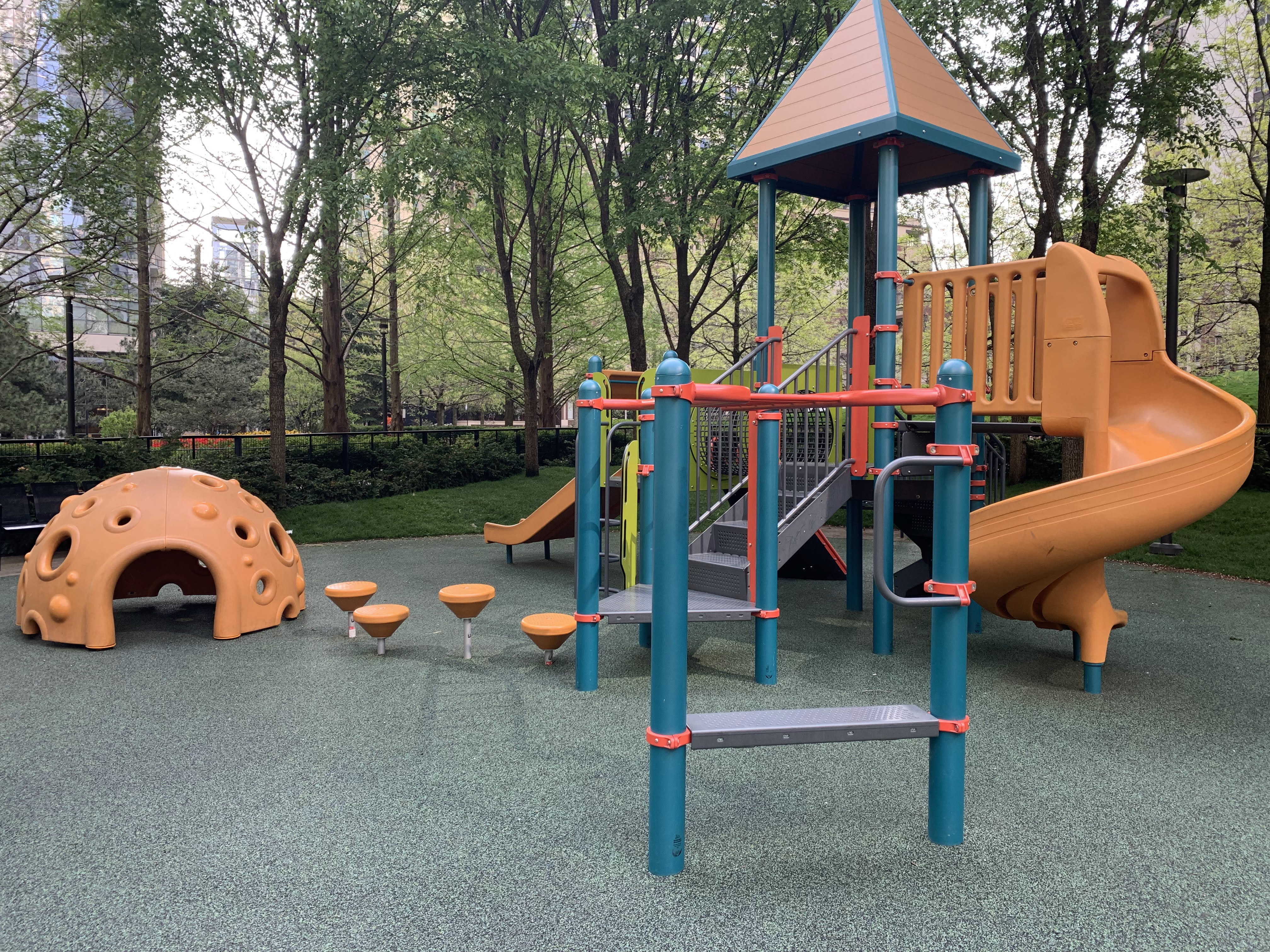 The playground is set away from the surrounding street and is fully enclosed. There is ample shade from both buildings and trees and plenty of benches around the perimeter of the play area.