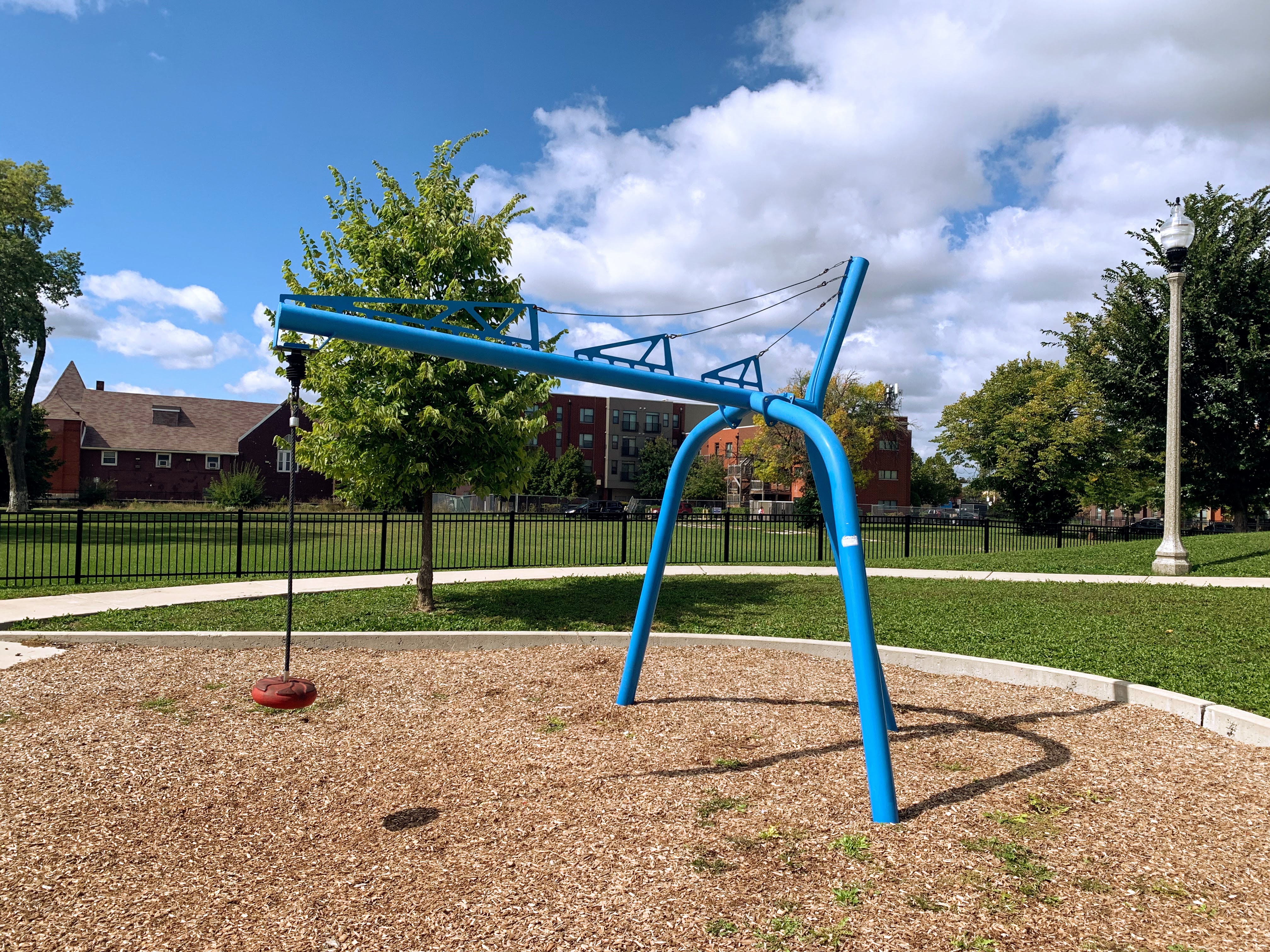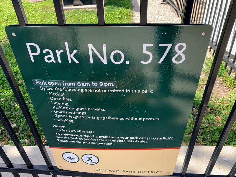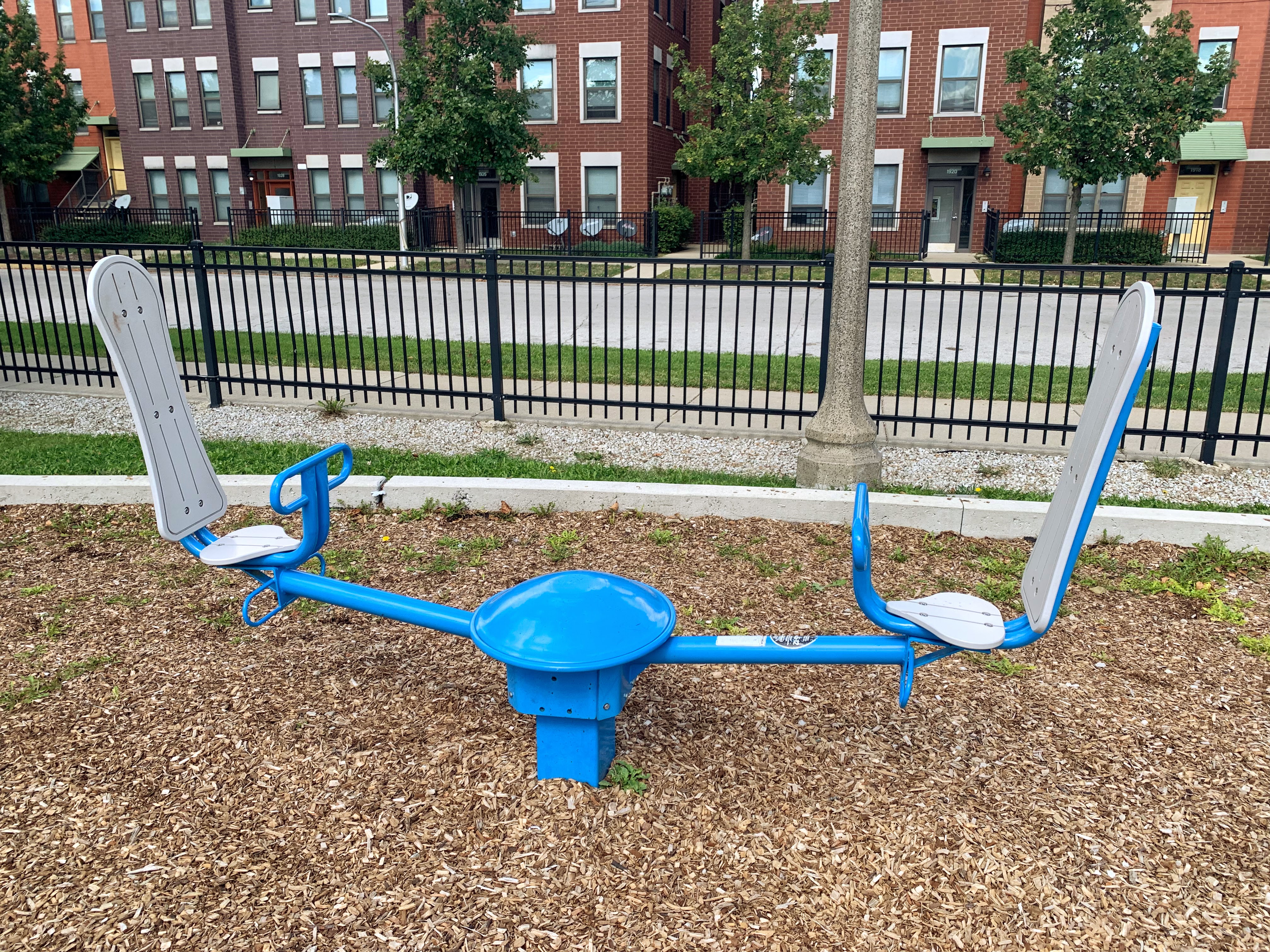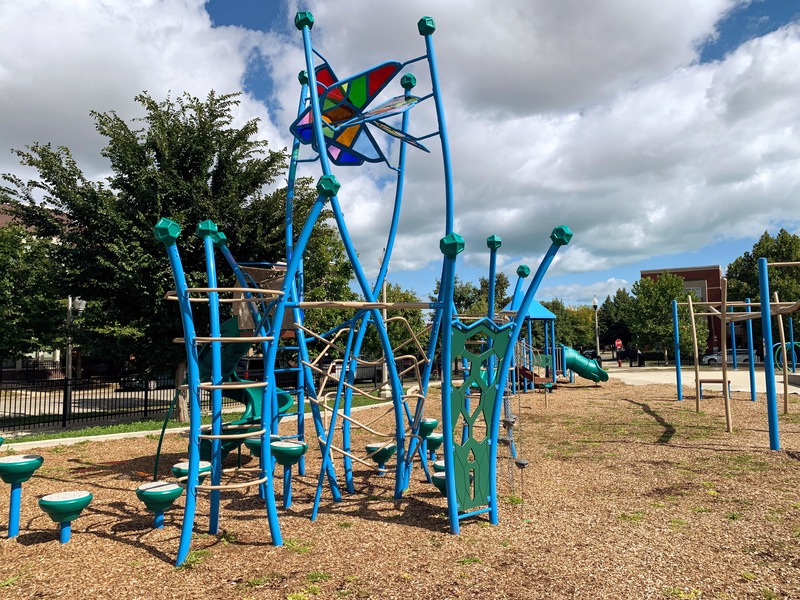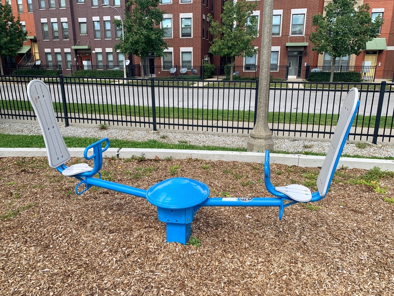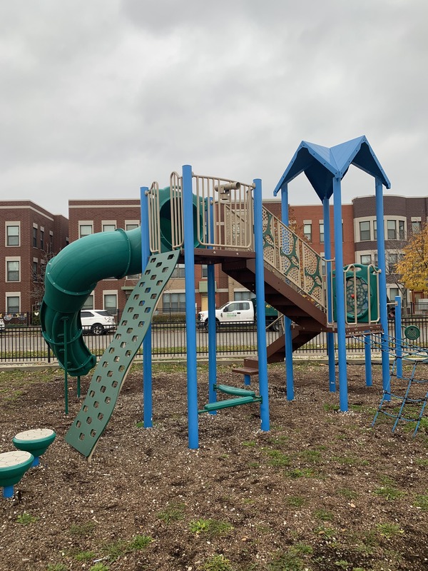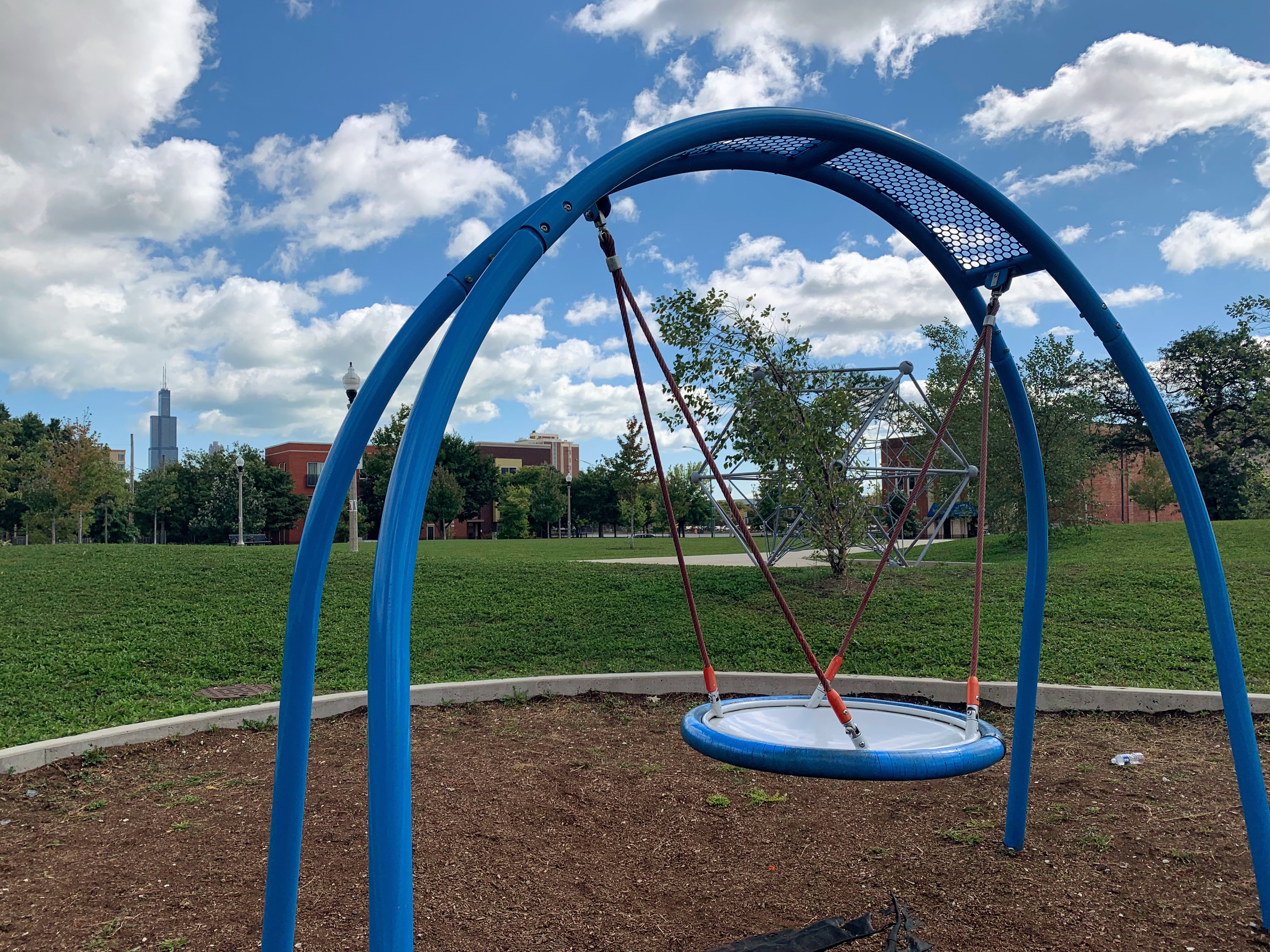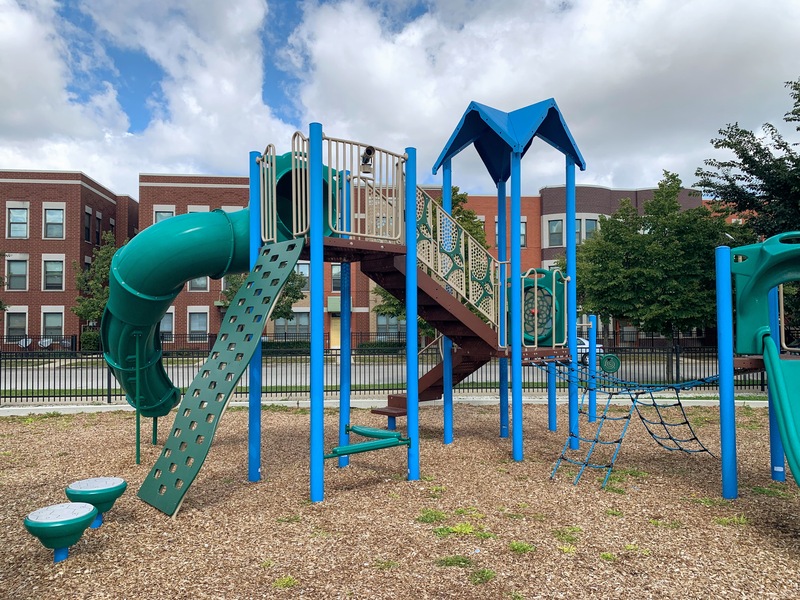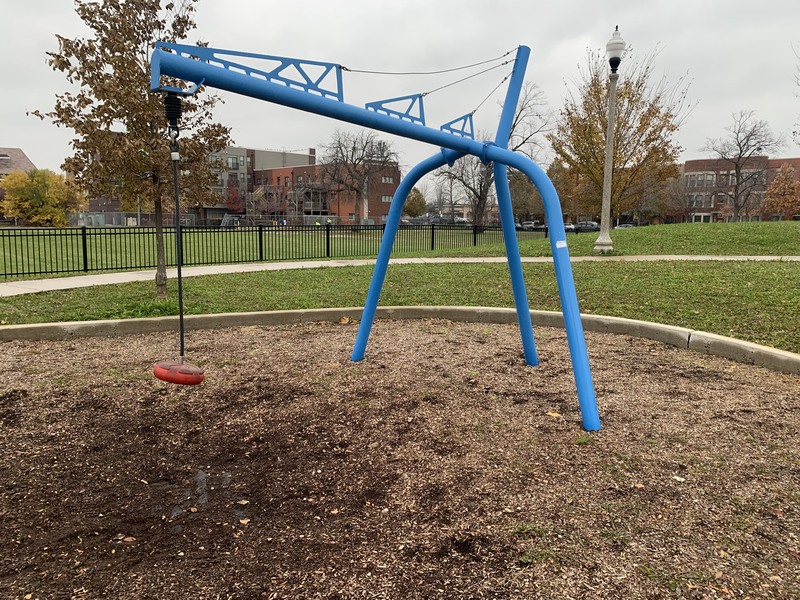 - This playground sits in Park 578 just north of the United Center and features some interesting and unique playground equipment. Although the equipment is modern, the metal climbing structure with the colorful art on the top, the climbing structure shaped like a rocket ship, and a unique swing give this playground a unique and somewhat retro feel. There is also an area for younger children, a misting water spray feature, and a large climbing net structure. There are also several other standalone features scattered throughout the park. The play surface is wood chips and while the concrete borders provide a place to sit, additional benches and improved landscaping that could create some shade would make this space more comfortable.
