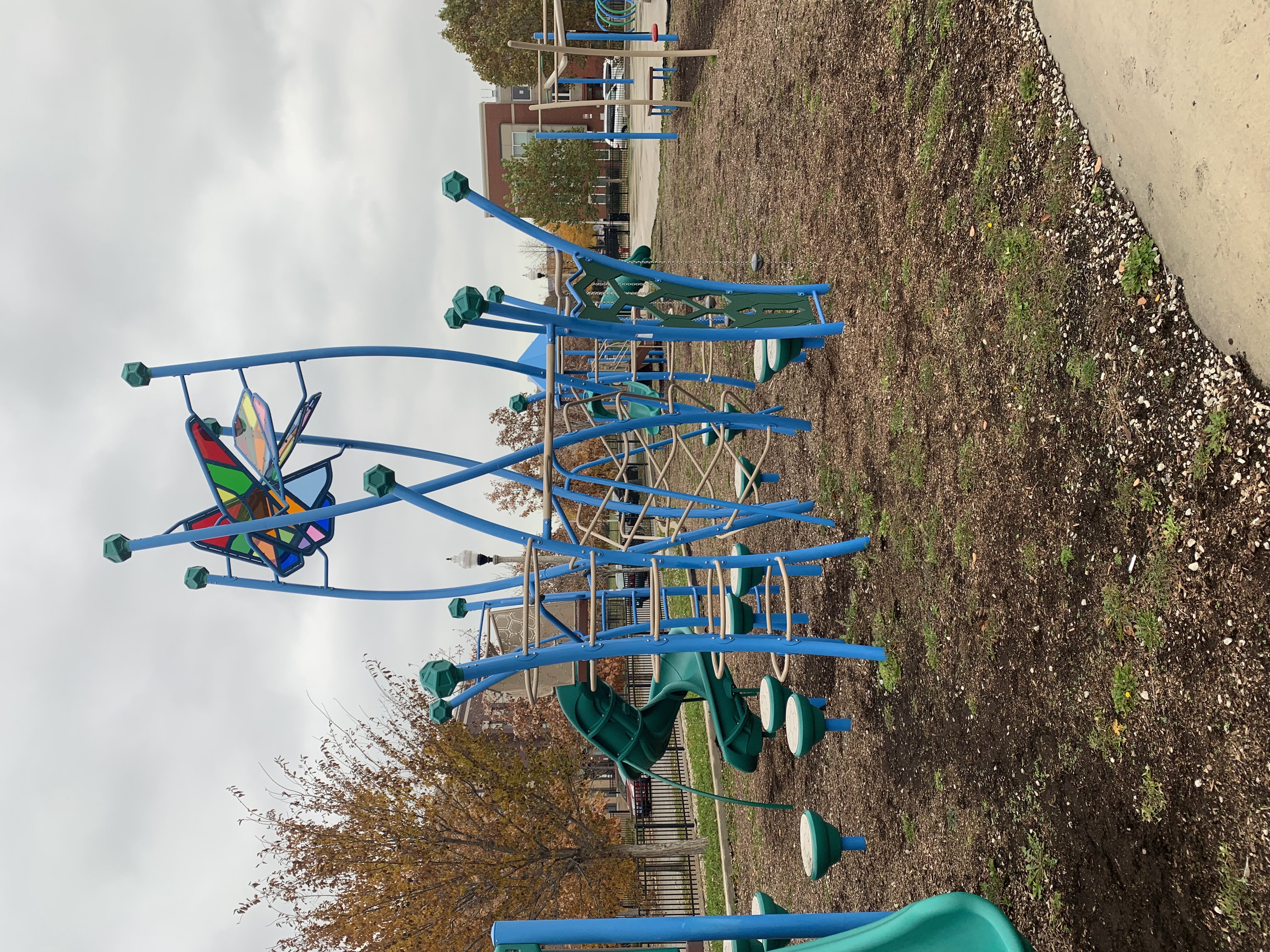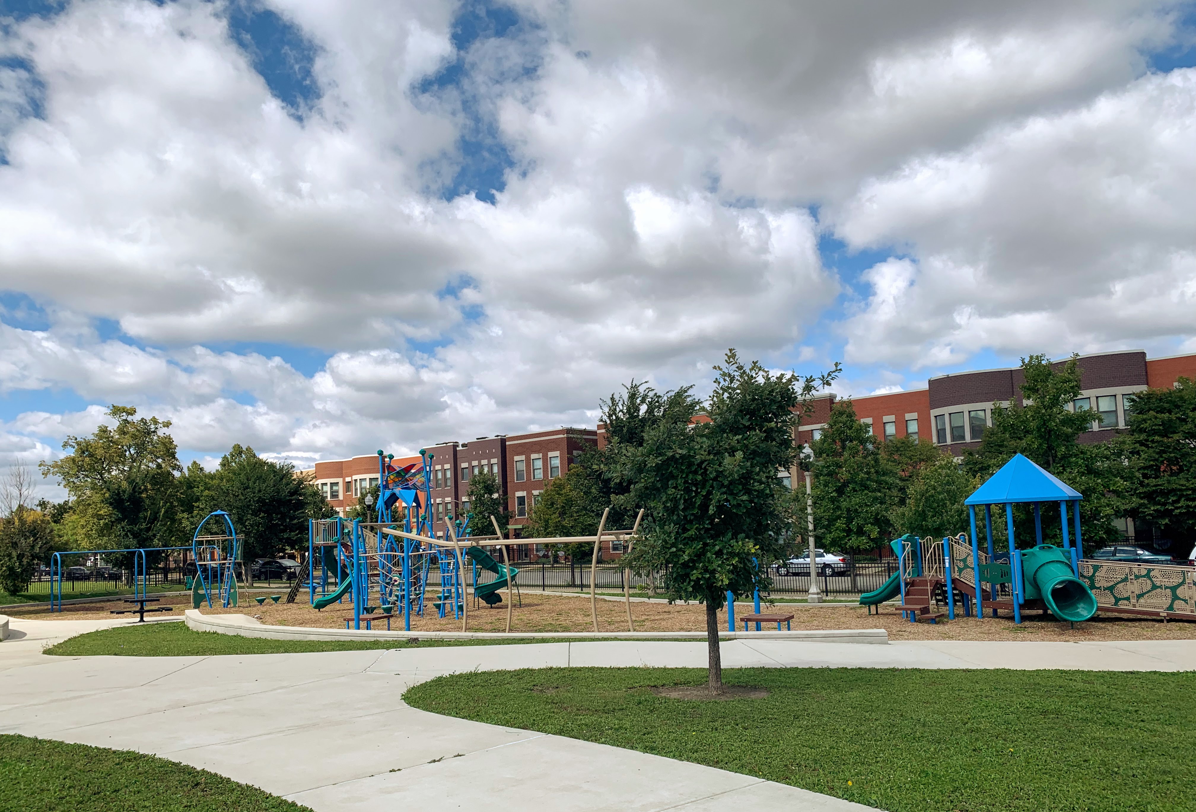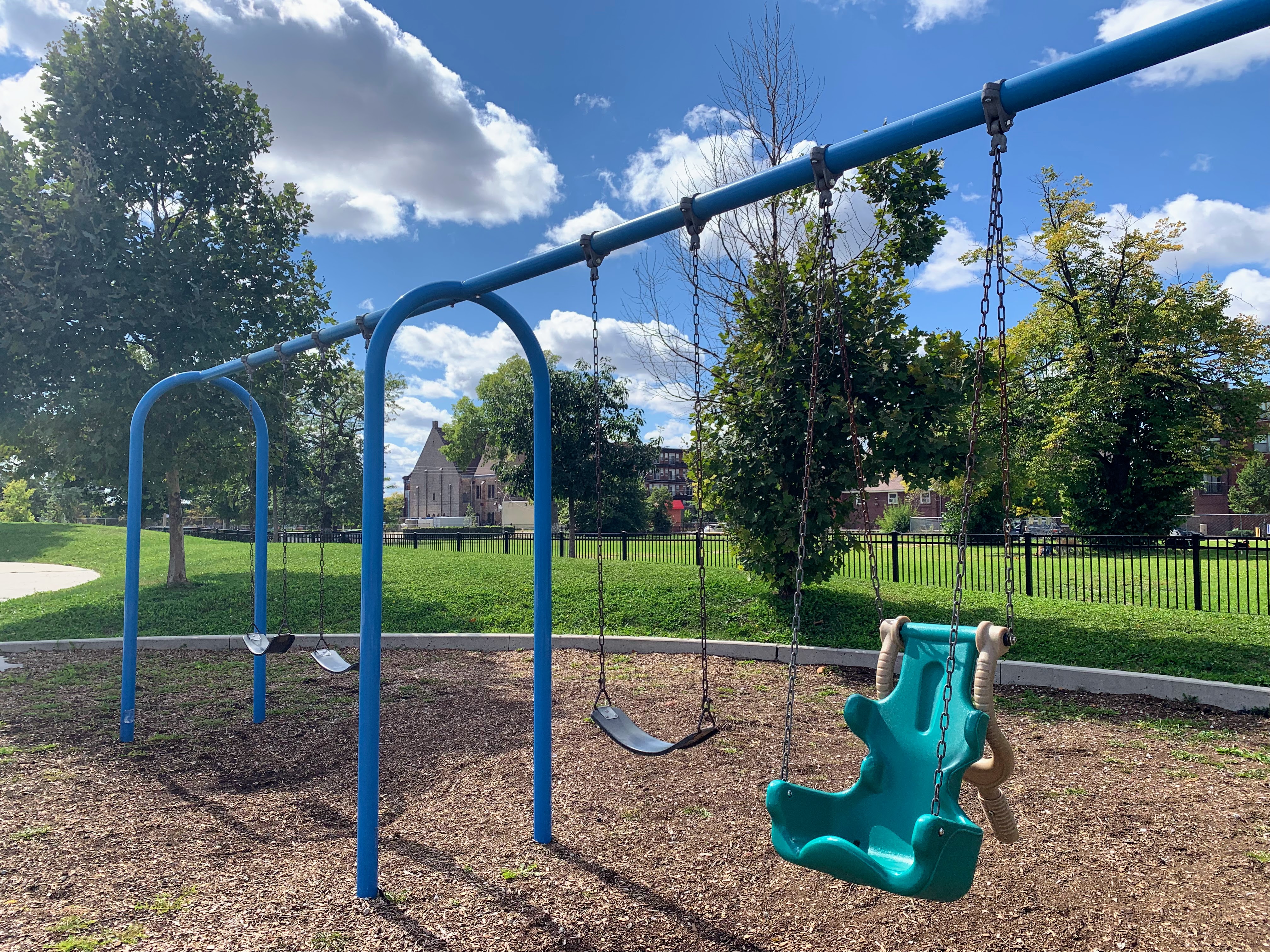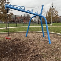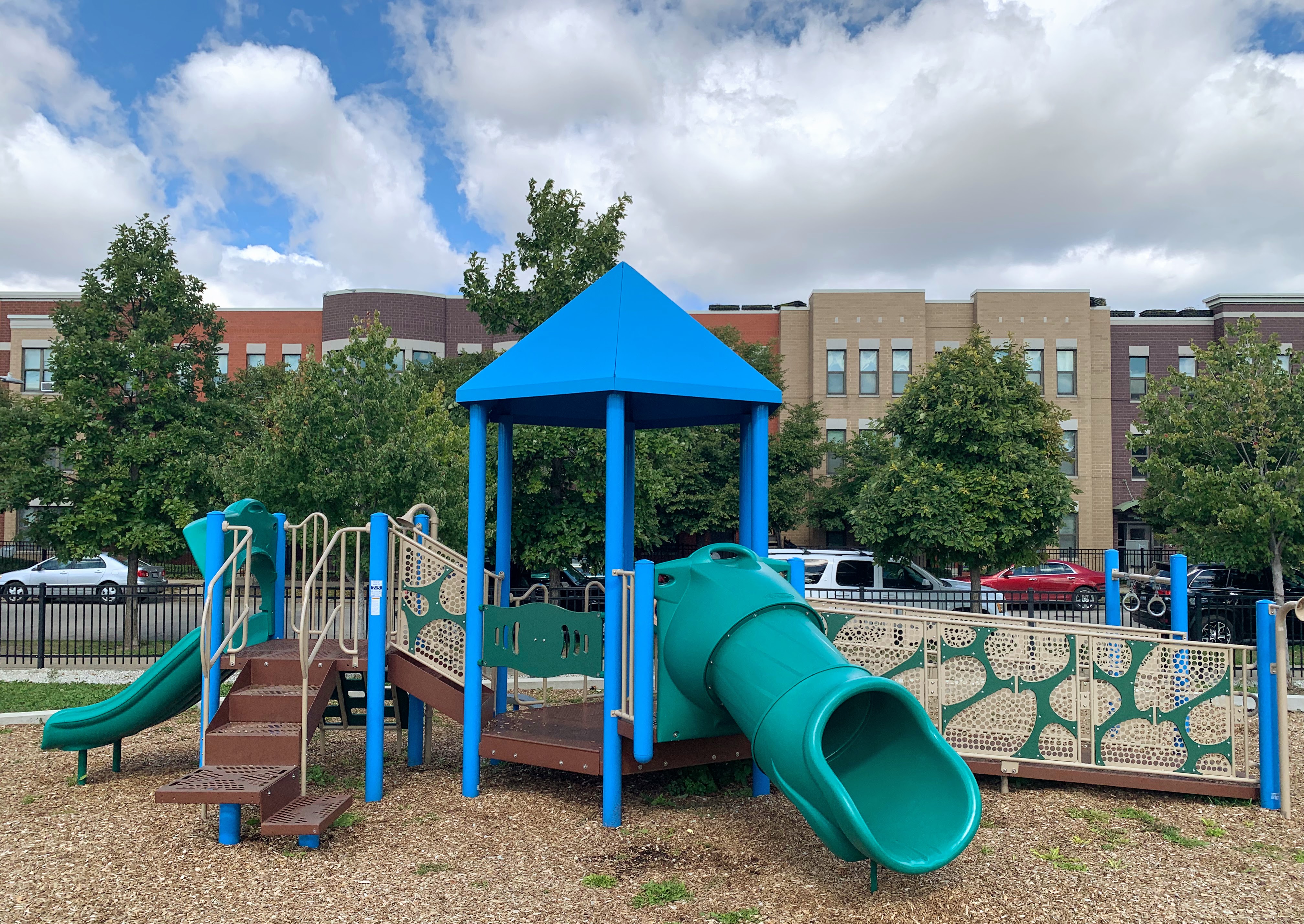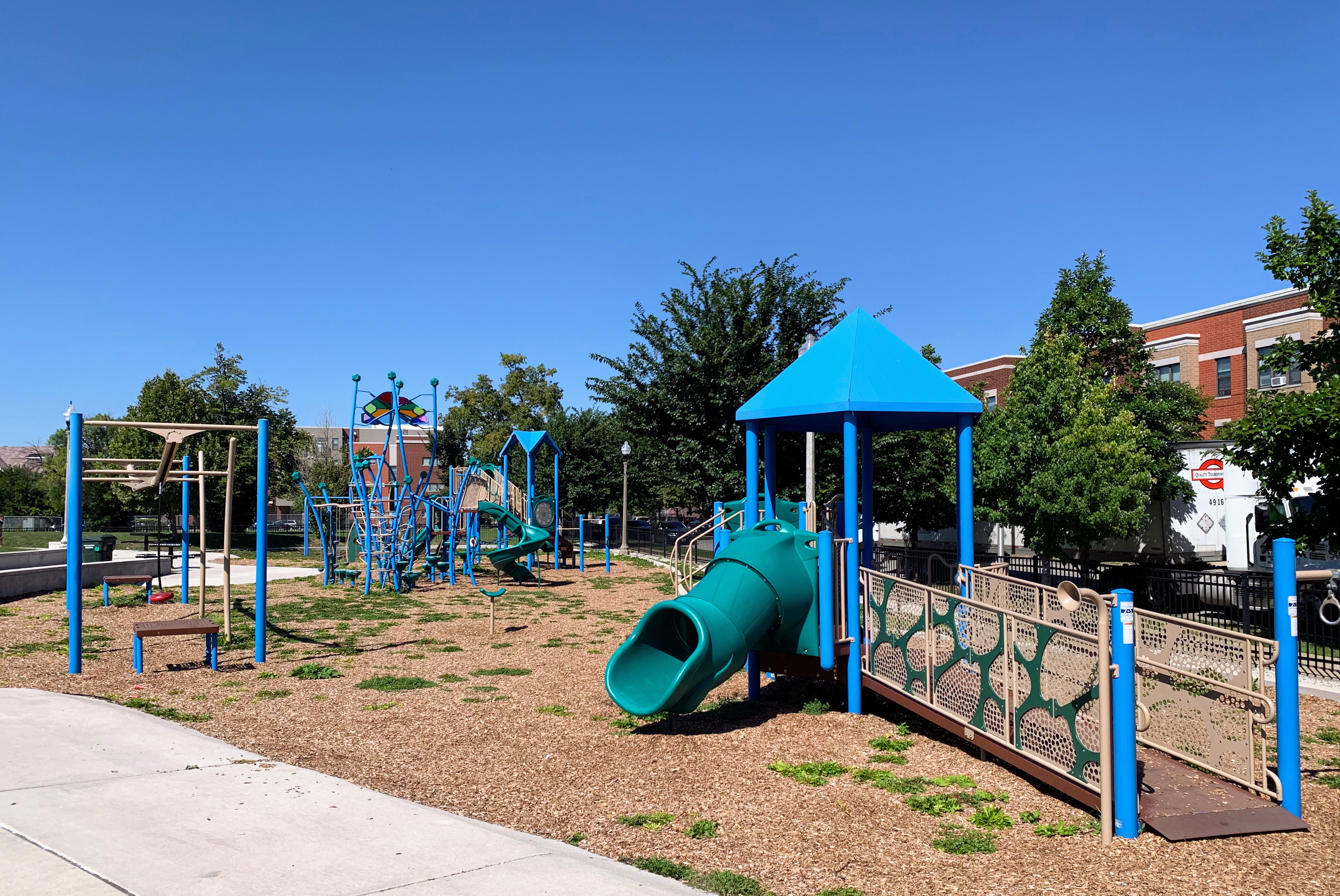 - This playground sits in Park 578 just north of the United Center and features some interesting and unique playground equipment. Although the equipment is modern, the metal climbing structure with the colorful art on the top, the climbing structure shaped like a rocket ship, and a unique swing give this playground a unique and somewhat retro feel. There is also an area for younger children, a misting water spray feature, and a large climbing net structure. There are also several other standalone features scattered throughout the park. The play surface is wood chips and while the concrete borders provide a place to sit, additional benches and improved landscaping that could create some shade would make this space more comfortable.