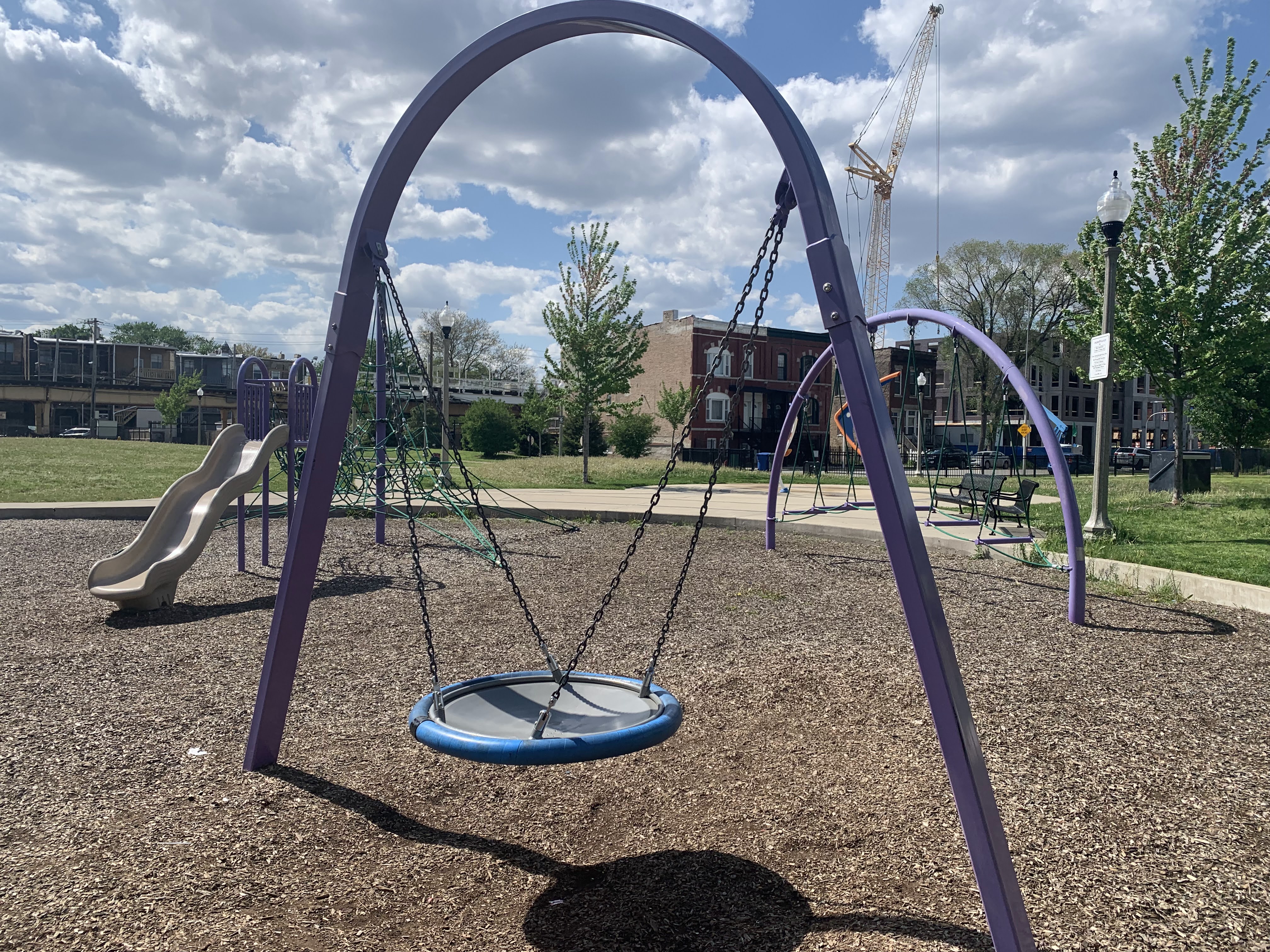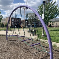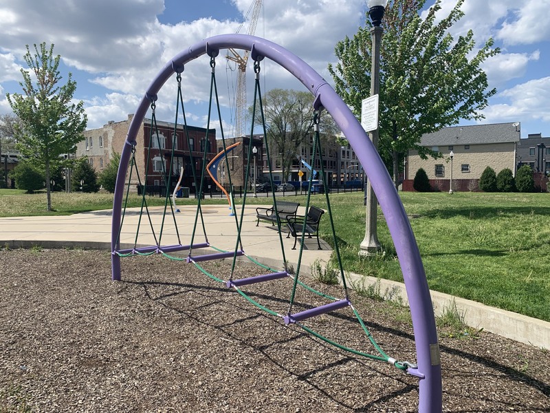 - Hadiya Pendelton Park is named after a Chicago teen killed by gun violence in 2013 and some of the parks design elements - a stack of books and a large musical motif printed on the main walking path - reflect this fact. The playground within the park isn't a traditional playground and instead consists of large, modern standalone elements. These elements include two large net climbing structures, a huge spinning platform with additional elements, a saucer swing, and a rope traverse. Immediately next to the playground is a small water spray feature with three modern spray elements. The entire park is fenced from the street but not fully enclosed. The playground surface is wood chips though there are large grassy areas throughout the park. There are benches and a drinking fountain in this bright and sunny park.