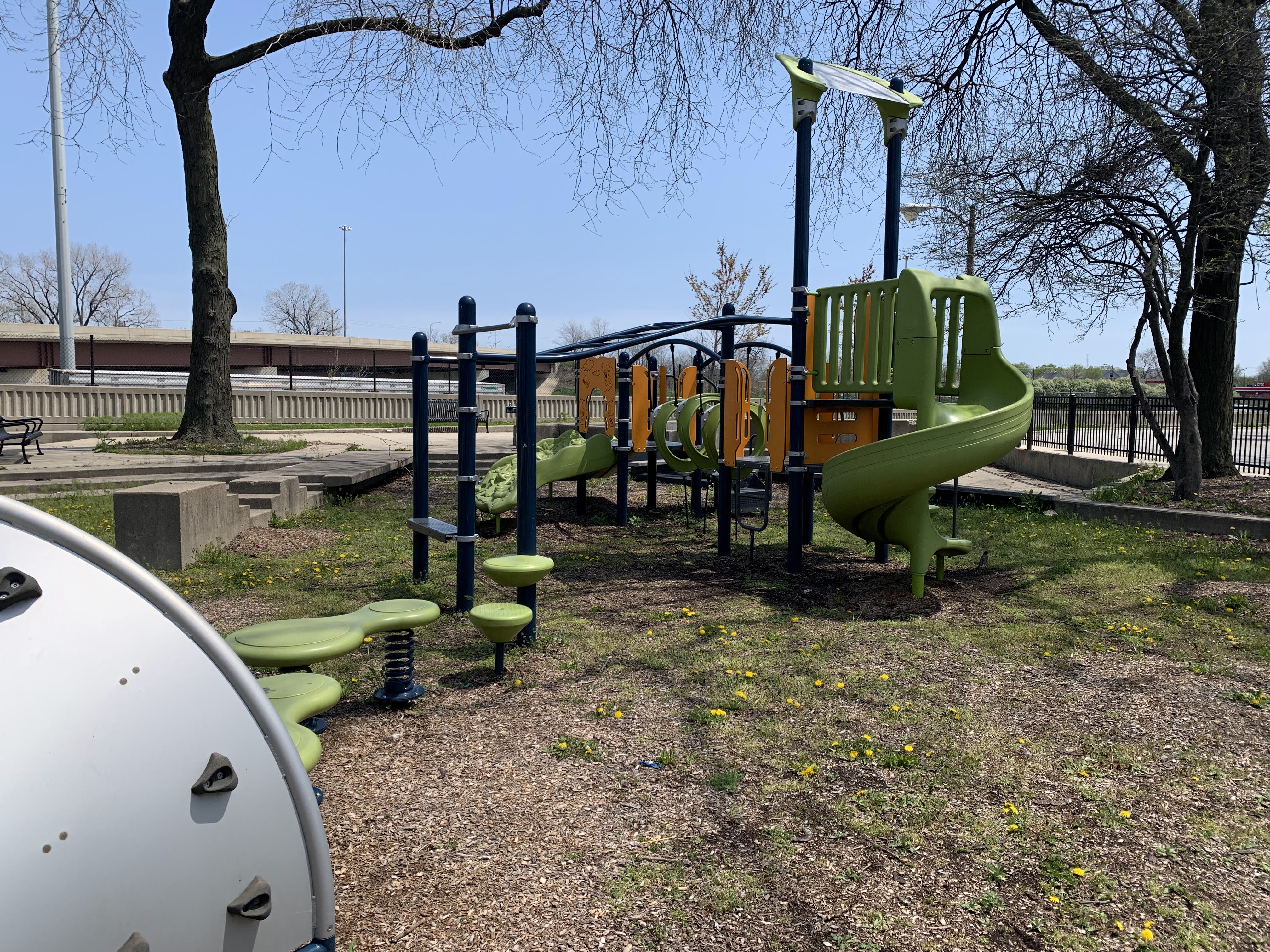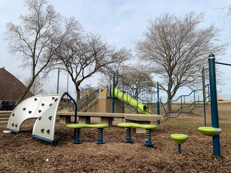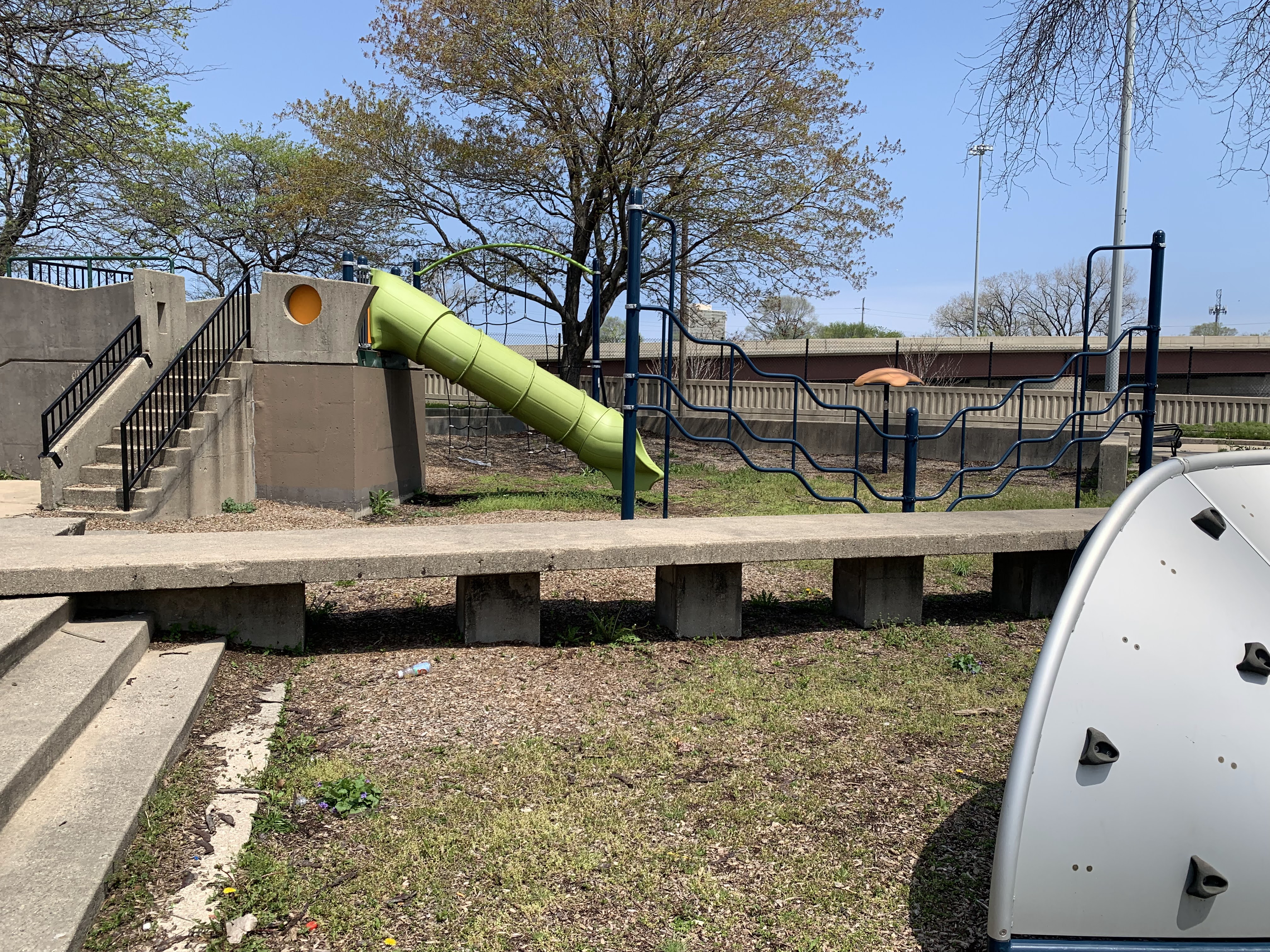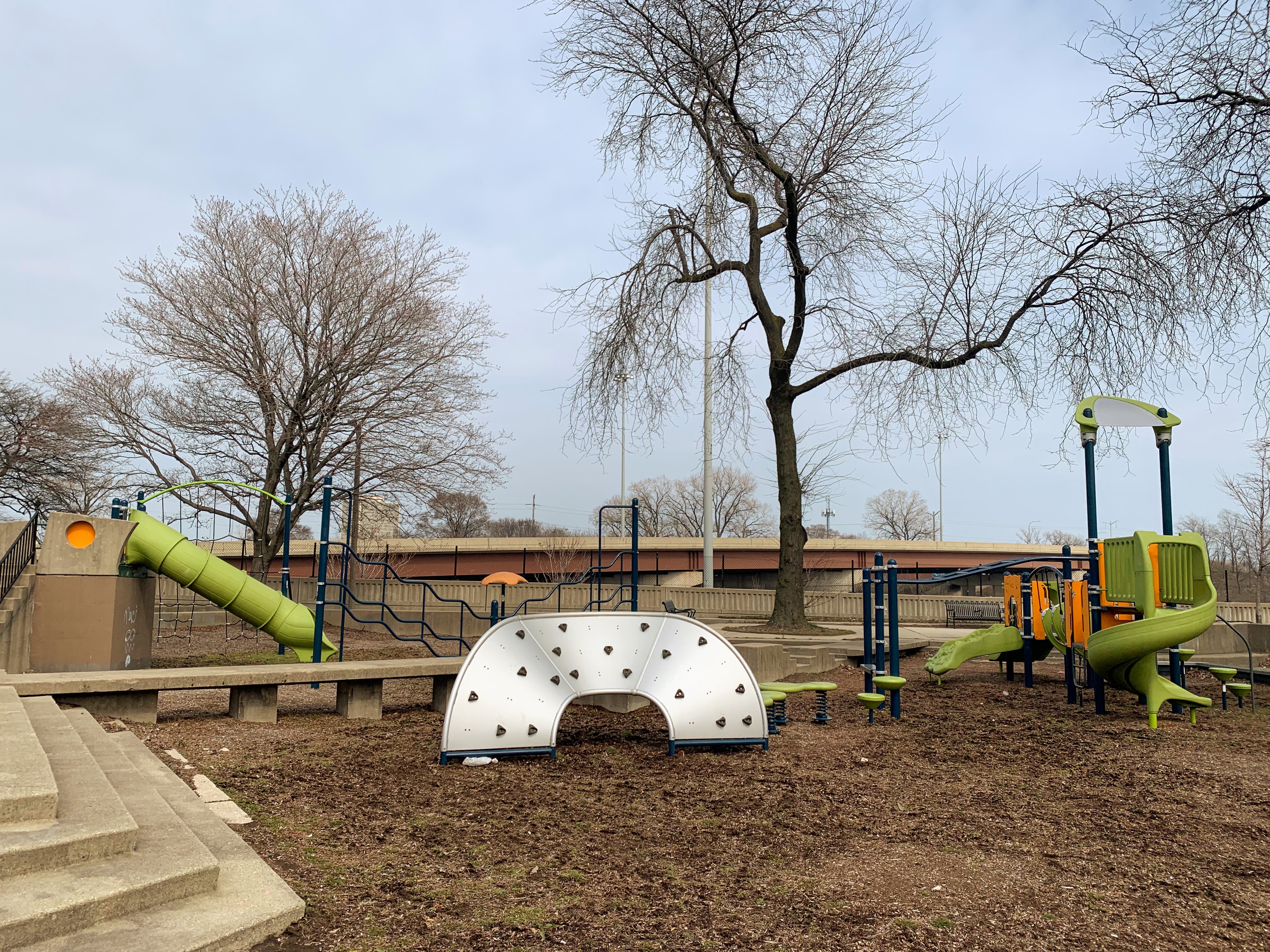 Periwinkle Park is located near the junction of the Chicago Skyway and I-94; this fact of location is relevant to the playground at this site because 1) the road noise is quite loud in the playground and 2) it may explain the concrete aesthetic for this playground. Though wood chips are the primary play surface, there is a striking amount of concrete in this park including benches, stairs, and a raised platform. One slide is somewhat integrated into the concrete and the rest of the structures seems like modern structures set between the concrete elements. So the overall aesthetic is somewhat bizarre but not terrible.